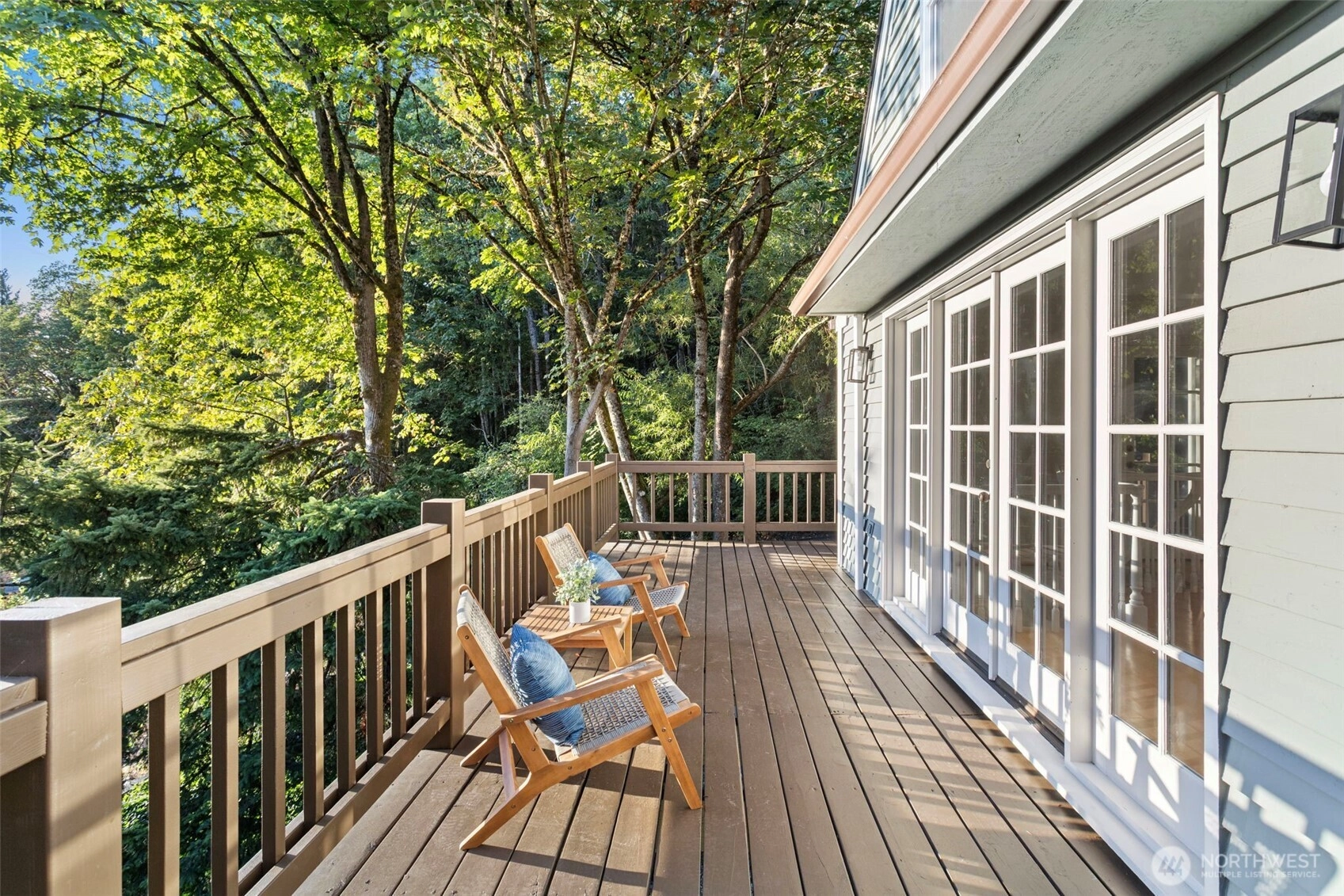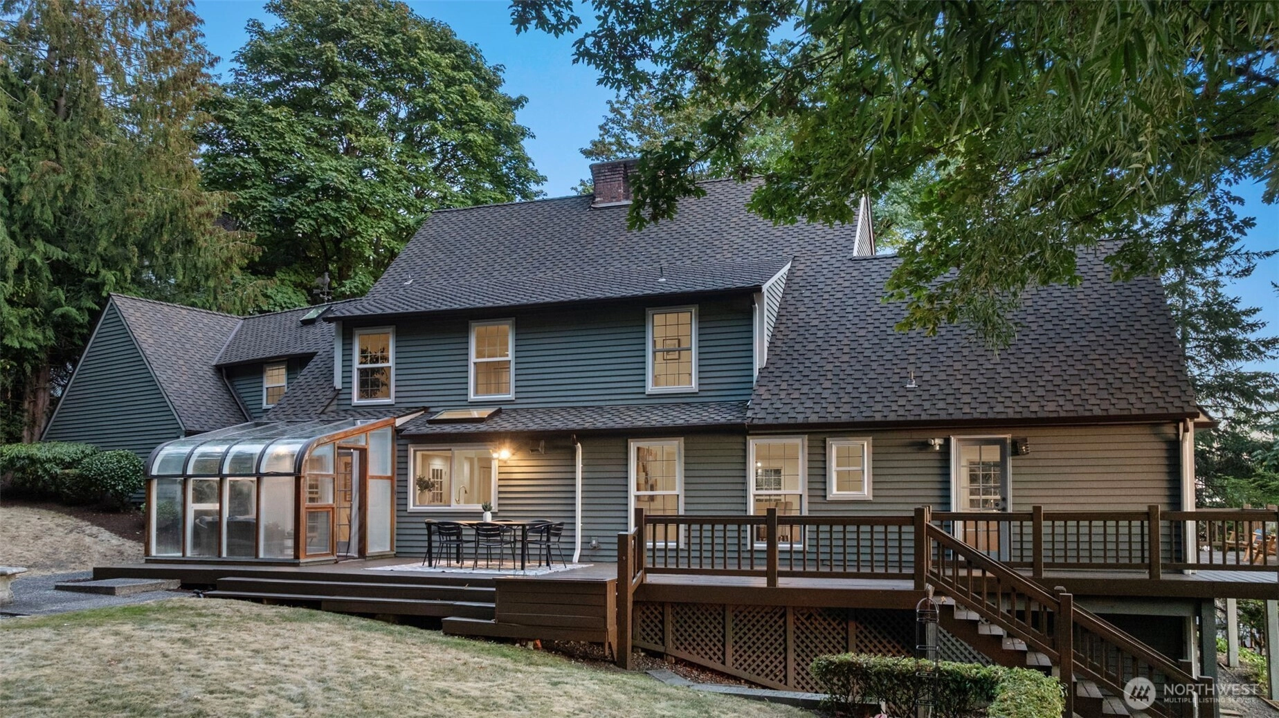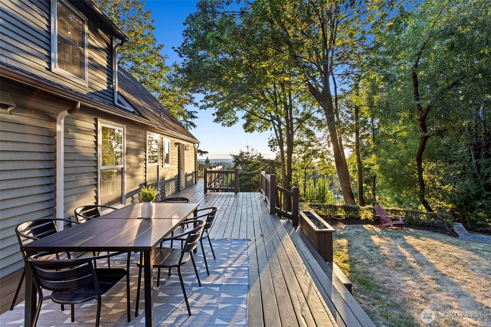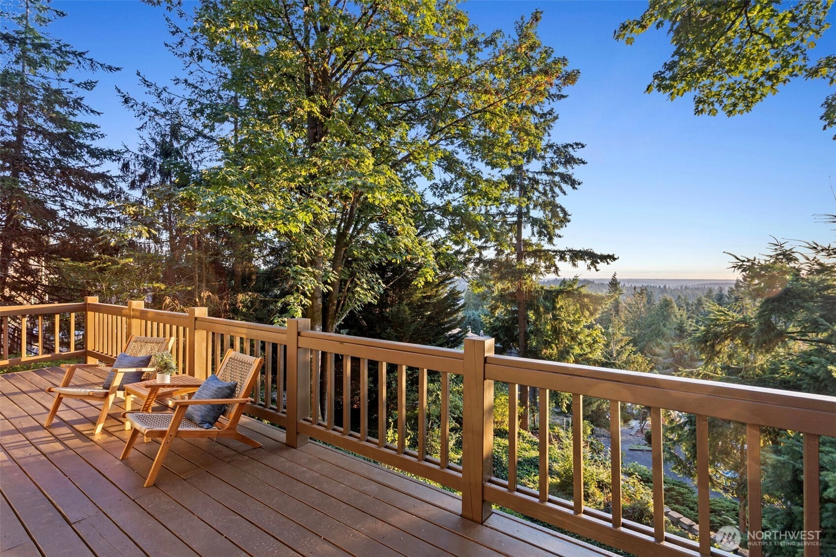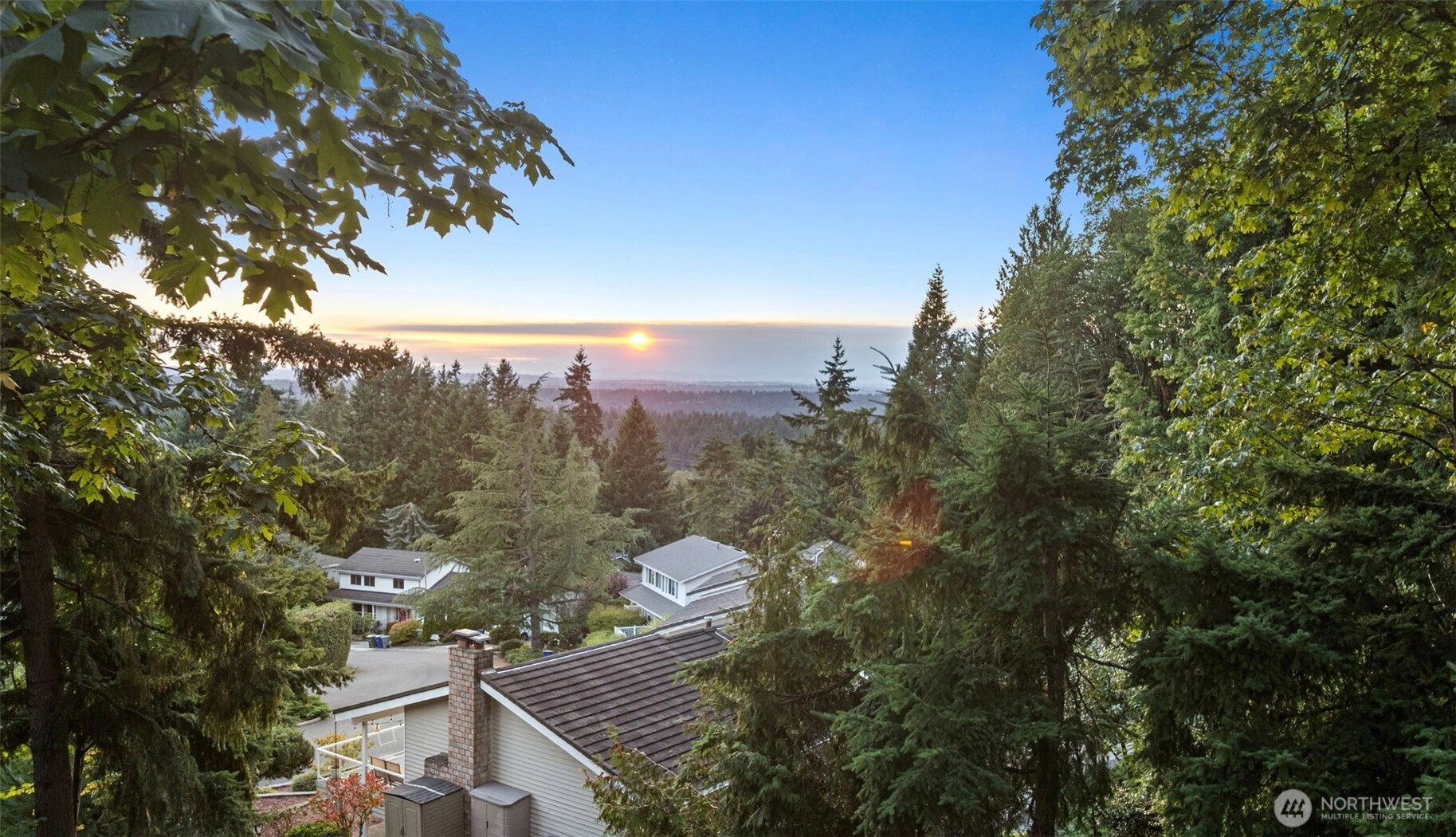 Welcome to this stunning Somerset hm w/4 bedrms+spacious bonus room, perfectly situated on a private .43-acre lot backing to greenbelt w/Olympic Mtn views. Upstairs patio, light-filled sunroom, & expansive wrap-around deck flow seamlessly into a lush, private yard. Inside, elegance meets comfort w/ a fully updated kitchen featuring high-end finishes, a gorgeous new 5-pc primary suite, fresh paint & carpet upstairs. Other updates include kids bath/gutter/furnace/insulation/most windows. Open-concept kitchen, dining/family areas create an effortless space for both entertaining & daily living. Additional highlights include Skylights, Presidential roof, wet bar, EV charging, mature landscaping w/smart sprinkler system. Top-rated Bellevue School