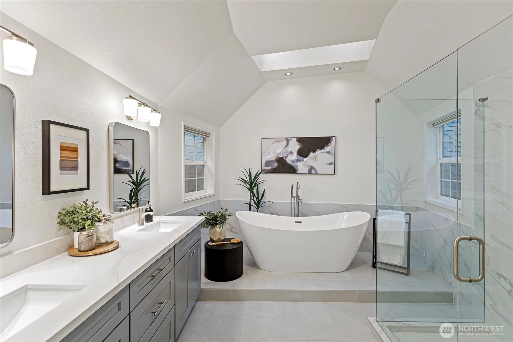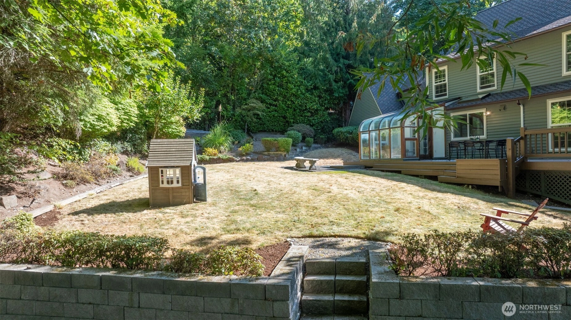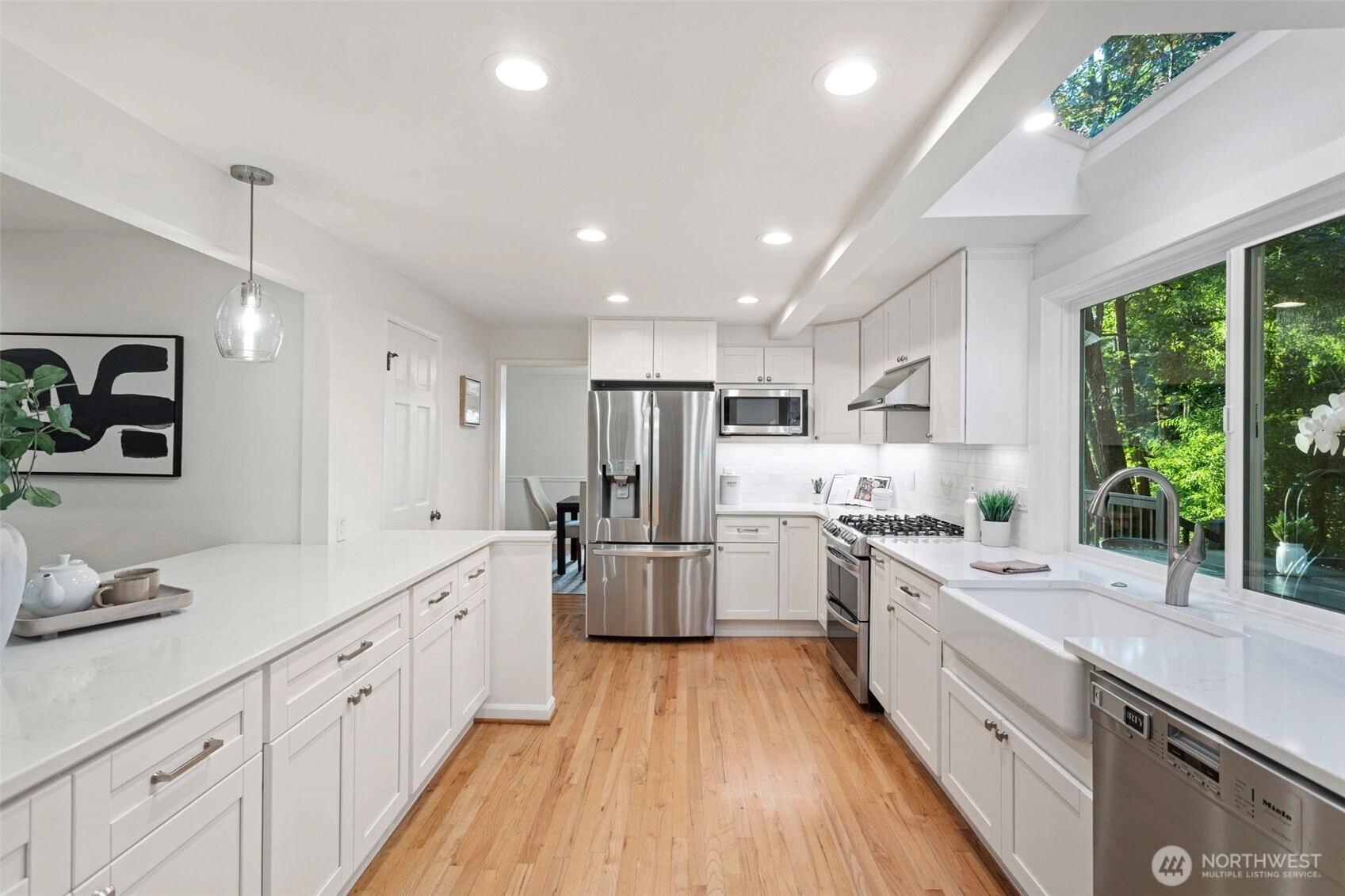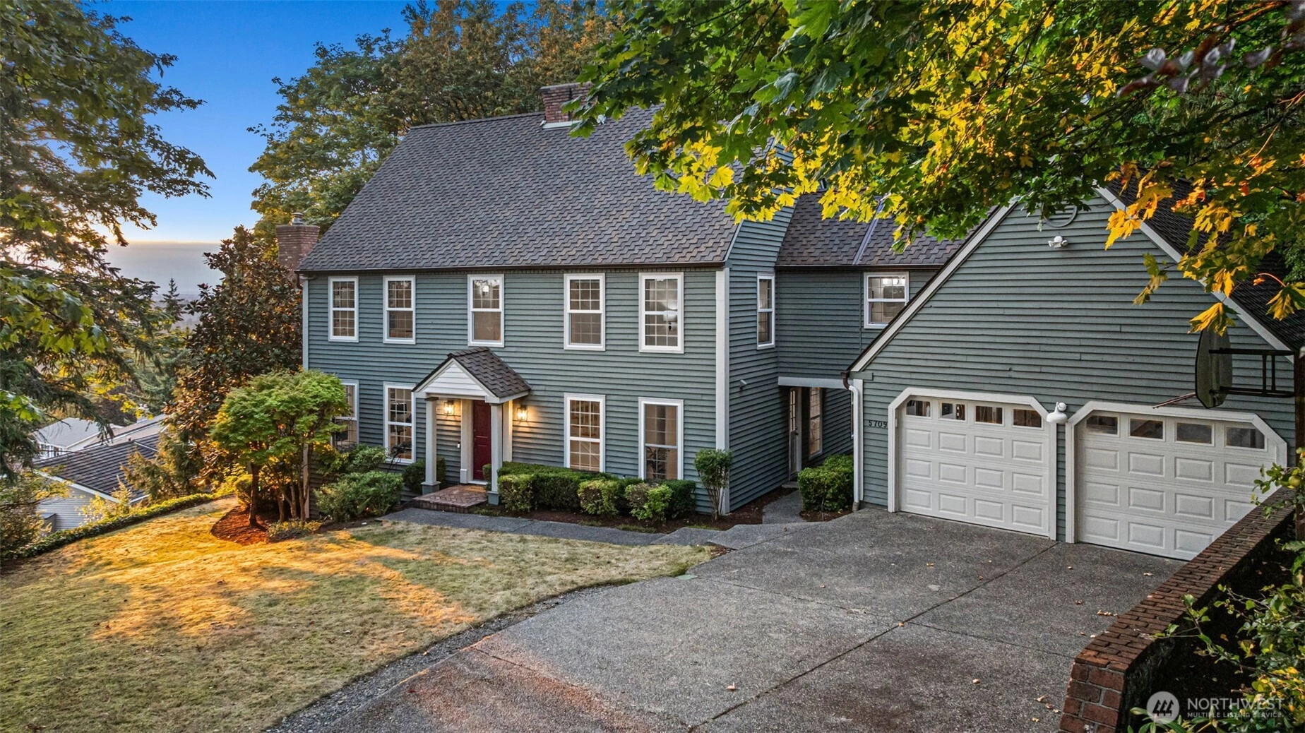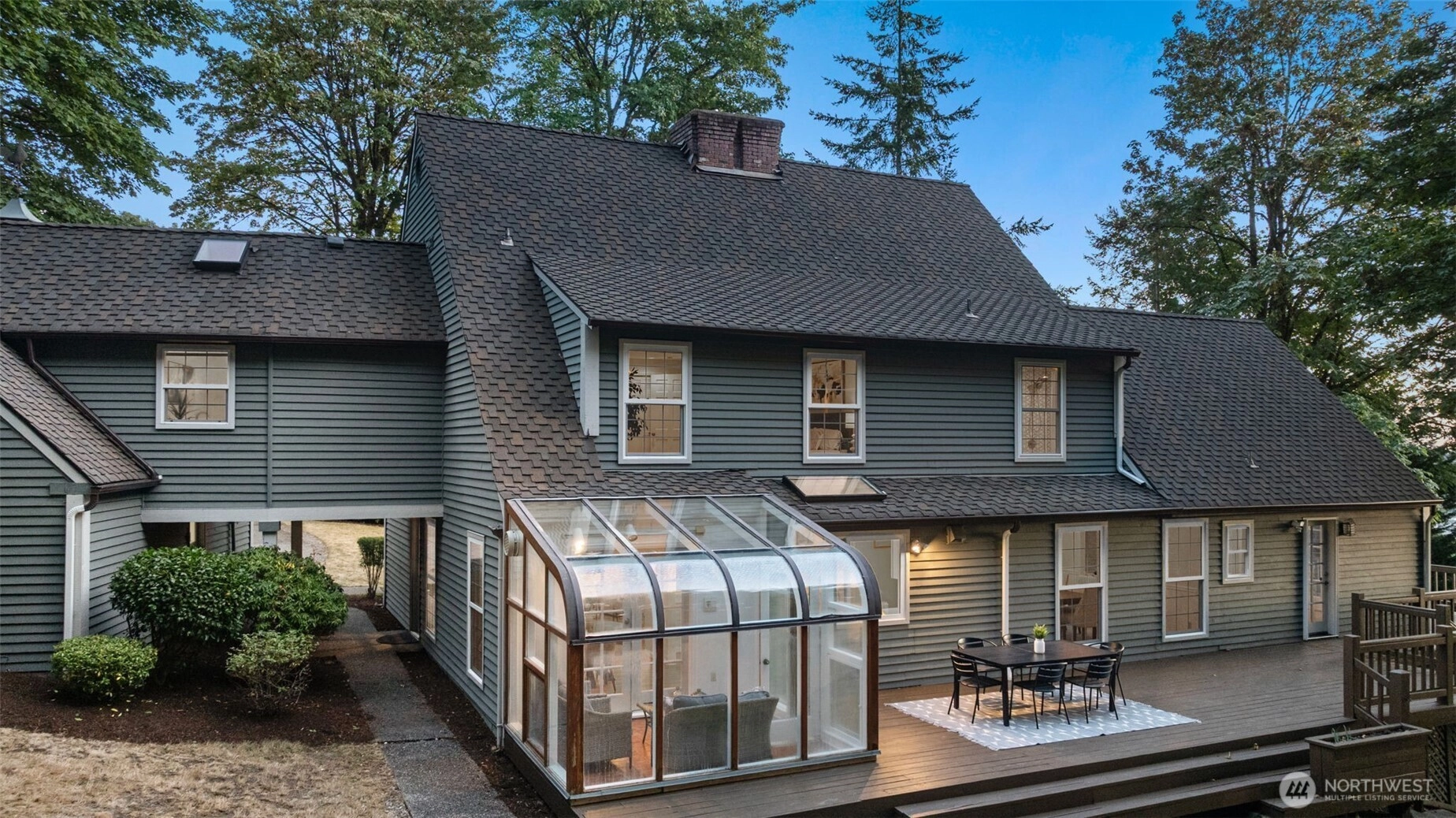 Welcome to this stunning Somerset hm w/4 bedrms+spacious bonus room, perfectly situated on a private .43-acre lot backing to greenbelt w/Olympic Mtn views. Upstairs patio, light-filled sunroom, & expansive wrap-around deck flow seamlessly into a lush, private yard. Inside, elegance meets comfort w/ a fully updated kitchen featuring high-end finishes, a gorgeous new 5-pc primary suite, fresh paint & carpet upstairs. Other updates include kids bath/gutter/furnace/insulation/most windows. Open-concept kitchen, dining/family areas create an effortless space for both entertaining & daily living. Additional highlights include Skylights, Presidential roof, wet bar, EV charging, mature landscaping w/smart sprinkler system. Top-rated Bellevue School