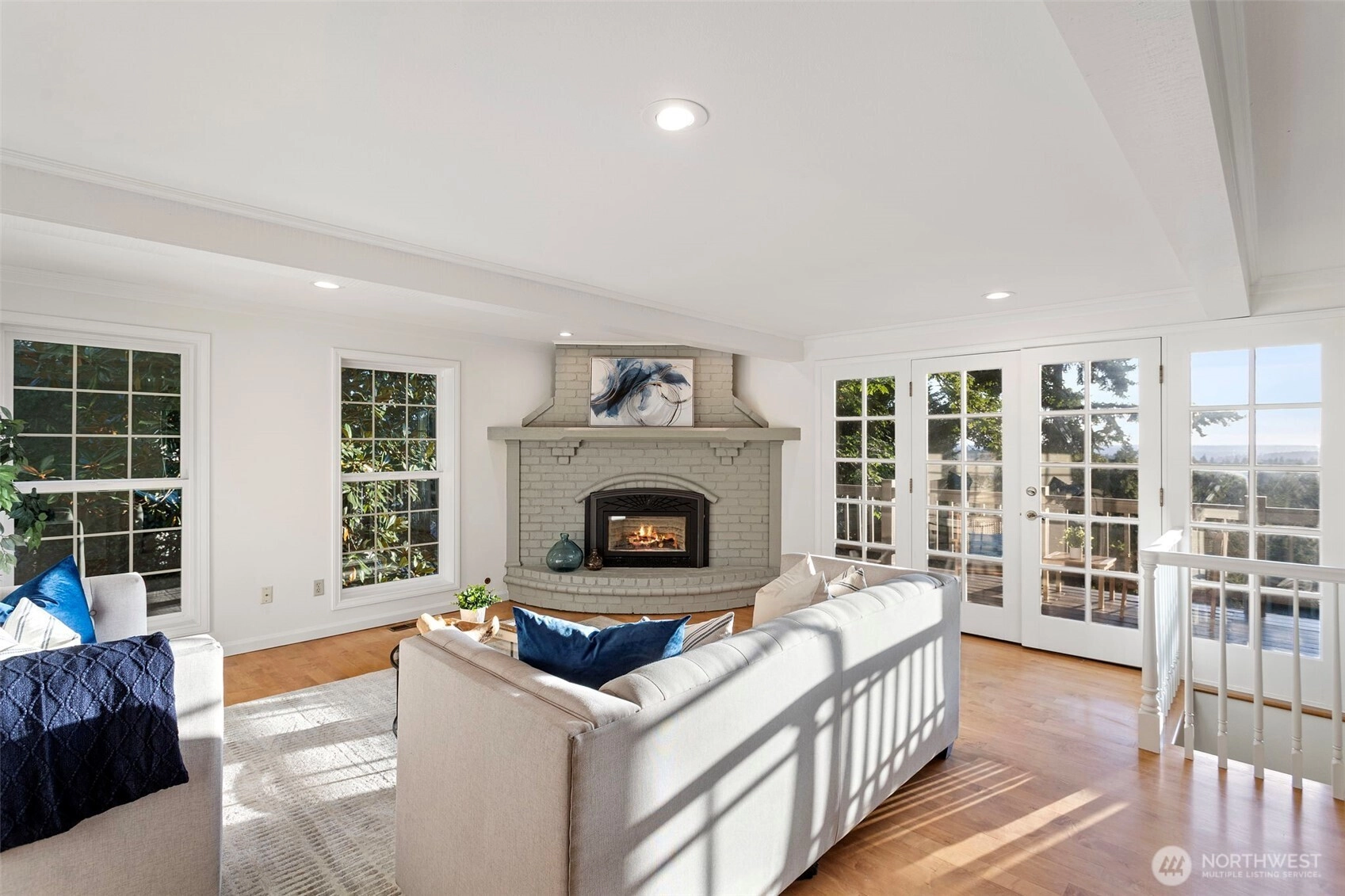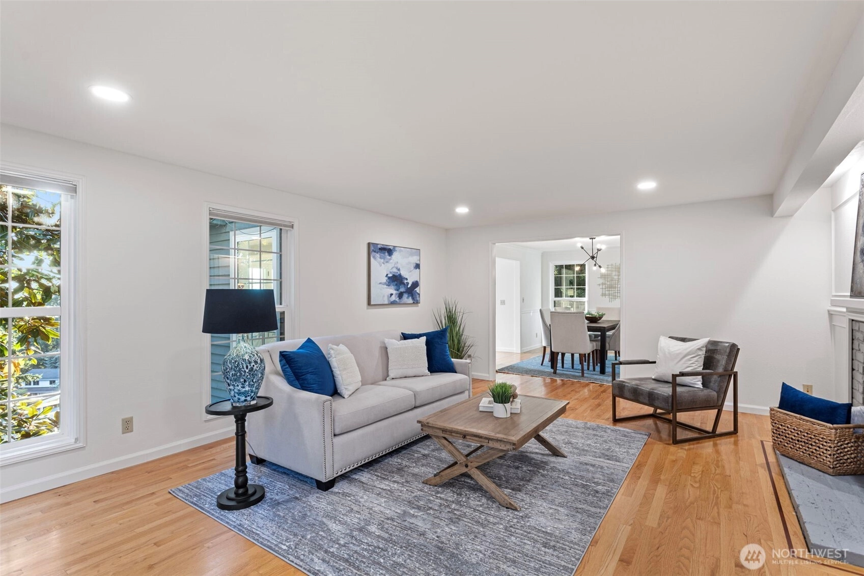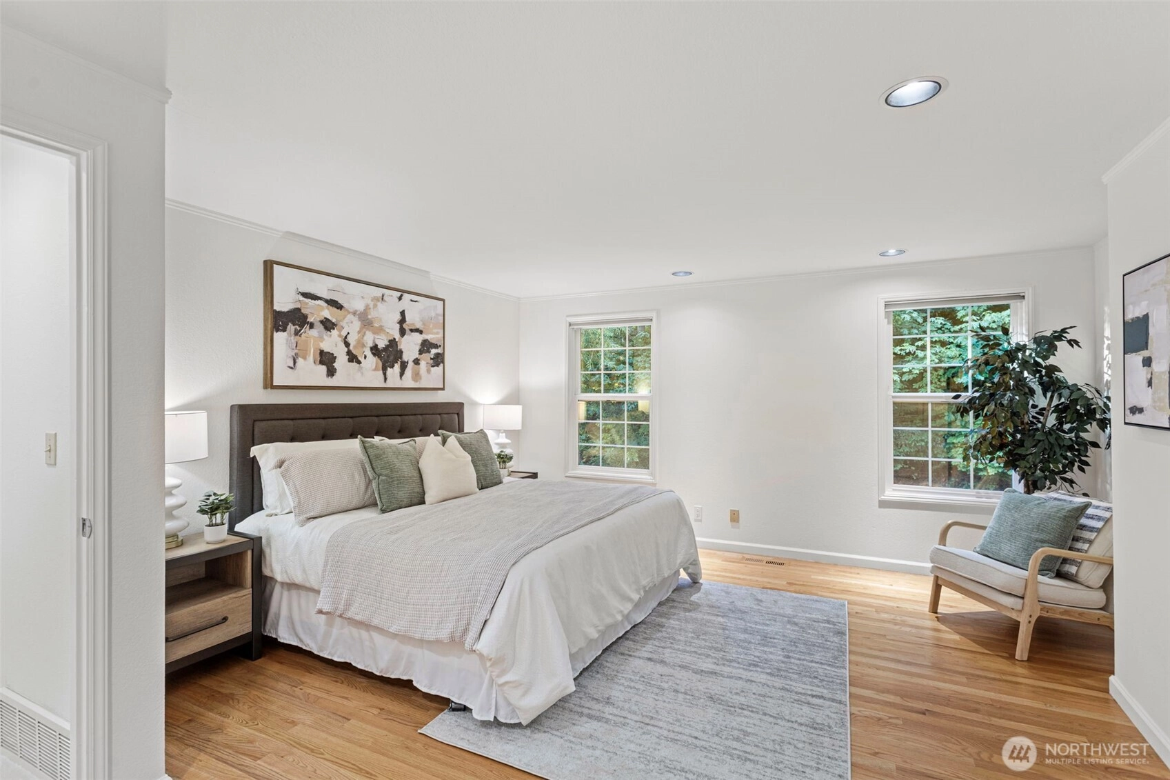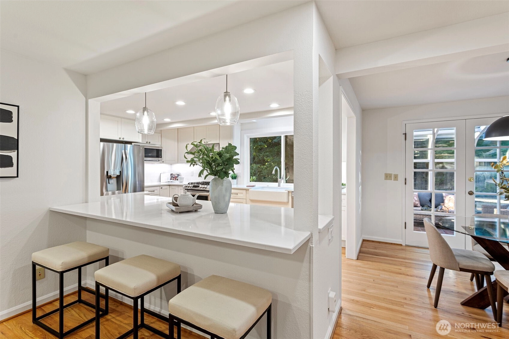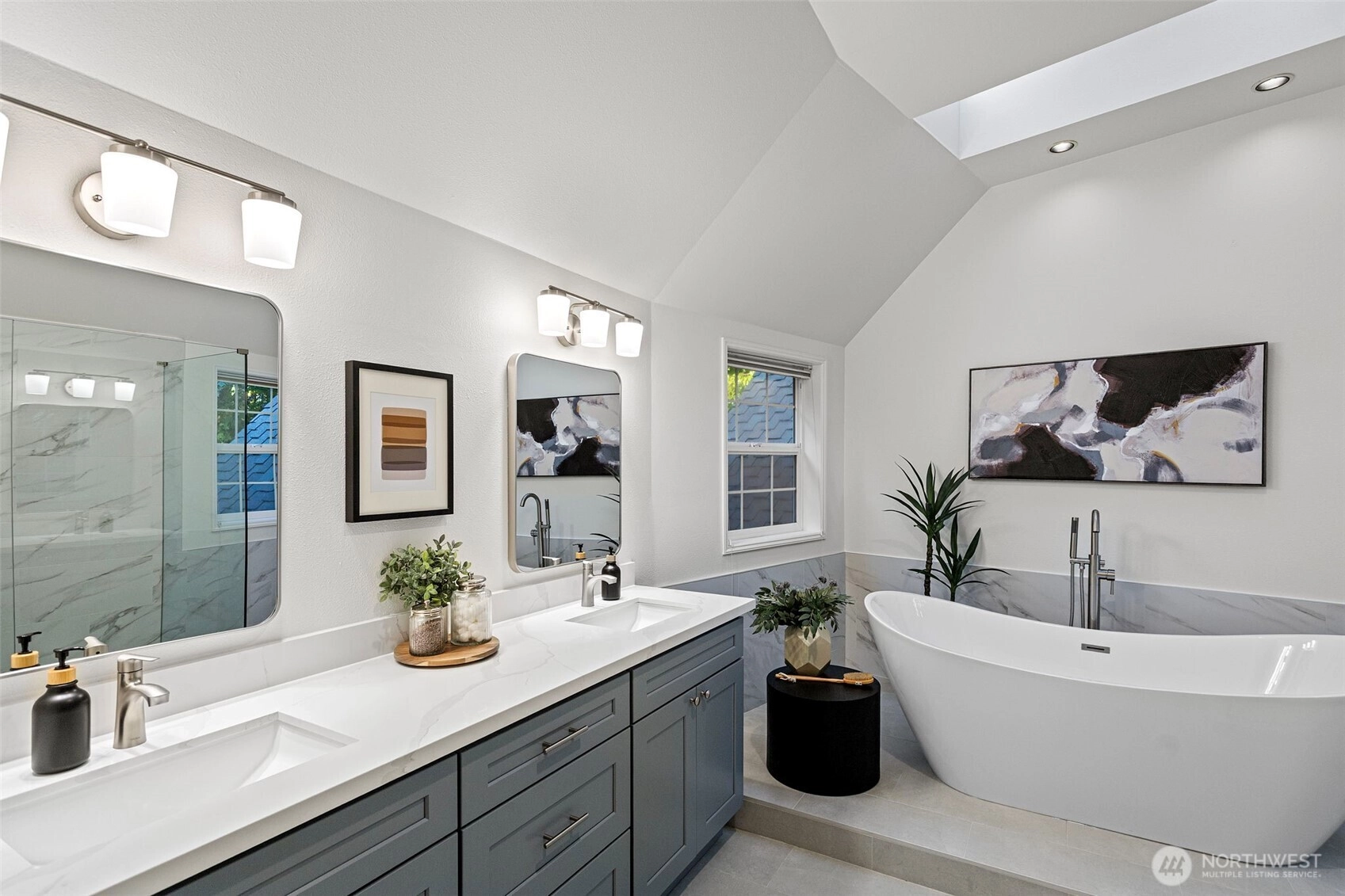 Welcome to this stunning Somerset hm w/4 bedrms+spacious bonus room, perfectly situated on a private .43-acre lot backing to greenbelt w/Olympic Mtn views. Upstairs patio, light-filled sunroom, & expansive wrap-around deck flow seamlessly into a lush, private yard. Inside, elegance meets comfort w/ a fully updated kitchen featuring high-end finishes, a gorgeous new 5-pc primary suite, fresh paint & carpet upstairs. Other updates include kids bath/gutter/furnace/insulation/most windows. Open-concept kitchen, dining/family areas create an effortless space for both entertaining & daily living. Additional highlights include Skylights, Presidential roof, wet bar, EV charging, mature landscaping w/smart sprinkler system. Top-rated Bellevue School