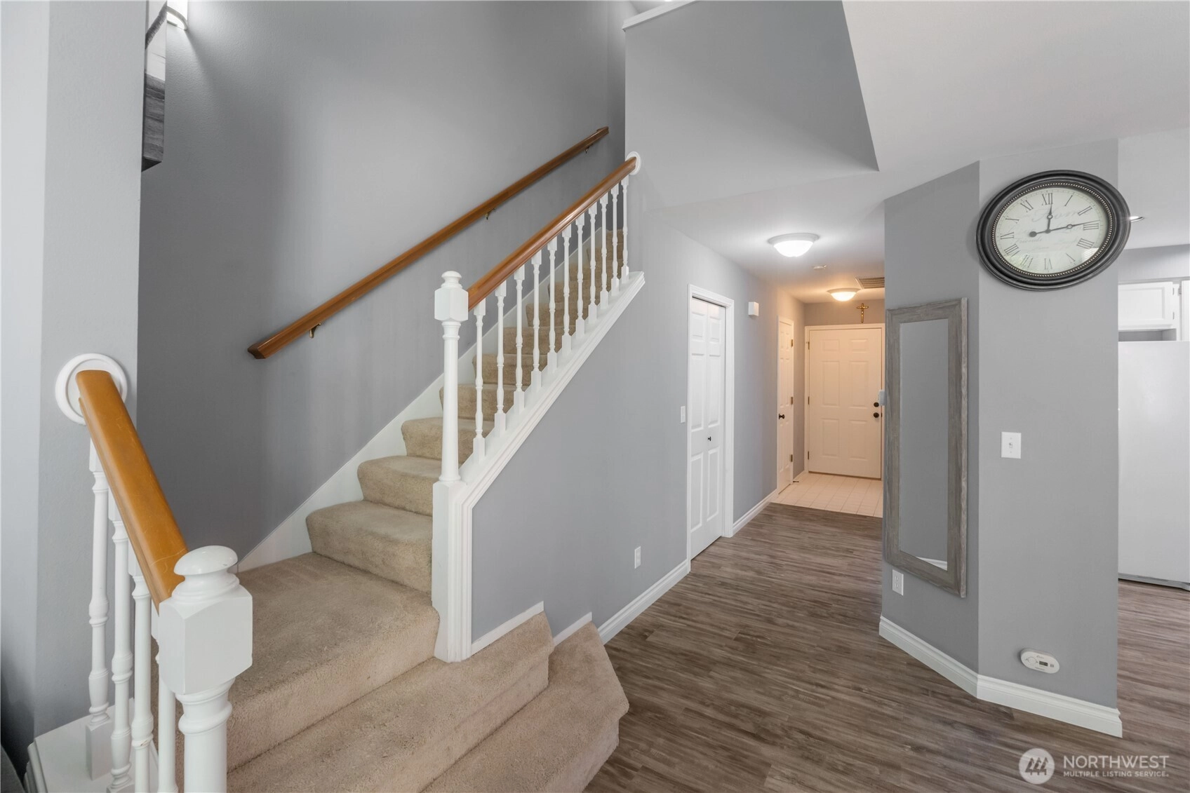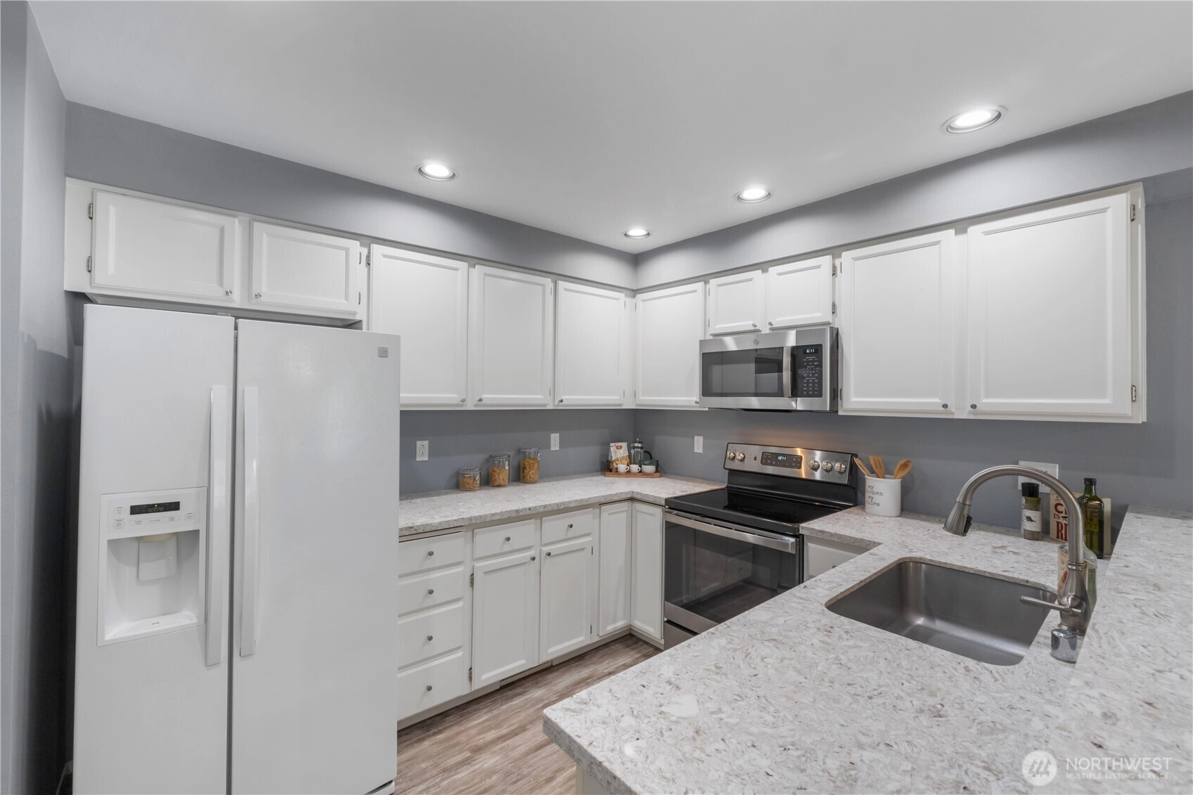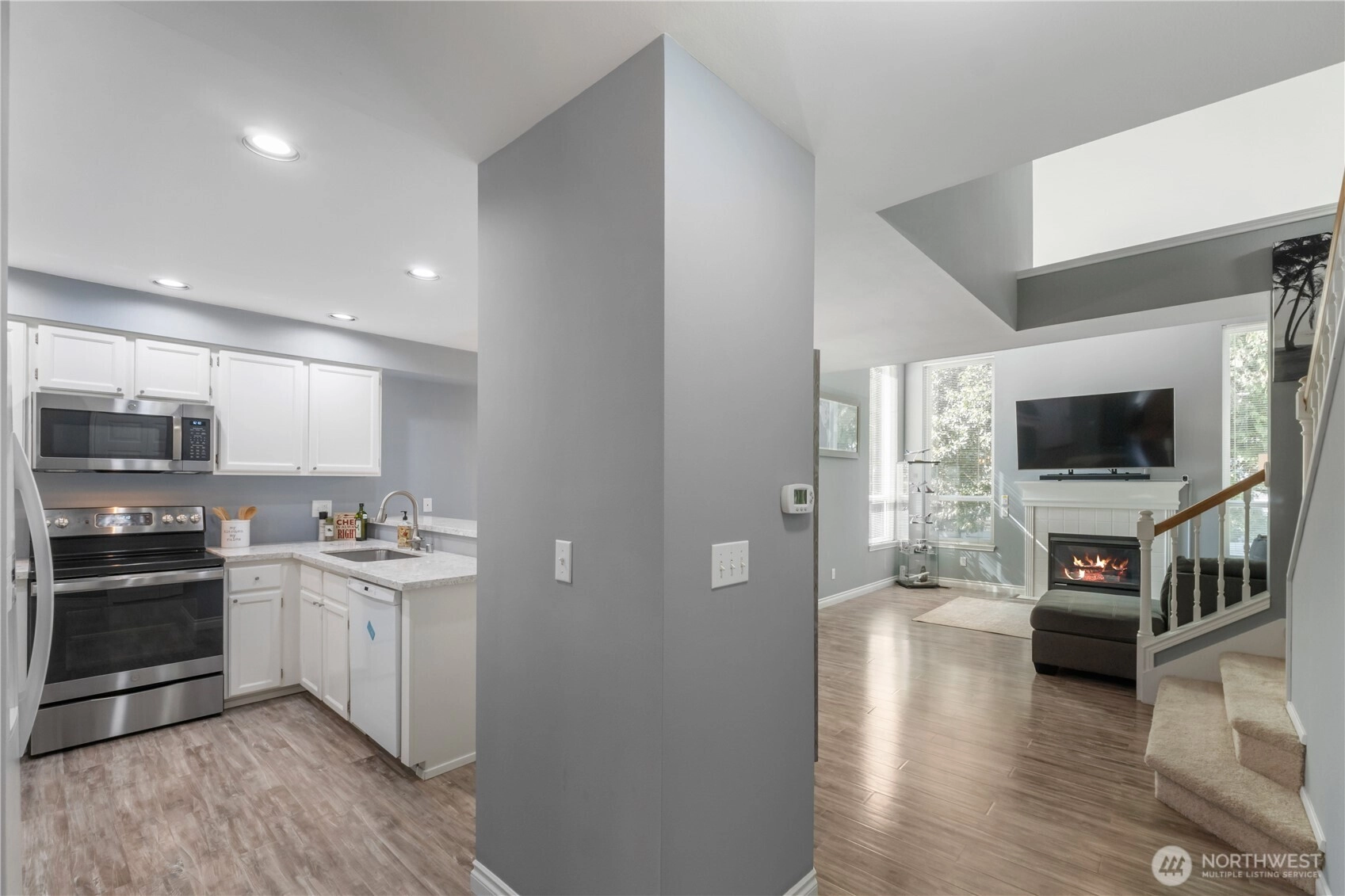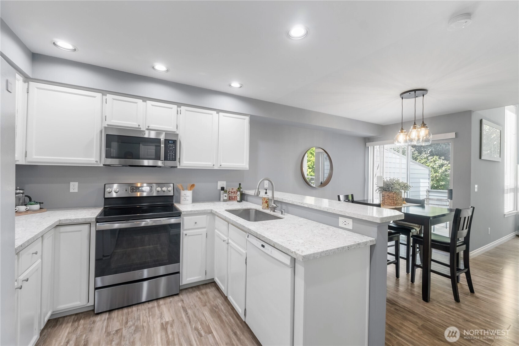 Just what you've been waiting for...comfortable living at a reasonable price in the sought after community of Le Blanc Gardens. Enjoy this 2-story townhome/condo with 3 bedrooms/2.5 baths, 1,416 SF, vaulted ceilings & lots of light throughout the main floor. Updated laminate flooring on the first floor, as well as gorgeous quartz kitchen counters & updated cabinets with dining/eating area. Enjoy the ambiance of the gas fireplace in the living room, which has a slider leading to a fully fenced back deck. Upstairs is the primary with dual closets & a full bath & 2 additional bedrooms with a main full bath. Easy freeway access and close to restaurants & shopping.