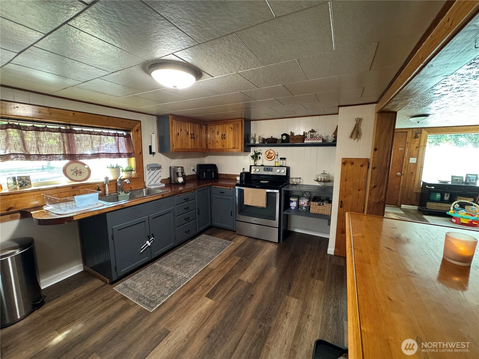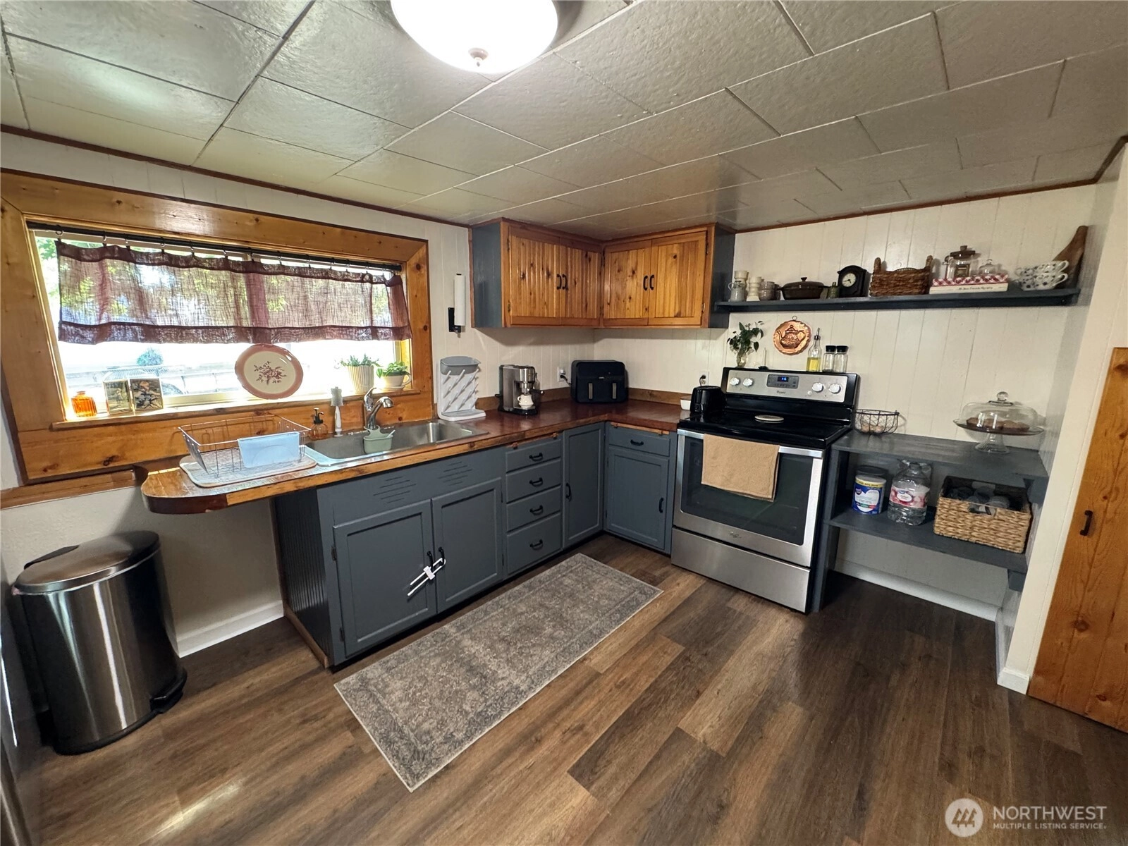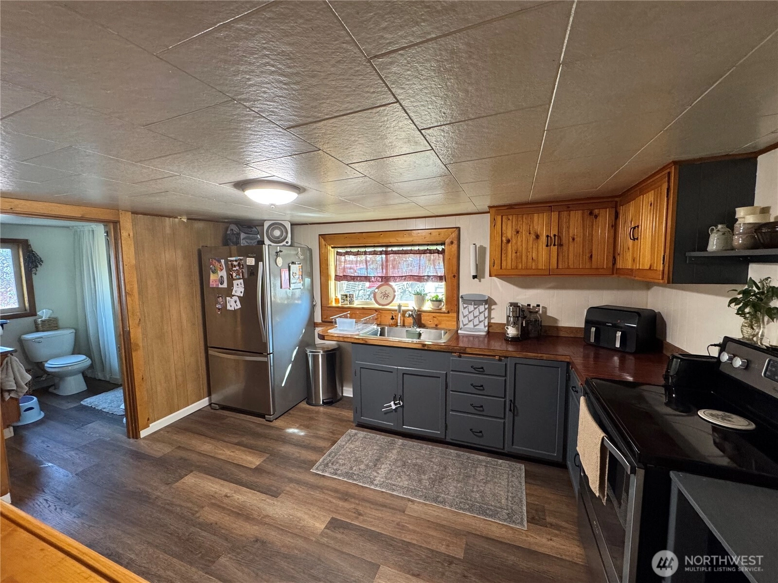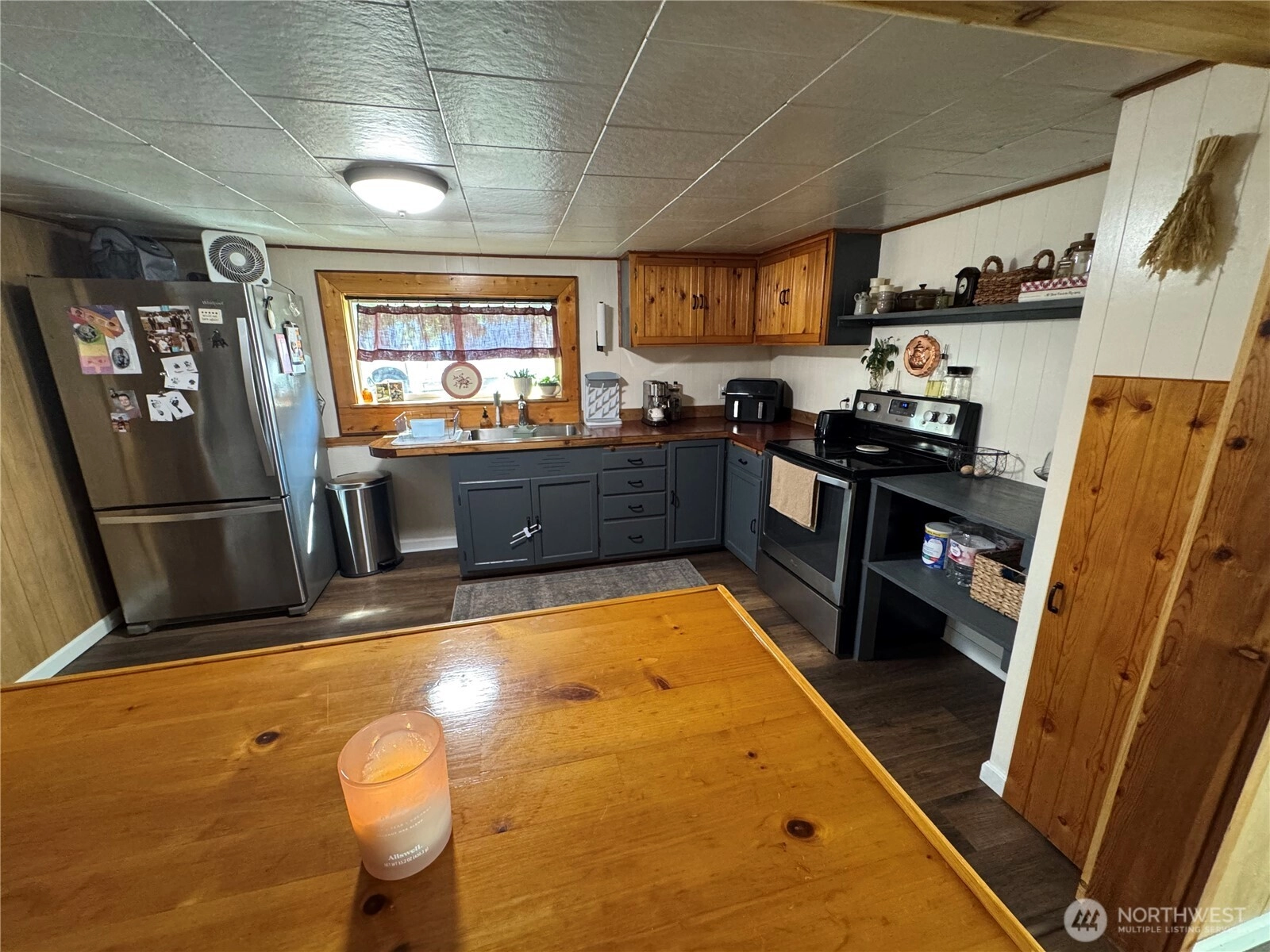 Two bedroom cottage that lives larger than it looks! Kitchen opens up to the sprawling living room that has a wood stove for cozy heat, plus a ductless mini-split for energy efficient heating and cooling. The house also has a full bathroom and a small utility area. Fenced backyard with plenty of room for activities. There is also a 360 sf shop with a 240 sf covered patio, and off-street parking! Located on a dead-end street near the river walking path, this would be an excellent property for snowbirds, first-time home buyers, or anyone looking to downsize!