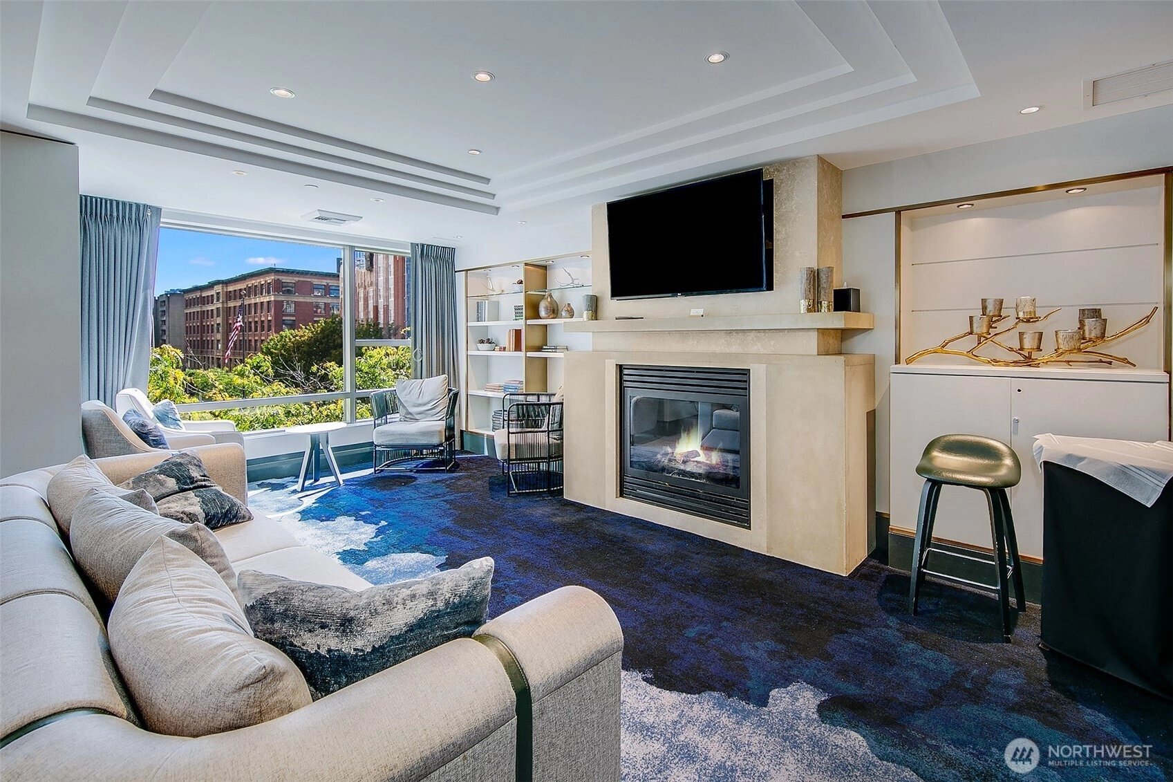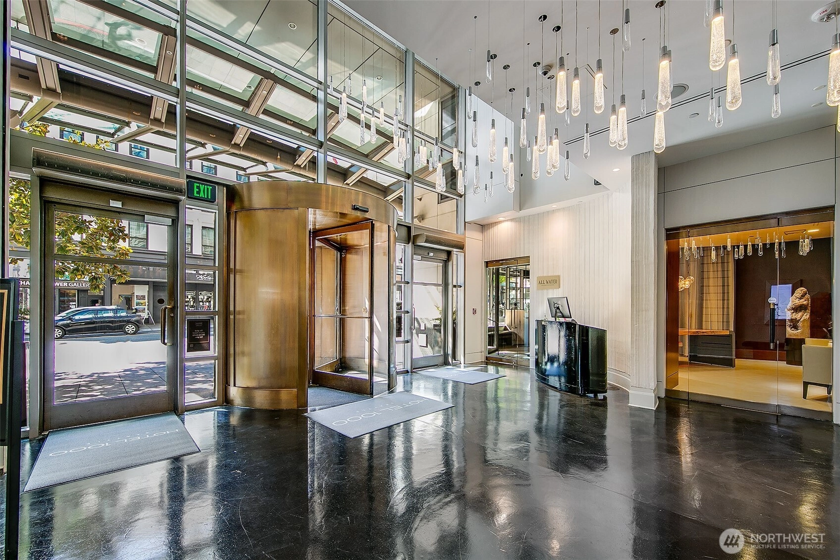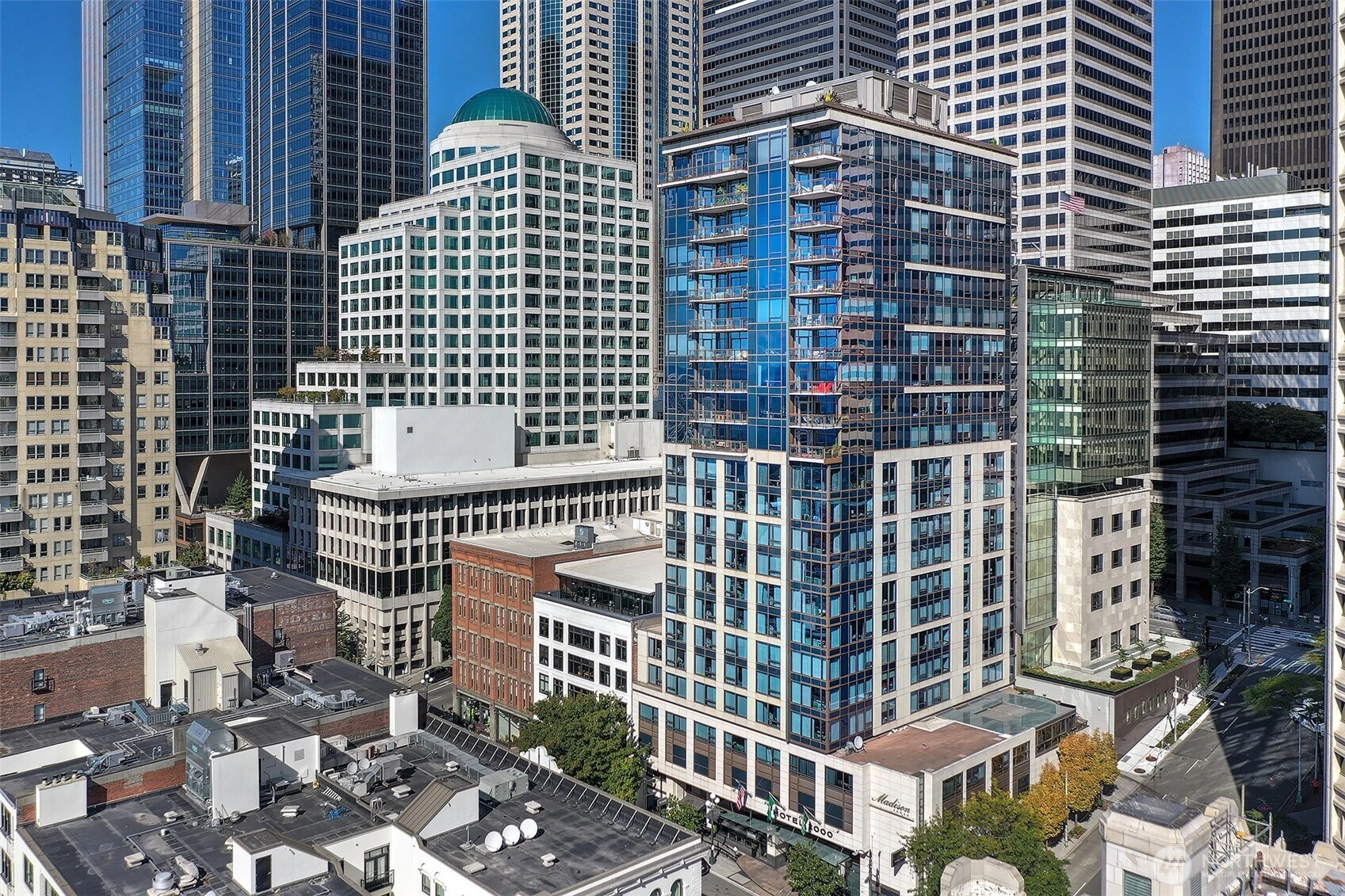 Madison Tower; Live the downtown hotel lifestyle from this perfect location on 1st and Madison. With the city alive and the new Waterfront District nearby, the time is now to choose a home -or 2nd home- in Seattle. Walking distance to the stadiums, Pike Place Market, and all of the arts and culture in the city core, plus easy access in and out to I-5, I-90, and the ferries. A condominium above a hotel, Madison Tower enjoys an intimate community of owners plus 5-star Hotel 1000 amenities. Great privacy, high quality finishes with a lux cabinet/kitchen package, large living and bedroom spaces, a primary suite and walk-in closet, plus a 1/2 bath for guests and a den with lots of storage to maximize usability.