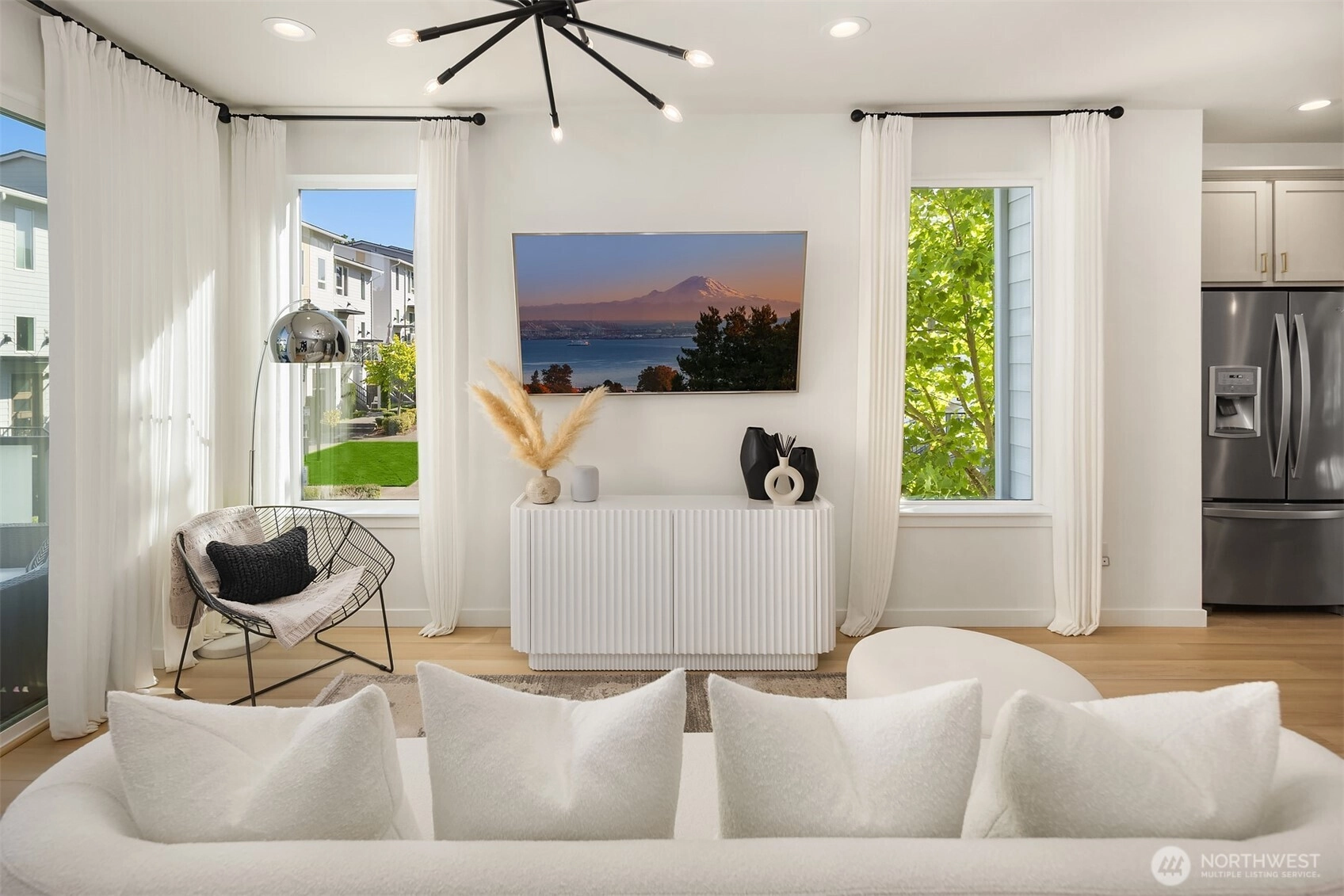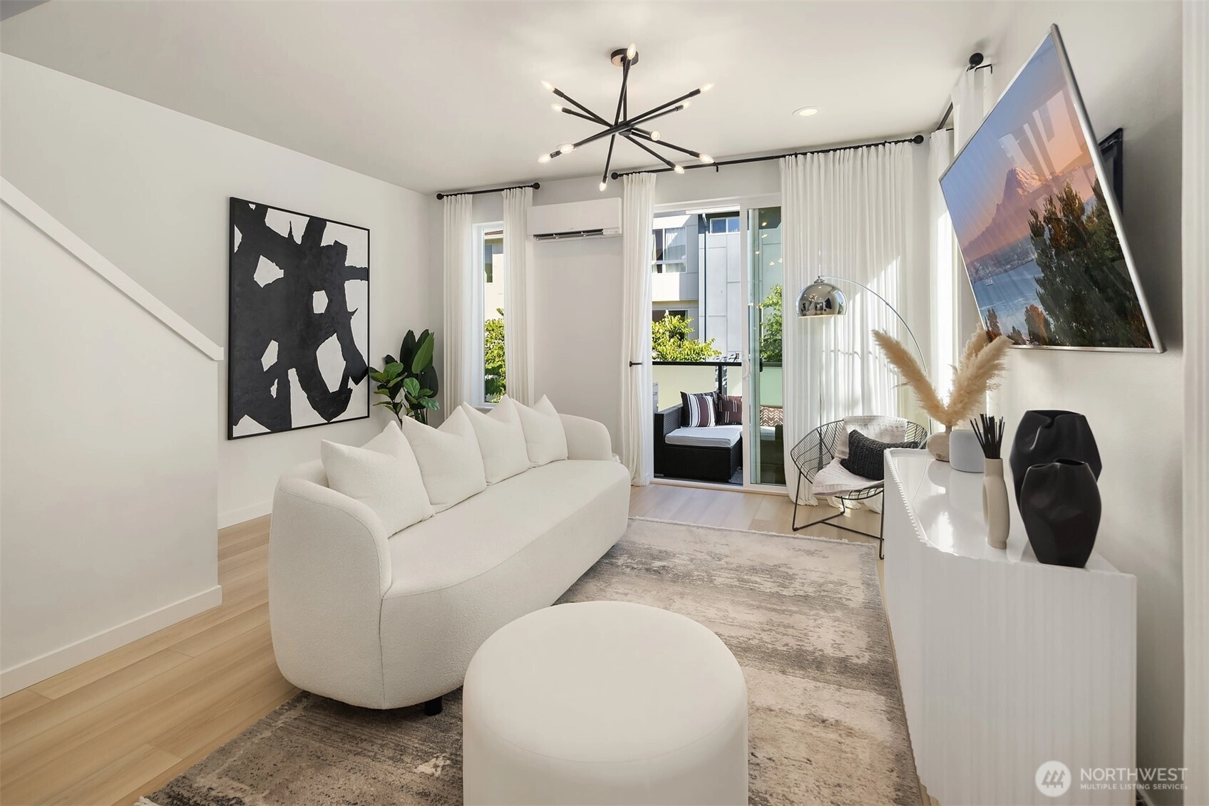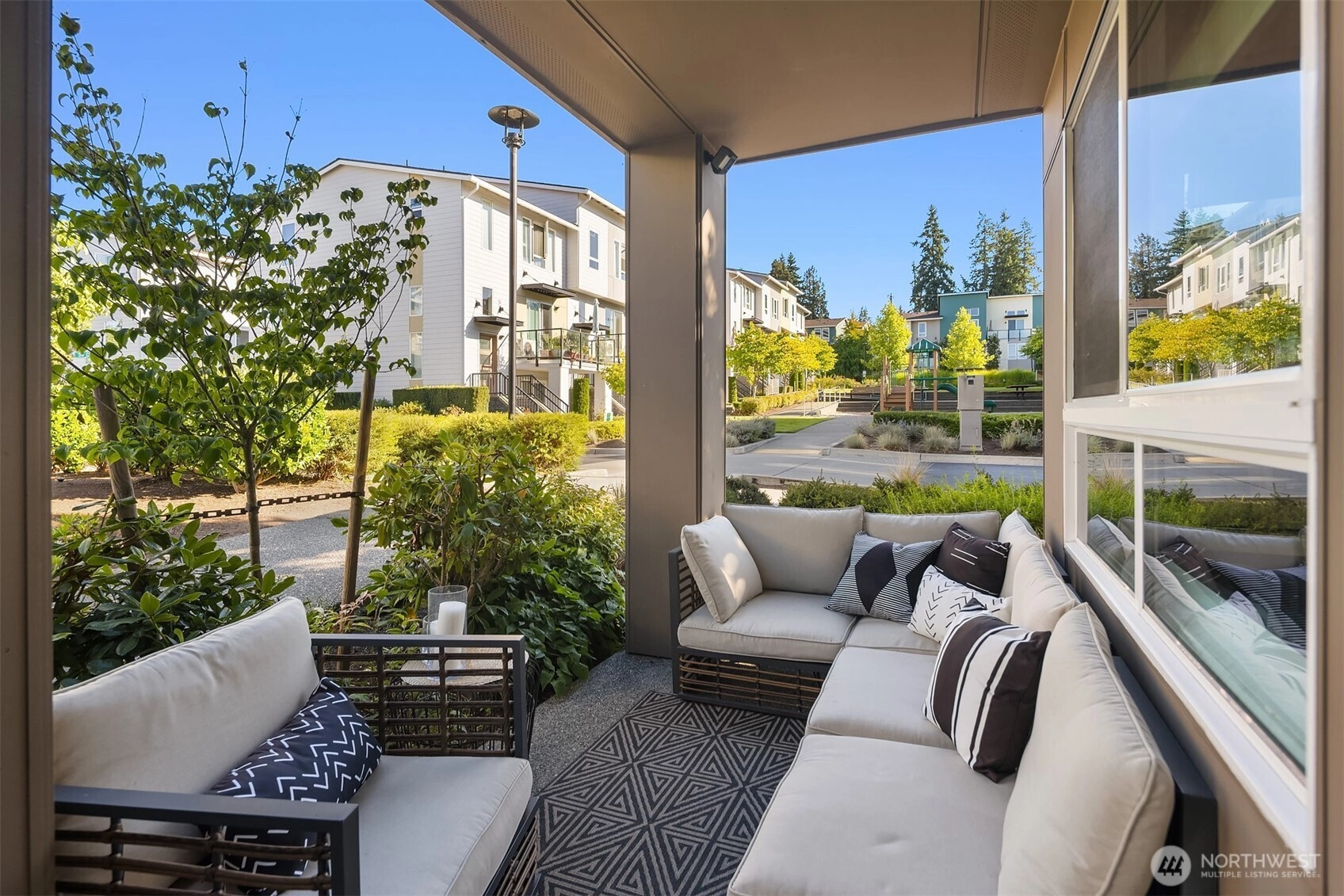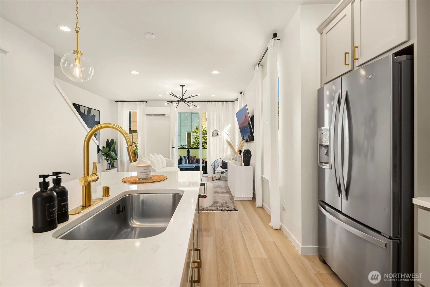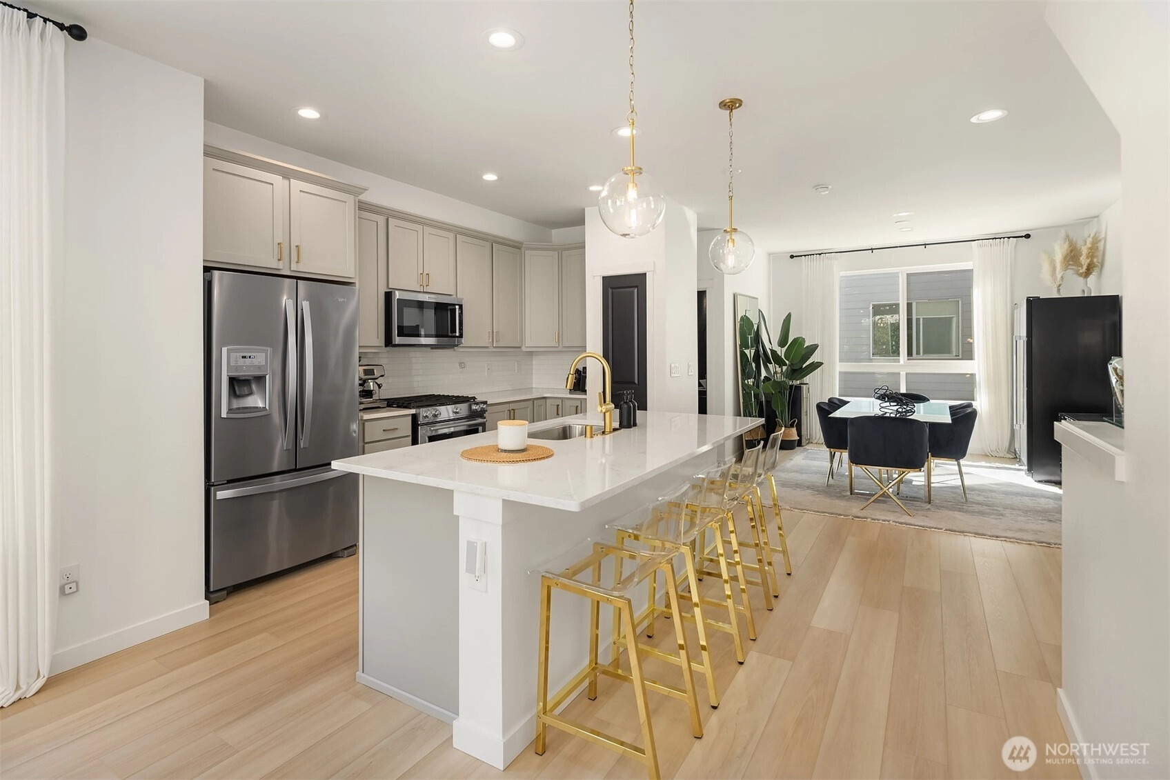 Stunningly renovated, sun-filled end-unit residence w/views of community park in desirable 12 Degrees North. High-end upgrades & designer finishes throughout. Over $50K in recent upgrades include central heating & cooling on upper level, along w/mini-splits on the main & lower levels, white oak laminate flooring, stylish hardware & modern lighting fixtures, refinished cabinetry, remodeled powder room, custom closet built-ins, glass/iron barn door & fresh paint. Open concept layout & thoughtful design w/each bedroom equipped w/own en-suite bath & a power room on the main. Enjoy private balcony & patio, 2-car garage & ample guest parking. Walkable to Burke-Gilman Trail, minutes to shopping & dining, & major commuting routes. No rental cap!