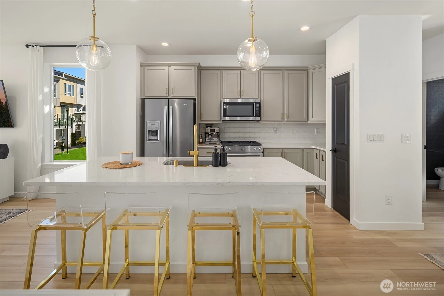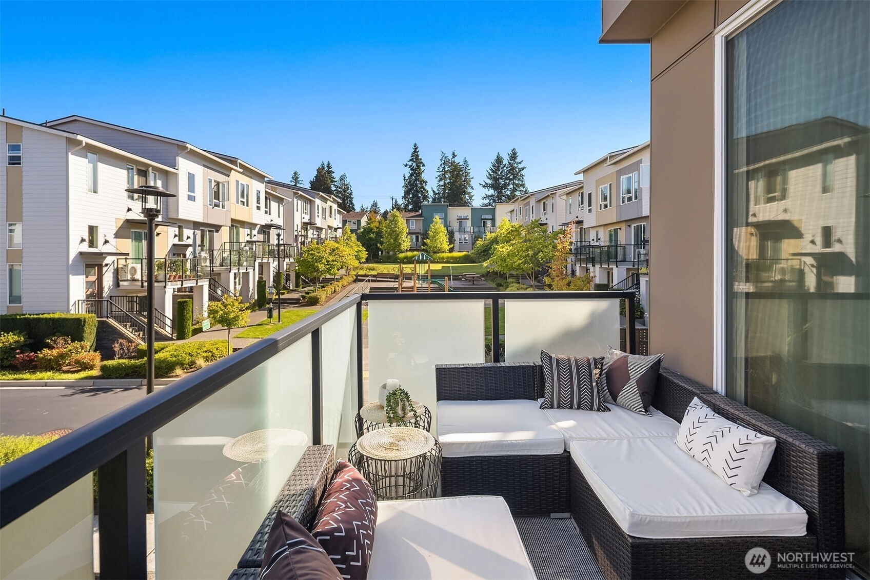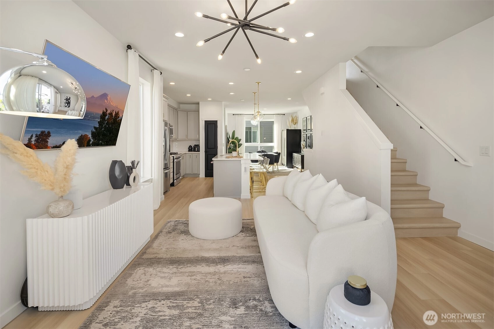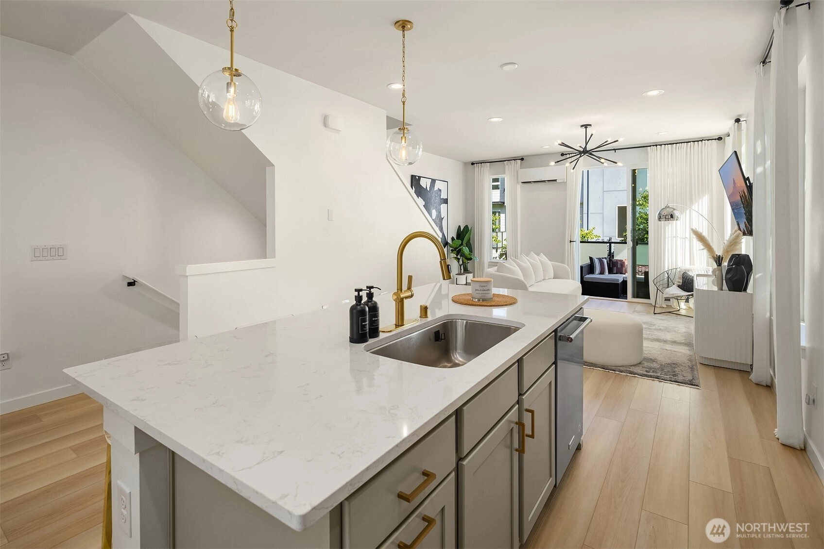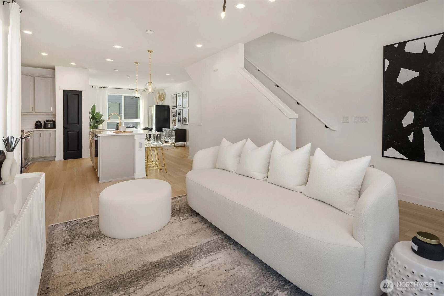 Stunningly renovated, sun-filled end-unit residence w/views of community park in desirable 12 Degrees North. High-end upgrades & designer finishes throughout. Over $50K in recent upgrades include central heating & cooling on upper level, along w/mini-splits on the main & lower levels, white oak laminate flooring, stylish hardware & modern lighting fixtures, refinished cabinetry, remodeled powder room, custom closet built-ins, glass/iron barn door & fresh paint. Open concept layout & thoughtful design w/each bedroom equipped w/own en-suite bath & a power room on the main. Enjoy private balcony & patio, 2-car garage & ample guest parking. Walkable to Burke-Gilman Trail, minutes to shopping & dining, & major commuting routes. No rental cap!