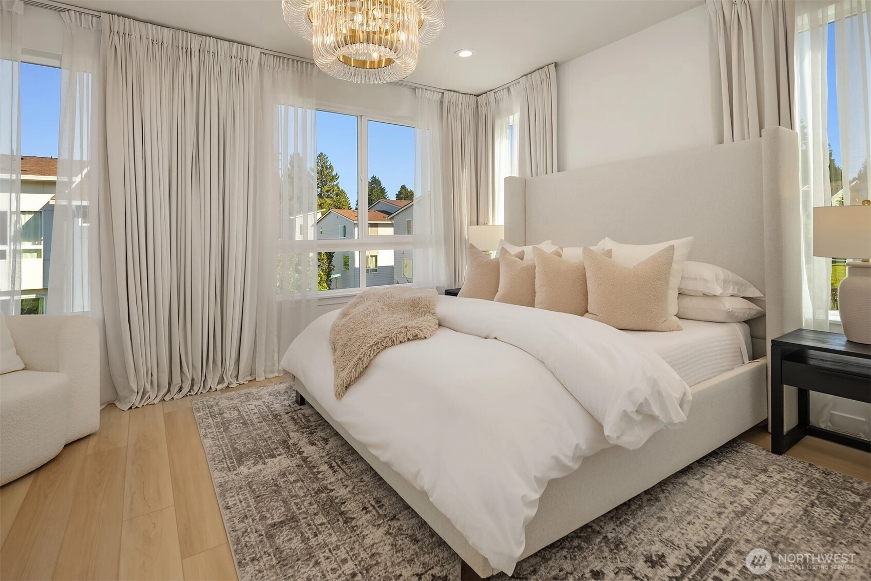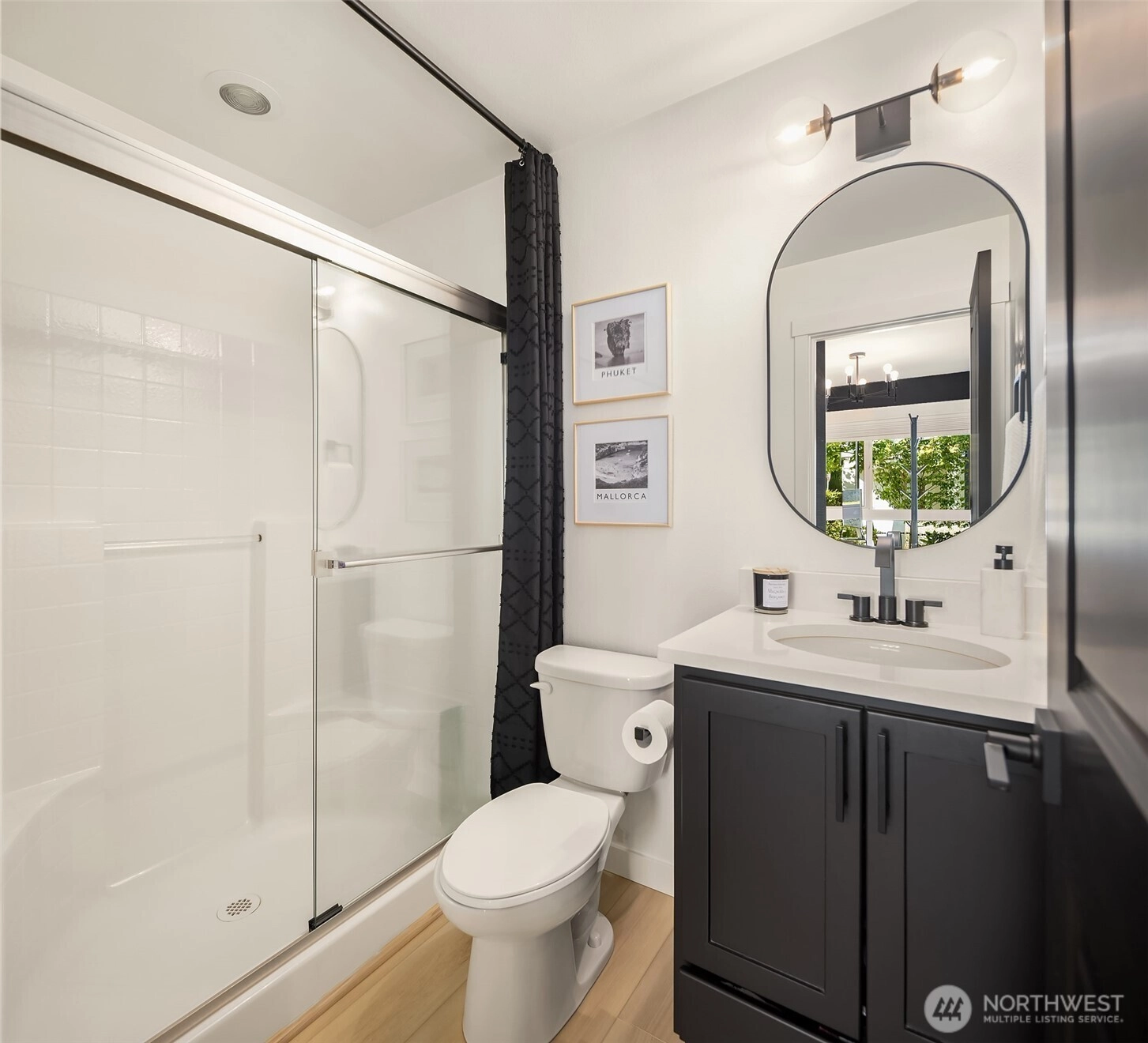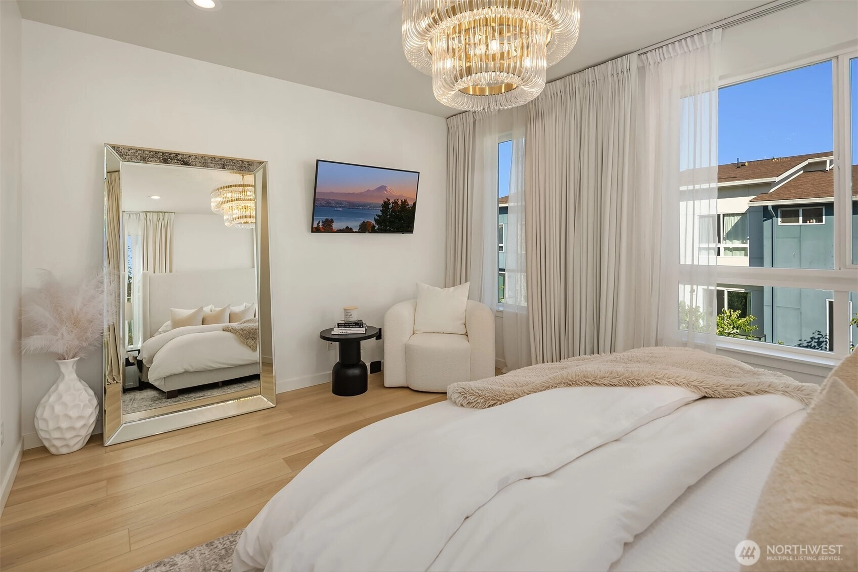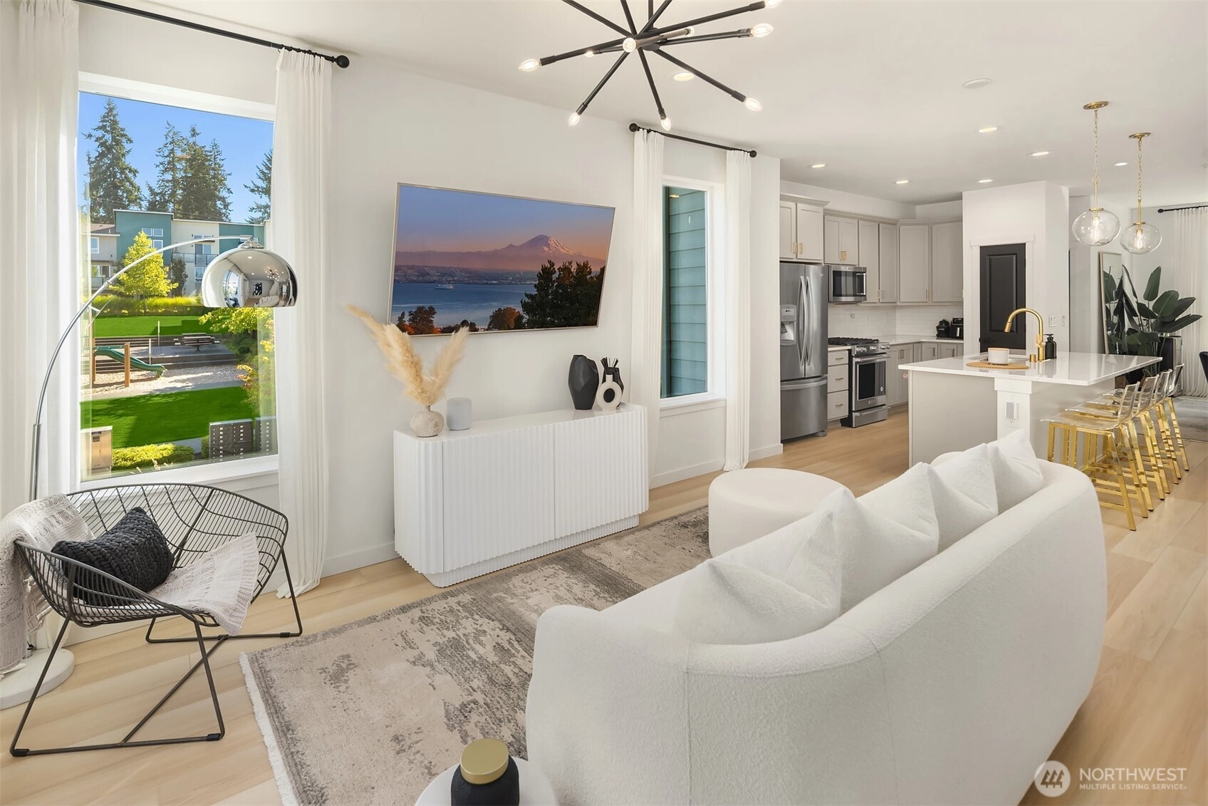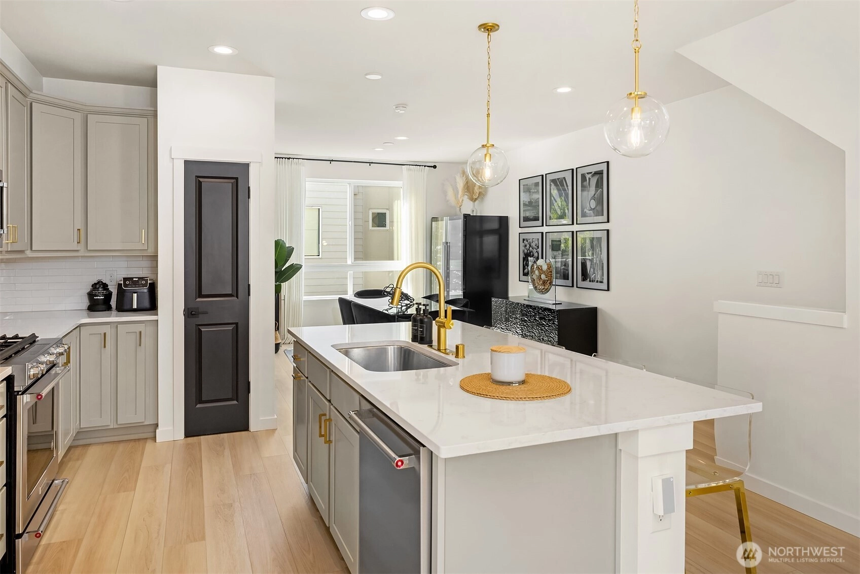 Stunningly renovated, sun-filled end-unit residence w/views of community park in desirable 12 Degrees North. High-end upgrades & designer finishes throughout. Over $50K in recent upgrades include central heating & cooling on upper level, along w/mini-splits on the main & lower levels, white oak laminate flooring, stylish hardware & modern lighting fixtures, refinished cabinetry, remodeled powder room, custom closet built-ins, glass/iron barn door & fresh paint. Open concept layout & thoughtful design w/each bedroom equipped w/own en-suite bath & a power room on the main. Enjoy private balcony & patio, 2-car garage & ample guest parking. Walkable to Burke-Gilman Trail, minutes to shopping & dining, & major commuting routes. No rental cap!