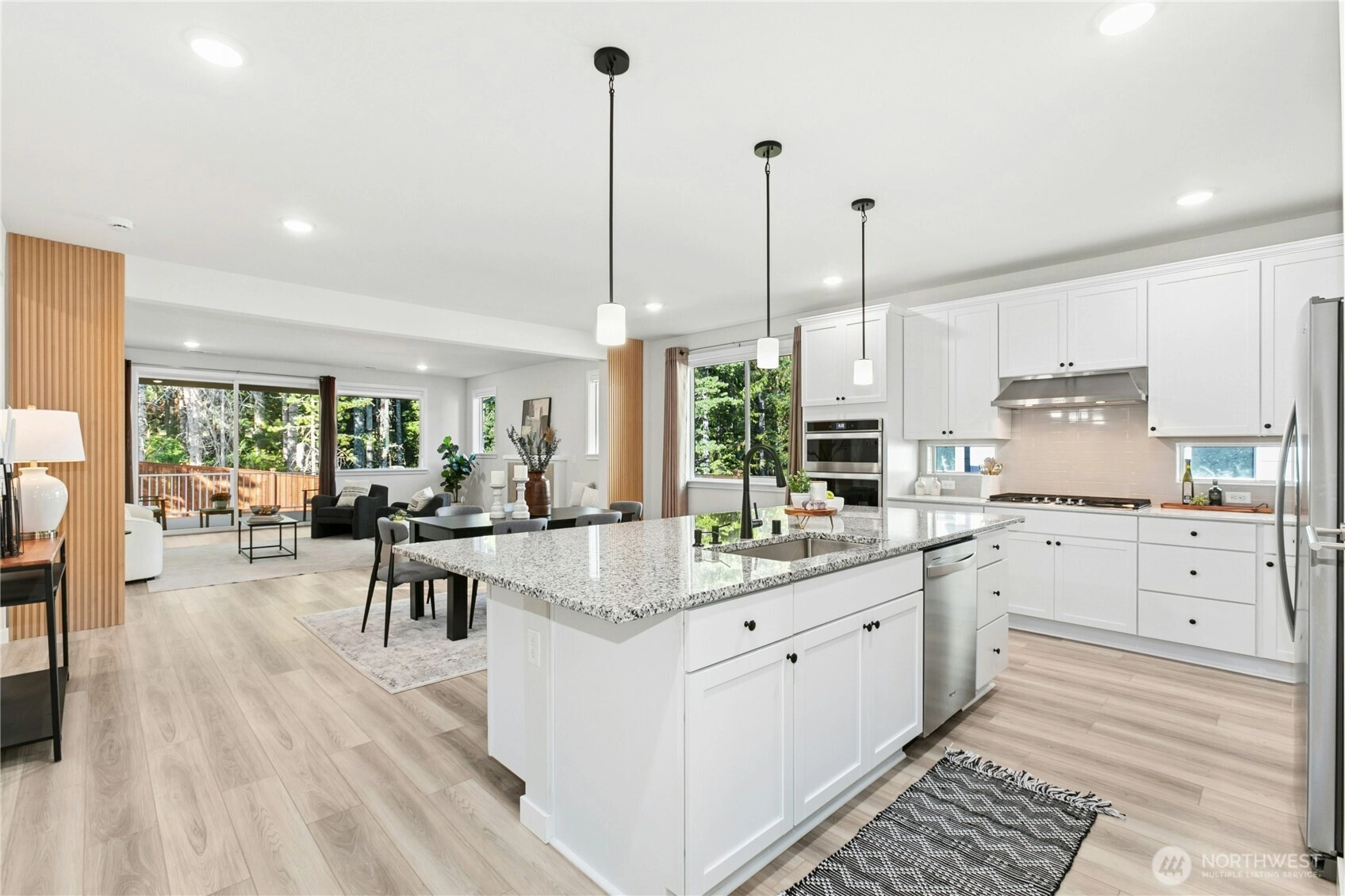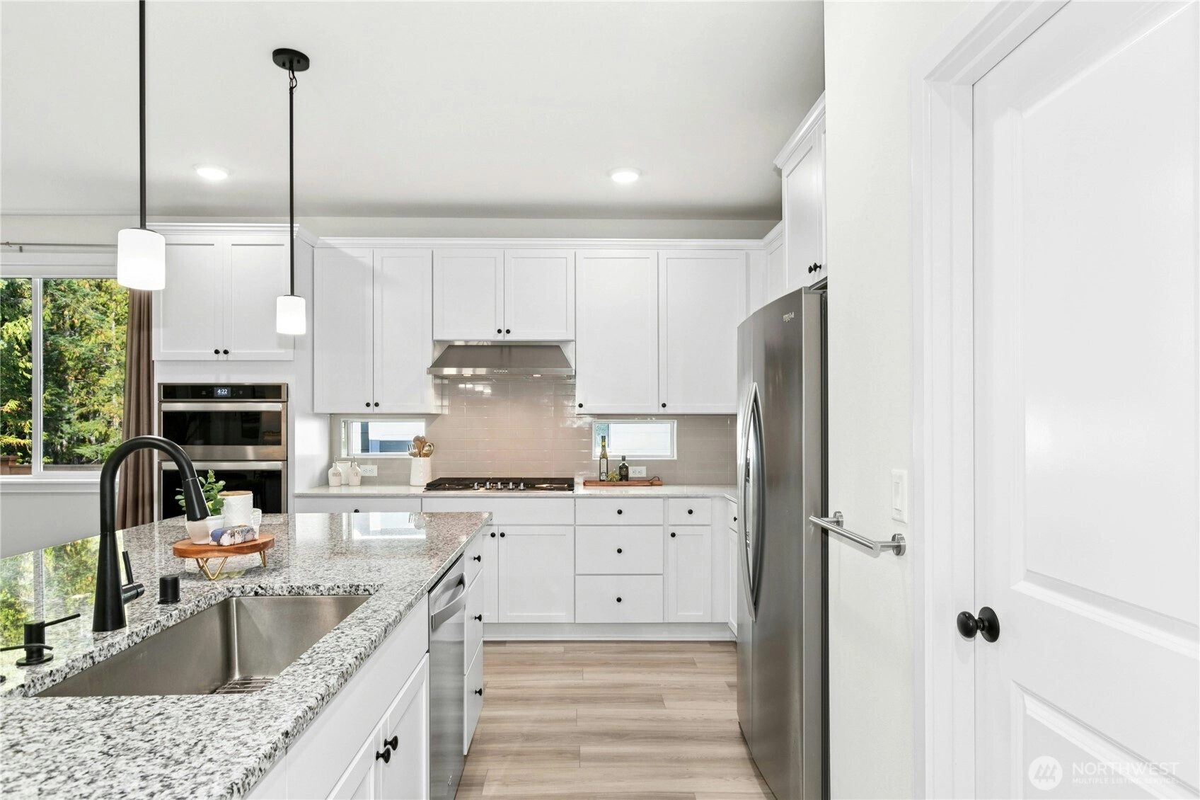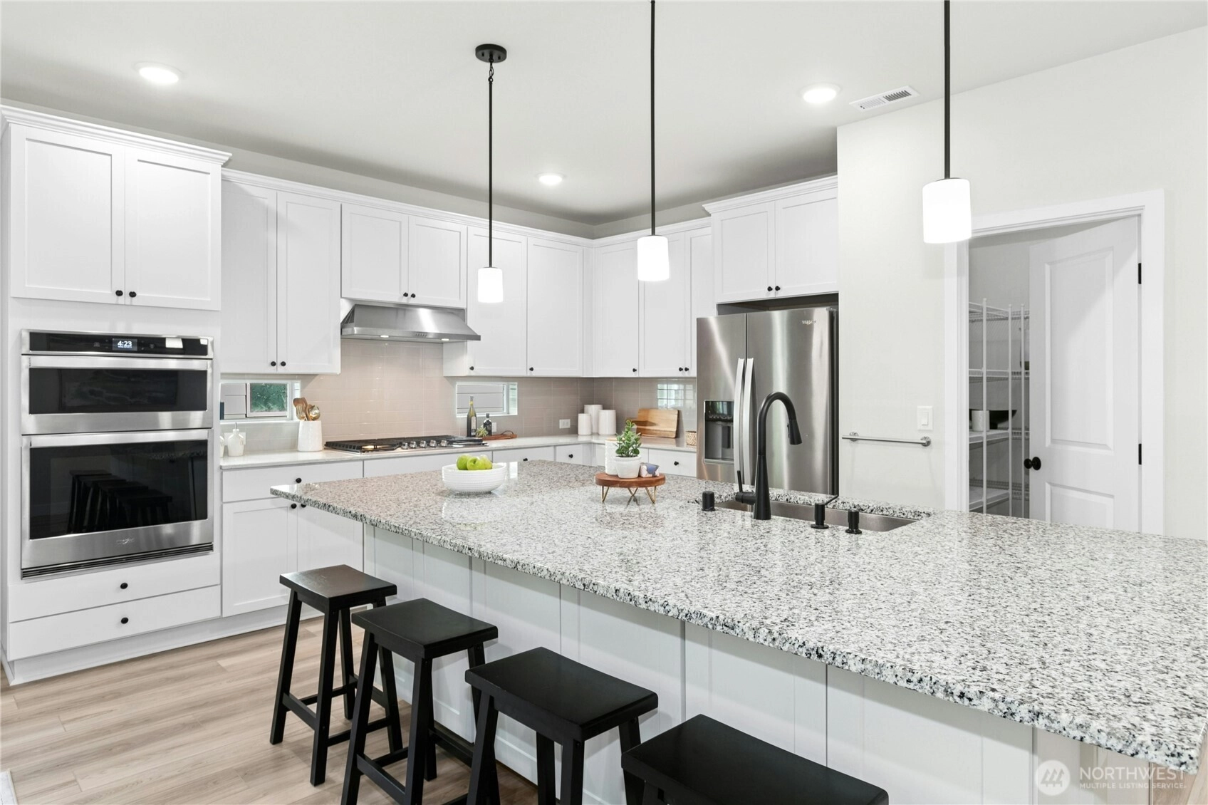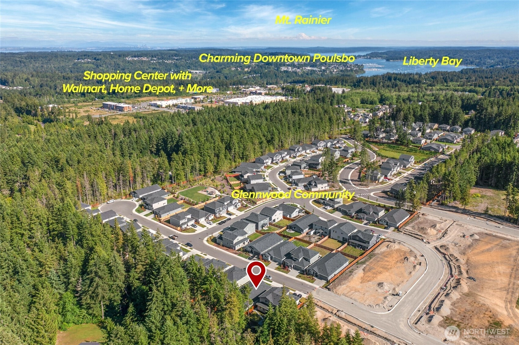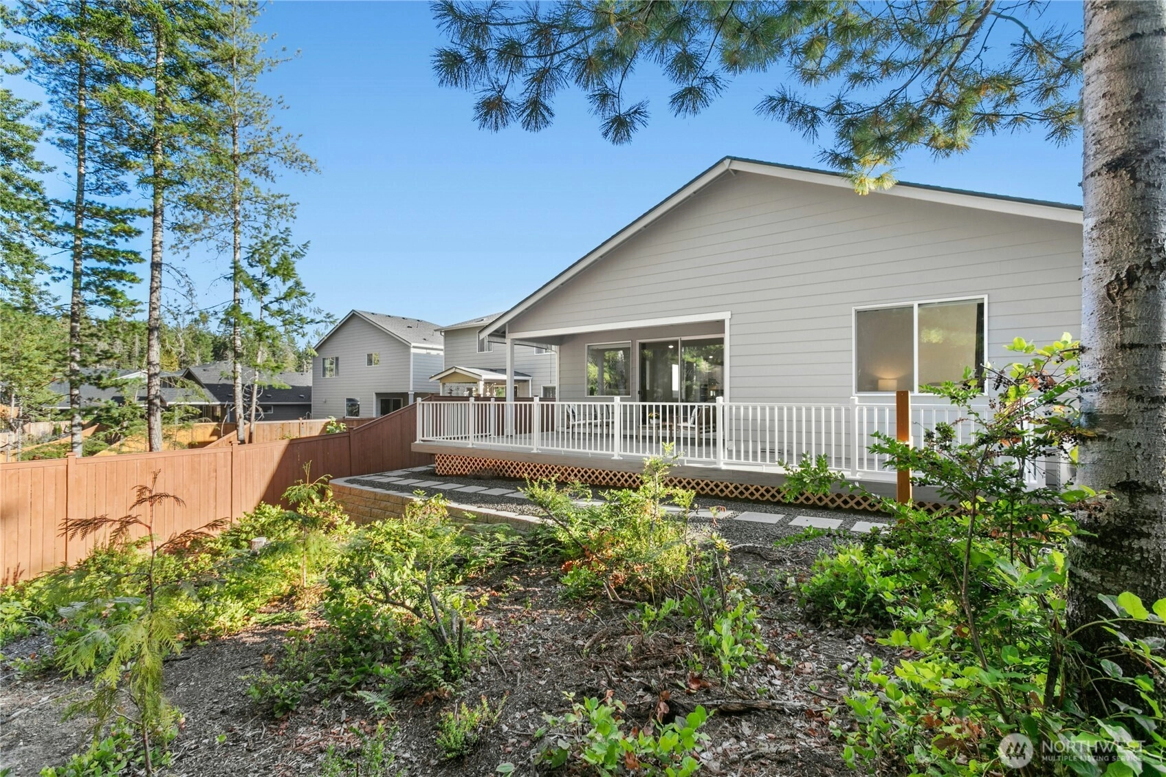 Enjoy impeccable single level living in this “better than new” 2023 home! Sited on a fenced greenbelt lot, this 2237SF 3BR/2BA “Smart” home boasts lofty 9’ ceilings & an open great room concept. Gourmet kitchen offers white maple soft close/dovetail cabinets, subway tile, gas cooktop w/hood, built-in wall oven/micro combo & walk-in pantry. Huge primary suite has tiled shower w/bench & frameless glass shower door, dual sink vanity & walk-in closet. Builder upgrades: wrapped windows, matte black fixtures, quartz countertops, plumbed for gas BBQ + 19' covered patio. Owner upgrades: slab granite island w/ extra storage, custom solar blinds, extended back patio + landscaping. Near schools with easy commutes to Bangor, Keyport, PSNS, & ferries!