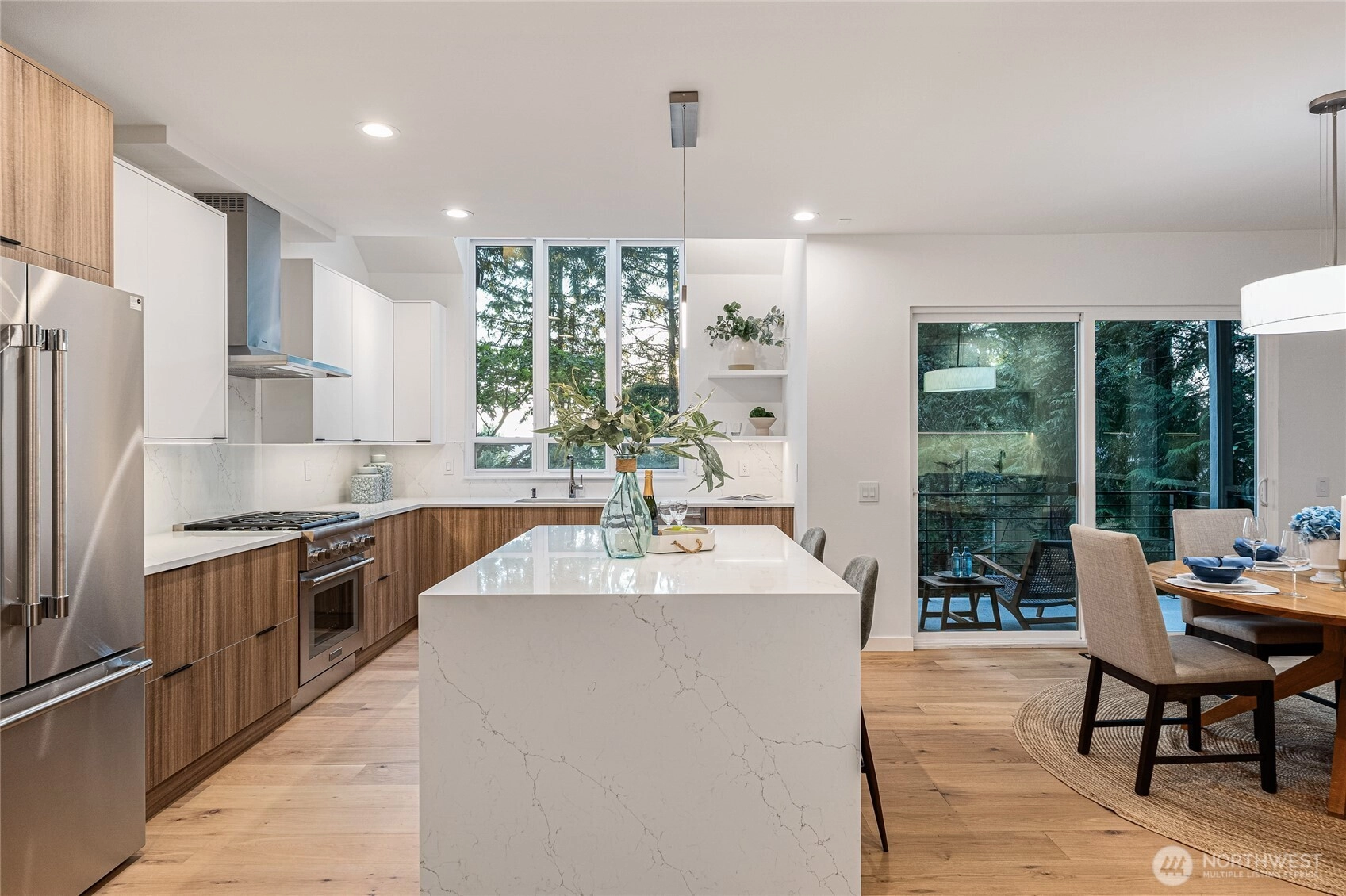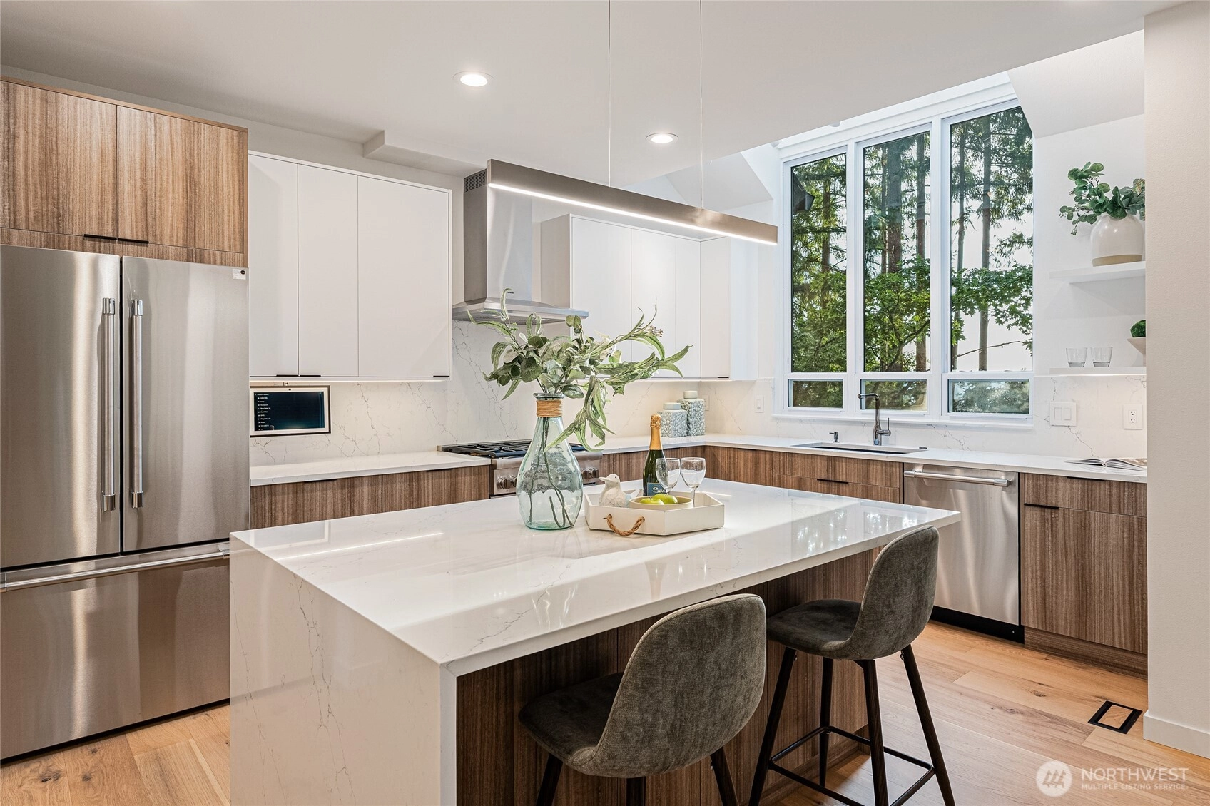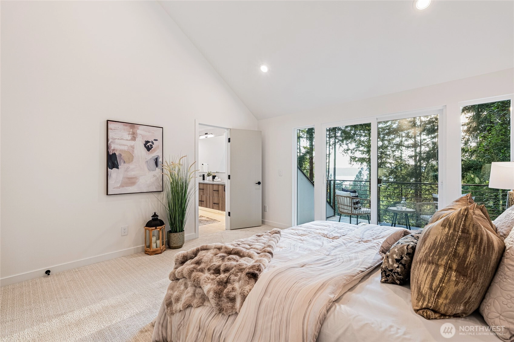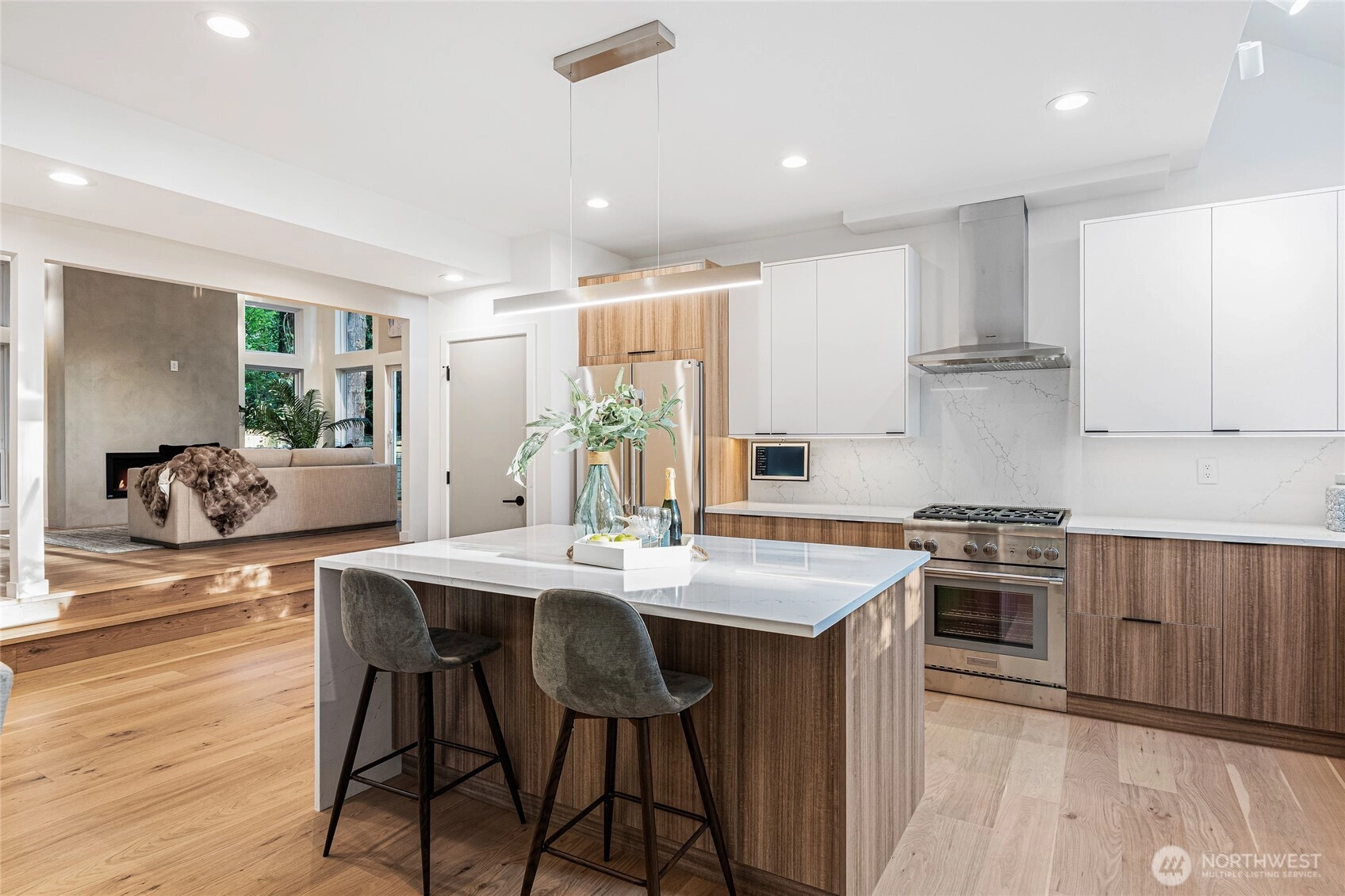 Enjoy breathtaking lake views from this modern home, fully remodeled by 2S Design. Featuring 12’ vaulted ceilings, oversized glass doors & flowing floorplan, this 3 bed, 3 bath retreat blends indoor-outdoor living with sleek, contemporary style. The chef’s kitchen boasts quartz counters, wine cooler, and premium Grohe & Silgranite fixtures. Hardwood floors, a statement fireplace, and custom flat-panel cabinetry add warmth & luxury throughout. Spa-inspired primary suite offers lake views, heated floors, and expansive walk-in closet. Smart home features include energy-efficient HVAC, EV charging, Thermador appliances, Low-E windows & full home automation. Surrounded by natural landscaping, this move-in-ready gem is modern living at its best.