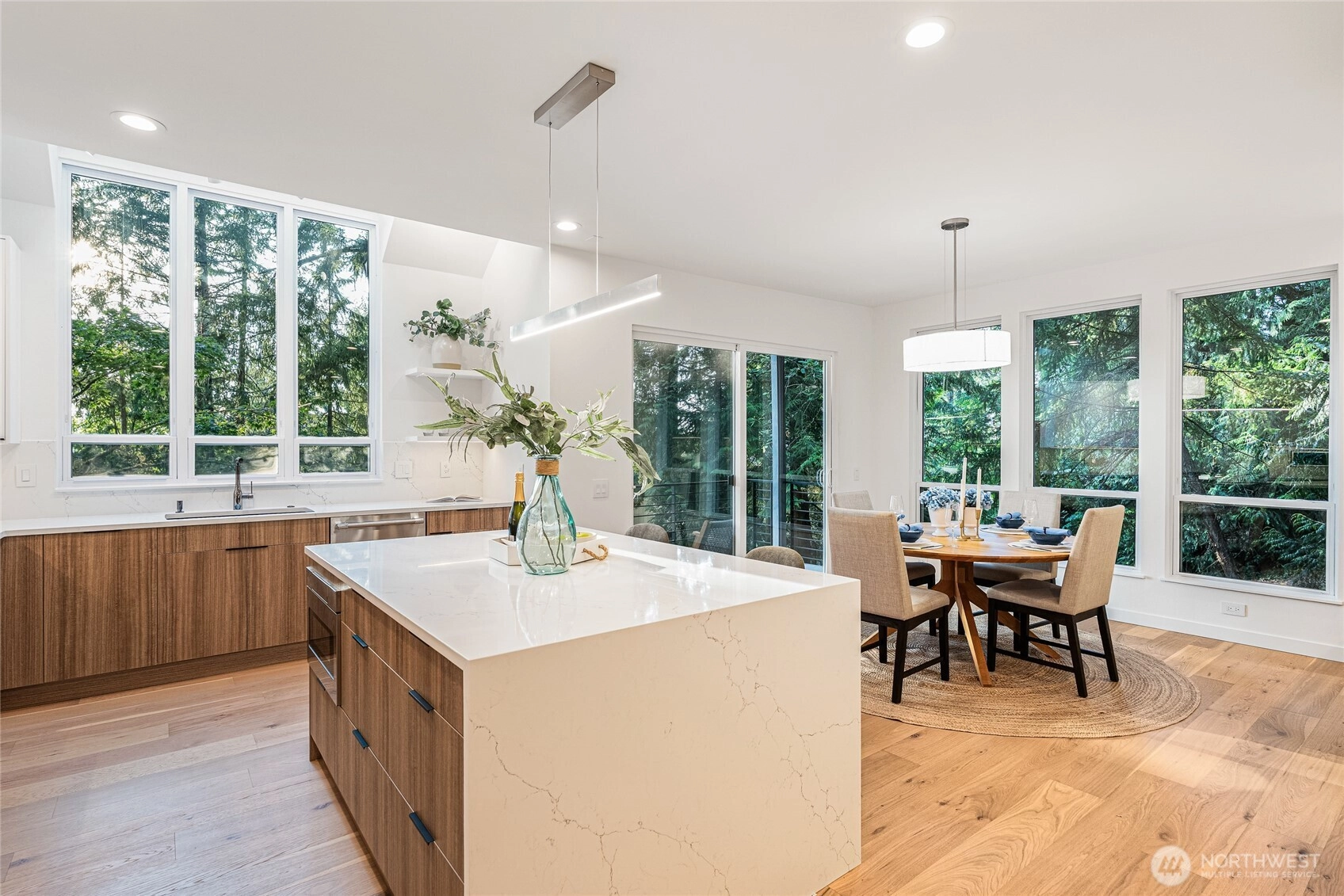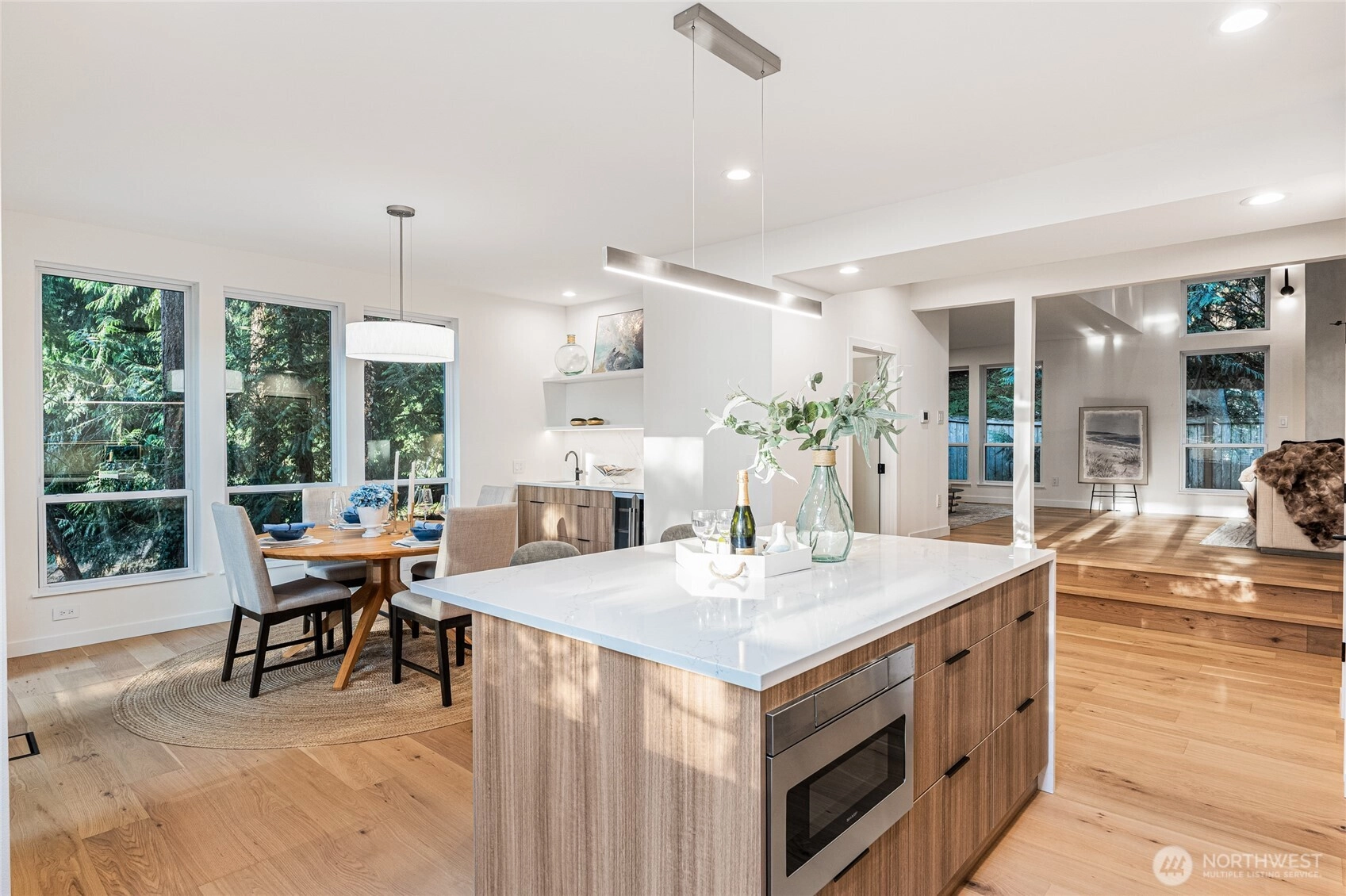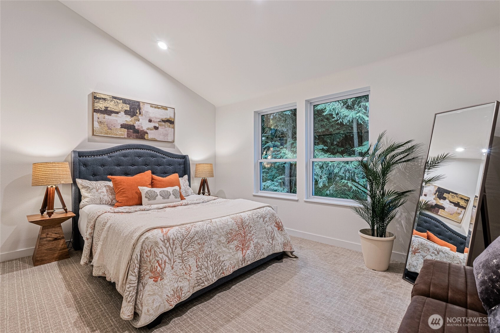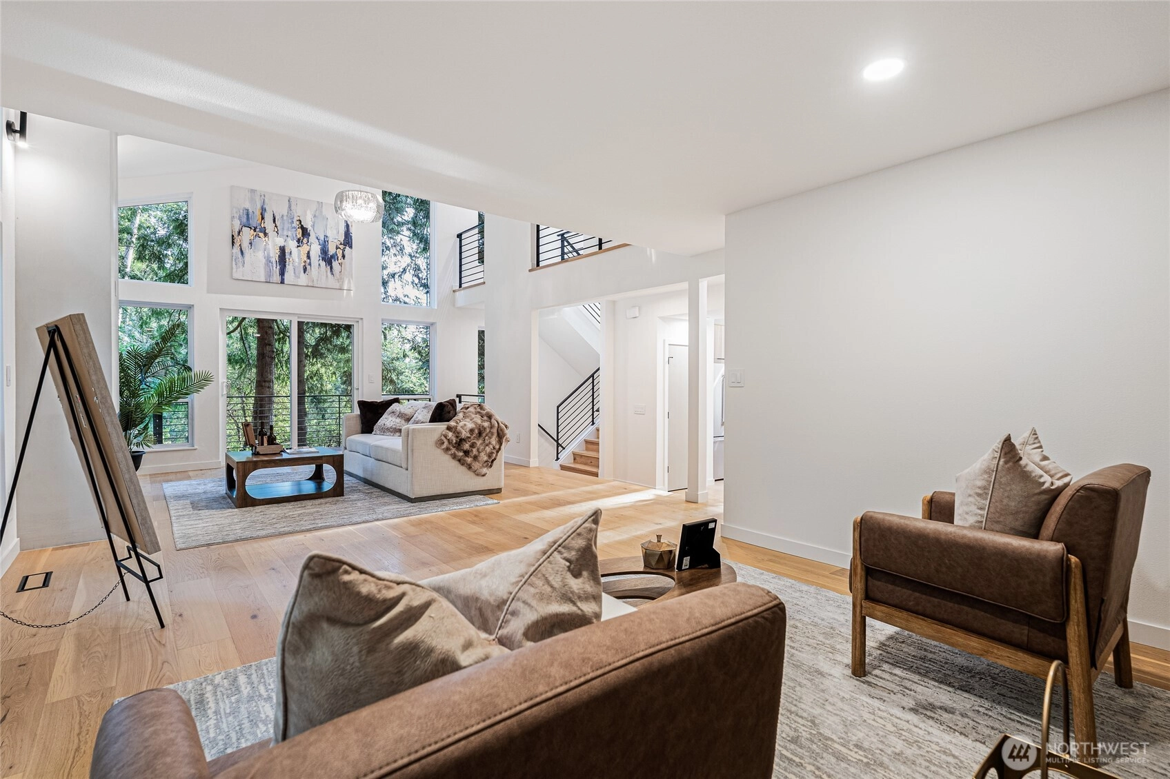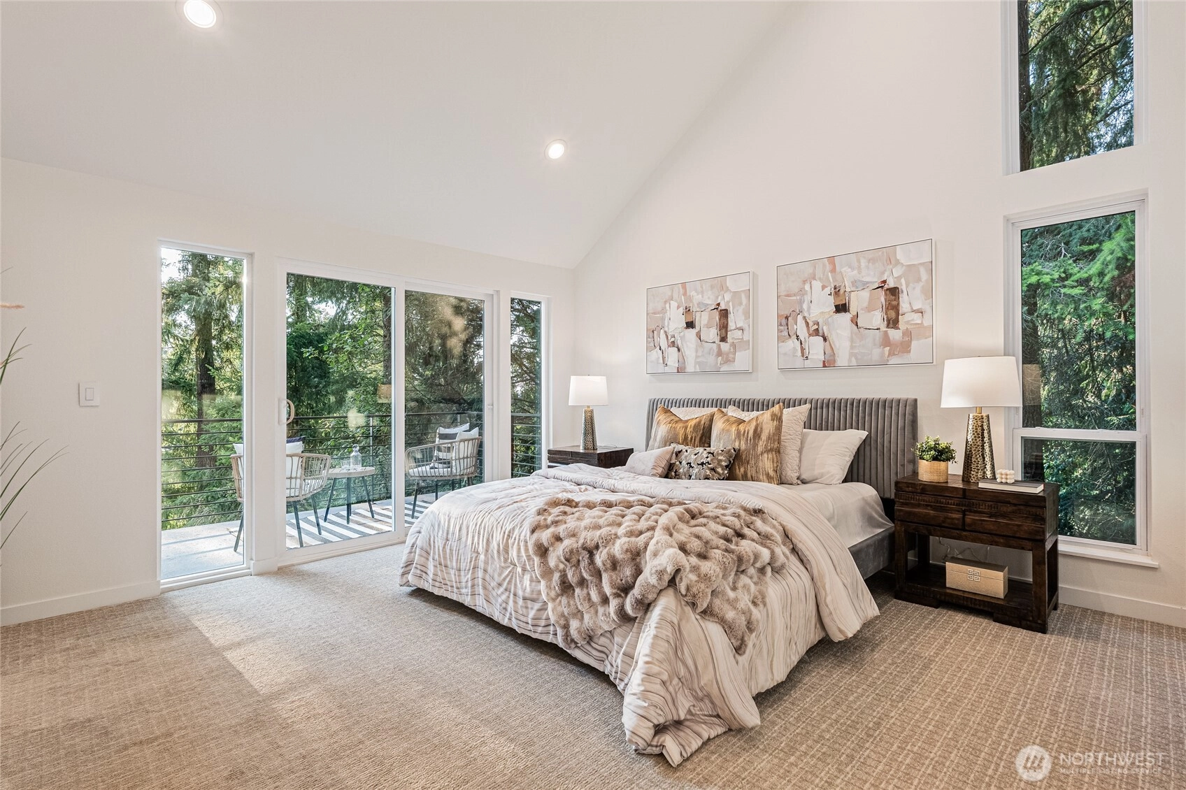 Enjoy breathtaking lake views from this modern home, fully remodeled by 2S Design. Featuring 12’ vaulted ceilings, oversized glass doors & flowing floorplan, this 3 bed, 3 bath retreat blends indoor-outdoor living with sleek, contemporary style. The chef’s kitchen boasts quartz counters, wine cooler, and premium Grohe & Silgranite fixtures. Hardwood floors, a statement fireplace, and custom flat-panel cabinetry add warmth & luxury throughout. Spa-inspired primary suite offers lake views, heated floors, and expansive walk-in closet. Smart home features include energy-efficient HVAC, EV charging, Thermador appliances, Low-E windows & full home automation. Surrounded by natural landscaping, this move-in-ready gem is modern living at its best.