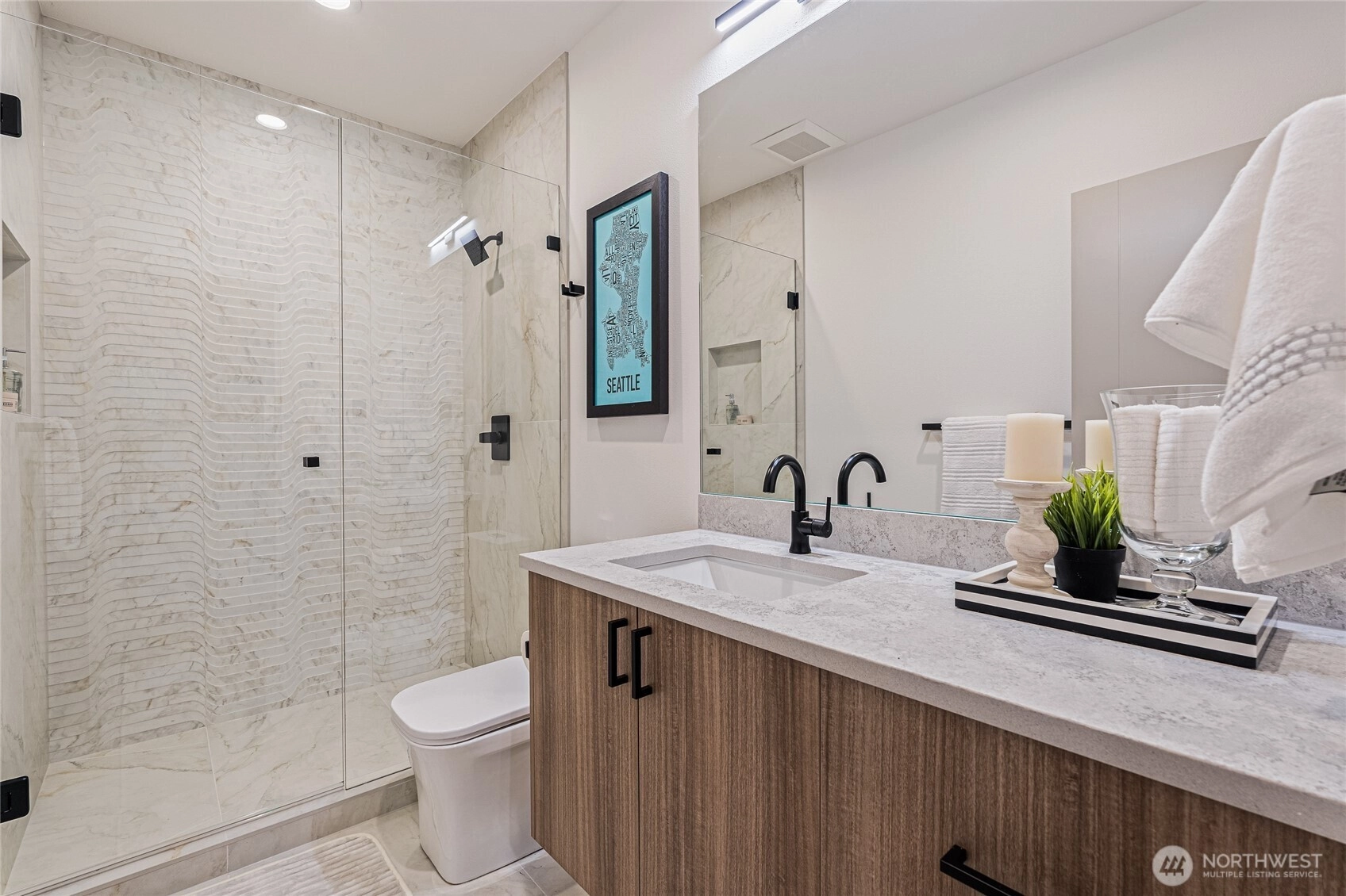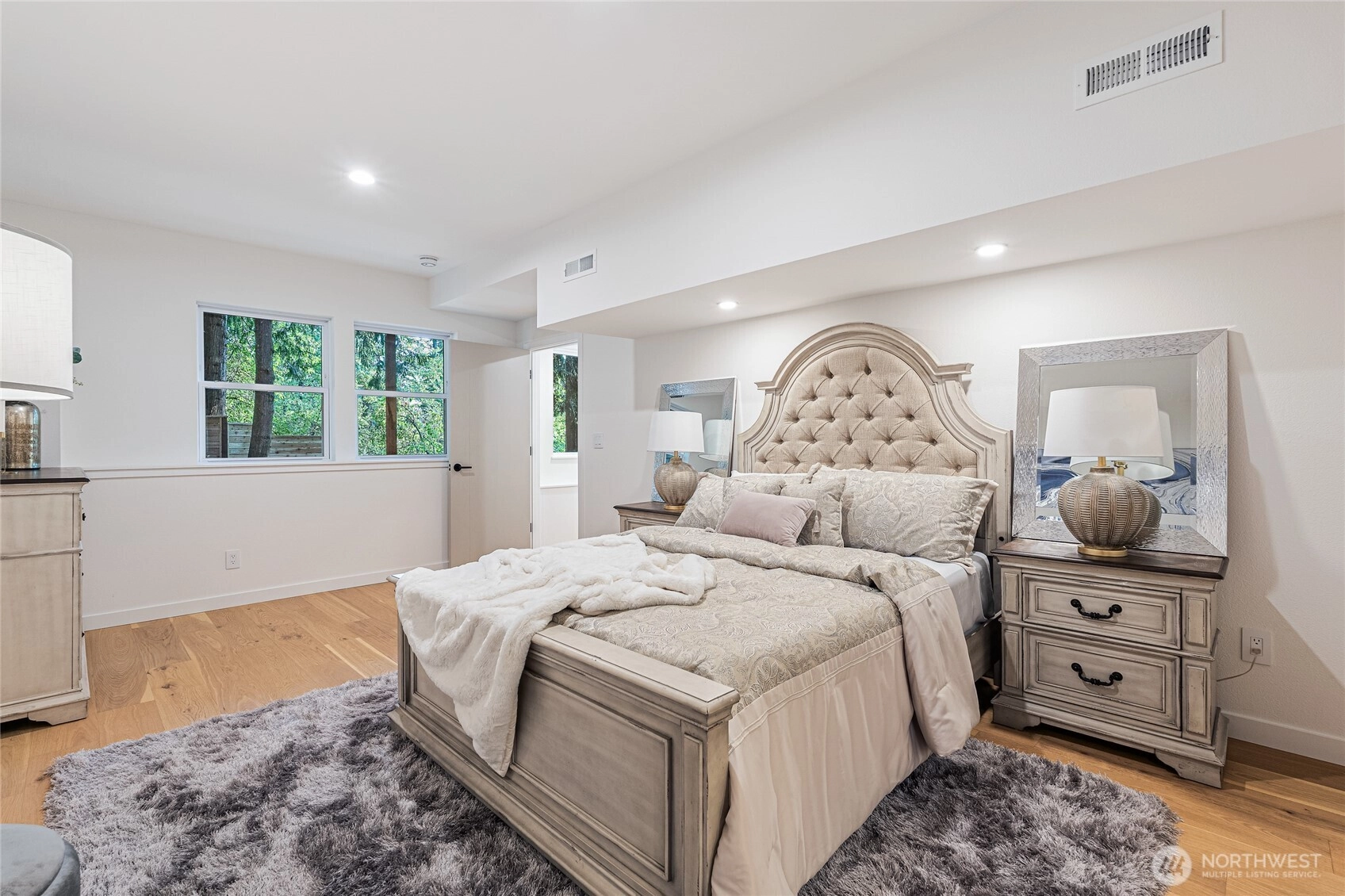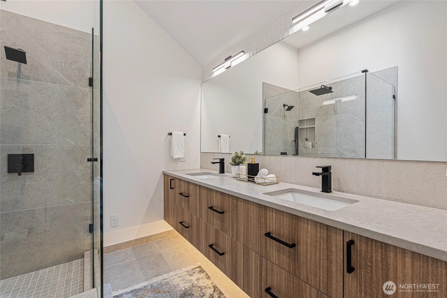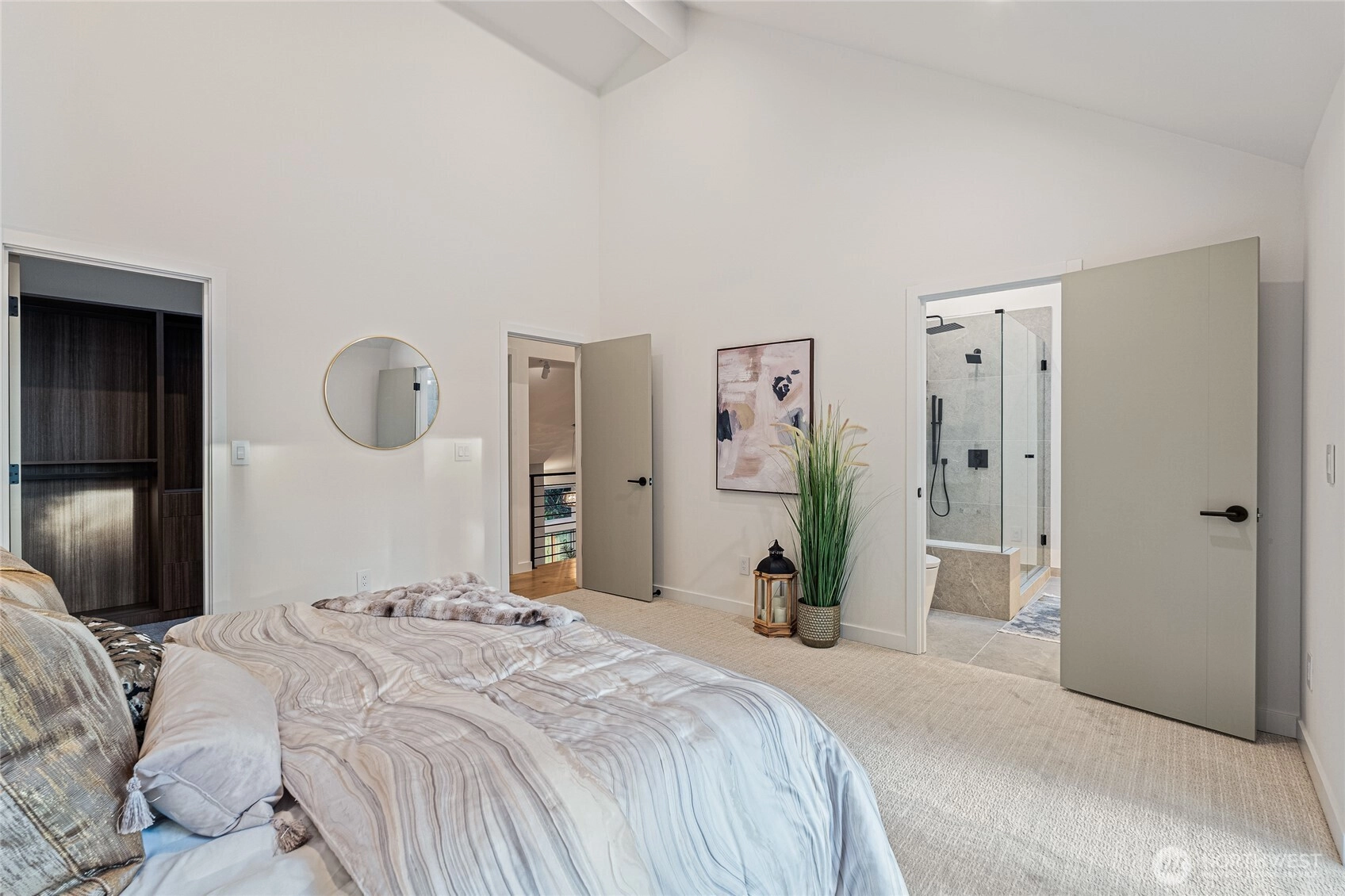 Enjoy breathtaking lake views from this modern home, fully remodeled by 2S Design. Featuring 12’ vaulted ceilings, oversized glass doors & flowing floorplan, this 3 bed, 3 bath retreat blends indoor-outdoor living with sleek, contemporary style. The chef’s kitchen boasts quartz counters, wine cooler, and premium Grohe & Silgranite fixtures. Hardwood floors, a statement fireplace, and custom flat-panel cabinetry add warmth & luxury throughout. Spa-inspired primary suite offers lake views, heated floors, and expansive walk-in closet. Smart home features include energy-efficient HVAC, EV charging, Thermador appliances, Low-E windows & full home automation. Surrounded by natural landscaping, this move-in-ready gem is modern living at its best.