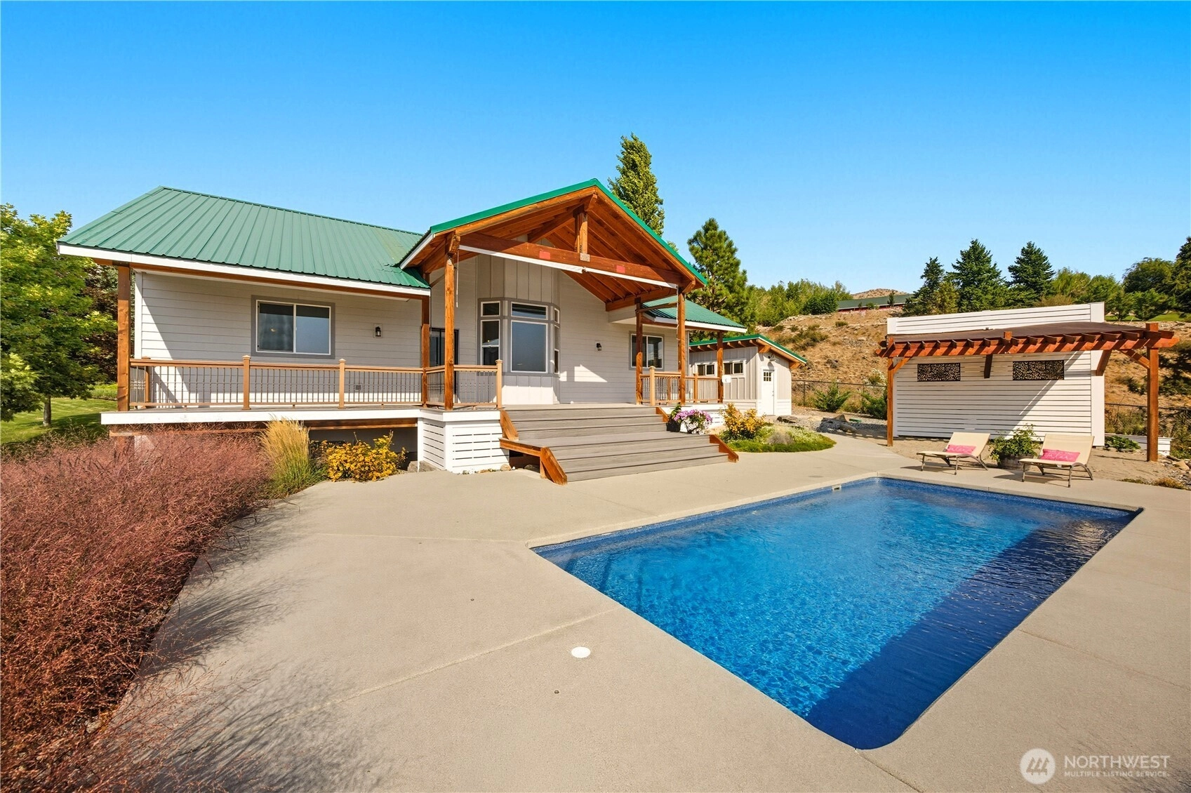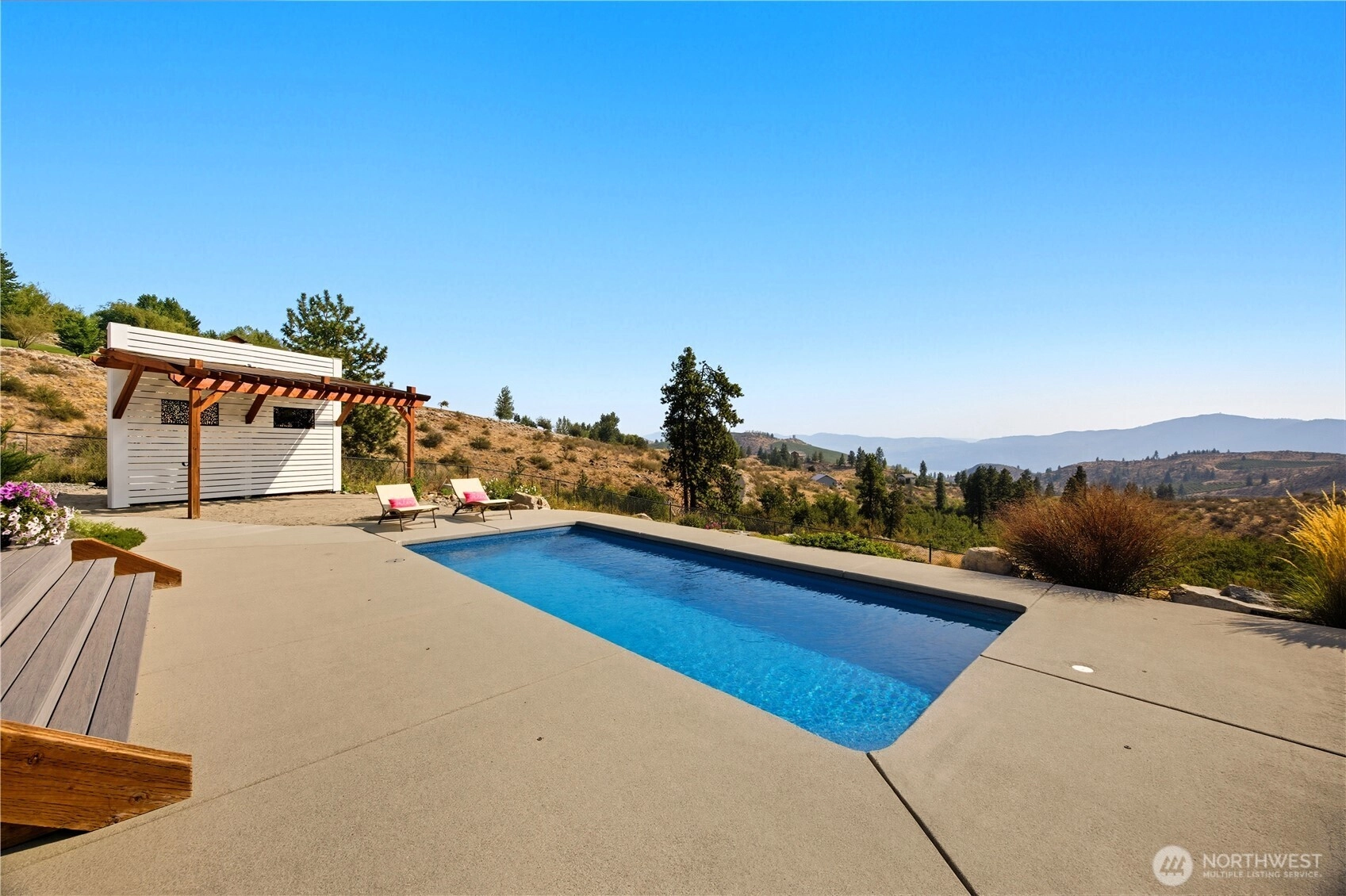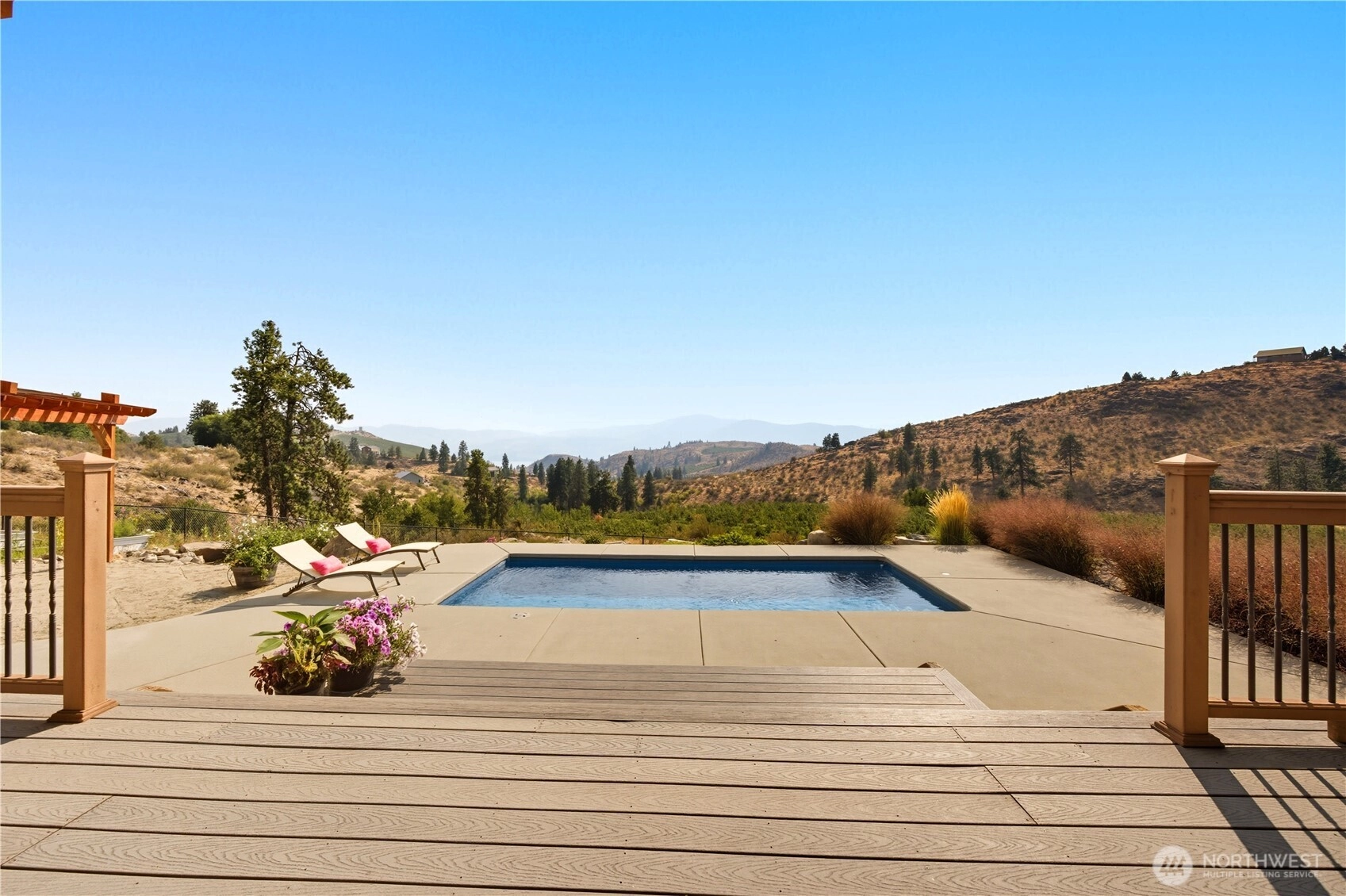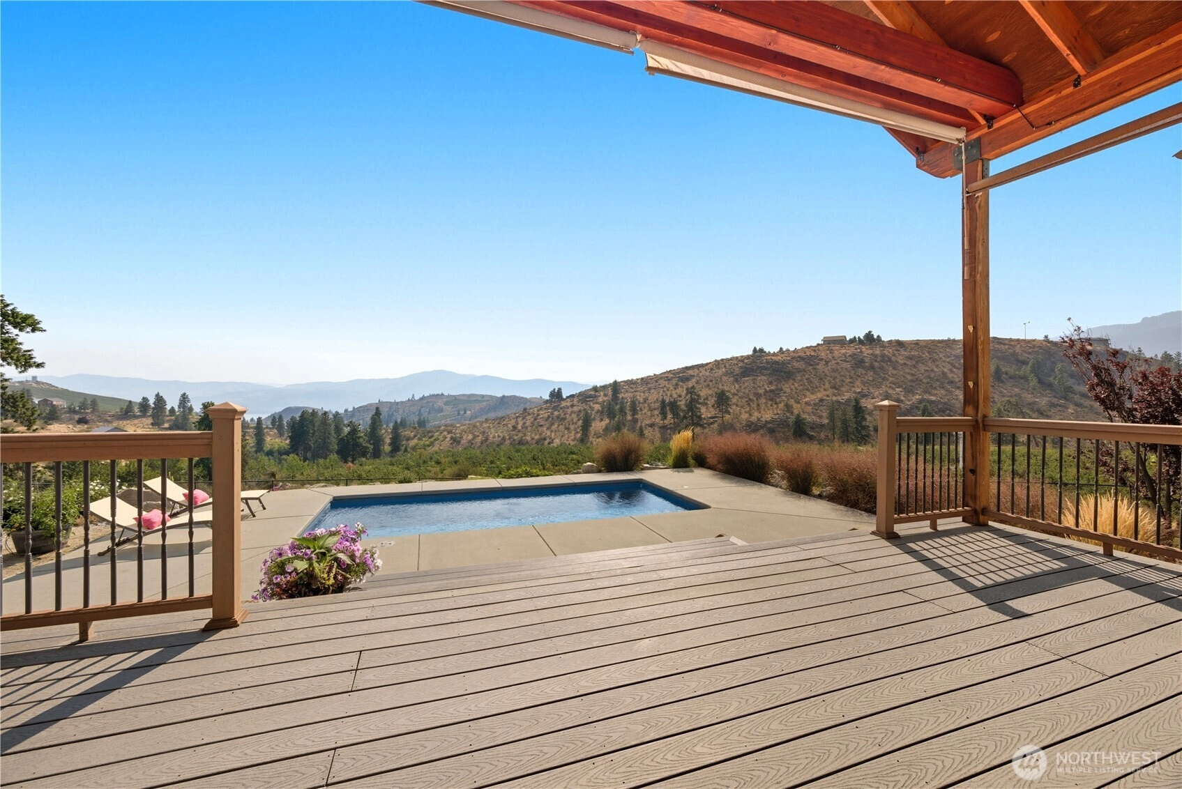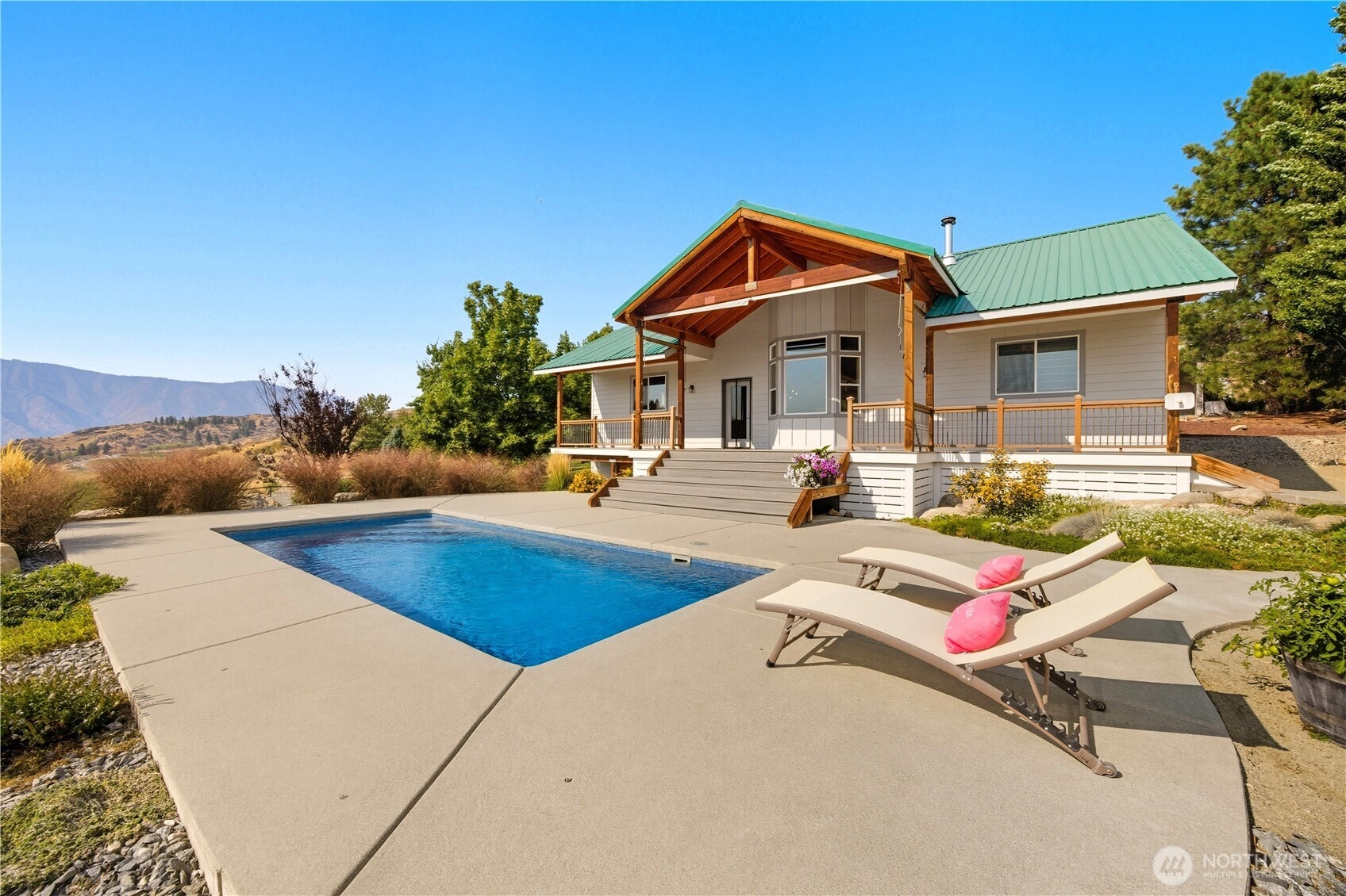 Enjoy serene hillside living with stunning views of Lake Chelan and the surrounding mountains! This thoughtfully designed home offers peace and privacy while being just minutes from town, the lake, wineries, and hiking. The open floor plan features vaulted ceilings with reclaimed beams, custom cabinetry, newer carpet, and a spacious primary en-suite. Entertain with ease on the covered deck or beneath the outdoor pergola. The fully fenced yard is complete with raised garden beds, wildflowers, and a cocktail pool. Bonus perks include a 3-car garage and ample crawlspace storage—perfect for full-time living or a relaxing getaway.