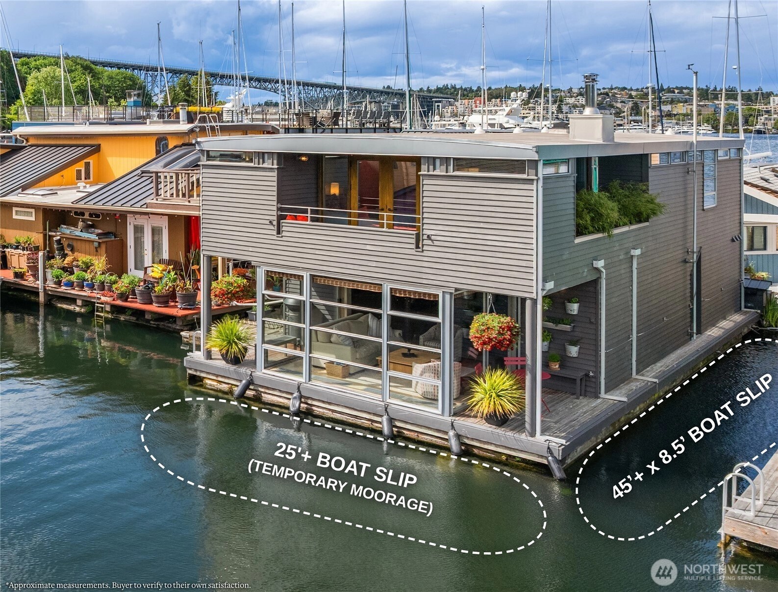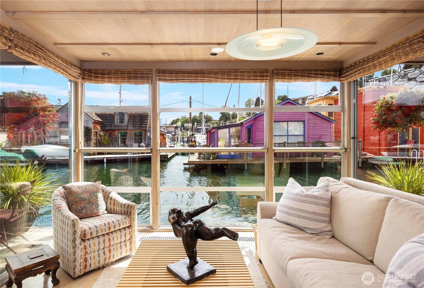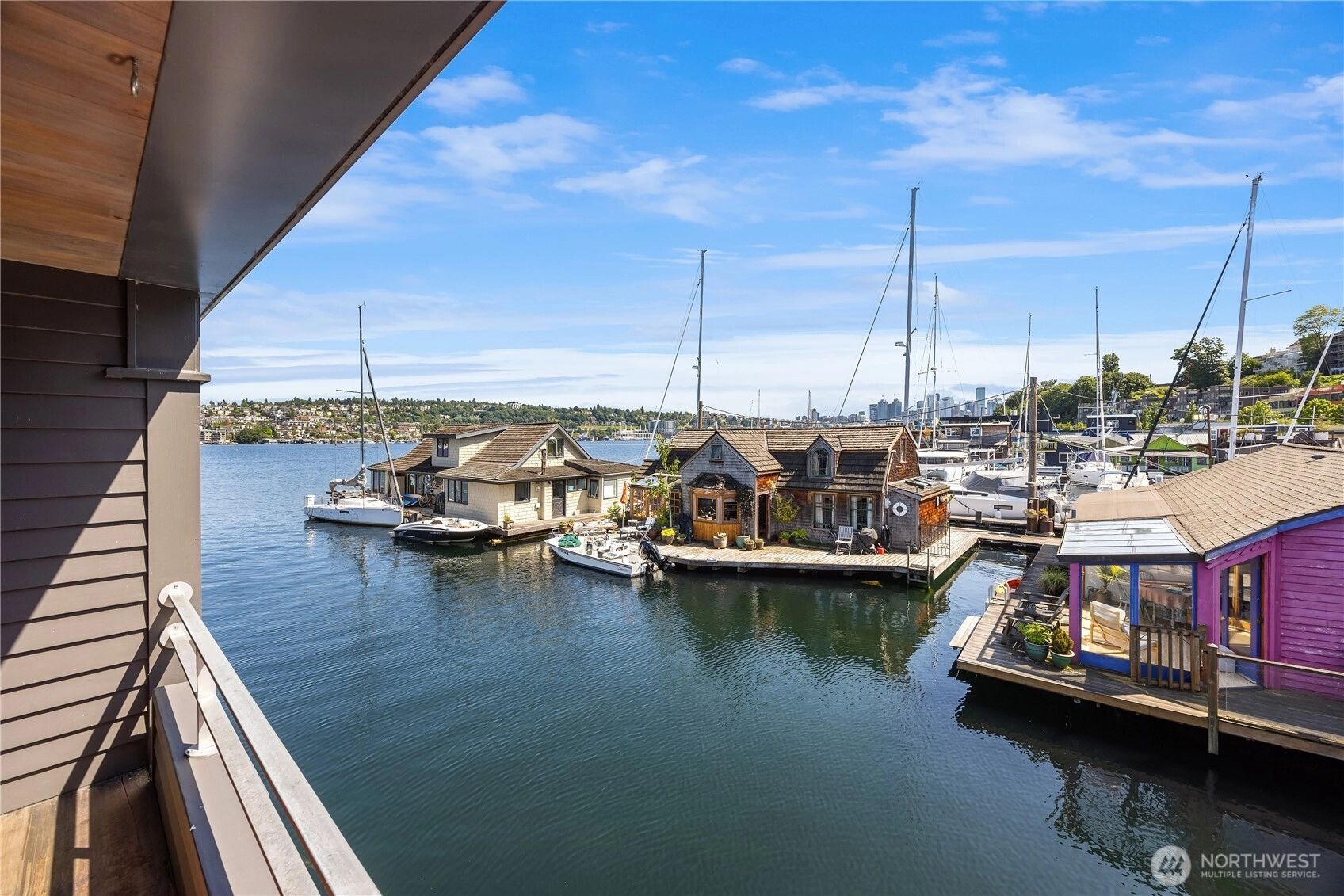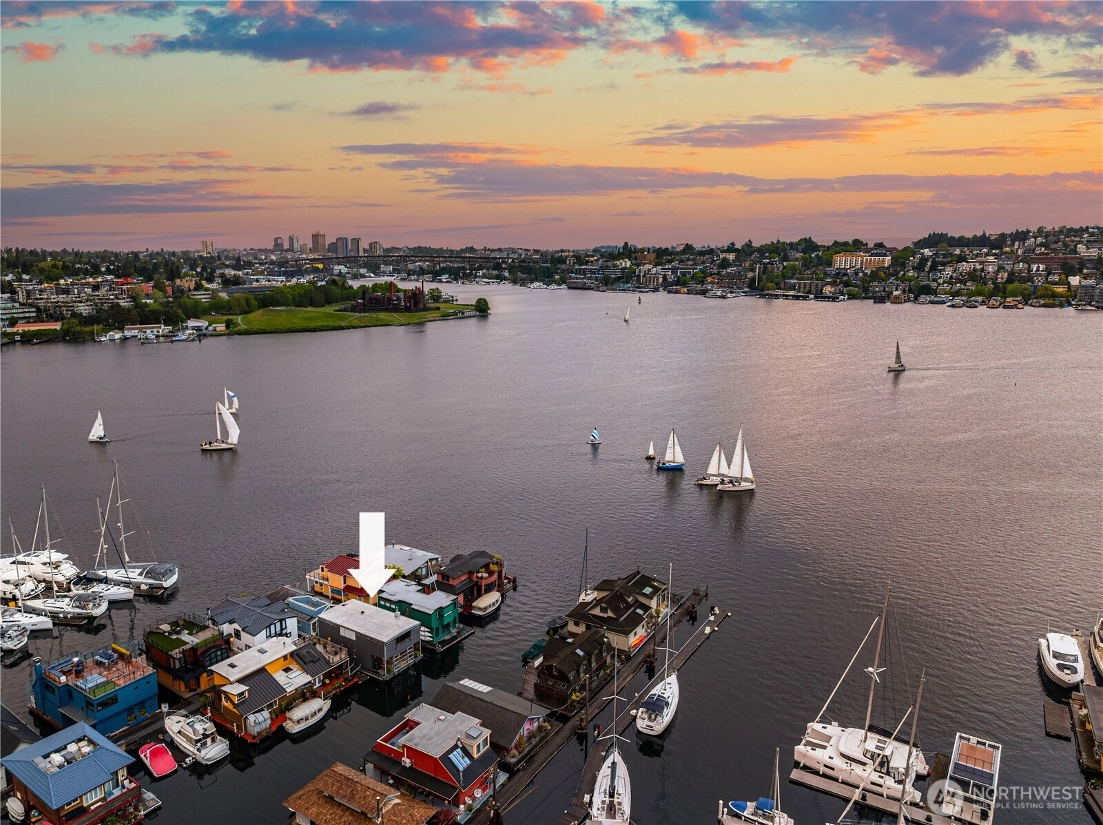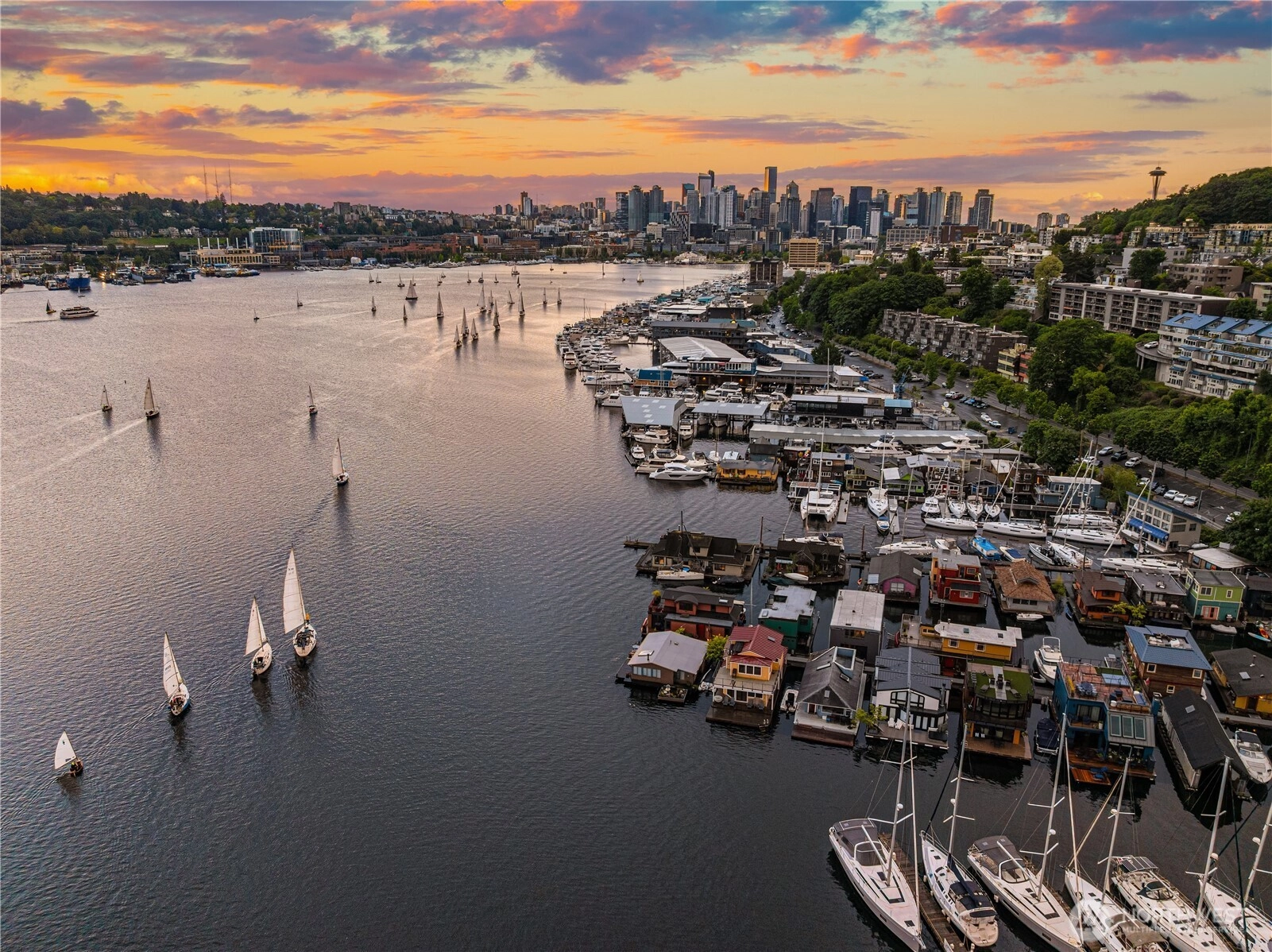 Designed by George Suyama, one of the PNW’s most revered architects & brought to life by the acclaimed firm Krekow Jennings, this is one of Seattle’s most distinctive floating homes—a rare harmony of design & craftsmanship. Its sun-filled, south-facing slip near the end of Westlake’s premier dock offers views of Downtown & Gas Works Park. Gracefully extended into the channel, the glass-wrapped sunroom creates a unique view corridor into Lake Union, blurring the boundaries between indoors & out. A flat roof with ladder access offers 360* views & exciting potential for a full rooftop deck. Quintessential Seattle living awaits—just a short stroll from both Downtown & Fremont. Gated entry, ~45’ x 8.5’ boat moorage & city parking for residents.