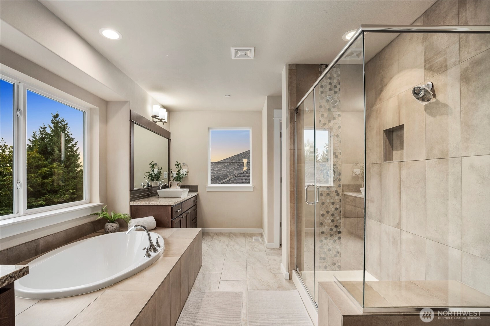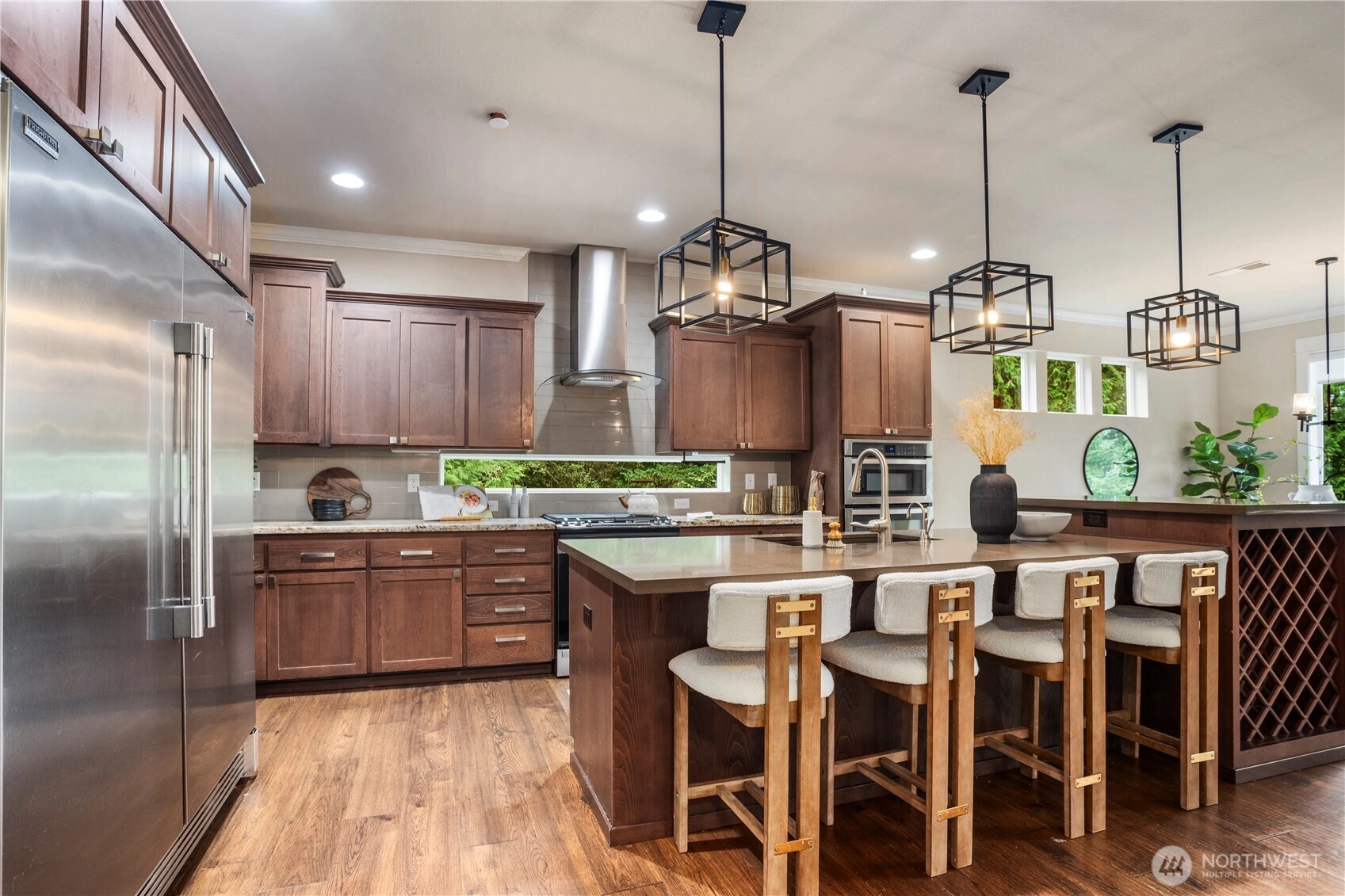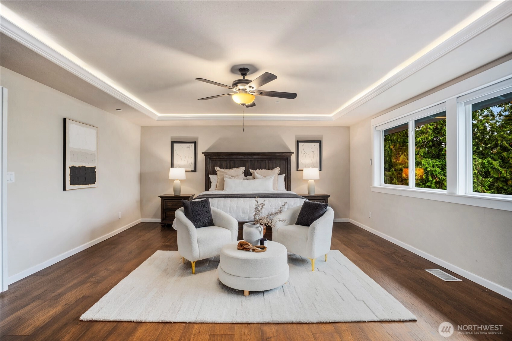 Tucked on a quiet dead-end street, this Tehaleh corner-lot home backing to a greenbelt has it all! With 6 bedrooms, 4 bathrooms, and 4,427 sq ft, soaring ceilings and hardwoods welcome you into an open-concept main floor featuring a chef’s kitchen with premium appliances, oversized island, and walk-in pantry. A light-filled great room and main floor bedroom with adjacent bath add comfort and flexibility. Upstairs, the primary suite includes a spa-inspired 5-piece bath and massive walk-in closet, plus three additional bedrooms. The daylight basement features a full kitchenette, theater-ready rec room, office, and additional bedroom. Complete with A/C, a 3-car garage, and Sumner-Bonney Lake schools!
