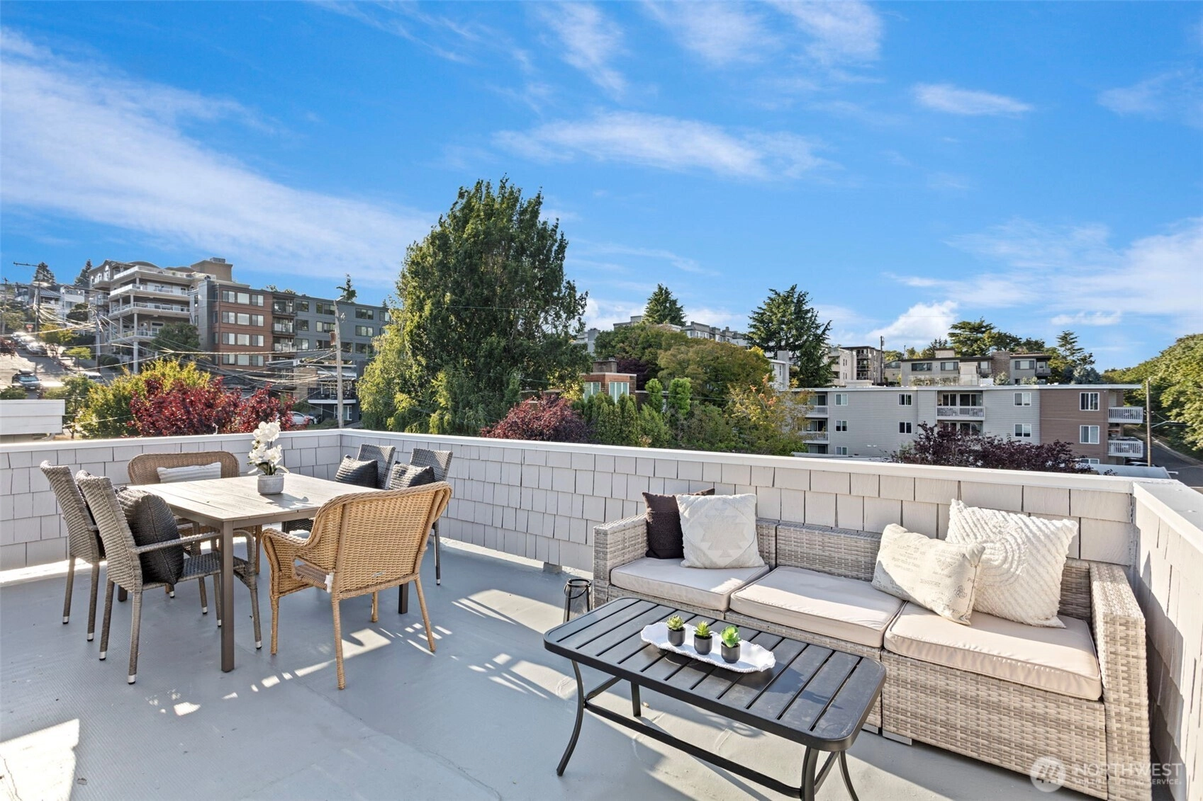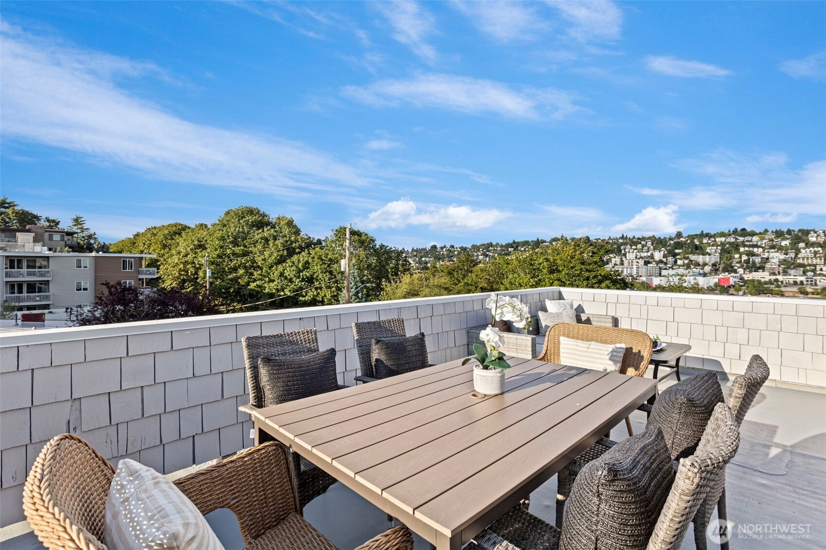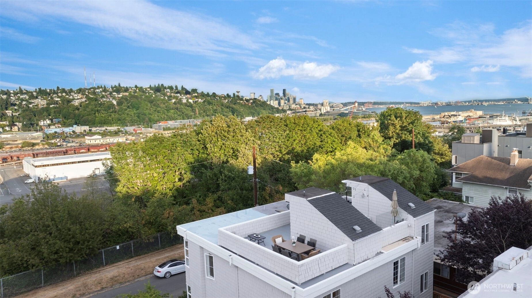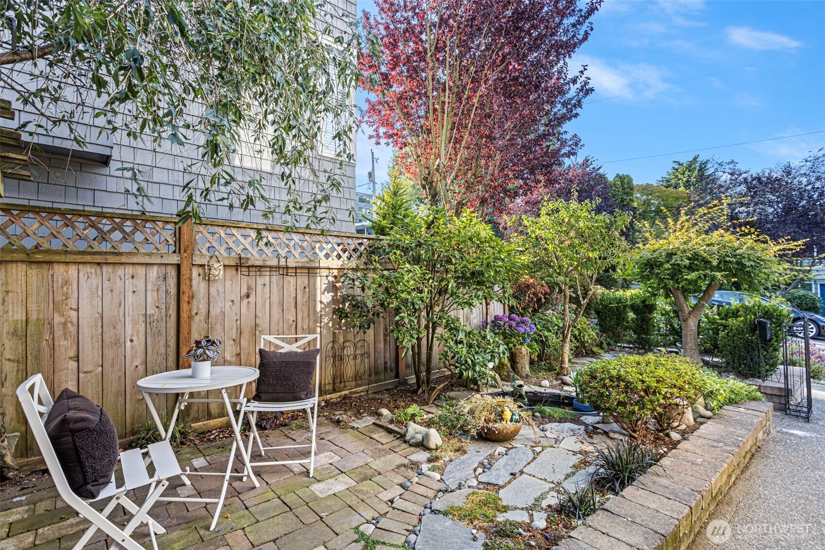 This beautiful Magnolia townhome has what many do not - two living areas and two outdoor spaces, offering nice flexibility. Garden patio creates welcoming entry, while wet bar at top of stairs adjacent to the rooftop deck makes entertaining easy. Just one wall connects to the neighbor and is situated on a quiet corner lot w/ green space and walk path across the street provide lush views. Inside, oak hardwoods adorn the main floor. Kitchen has granite counters with bar that seats two, ss appliances and a new dishwasher. Sweet Juliette balcony and gas fireplace add character. Primary bed has 5-piece en-suite bath. Fresh exterior paint. 1+ car garage. Easy access to Magnolia Village, Downtown Seattle, Parks & Ballard. No HOA or sewer capacity.