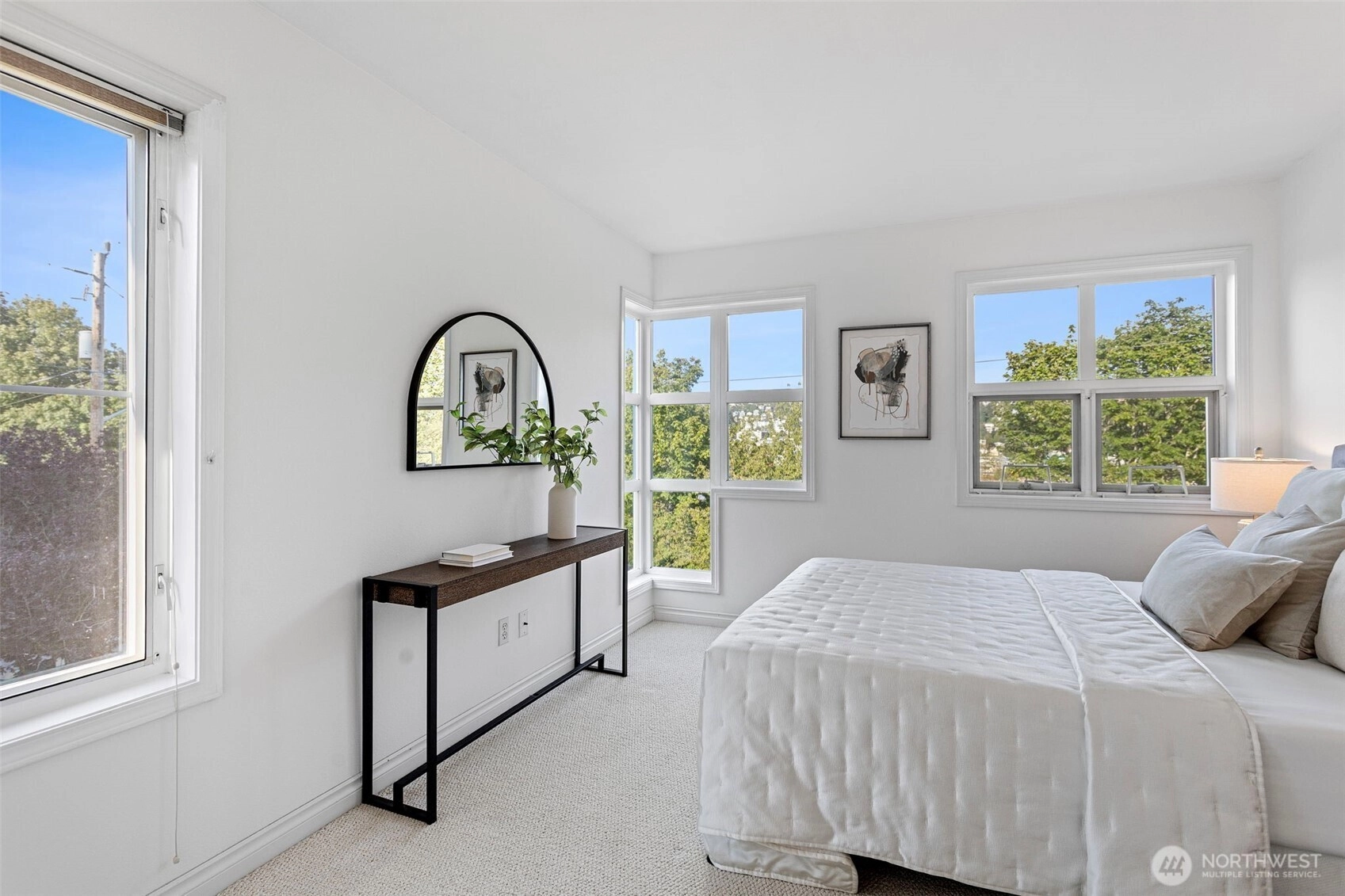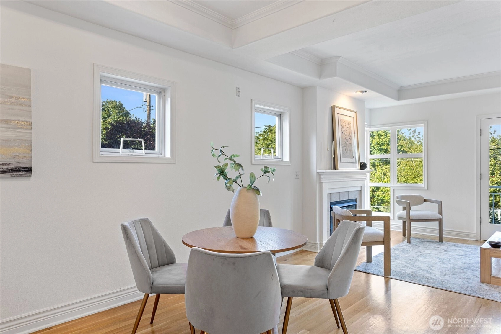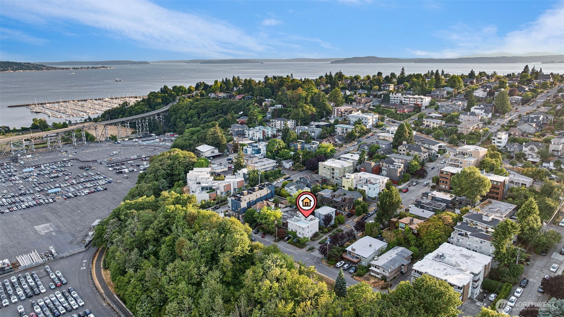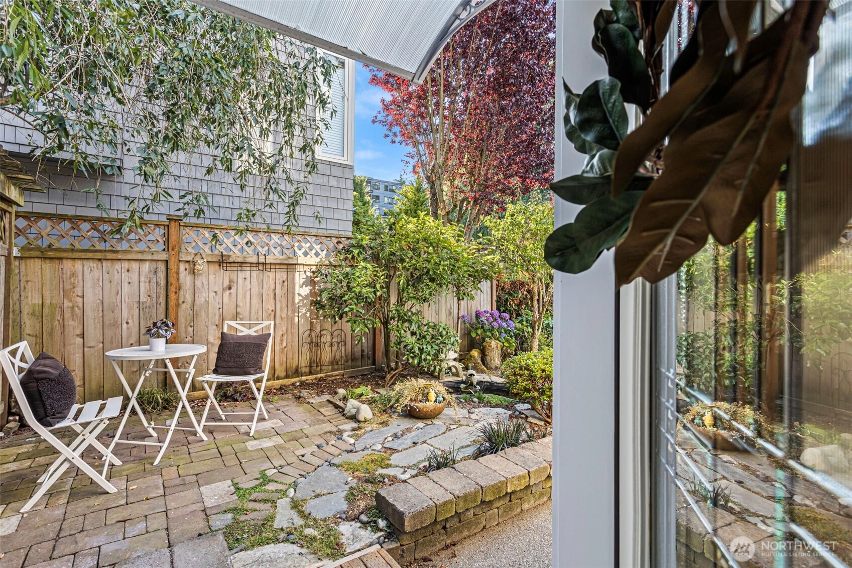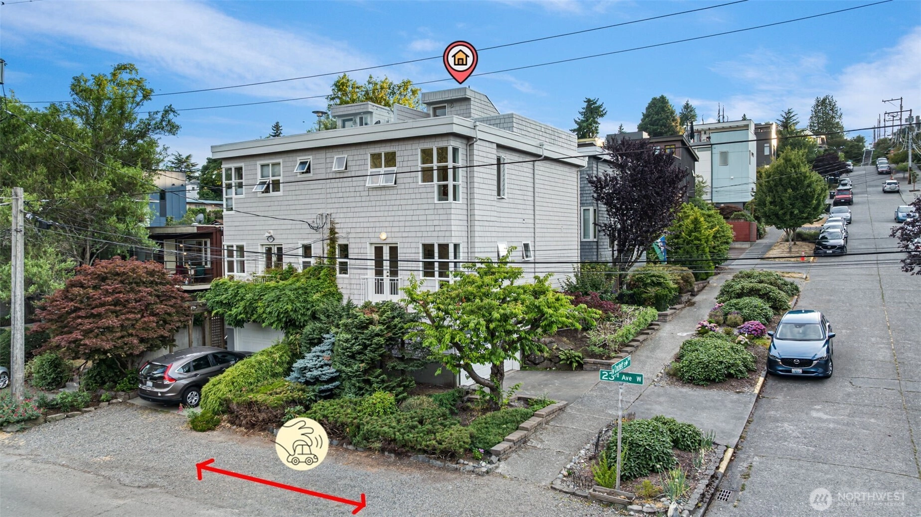 This beautiful Magnolia townhome has what many do not - two living areas and two outdoor spaces, offering nice flexibility. Garden patio creates welcoming entry, while wet bar at top of stairs adjacent to the rooftop deck makes entertaining easy. Just one wall connects to the neighbor and is situated on a quiet corner lot w/ green space and walk path across the street provide lush views. Inside, oak hardwoods adorn the main floor. Kitchen has granite counters with bar that seats two, ss appliances and a new dishwasher. Sweet Juliette balcony and gas fireplace add character. Primary bed has 5-piece en-suite bath. Fresh exterior paint. 1+ car garage. Easy access to Magnolia Village, Downtown Seattle, Parks & Ballard. No HOA or sewer capacity.