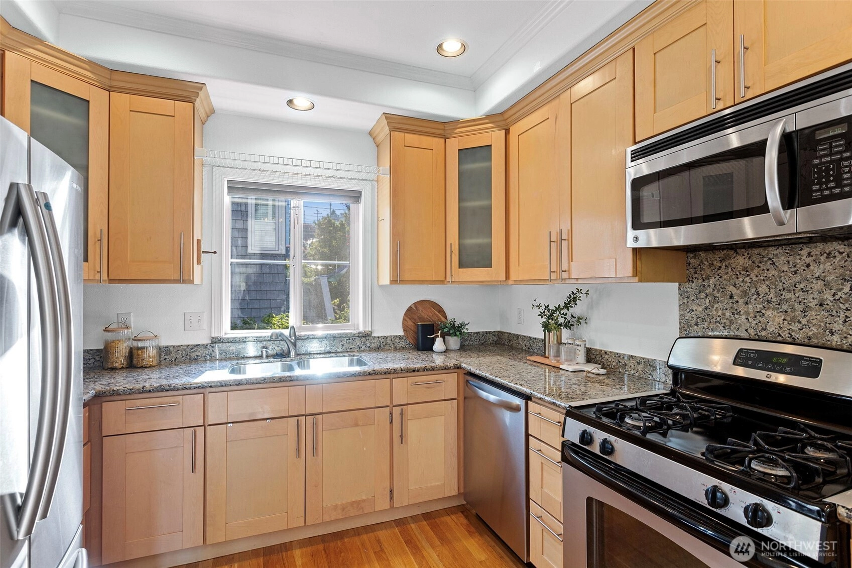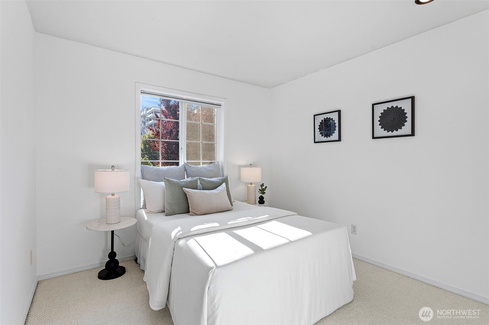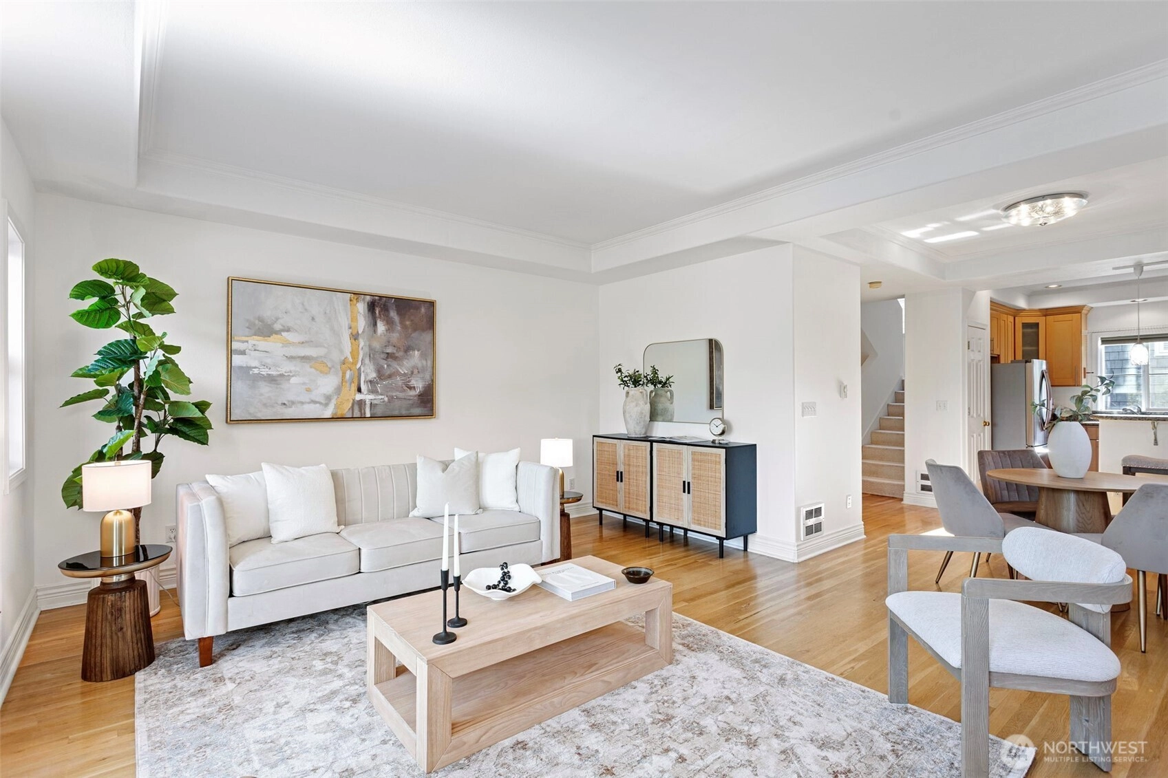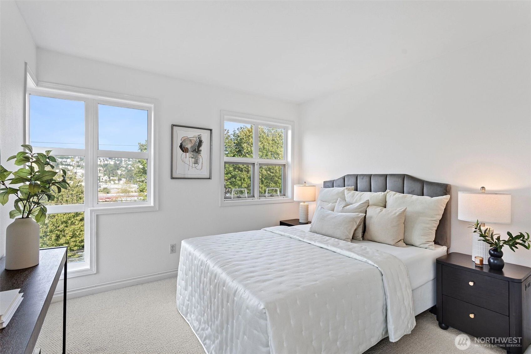 This beautiful Magnolia townhome has what many do not - two living areas and two outdoor spaces, offering nice flexibility. Garden patio creates welcoming entry, while wet bar at top of stairs adjacent to the rooftop deck makes entertaining easy. Just one wall connects to the neighbor and is situated on a quiet corner lot w/ green space and walk path across the street provide lush views. Inside, oak hardwoods adorn the main floor. Kitchen has granite counters with bar that seats two, ss appliances and a new dishwasher. Sweet Juliette balcony and gas fireplace add character. Primary bed has 5-piece en-suite bath. Fresh exterior paint. 1+ car garage. Easy access to Magnolia Village, Downtown Seattle, Parks & Ballard. No HOA or sewer capacity.