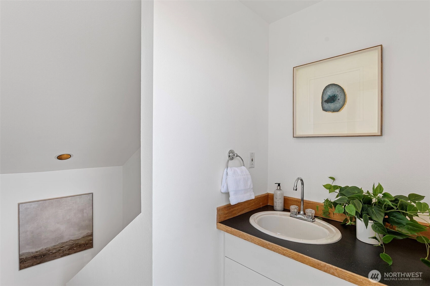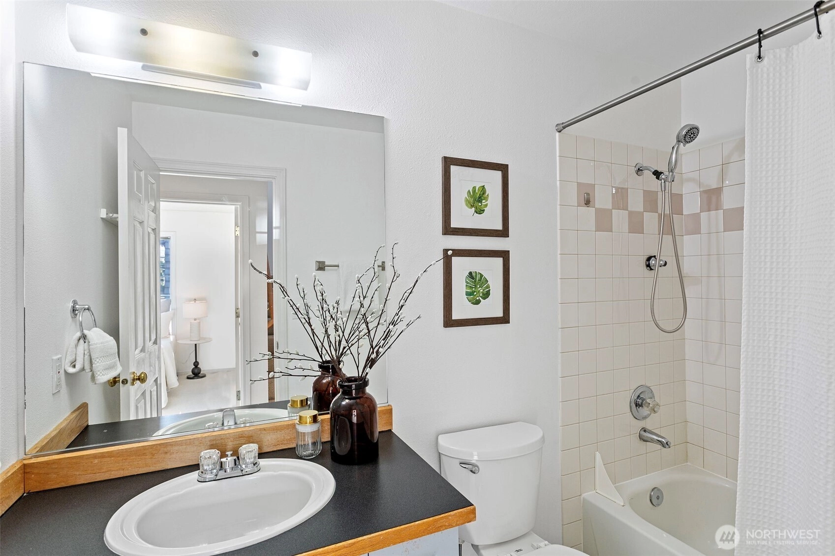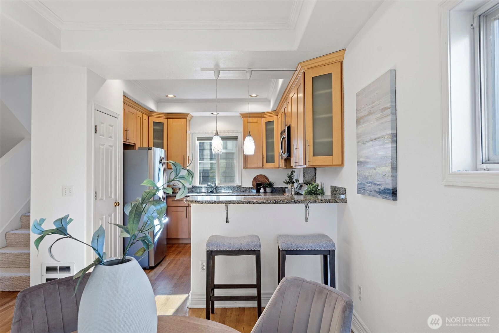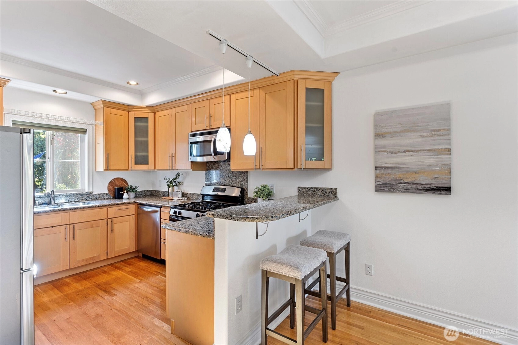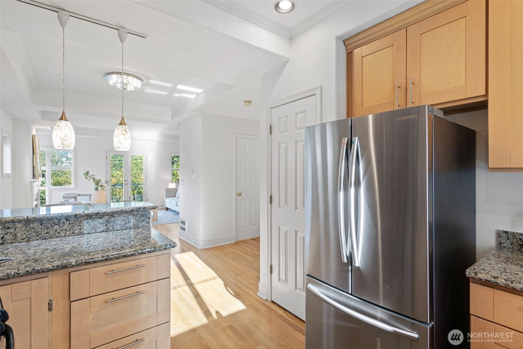 This beautiful Magnolia townhome has what many do not - two living areas and two outdoor spaces, offering nice flexibility. Garden patio creates welcoming entry, while wet bar at top of stairs adjacent to the rooftop deck makes entertaining easy. Just one wall connects to the neighbor and is situated on a quiet corner lot w/ green space and walk path across the street provide lush views. Inside, oak hardwoods adorn the main floor. Kitchen has granite counters with bar that seats two, ss appliances and a new dishwasher. Sweet Juliette balcony and gas fireplace add character. Primary bed has 5-piece en-suite bath. Fresh exterior paint. 1+ car garage. Easy access to Magnolia Village, Downtown Seattle, Parks & Ballard. No HOA or sewer capacity.
