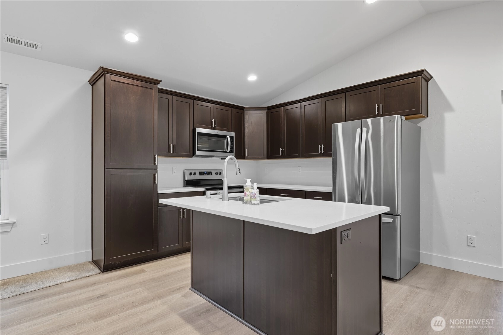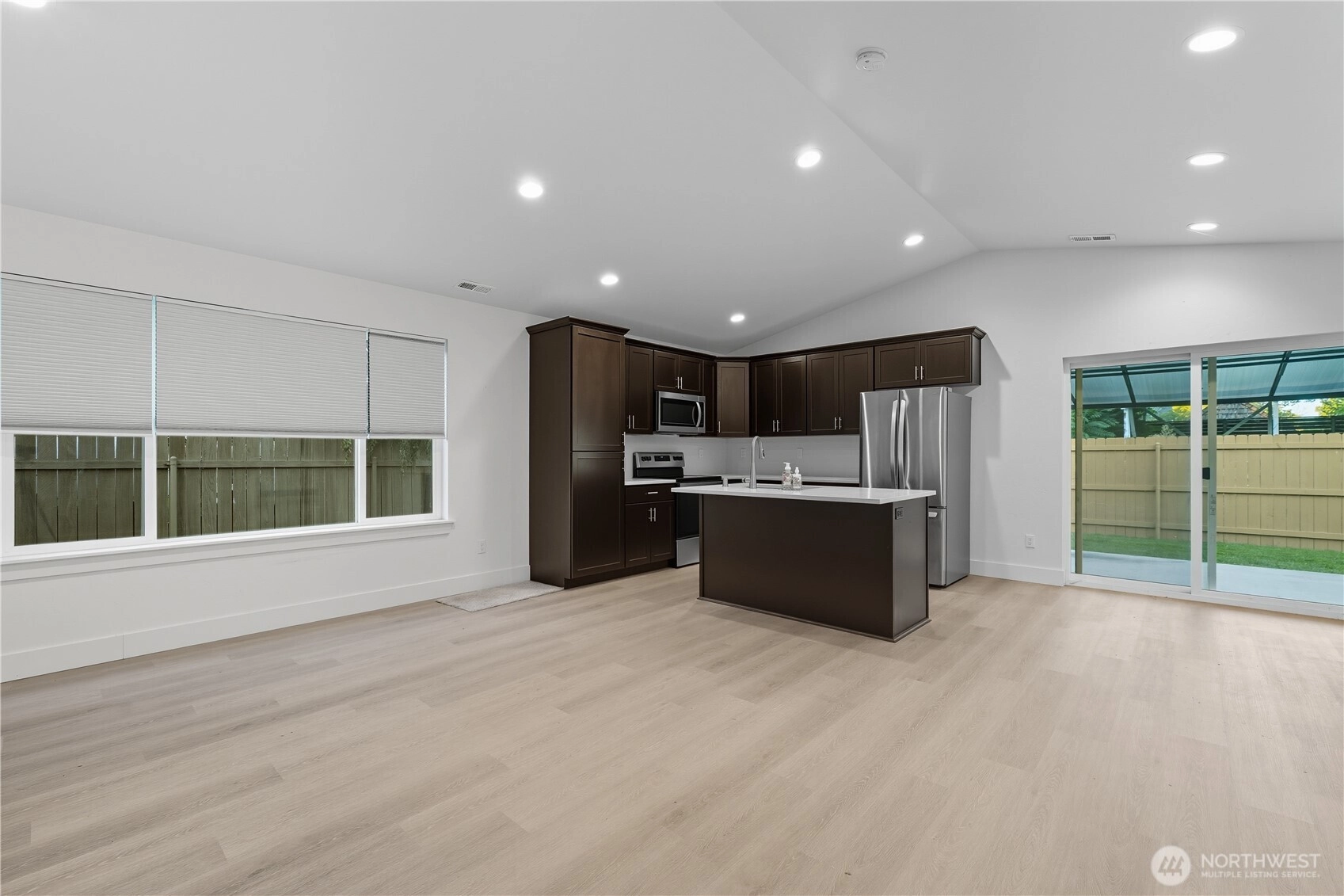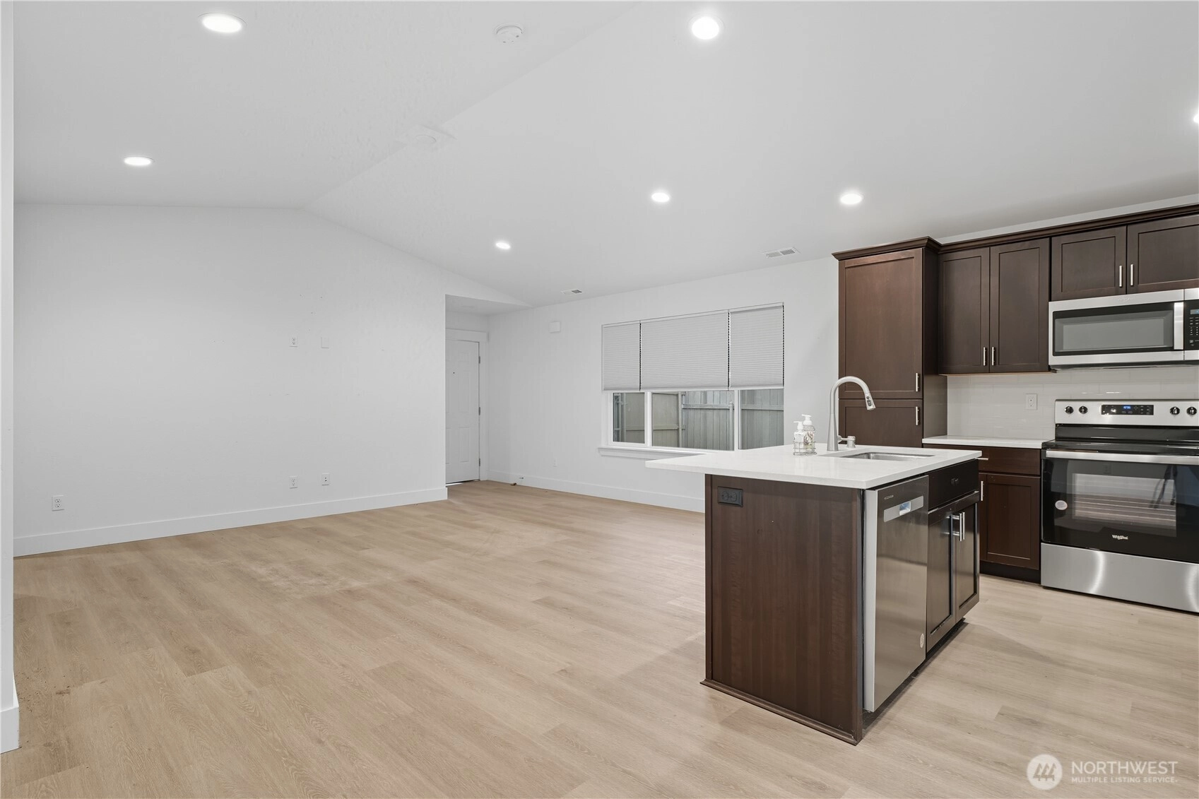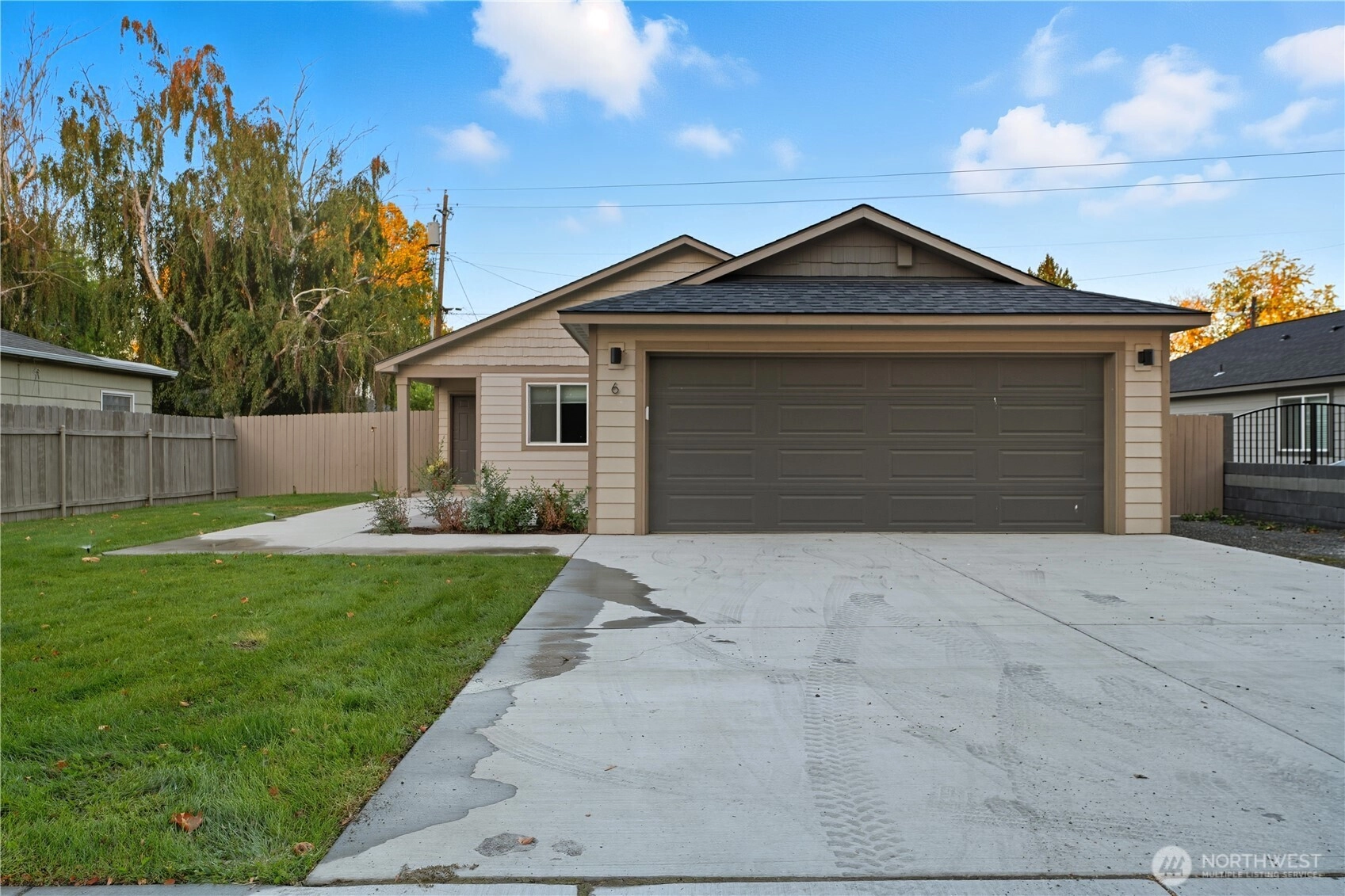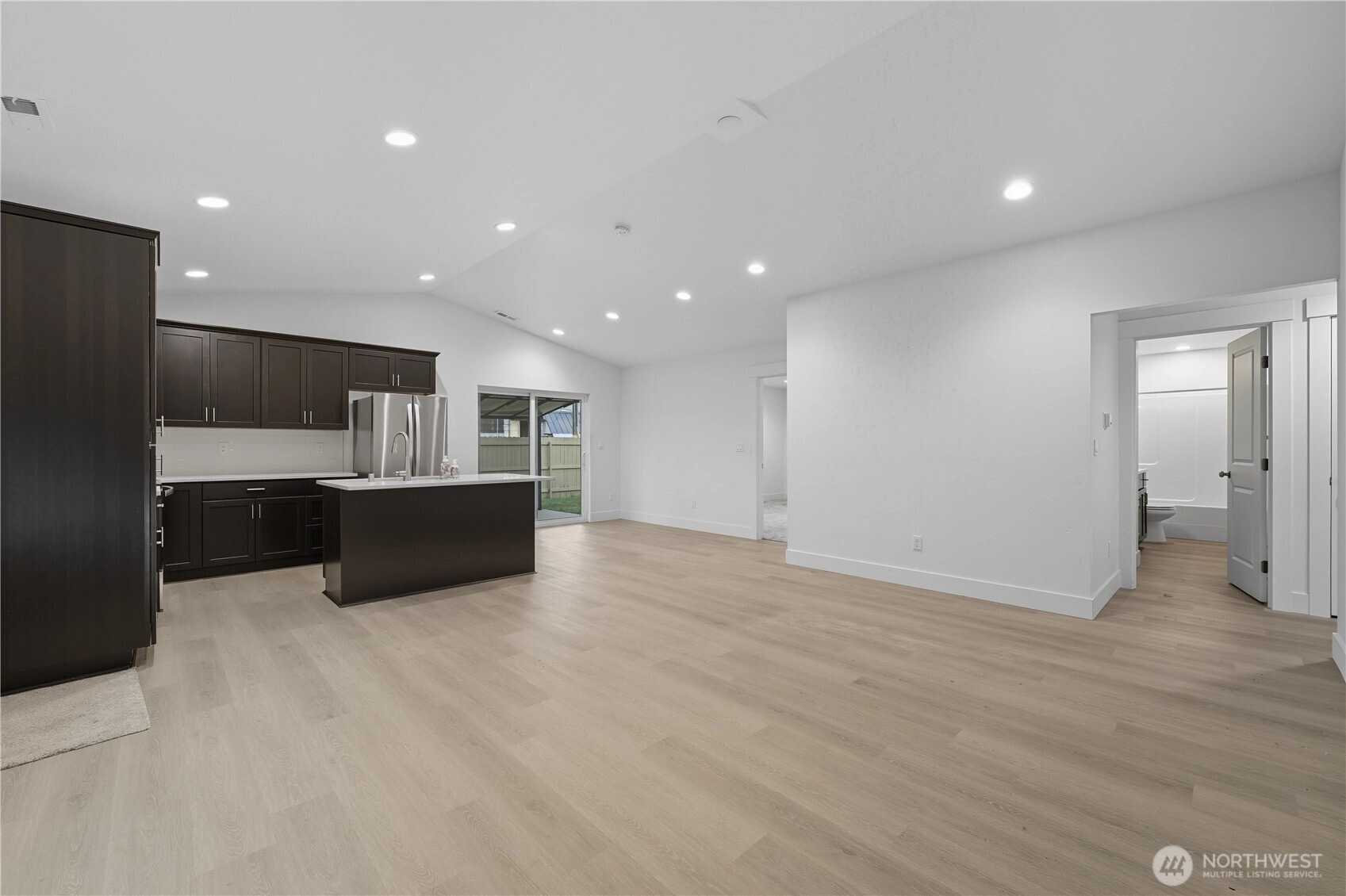 This 2023 built rambler features three bedrooms, two full bathrooms, a two-car garage and 1,332 sqft of living space. Inside the open main living space has vaulted ceilings, luxury vinyl plank flooring, quartz countertops, subway tile backsplash, soft close cabinets, stainless appliances and pantry cabinet. Three bedrooms are a split design with two secondary bedrooms at front of the home, and primary suite off the living room. Bedrooms has carpet with an upgraded carpet pad, extra tall white trim and recessed lighting. The primary has an ensuite bath with an over-sized single vanity and a huge walk-in closet. Moving outside you’ll find full front and backyard landscaping, full fencing, lap siding and a concrete pad back patio.