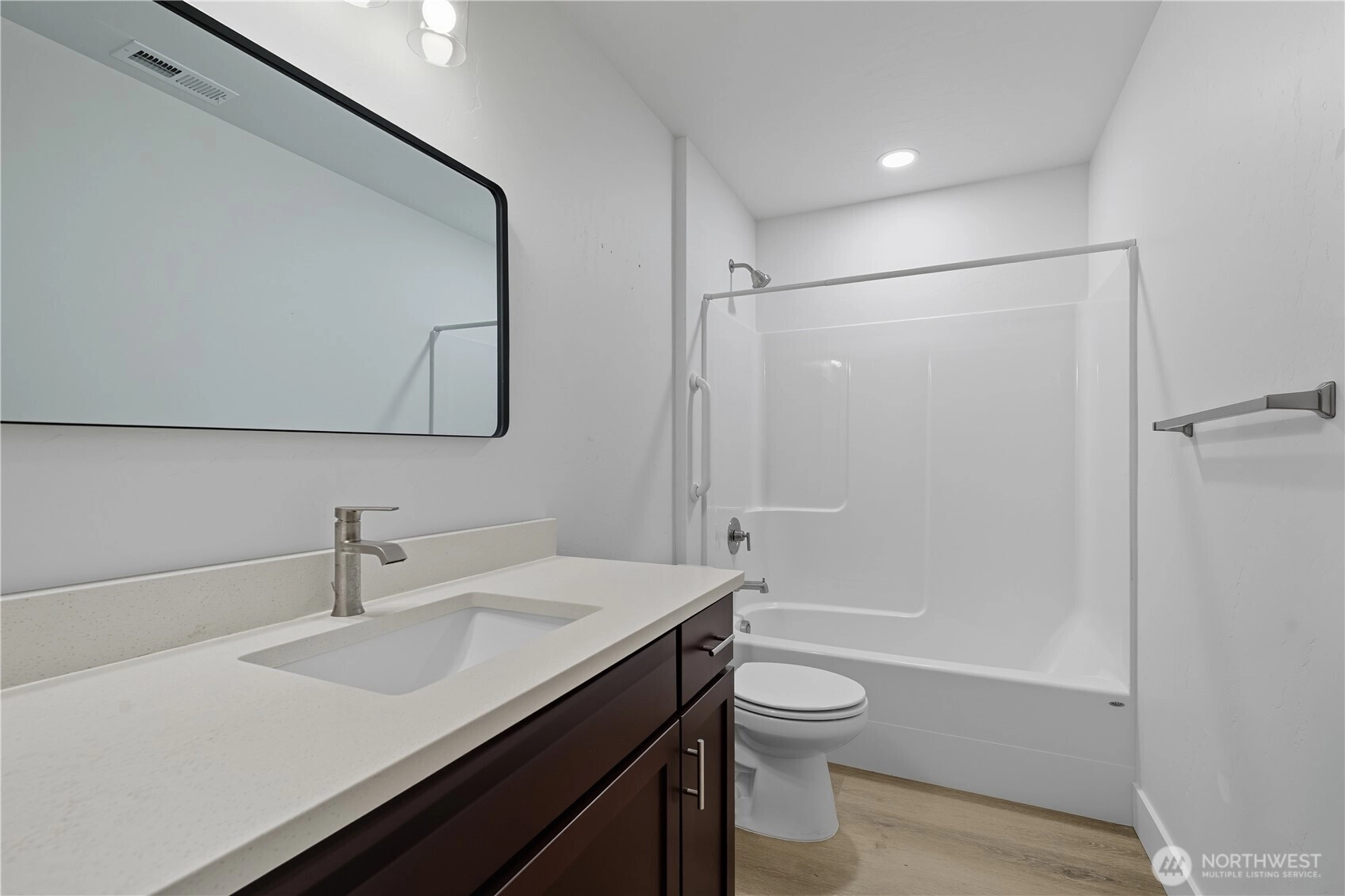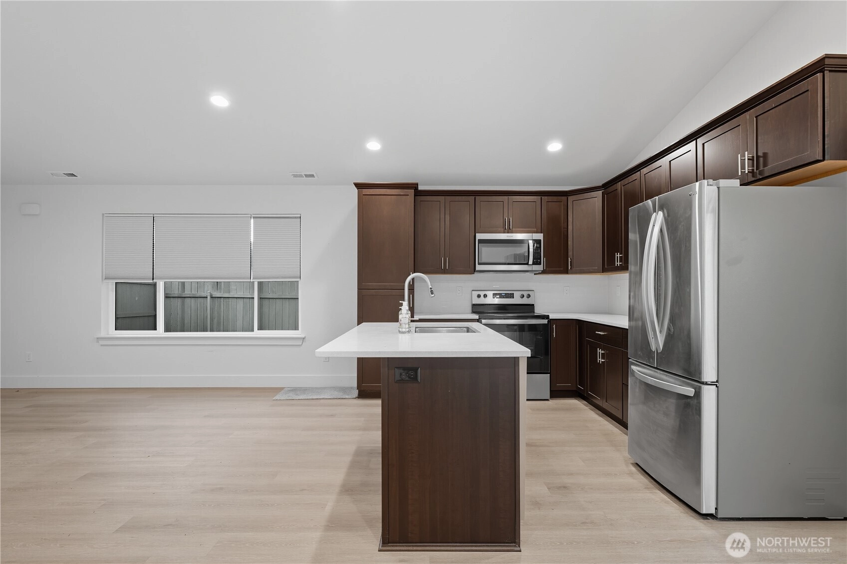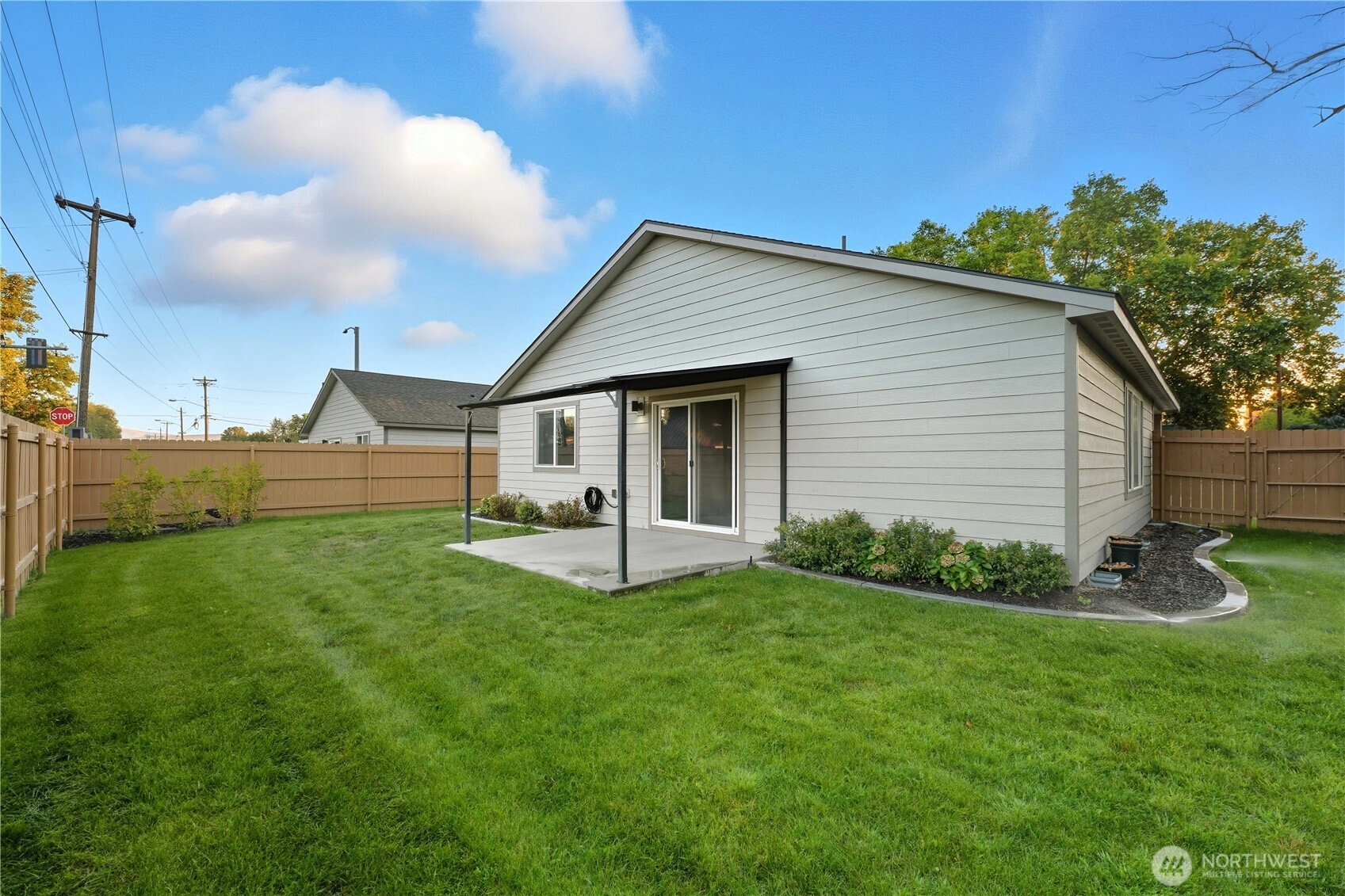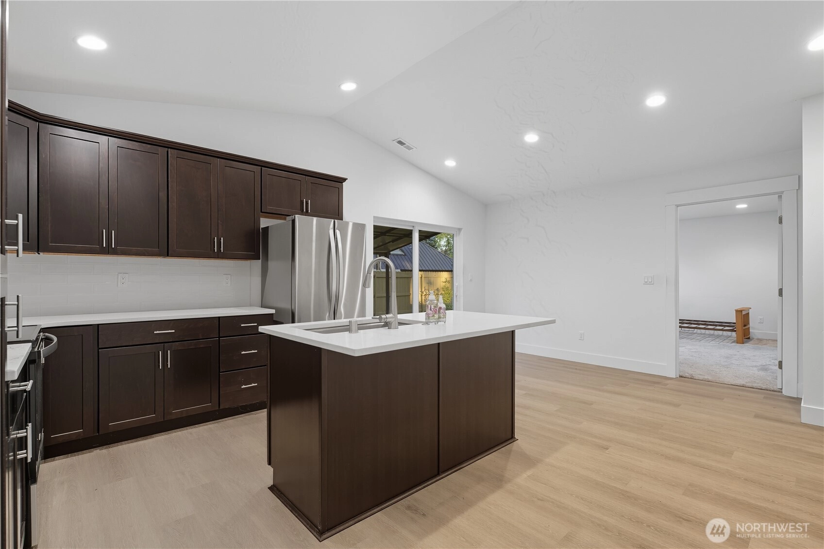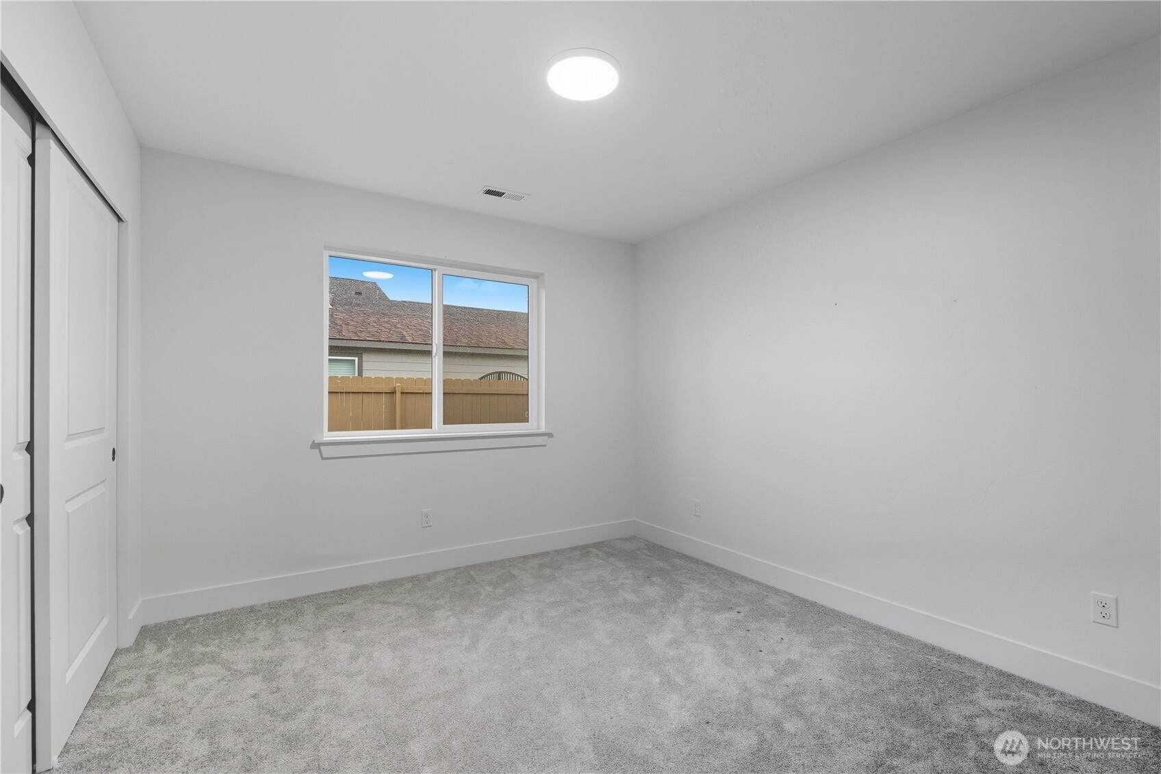 This 2023 built rambler features three bedrooms, two full bathrooms, a two-car garage and 1,332 sqft of living space. Inside the open main living space has vaulted ceilings, luxury vinyl plank flooring, quartz countertops, subway tile backsplash, soft close cabinets, stainless appliances and pantry cabinet. Three bedrooms are a split design with two secondary bedrooms at front of the home, and primary suite off the living room. Bedrooms has carpet with an upgraded carpet pad, extra tall white trim and recessed lighting. The primary has an ensuite bath with an over-sized single vanity and a huge walk-in closet. Moving outside you’ll find full front and backyard landscaping, full fencing, lap siding and a concrete pad back patio.