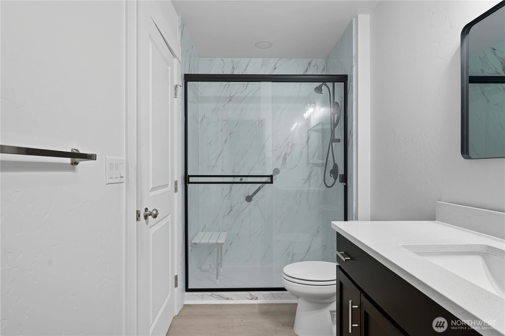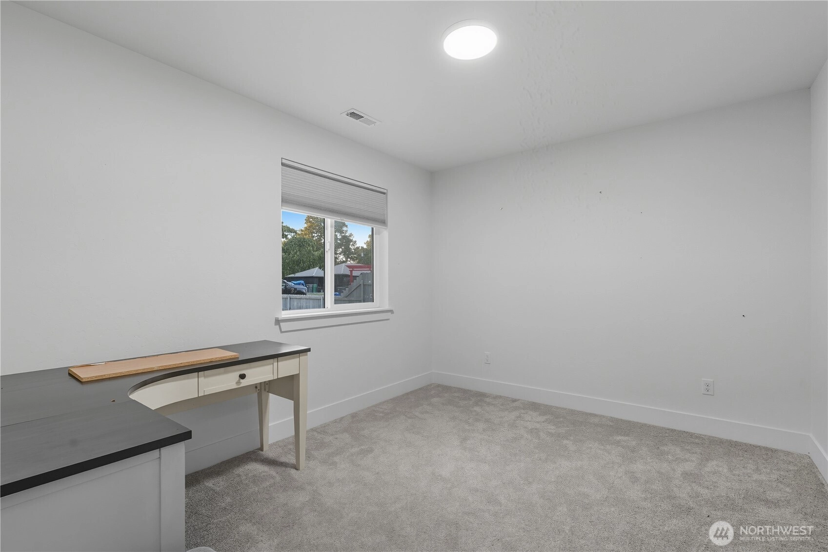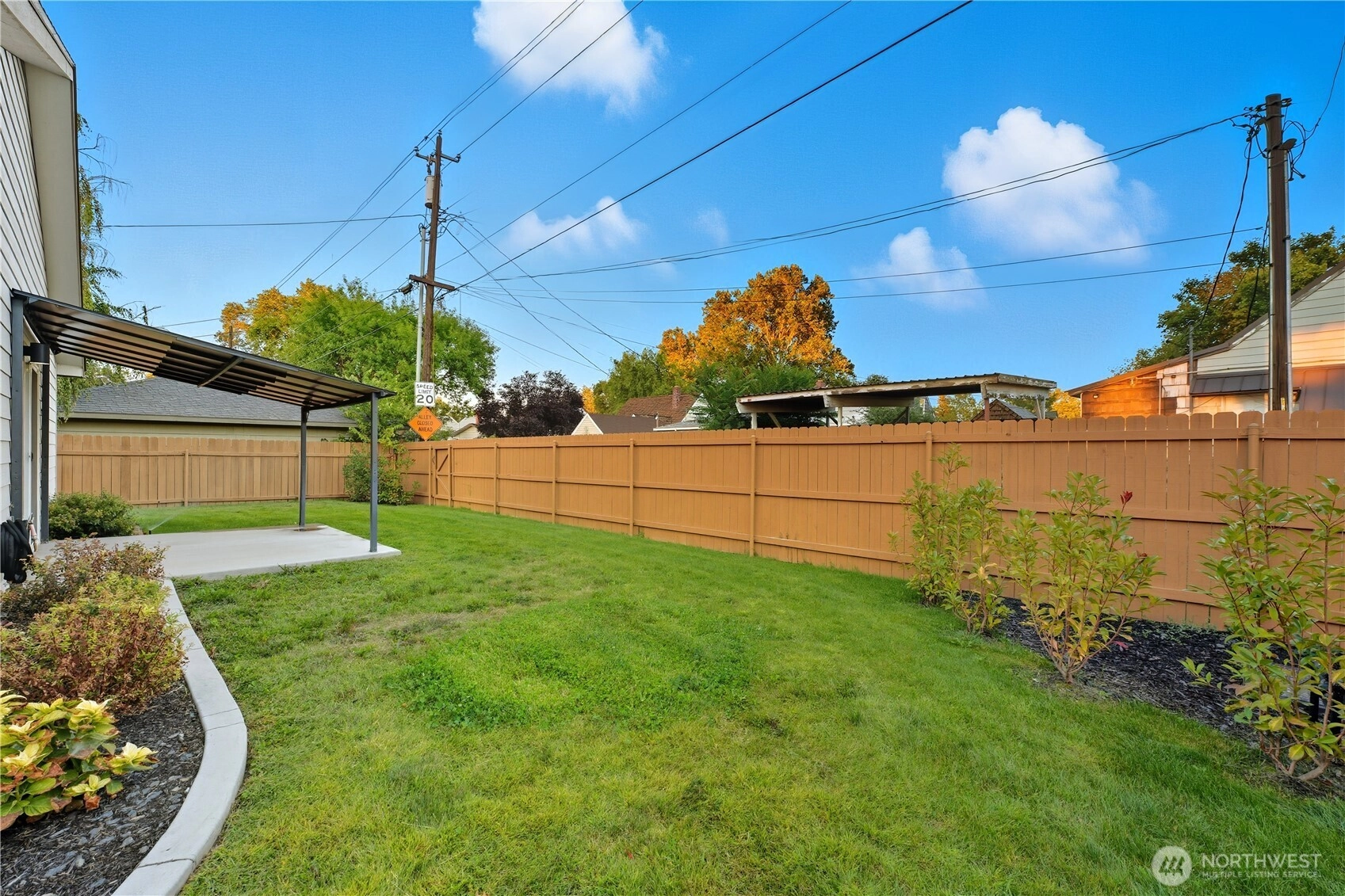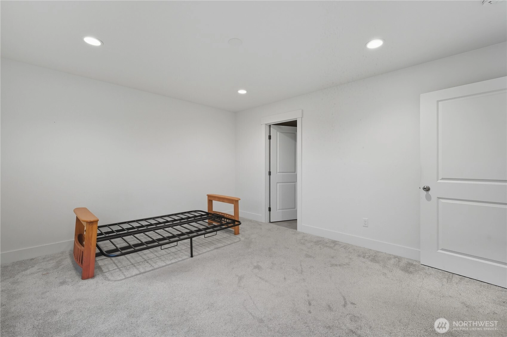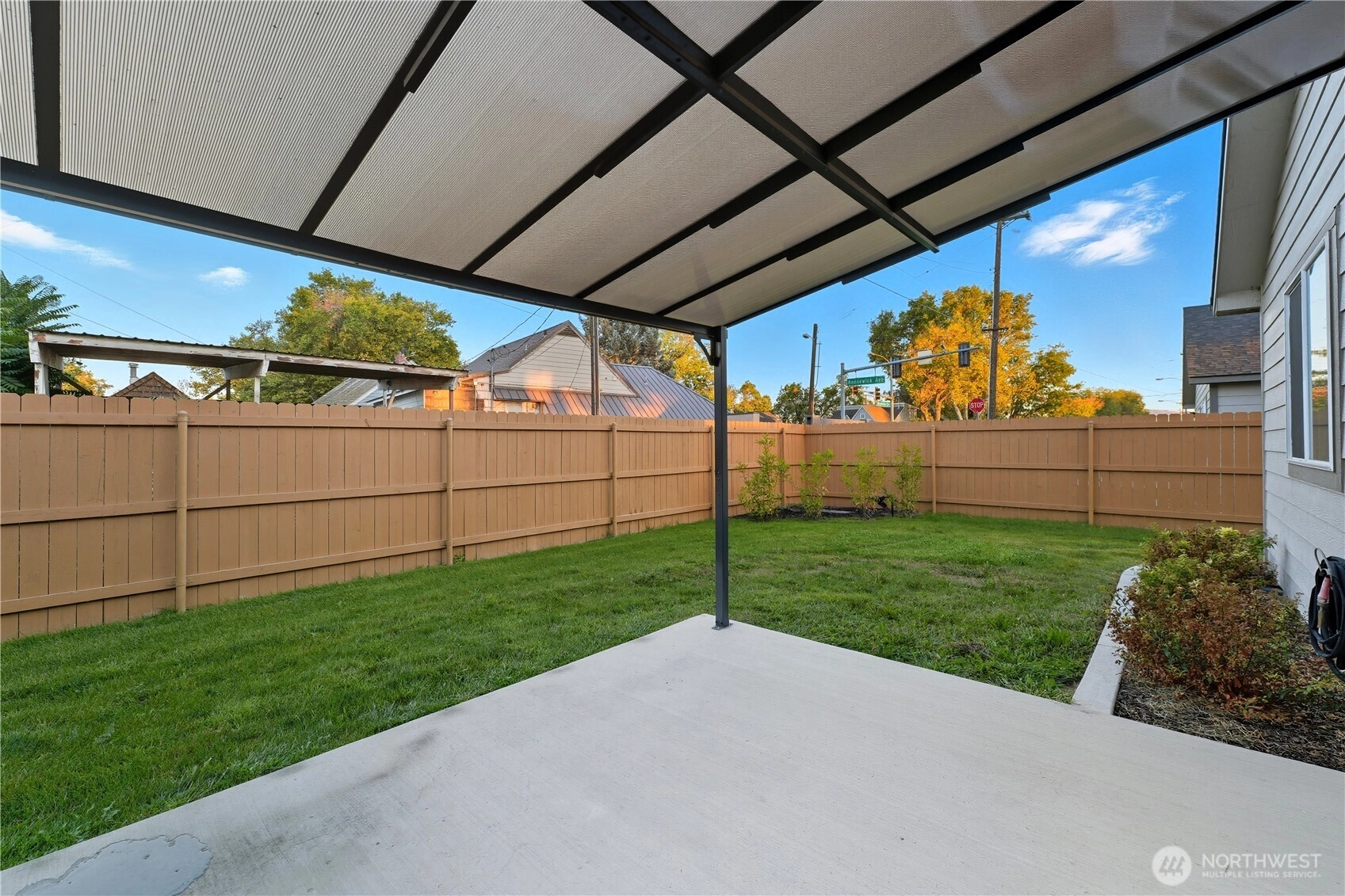 This 2023 built rambler features three bedrooms, two full bathrooms, a two-car garage and 1,332 sqft of living space. Inside the open main living space has vaulted ceilings, luxury vinyl plank flooring, quartz countertops, subway tile backsplash, soft close cabinets, stainless appliances and pantry cabinet. Three bedrooms are a split design with two secondary bedrooms at front of the home, and primary suite off the living room. Bedrooms has carpet with an upgraded carpet pad, extra tall white trim and recessed lighting. The primary has an ensuite bath with an over-sized single vanity and a huge walk-in closet. Moving outside you’ll find full front and backyard landscaping, full fencing, lap siding and a concrete pad back patio.
