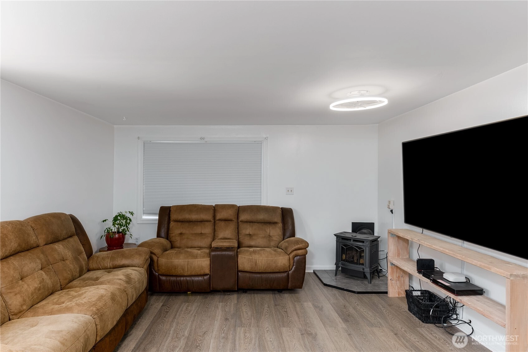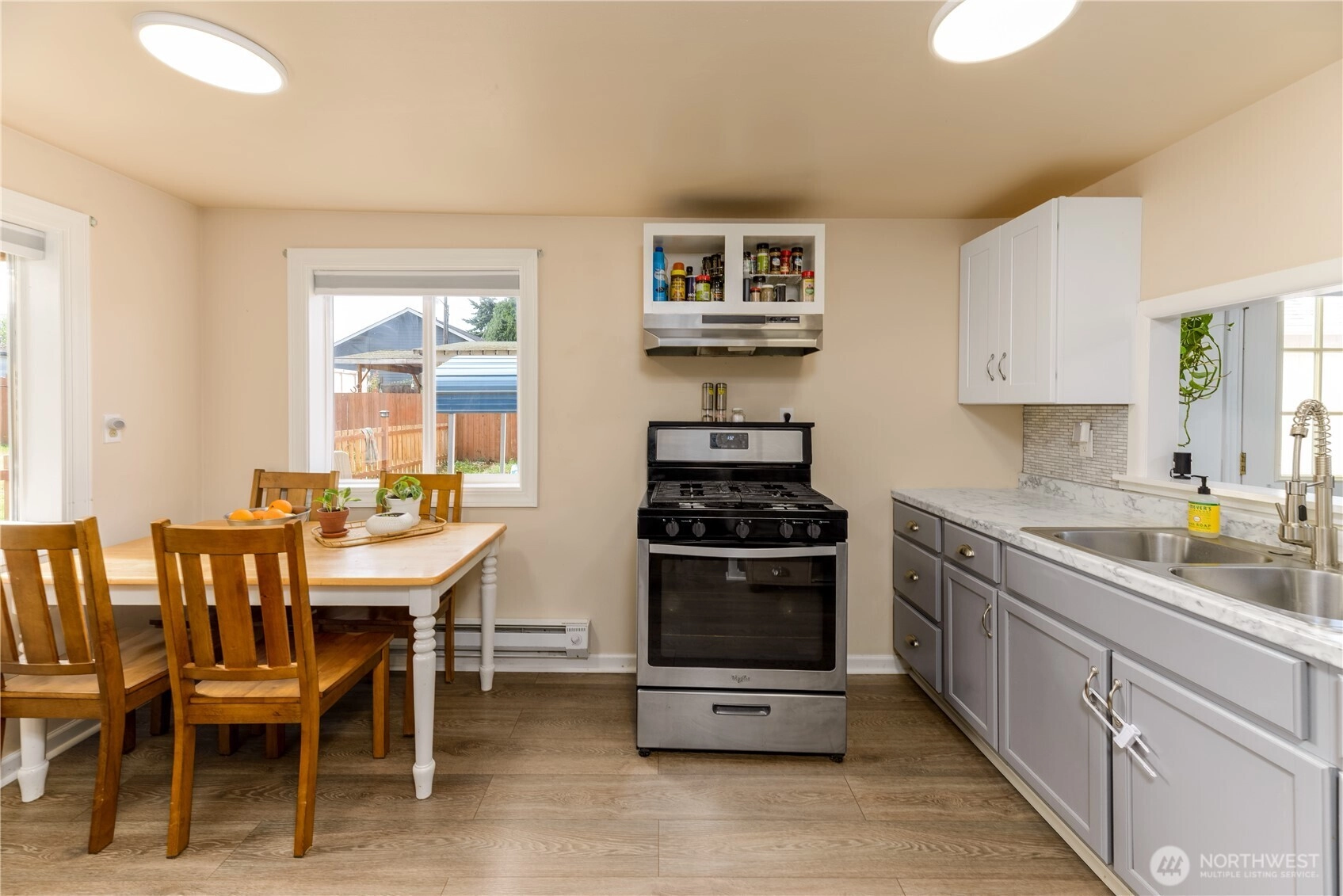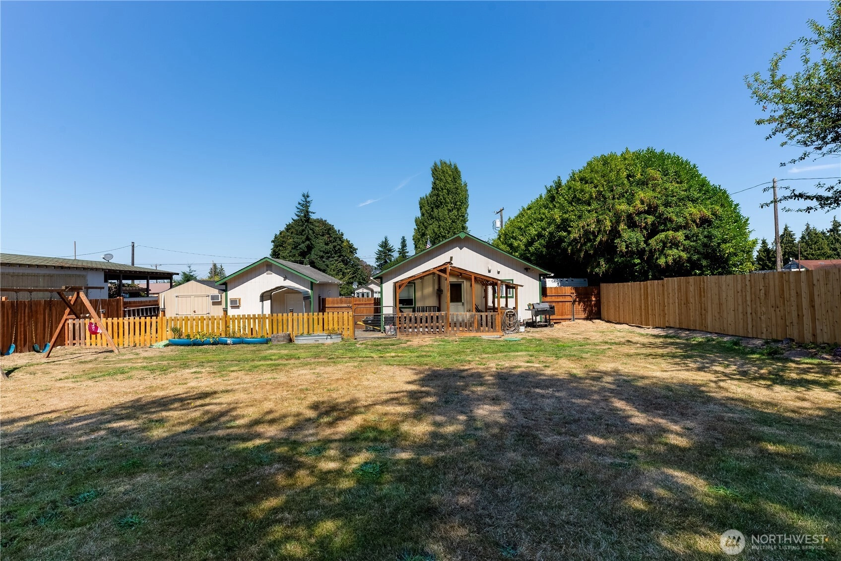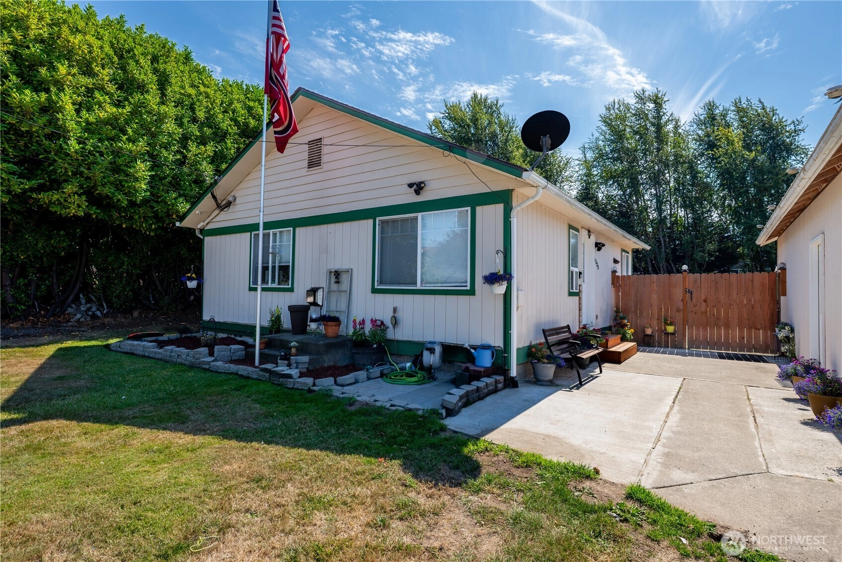 This inviting home offers a well-designed layout featuring a kitchen with a gas stovetop, a pass-through window to the living room, and an adjacent dining area filled with natural light. The cozy living room includes a free-standing stove, perfect for chilly evenings. Bathroom has a generous storage closet, providing convenient extra space. Step outside to enjoy a fully fenced backyard, mountain views, a covered back patio with a gas-plumbed BBQ, and plenty of room to entertain or relax. Two finished outbuildings with power and A/C units offer excellent options for home offices, studios, or home gym. Additional features include a garage, off-street parking, and a location that combines comfort & functionality.