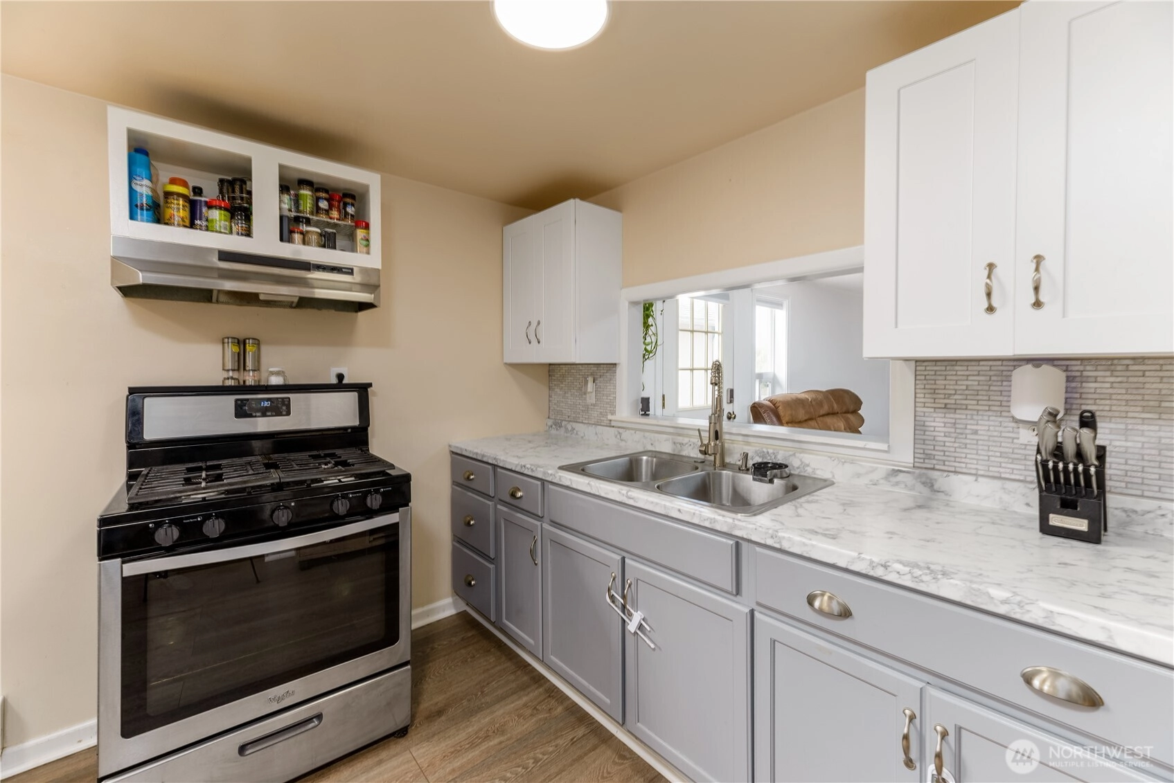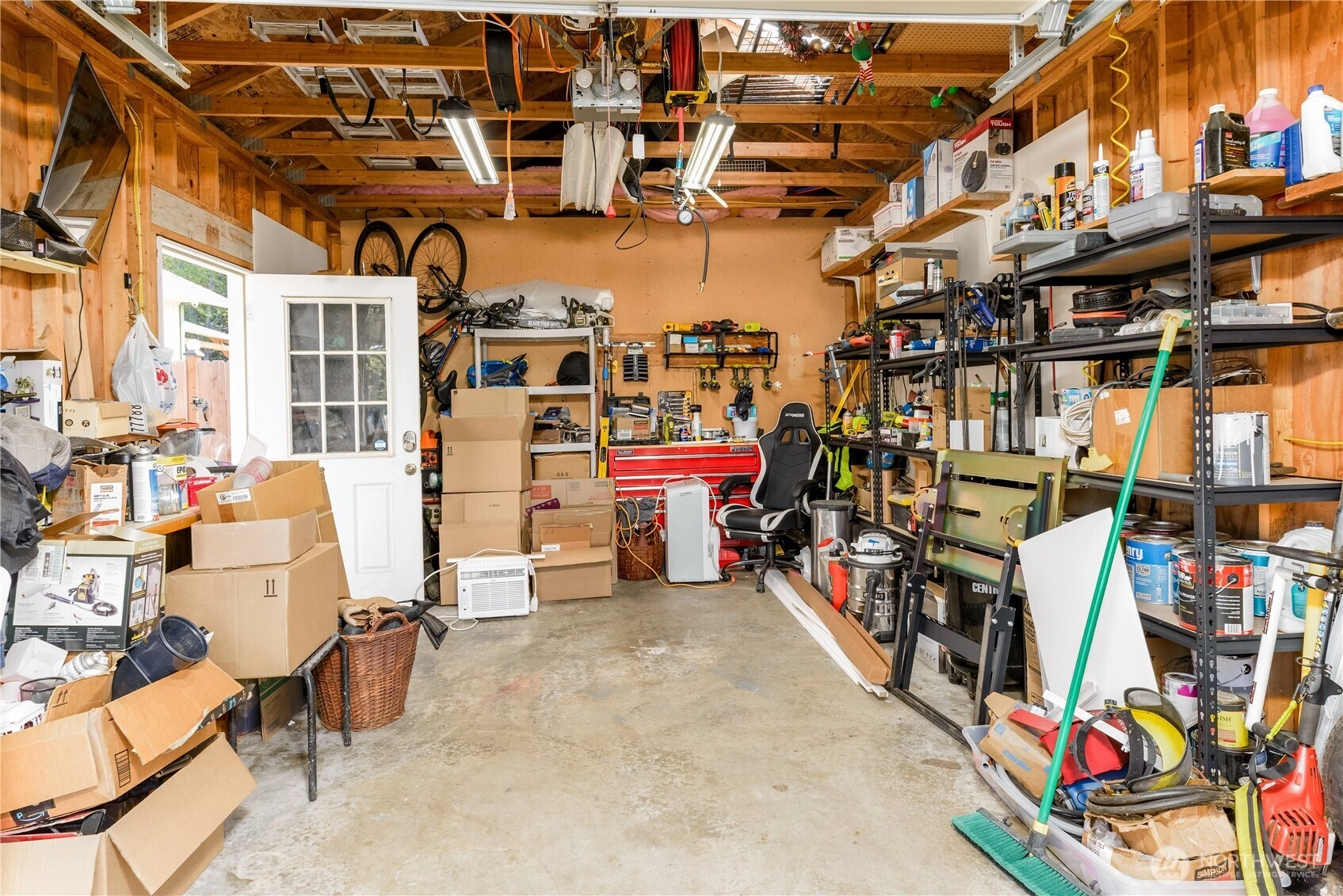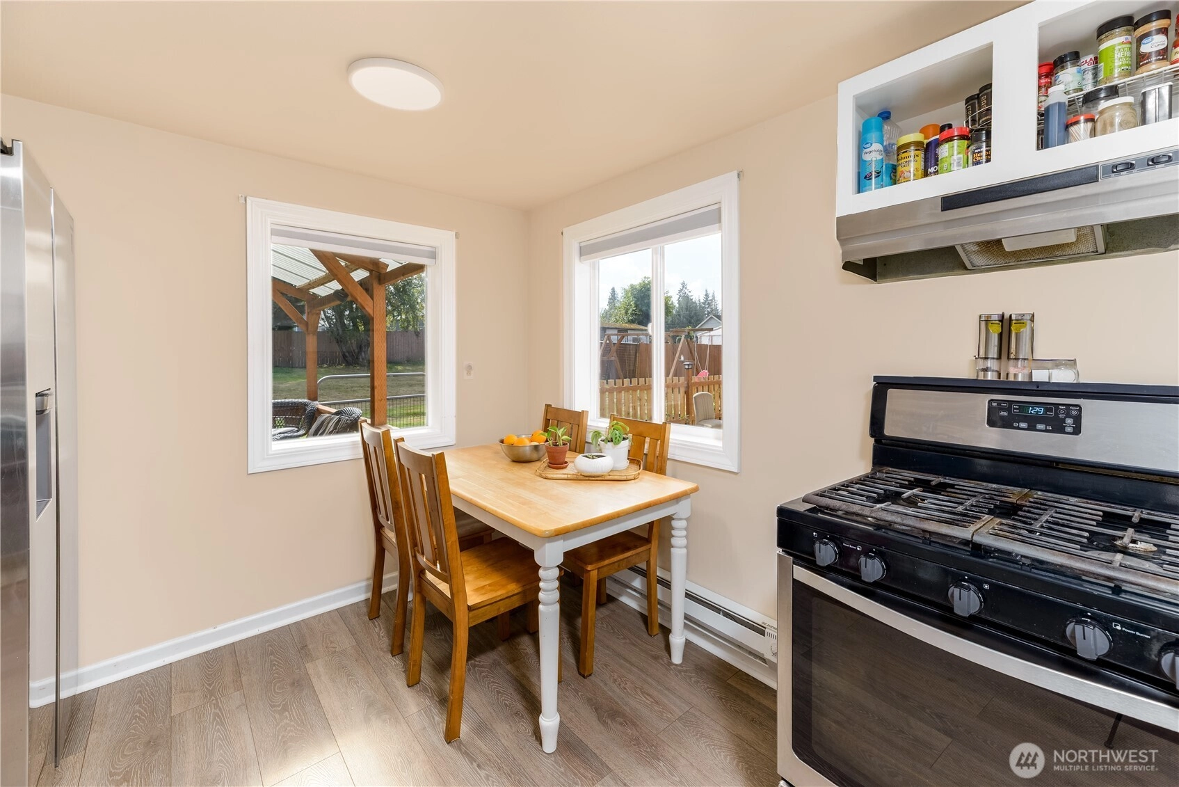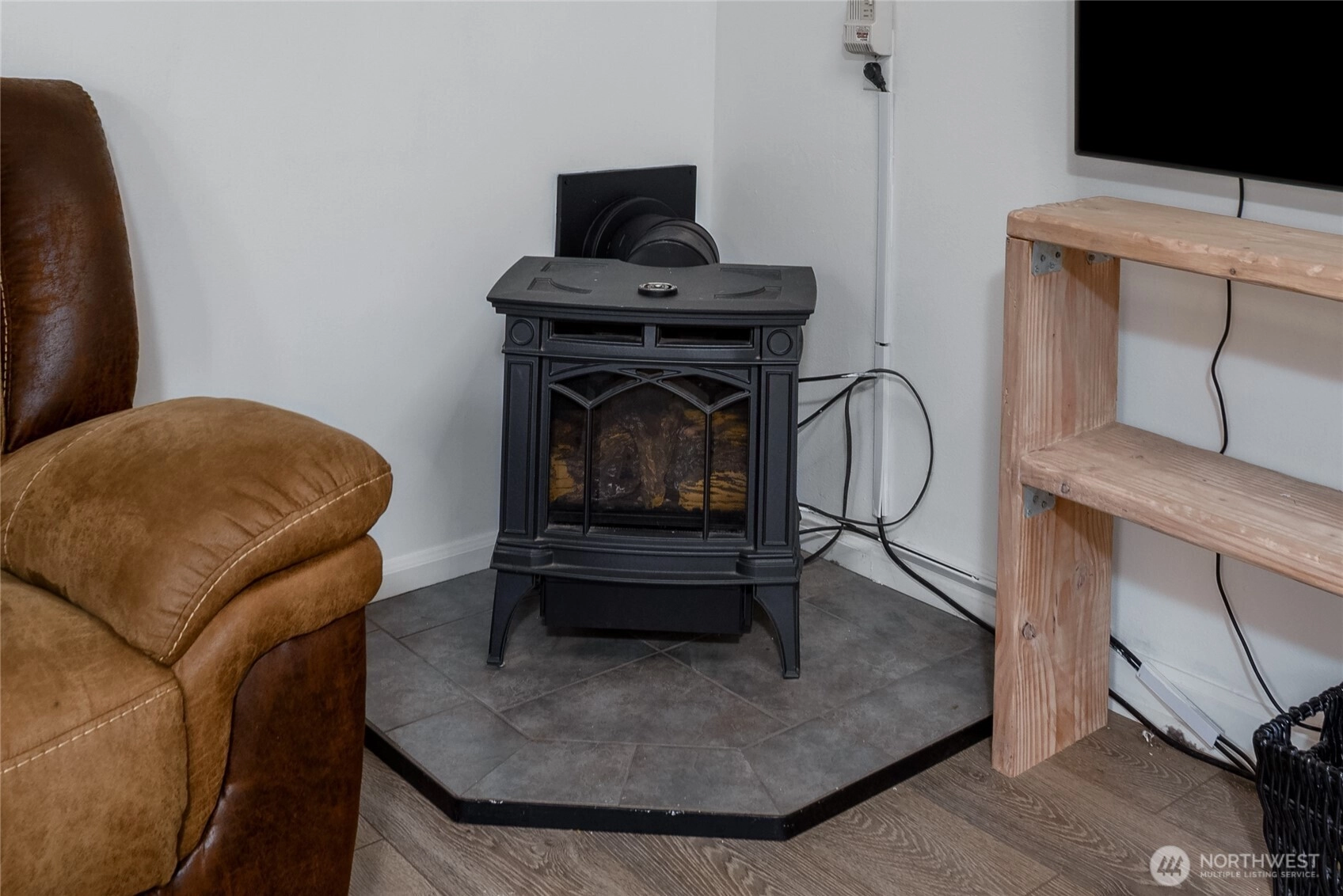 This inviting home offers a well-designed layout featuring a kitchen with a gas stovetop, a pass-through window to the living room, and an adjacent dining area filled with natural light. The cozy living room includes a free-standing stove, perfect for chilly evenings. Bathroom has a generous storage closet, providing convenient extra space. Step outside to enjoy a fully fenced backyard, mountain views, a covered back patio with a gas-plumbed BBQ, and plenty of room to entertain or relax. Two finished outbuildings with power and A/C units offer excellent options for home offices, studios, or home gym. Additional features include a garage, off-street parking, and a location that combines comfort & functionality.