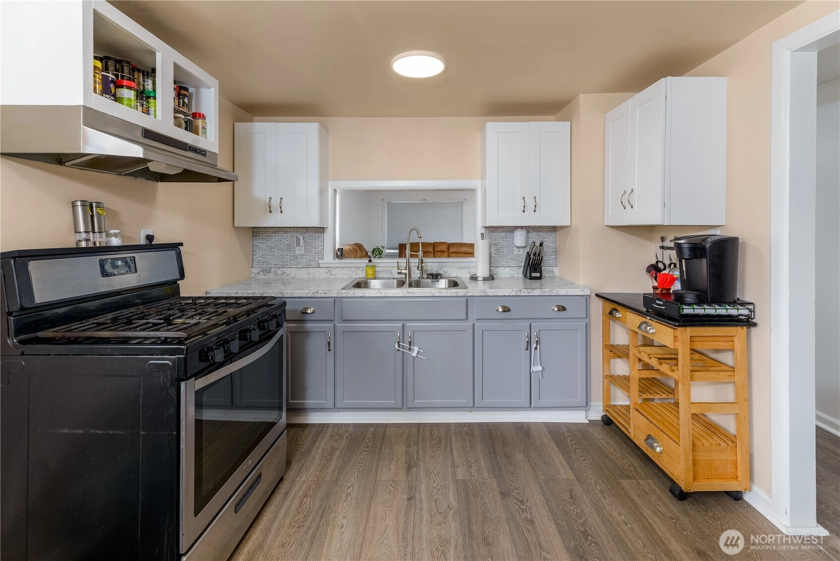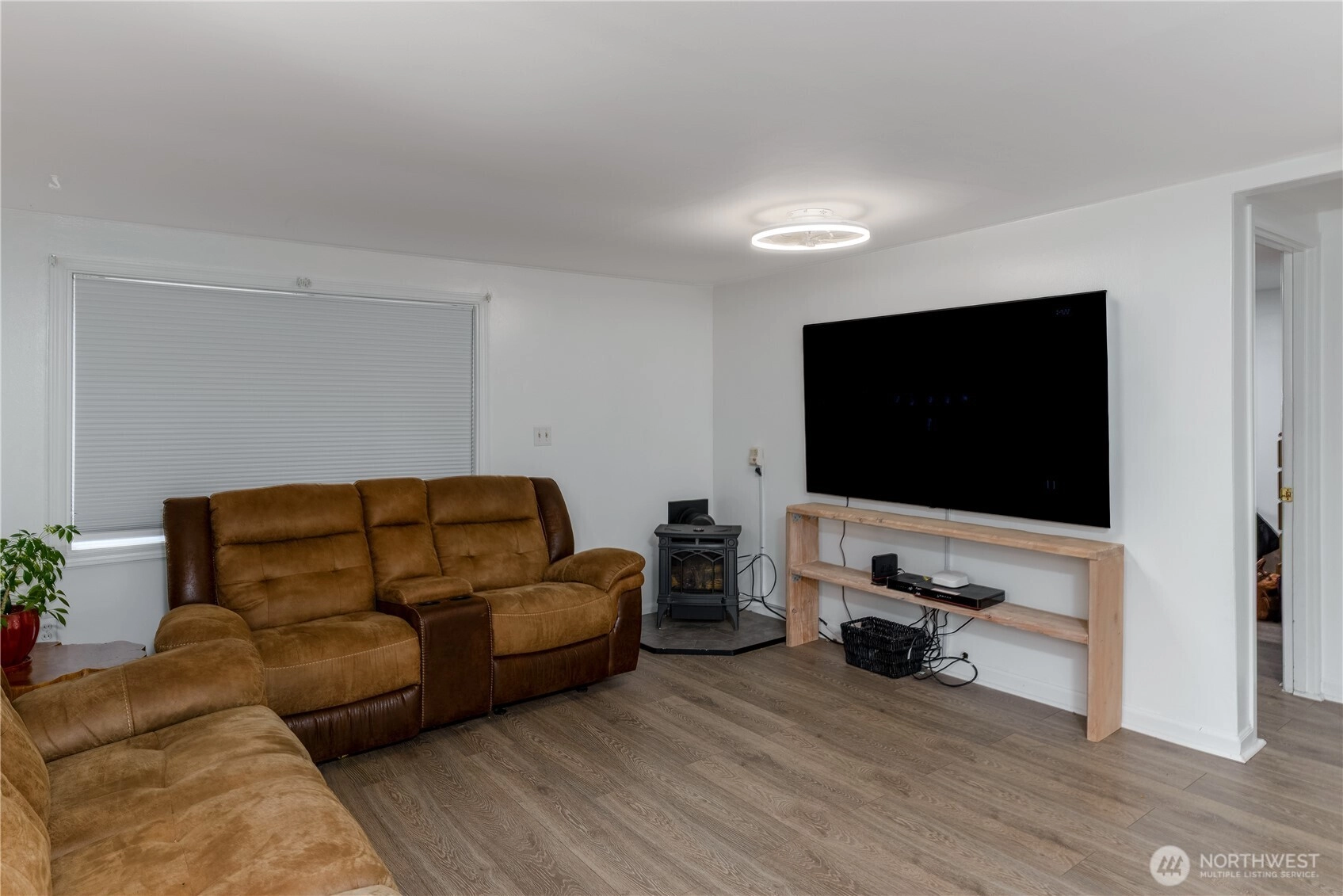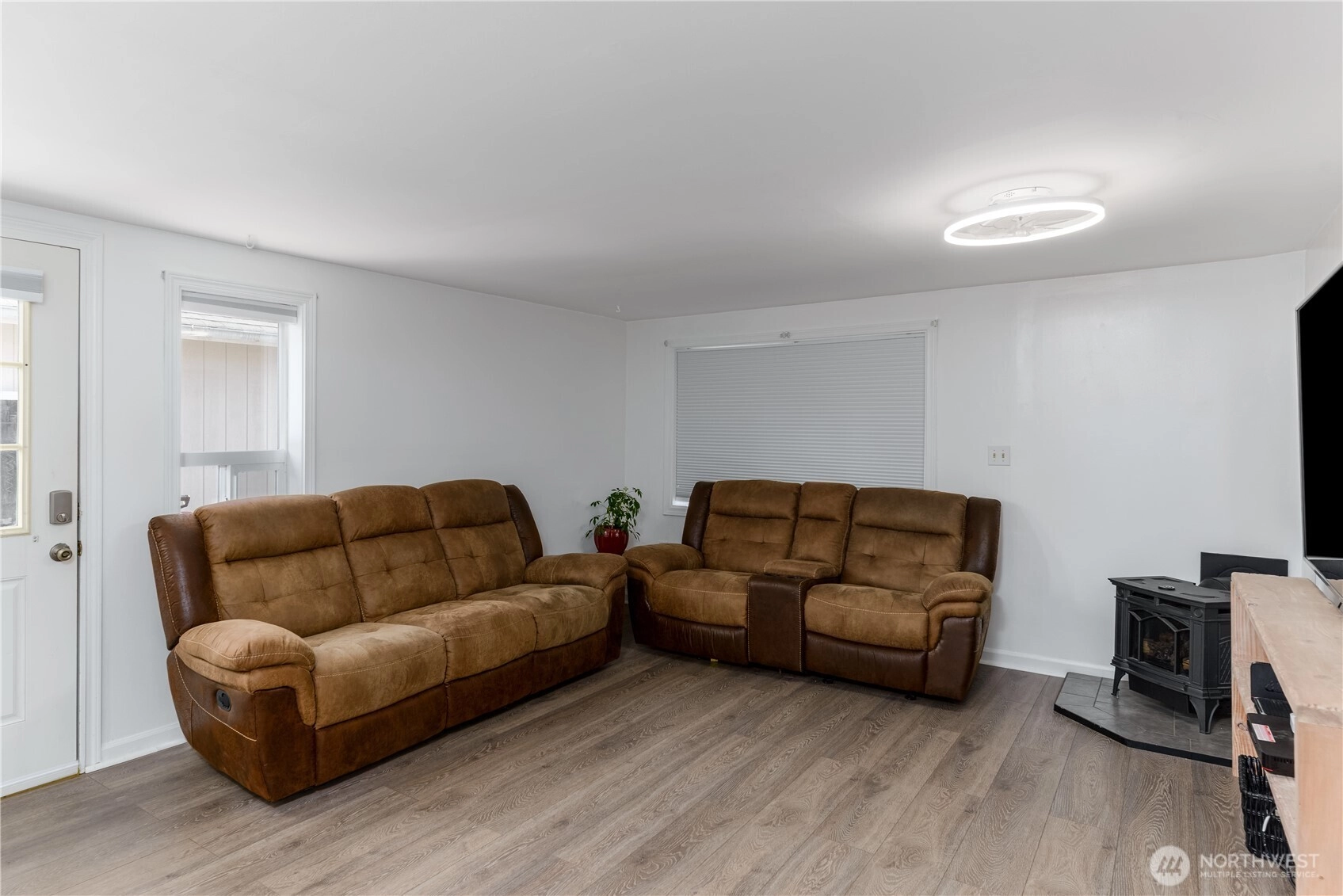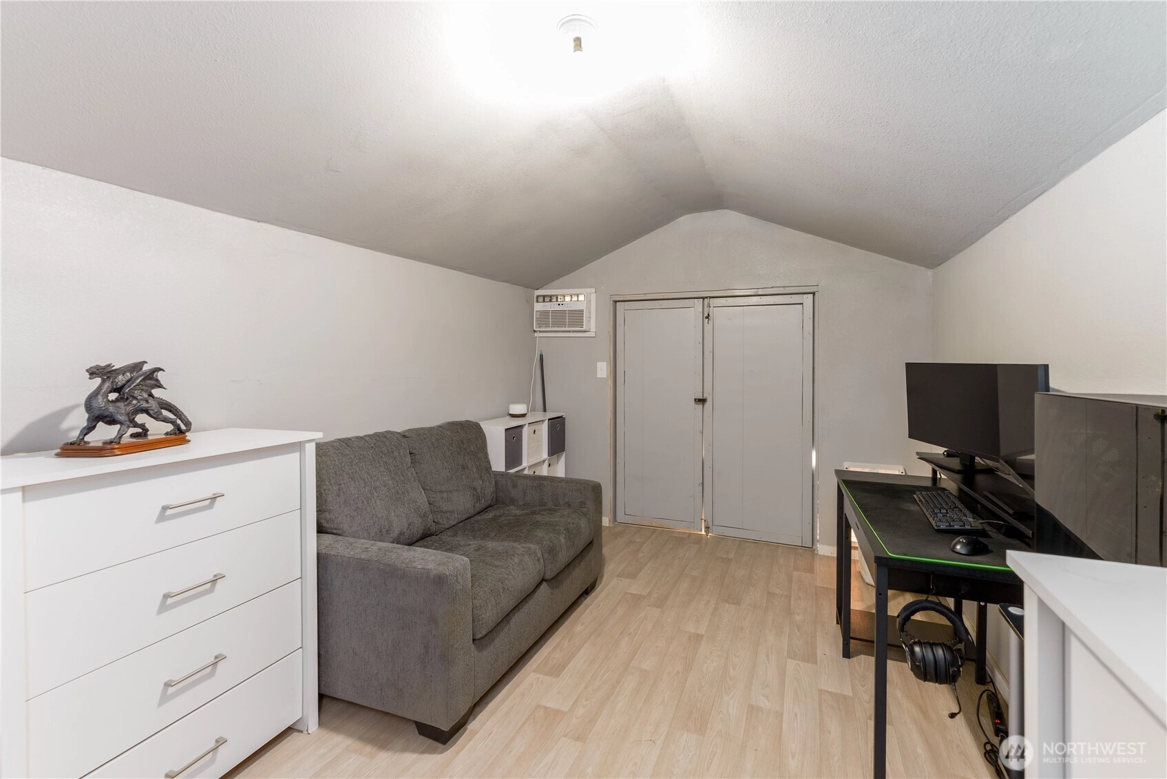 This inviting home offers a well-designed layout featuring a kitchen with a gas stovetop, a pass-through window to the living room, and an adjacent dining area filled with natural light. The cozy living room includes a free-standing stove, perfect for chilly evenings. Bathroom has a generous storage closet, providing convenient extra space. Step outside to enjoy a fully fenced backyard, mountain views, a covered back patio with a gas-plumbed BBQ, and plenty of room to entertain or relax. Two finished outbuildings with power and A/C units offer excellent options for home offices, studios, or home gym. Additional features include a garage, off-street parking, and a location that combines comfort & functionality.