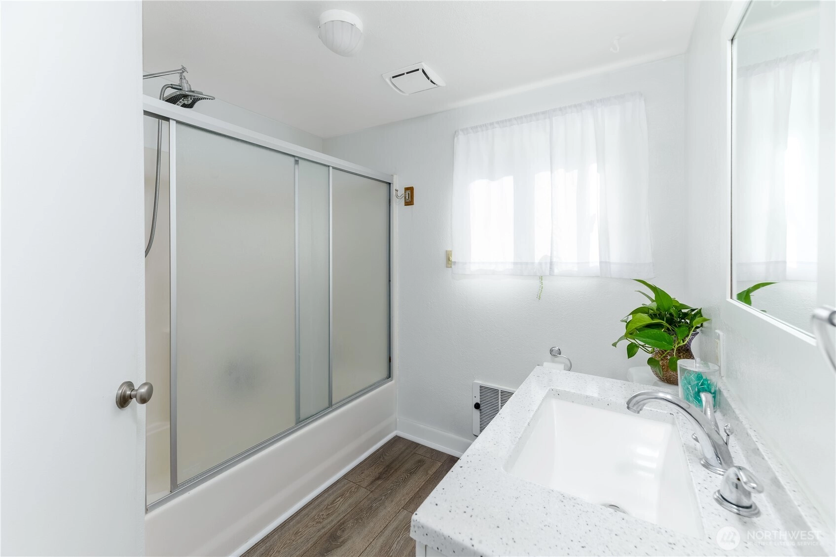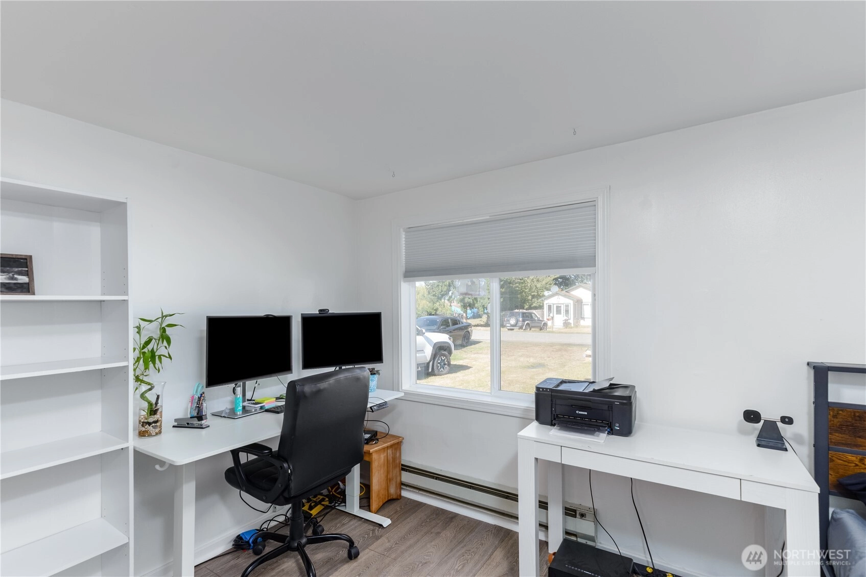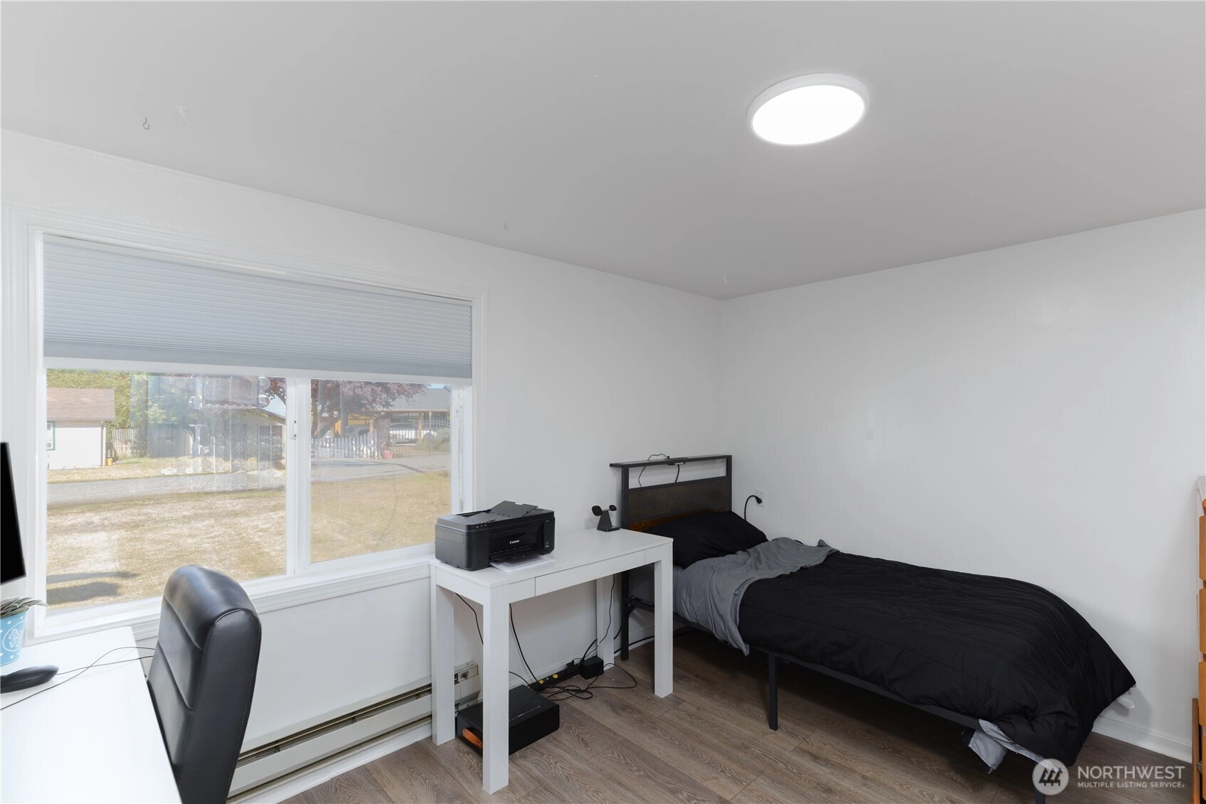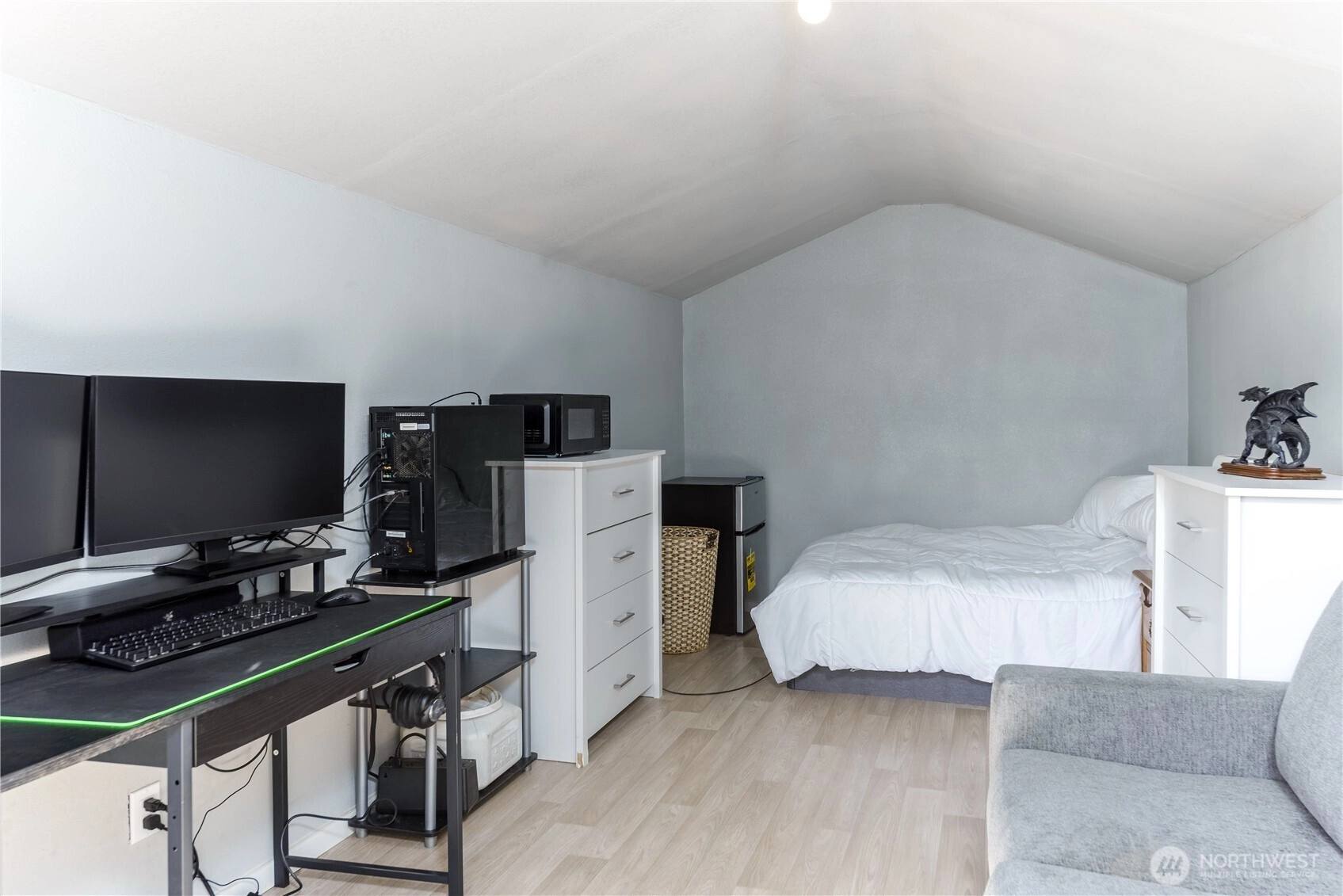 This inviting home offers a well-designed layout featuring a kitchen with a gas stovetop, a pass-through window to the living room, and an adjacent dining area filled with natural light. The cozy living room includes a free-standing stove, perfect for chilly evenings. Bathroom has a generous storage closet, providing convenient extra space. Step outside to enjoy a fully fenced backyard, mountain views, a covered back patio with a gas-plumbed BBQ, and plenty of room to entertain or relax. Two finished outbuildings with power and A/C units offer excellent options for home offices, studios, or home gym. Additional features include a garage, off-street parking, and a location that combines comfort & functionality.