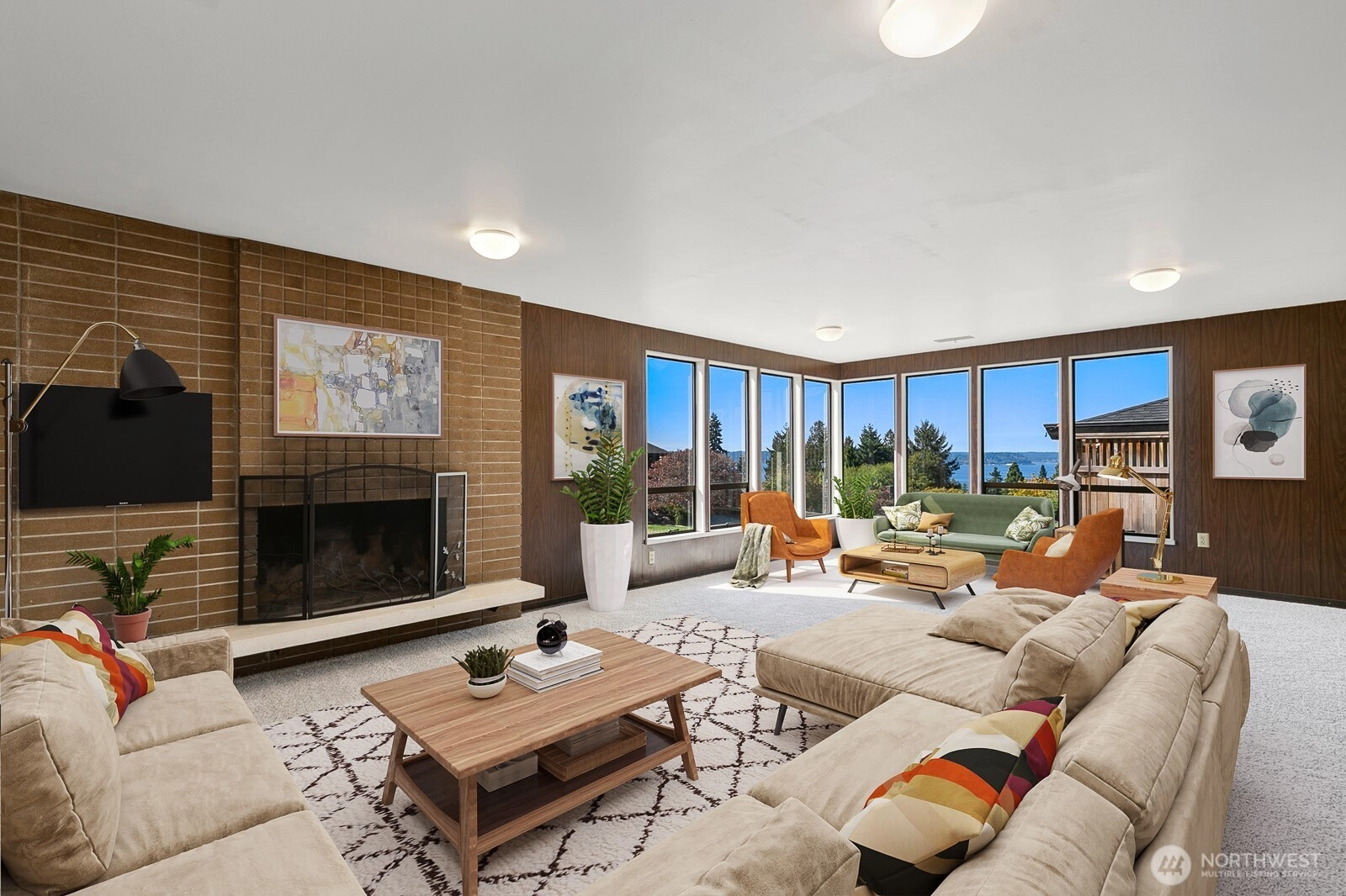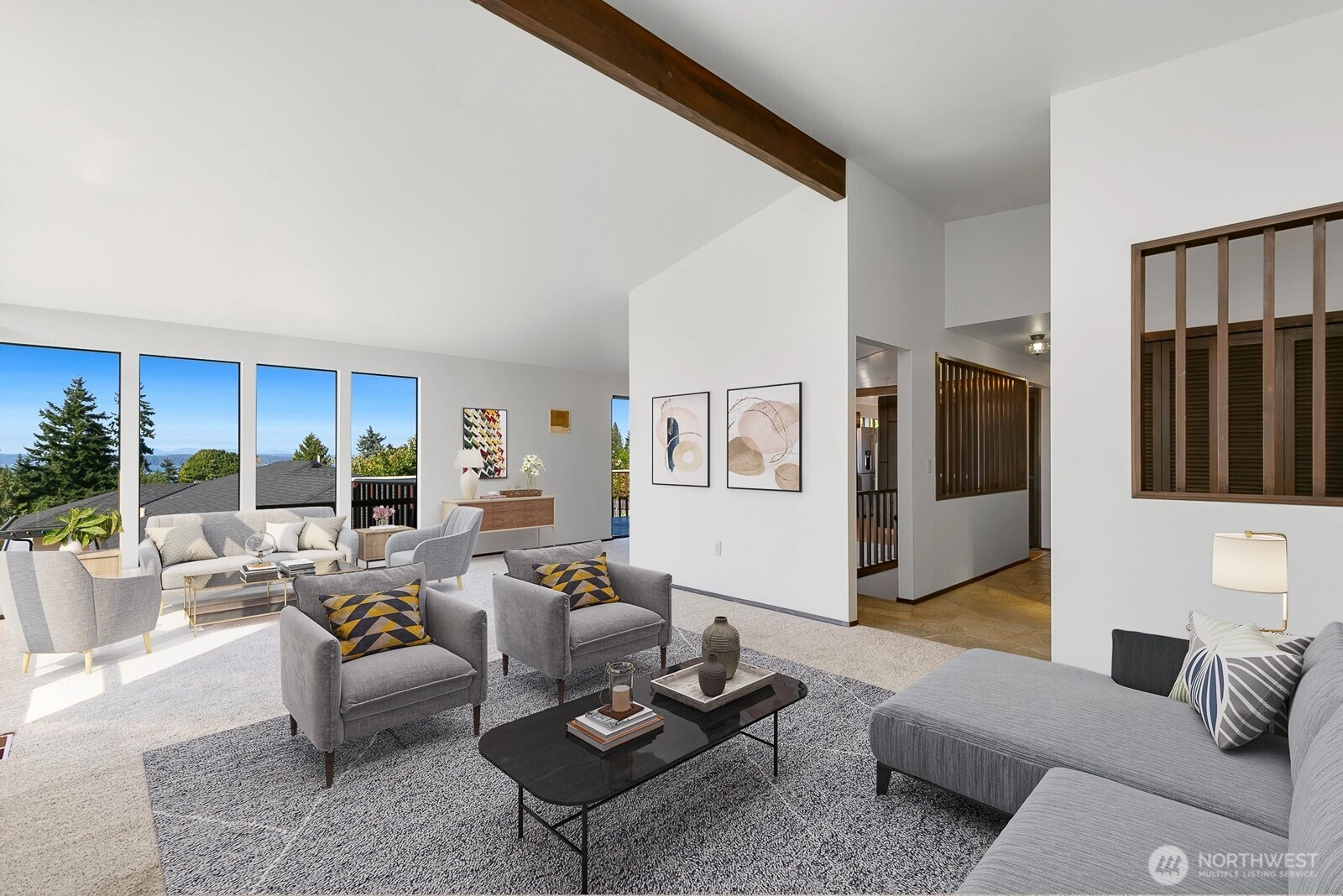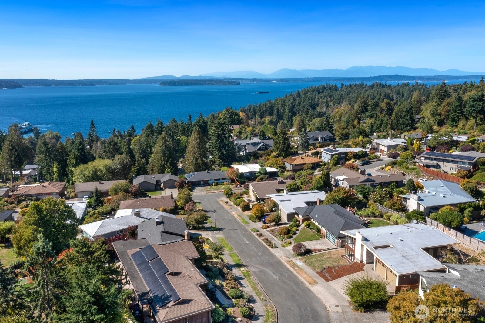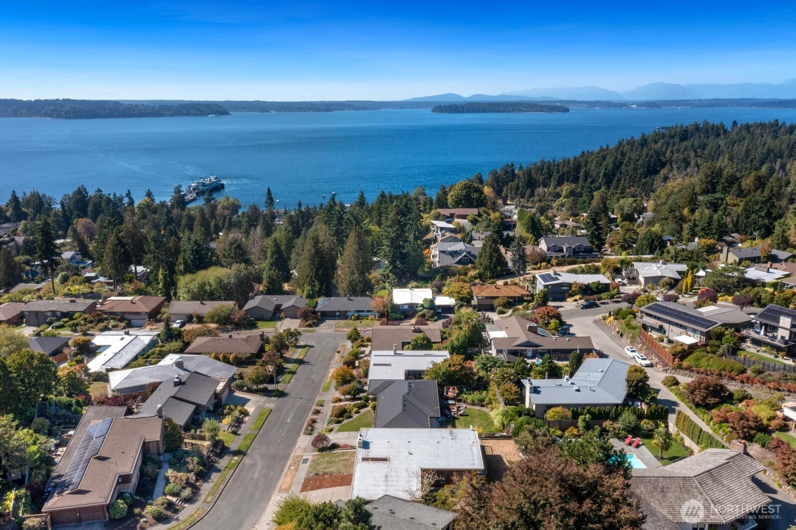Distinctive Fauntlee Hills Mid-Century Modern with sweeping Sound & Olympic Mountain views, ferries gliding to Vashon, and NO WIRES in sight. Built in 1968 as the builder’s own home, it reflects enduring quality and design. Handpicked Montana Travertine cladding, and a breezeway with skylight & Japanese maple creates a striking welcome. Inside, vaulted ceilings, slate entry, and walls of windows frame the view, opening to a 500+ SF deck. 4BD + office, 2.5BA, including a spacious primary suite with yard access. Lower family room also enjoys the view and a classic built-in bar. Fresh paint & flooring, select new appliances. 2-car garage. Large, level backyard offers room for a pool. Near Lincoln Park, Endolyne, and all West Seattle offers!