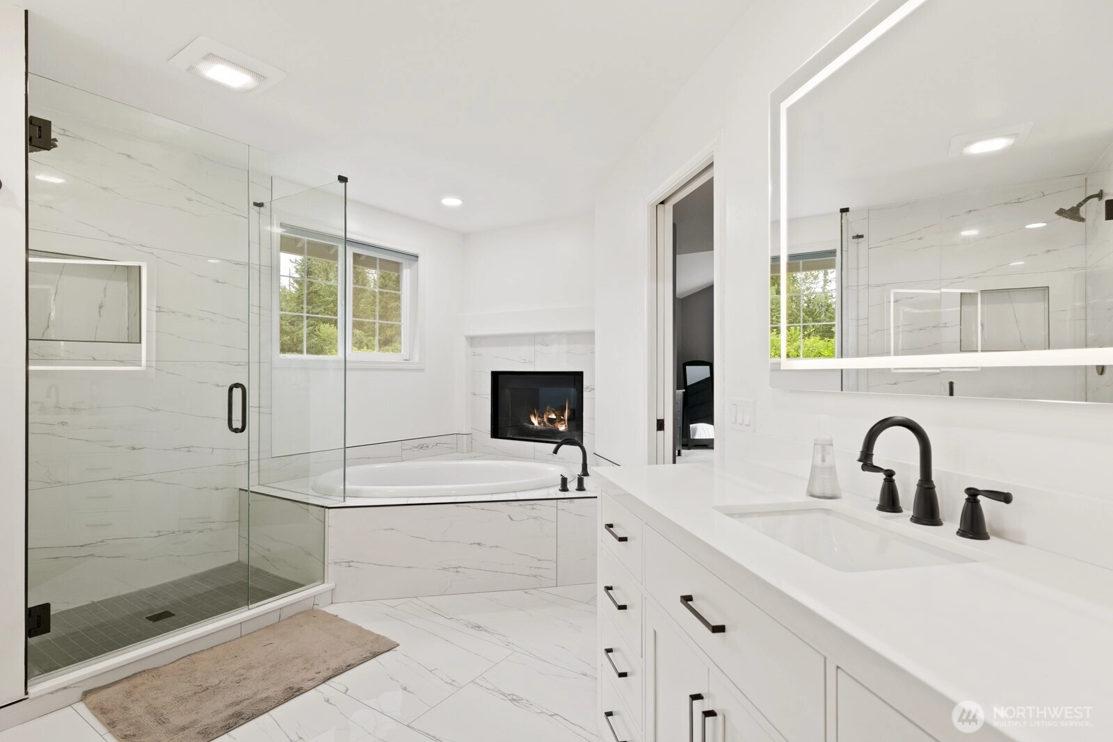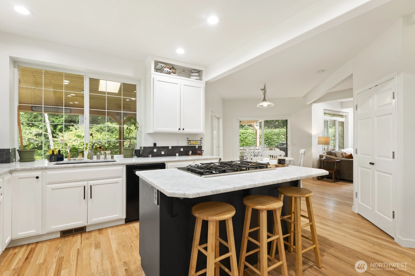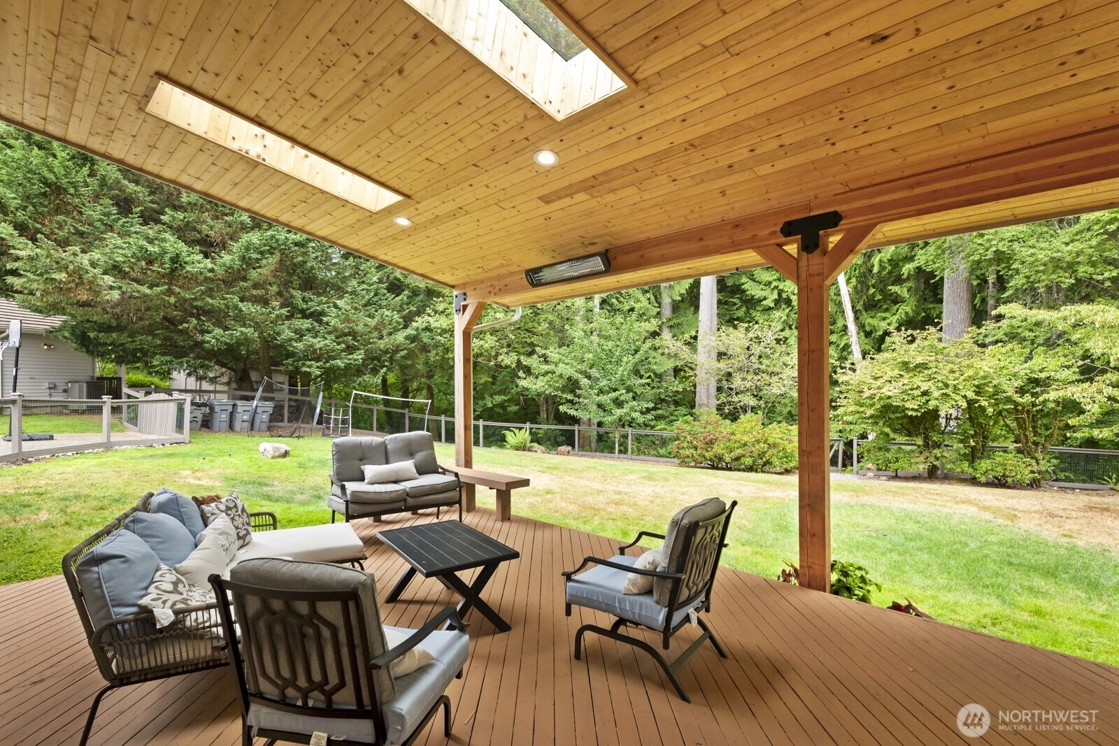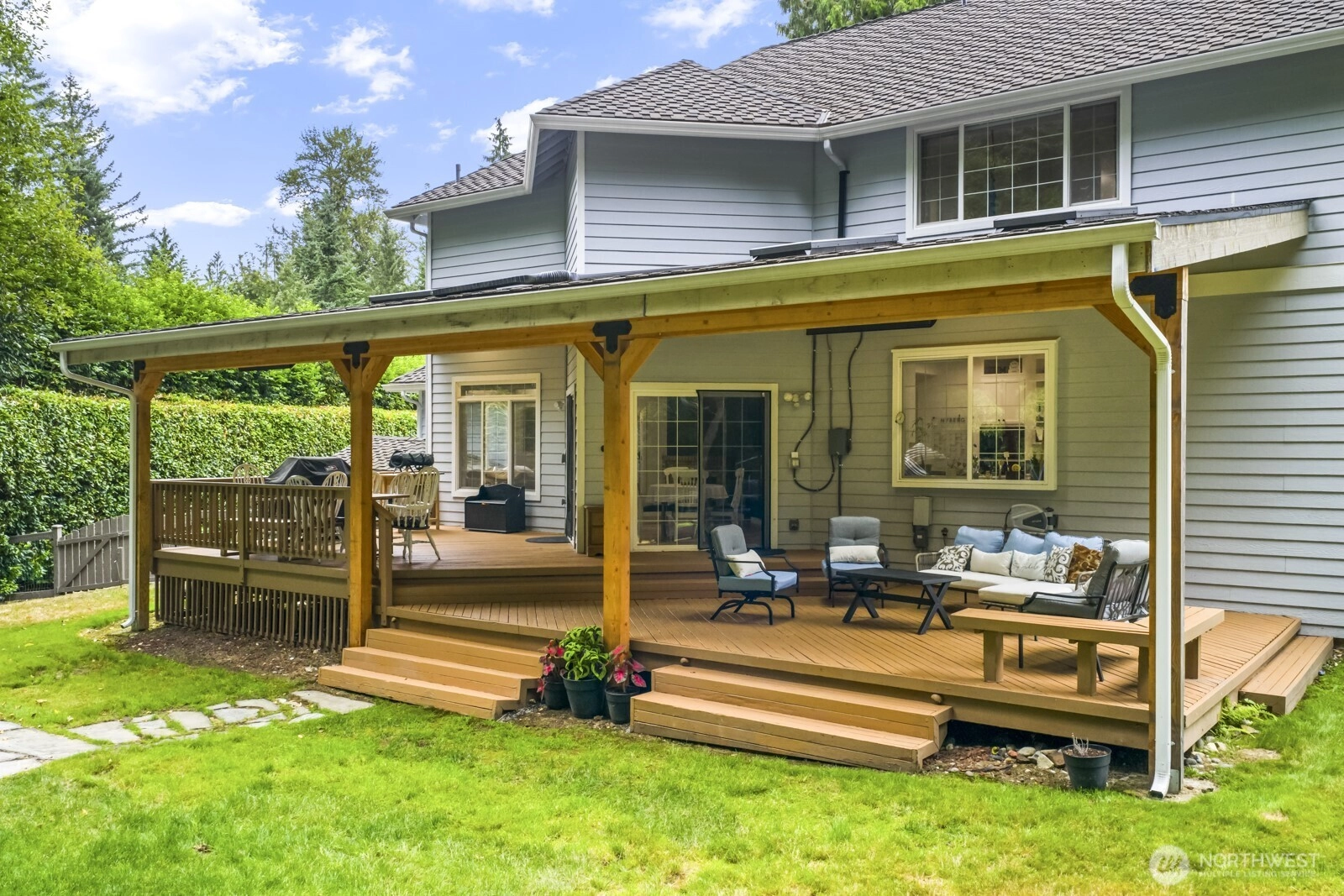 Beautifully updated contemporary home in highly sought-after Lake of the Woods. The ideal floor plan w/4 bedrms, office & bonus rm; hardwood flrs & 9-ft ceilings grace the main floor. Chef’s kitchen w/marble counters, sleek island, walk-in pantry, & Butler’s pantry. Lavish primary suite w/vaulted ceiling, custom wood-accent wall, fireplace & new spa-like bath. Updated hall & powder baths. Private, fully fenced backyard, entertain year-round on the expansive covered deck w/skylights, recessed lighting & heaters w/a serene greenbelt backdrop. Newer 50 yr roof & H2O. Excl Lkw Schls. Turnkey gem in a premier Woodinville enclave!