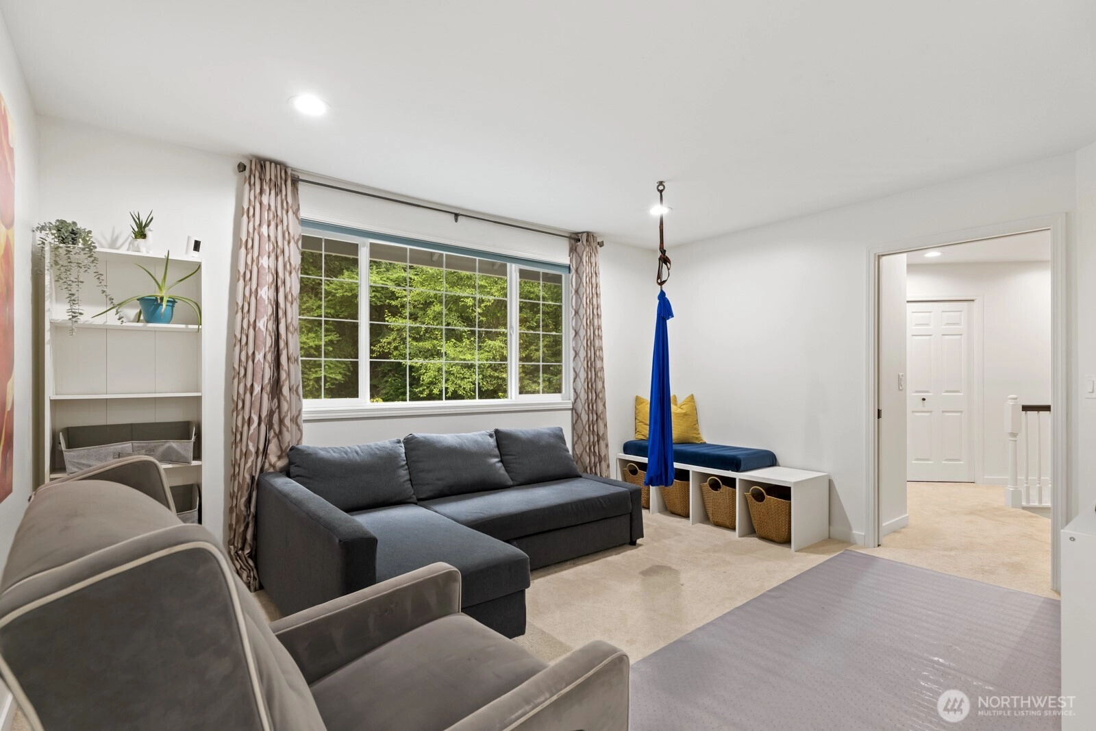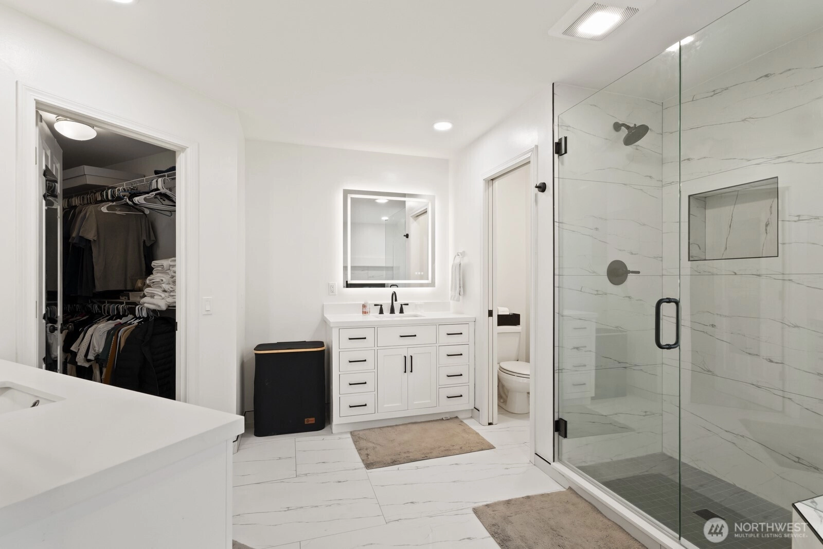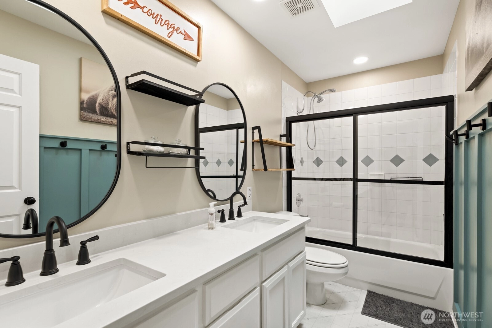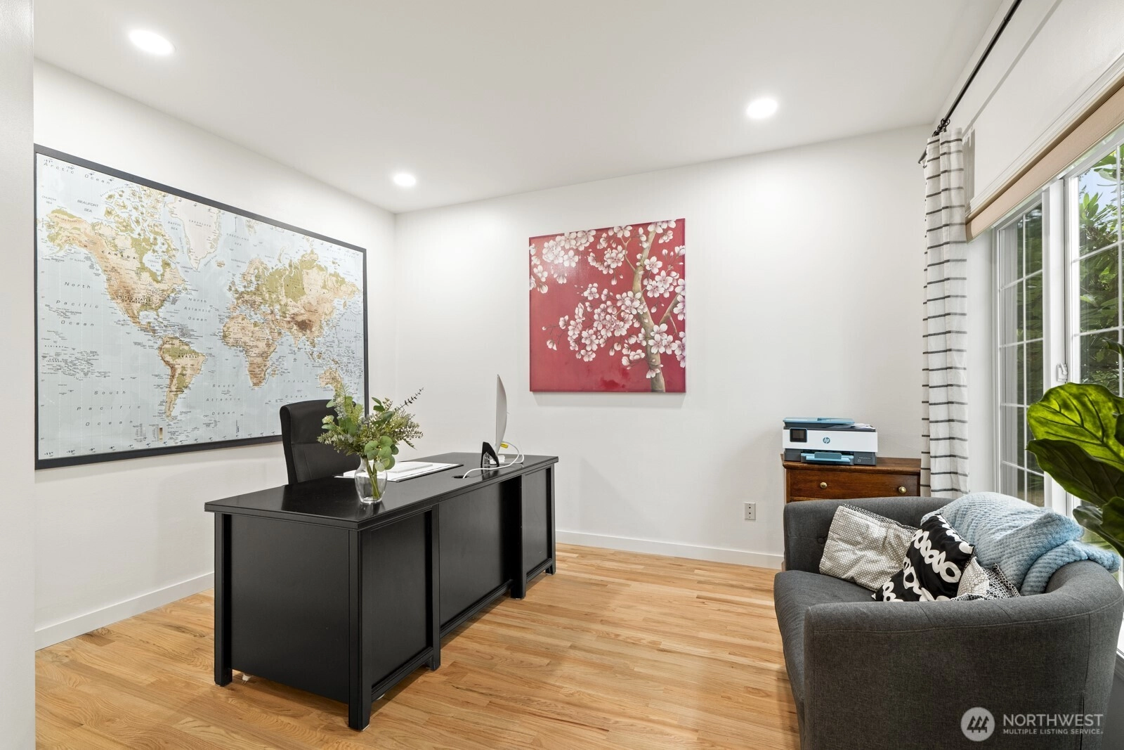 Beautifully updated contemporary home in highly sought-after Lake of the Woods. The ideal floor plan w/4 bedrms, office & bonus rm; hardwood flrs & 9-ft ceilings grace the main floor. Chef’s kitchen w/marble counters, sleek island, walk-in pantry, & Butler’s pantry. Lavish primary suite w/vaulted ceiling, custom wood-accent wall, fireplace & new spa-like bath. Updated hall & powder baths. Private, fully fenced backyard, entertain year-round on the expansive covered deck w/skylights, recessed lighting & heaters w/a serene greenbelt backdrop. Newer 50 yr roof & H2O. Excl Lkw Schls. Turnkey gem in a premier Woodinville enclave!
