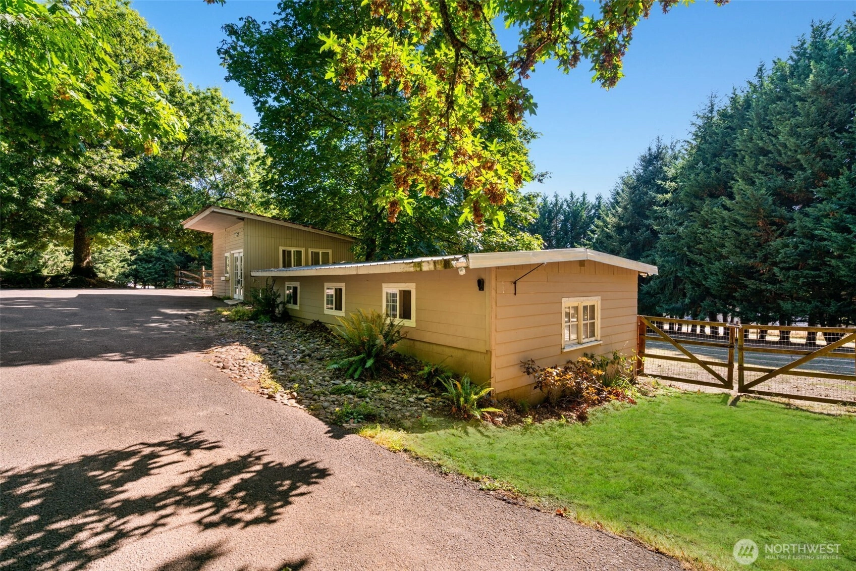 Location, location, location! Nearly 6 acres of privacy in Ridgefield, WA with territorial, and Mt. St. Helens views. A gated, paved driveway leads to this 4-bed, 2-bath daylight ranch featuring an open floor plan, spacious living areas, floor-to-ceiling windows, a remodeled kitchen with granite counters, striking stainless steel appliances, and custom cabinetry, plus a durable interlocking roof. Perfect for farm animals with fenced pastures, raised-bed gardens, and outbuildings including a barn and workshop, along with storybook flagstone walkways and new deck. Just minutes to I-5 and under 30 minutes to PDX—country living with city convenience.