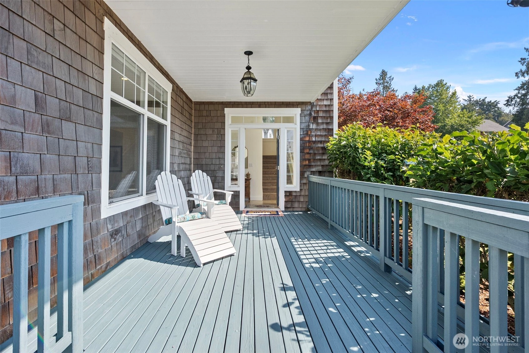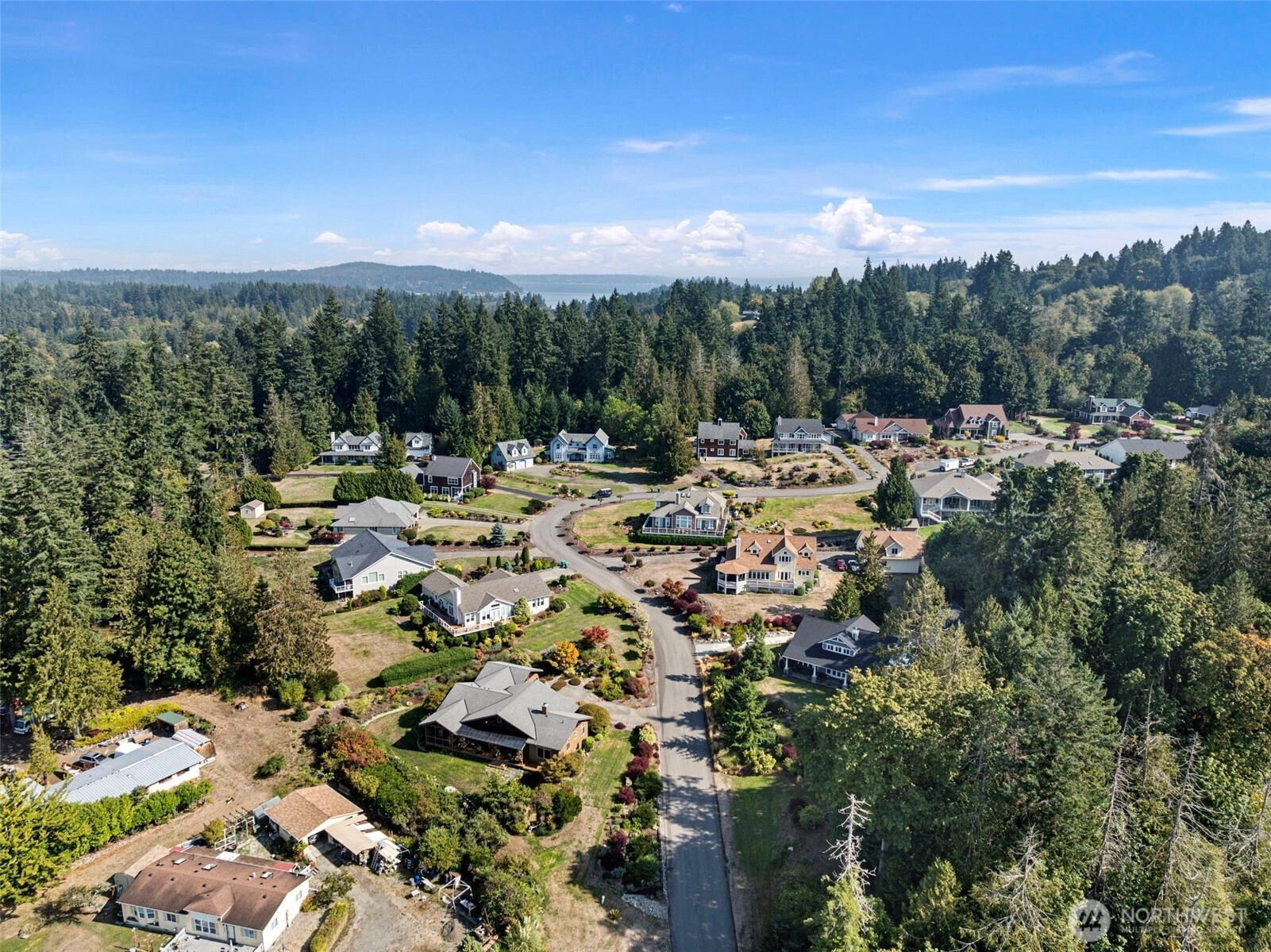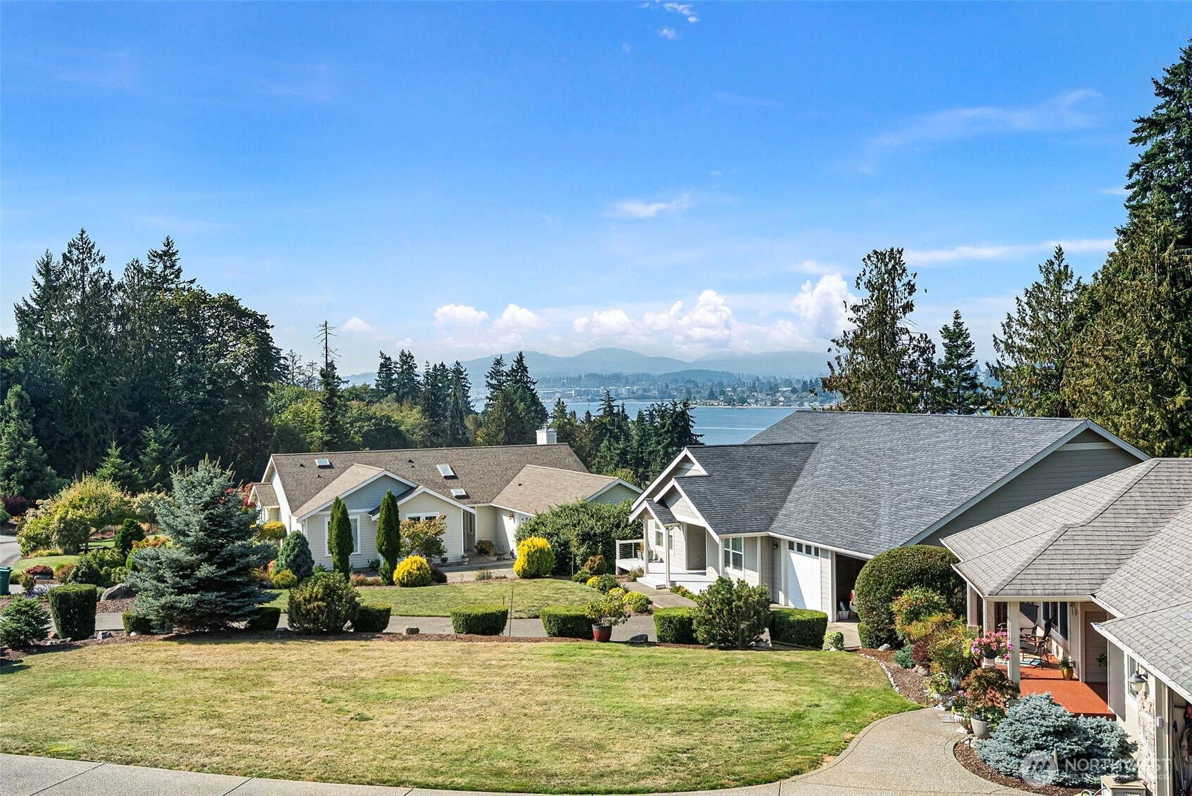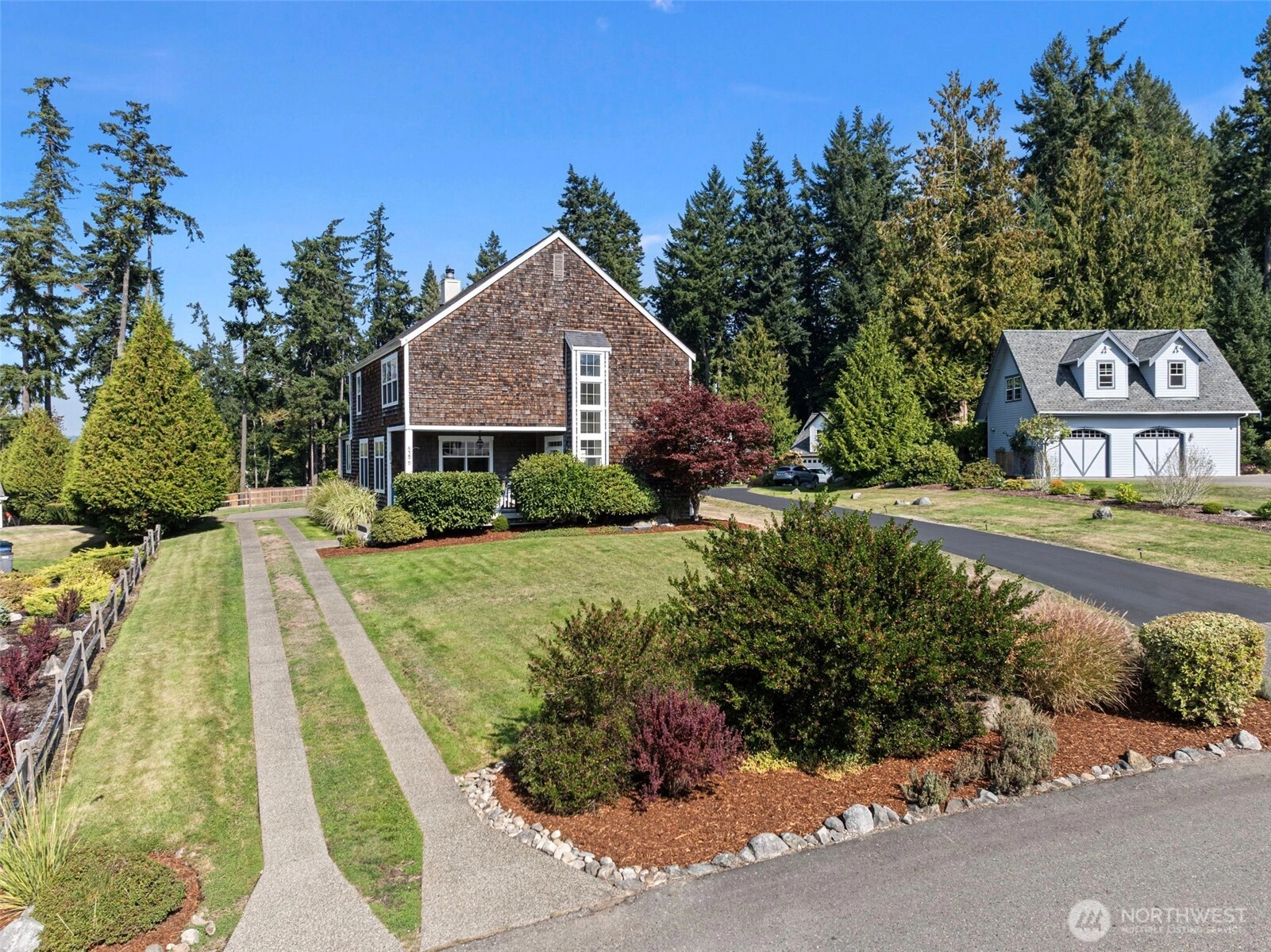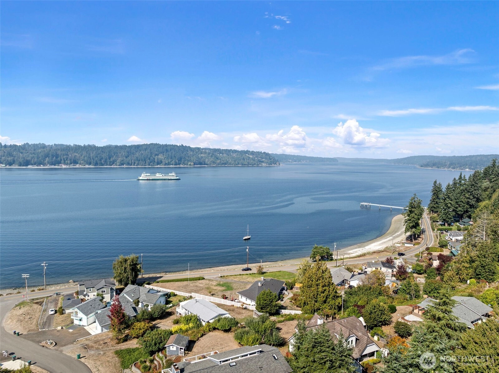 Breathe in the salt air & watch ferries from the porch of your timeless Cape Cod retreat! Overlooking both the mountains & Sound, this home blends comfort & charm. Light-filled interiors showcase expansive windows, soaring 9–11' ceilings & tile floors. Gather in the sunken living rm w/water views, built-ins & cozy propane FP. Stylish shaker cabinets, granite counters & breakfast nook overlooking the courtyard, backyard & detached garage. Dedicated dining rm, den, storage & half bth complete the main. Upstairs a spacious primary suite: sparkling views of the Sound, 2 walk-in closets & spa-like bath w/jetted tub, double sinks & separate toilet rm. Step outside to take advantage of community beach rights just beyond your door!