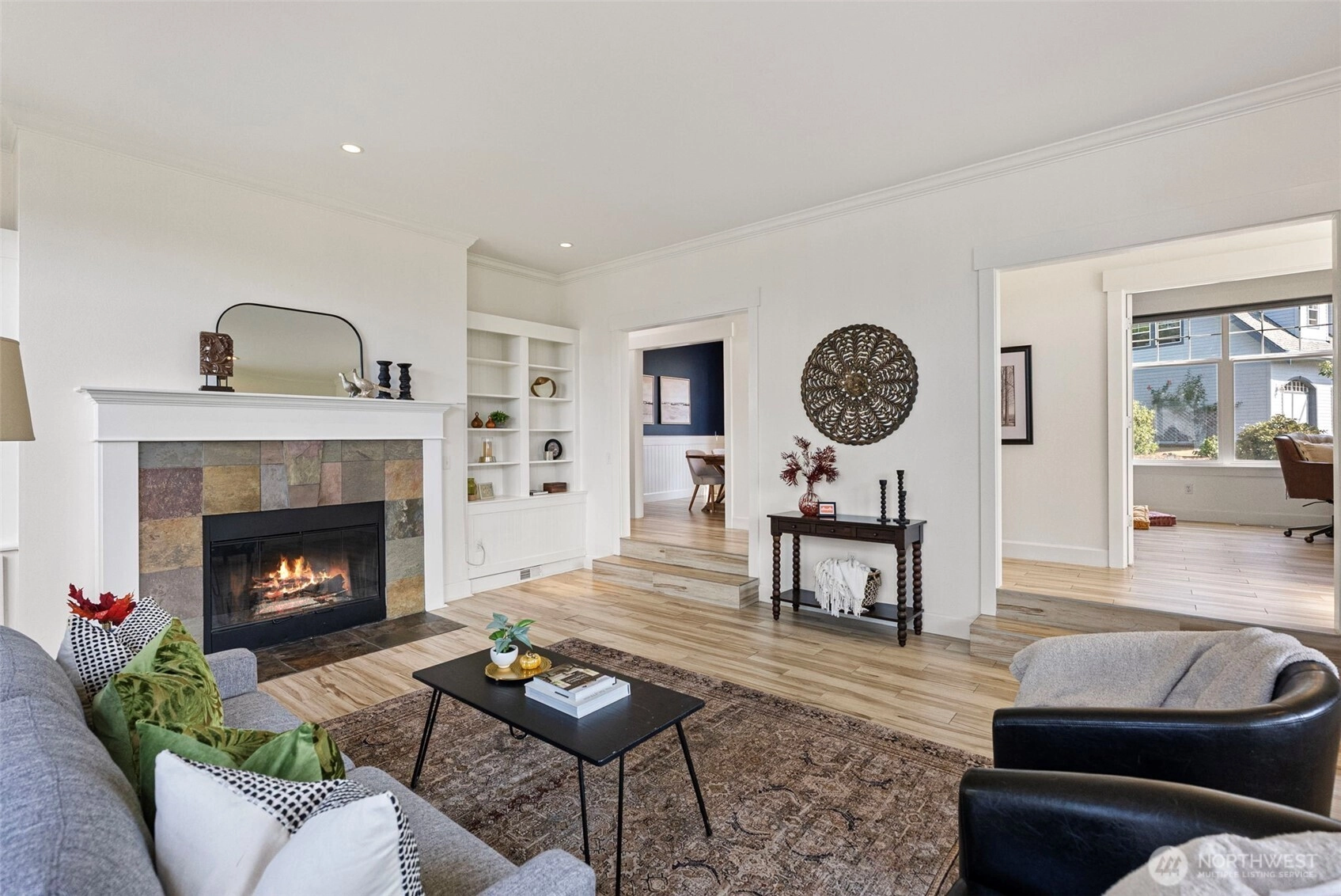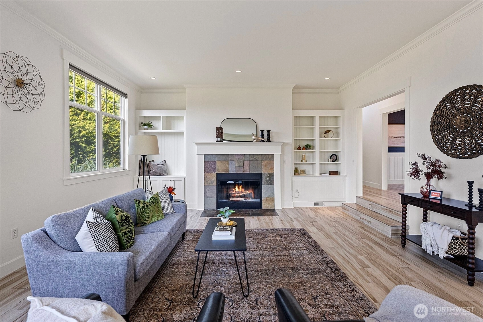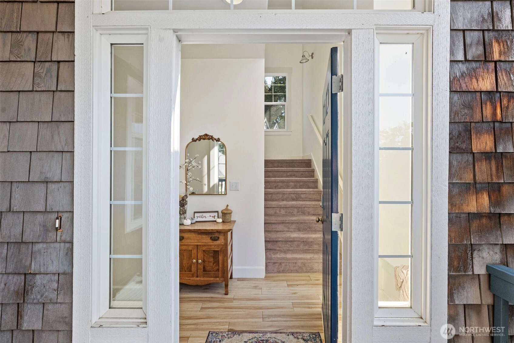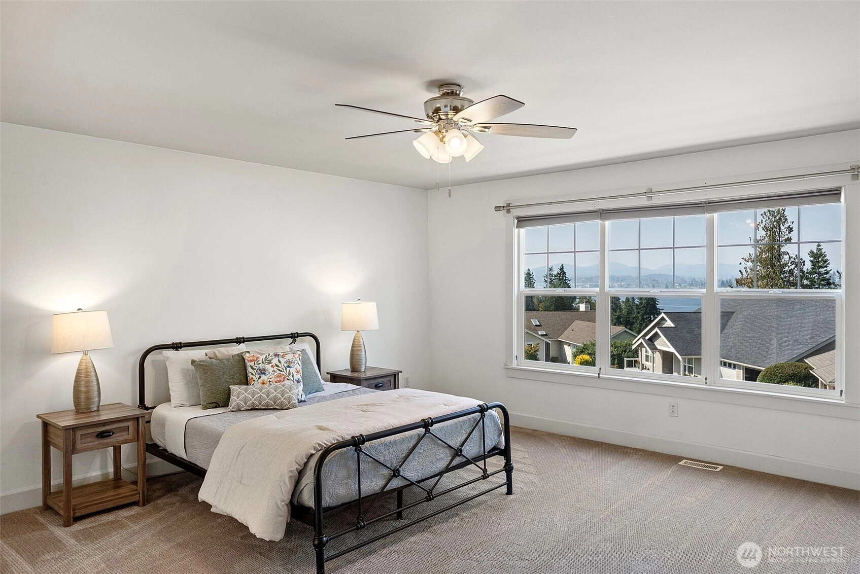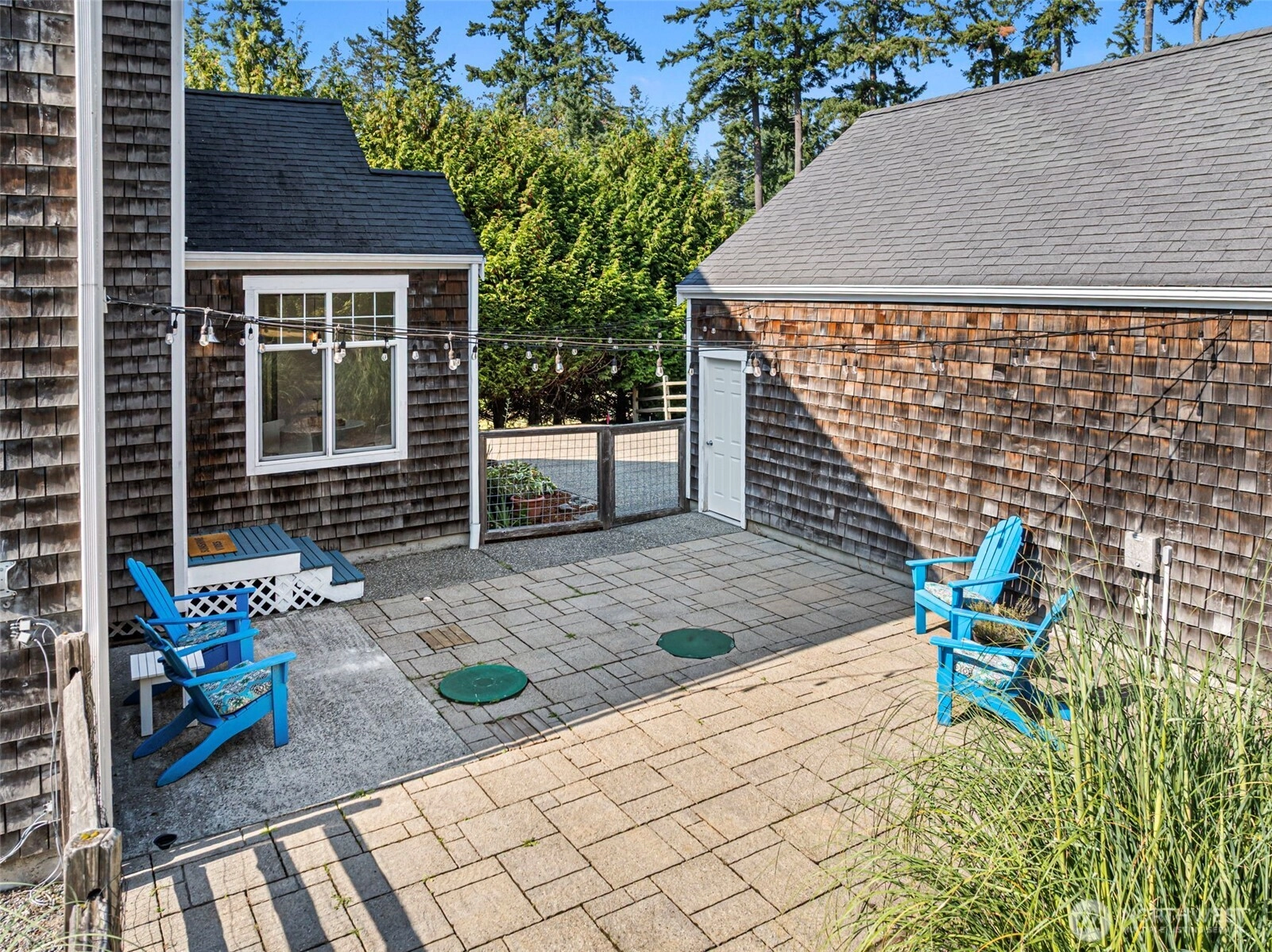 Breathe in the salt air & watch ferries from the porch of your timeless Cape Cod retreat! Overlooking both the mountains & Sound, this home blends comfort & charm. Light-filled interiors showcase expansive windows, soaring 9–11' ceilings & tile floors. Gather in the sunken living rm w/water views, built-ins & cozy propane FP. Stylish shaker cabinets, granite counters & breakfast nook overlooking the courtyard, backyard & detached garage. Dedicated dining rm, den, storage & half bth complete the main. Upstairs a spacious primary suite: sparkling views of the Sound, 2 walk-in closets & spa-like bath w/jetted tub, double sinks & separate toilet rm. Step outside to take advantage of community beach rights just beyond your door!