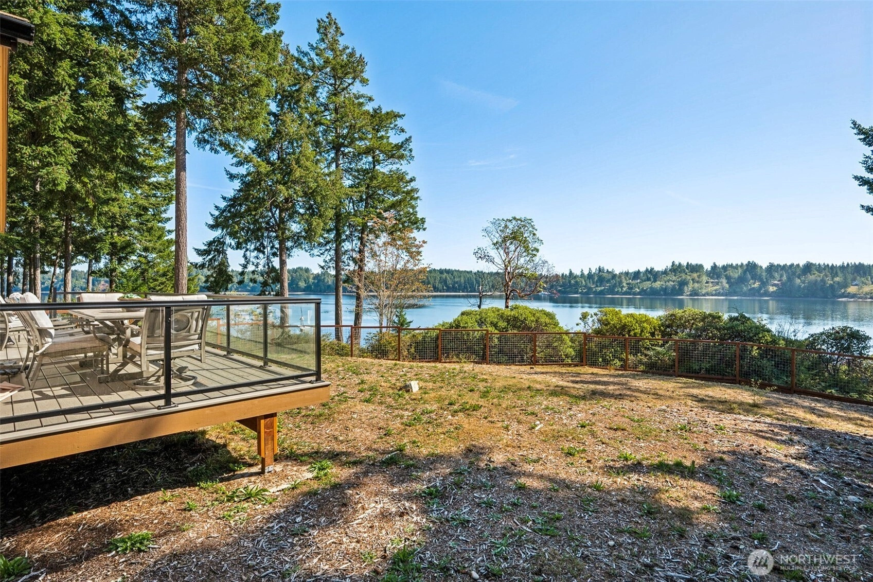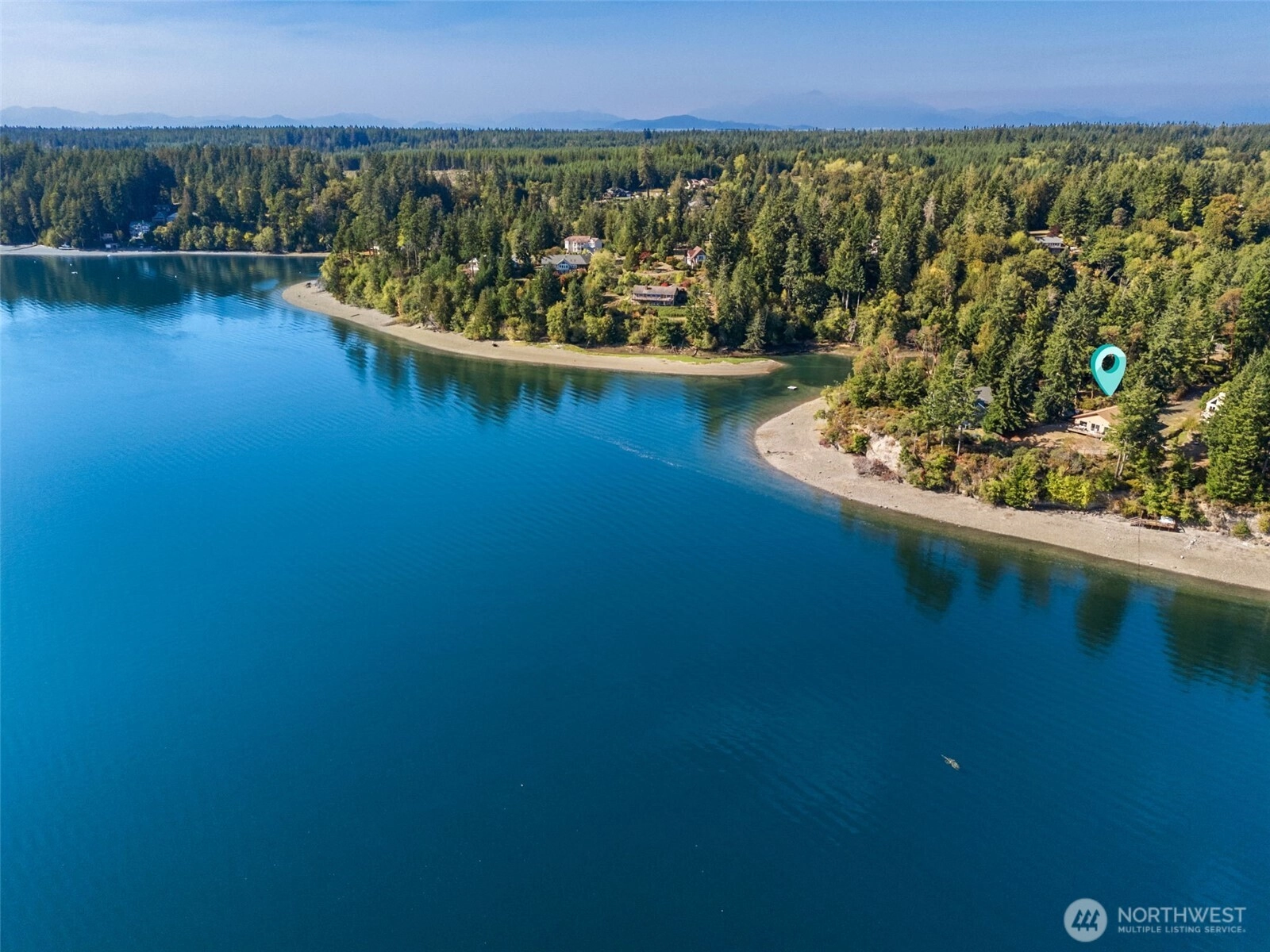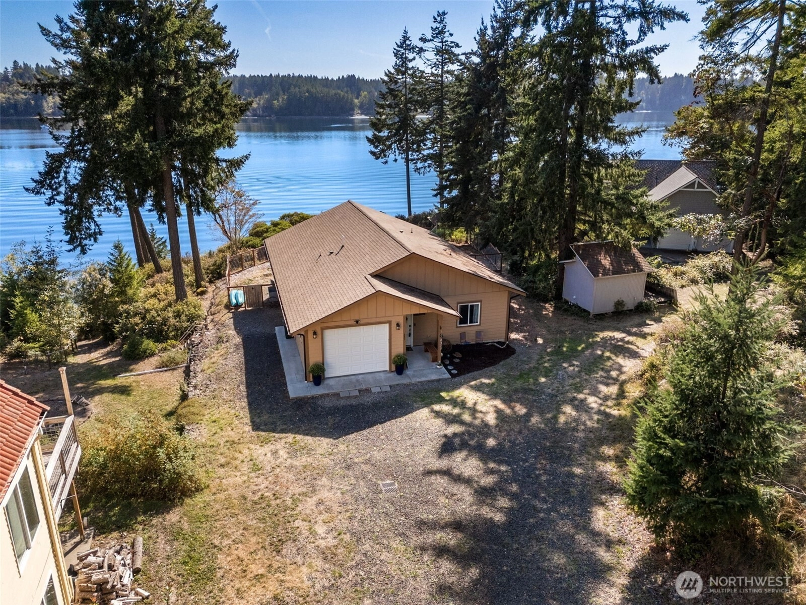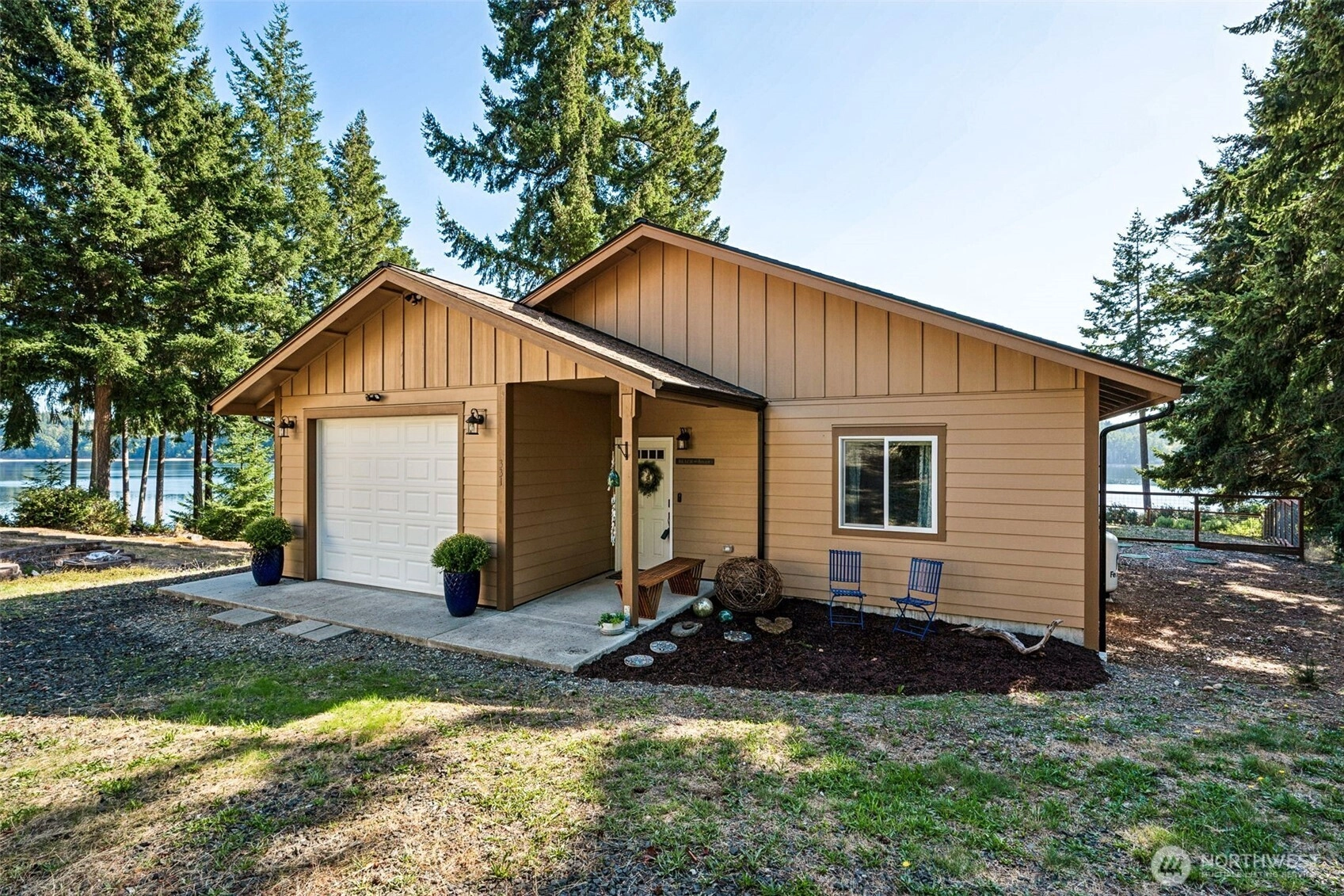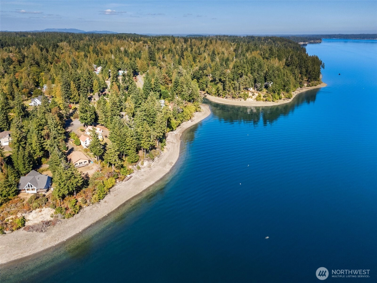 Puget Sound Waterfront Home, newly built in 2022. INCREDIBLE 180+ degree views & +/- 120 feet of waterfront accessed by easy stairs shared with neighbor. Great-room style living w/ vaulted ceilings, big windows, propane fireplace. Kitchen has SS appliances, solid surface counters, roomy island & sink, is plumbed for propane to range. Primary suite ~ view of the water & attached bath nicely finished w/tile, radiant floor heat. Second bedroom, office/den space, full bath with radiant floor heat. Plus sized insulated one car garage/utility area. On demand hot water system. Covered front entry. Large deck on water side. Mini split heat pump cools in summer too! Quiet, friendly community w/ neighboring high end homes & community shared beach.