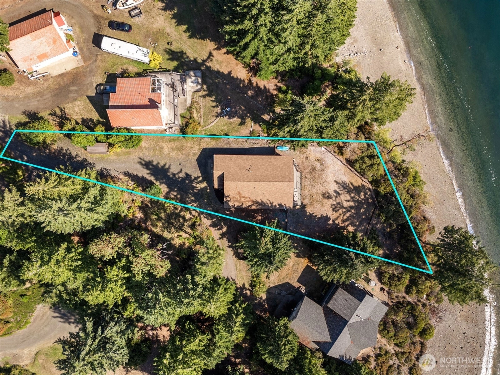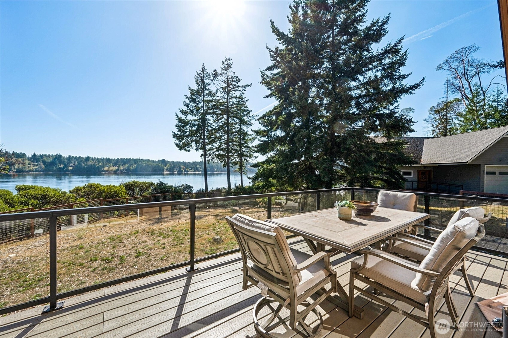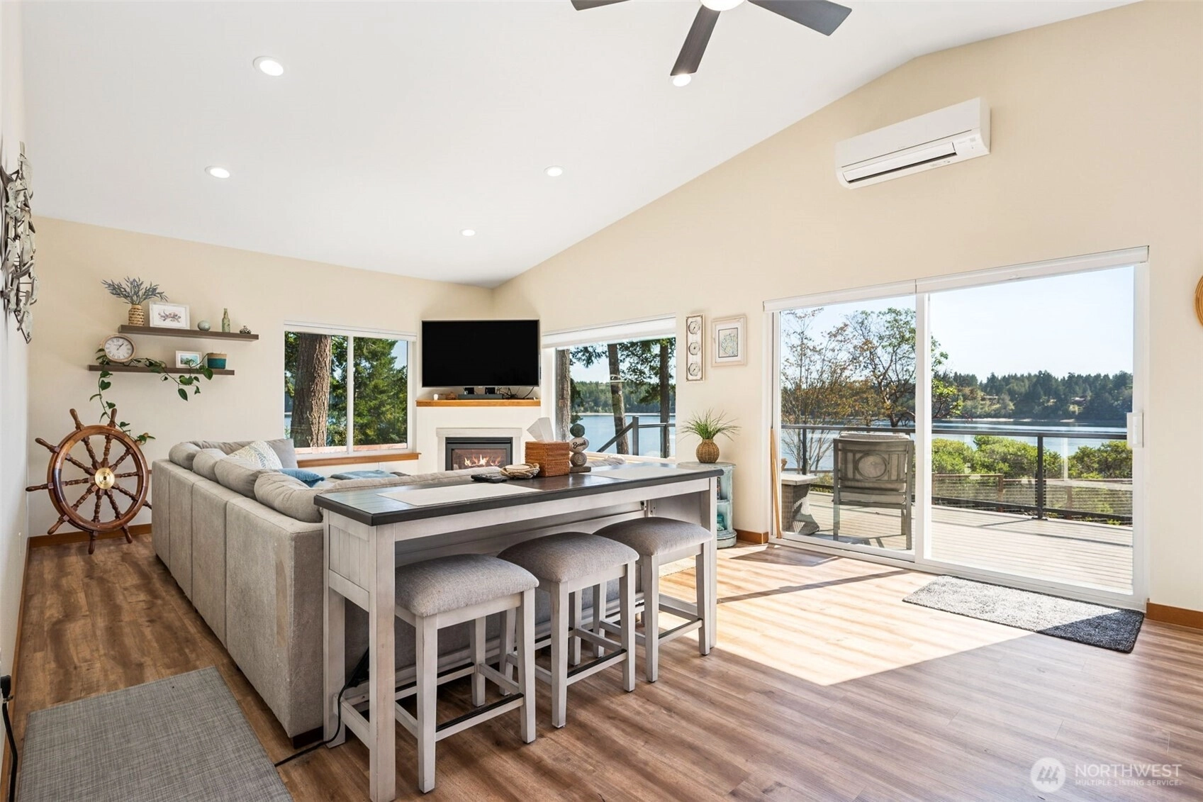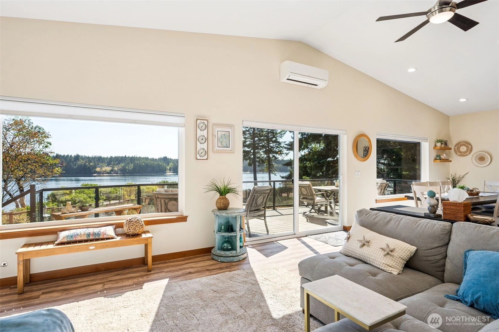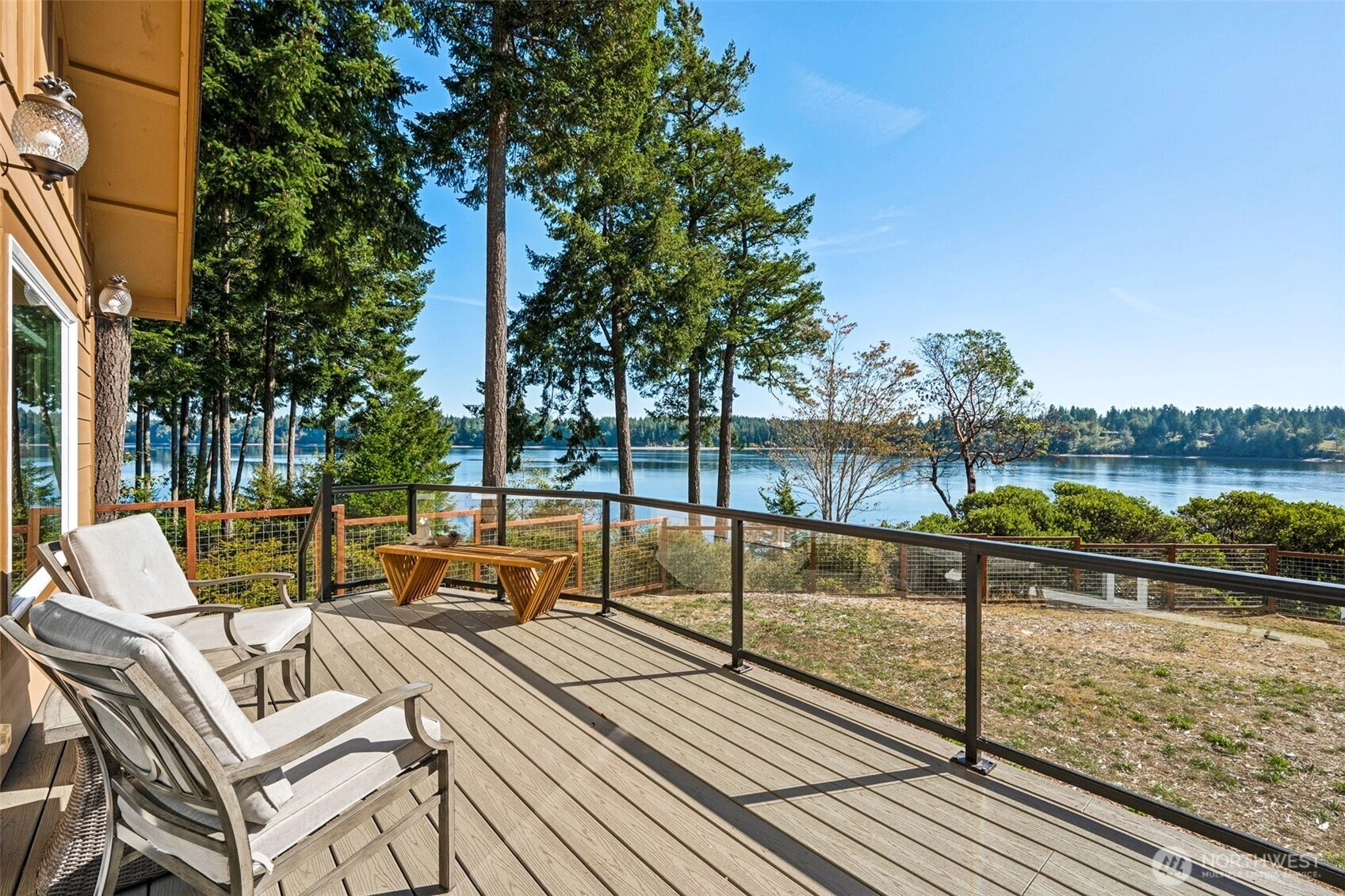 Puget Sound Waterfront Home, newly built in 2022. INCREDIBLE 180+ degree views & +/- 120 feet of waterfront accessed by easy stairs shared with neighbor. Great-room style living w/ vaulted ceilings, big windows, propane fireplace. Kitchen has SS appliances, solid surface counters, roomy island & sink, is plumbed for propane to range. Primary suite ~ view of the water & attached bath nicely finished w/tile, radiant floor heat. Second bedroom, office/den space, full bath with radiant floor heat. Plus sized insulated one car garage/utility area. On demand hot water system. Covered front entry. Large deck on water side. Mini split heat pump cools in summer too! Quiet, friendly community w/ neighboring high end homes & community shared beach.