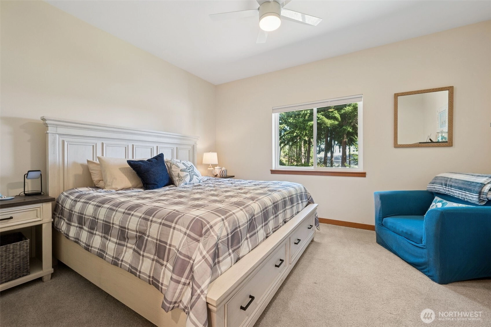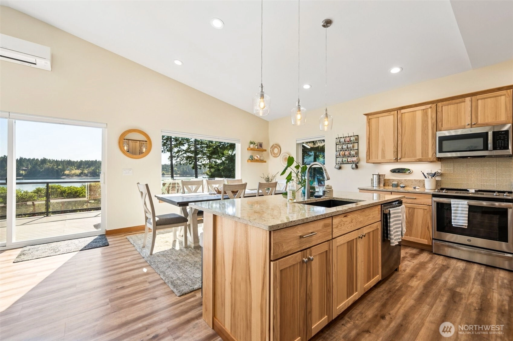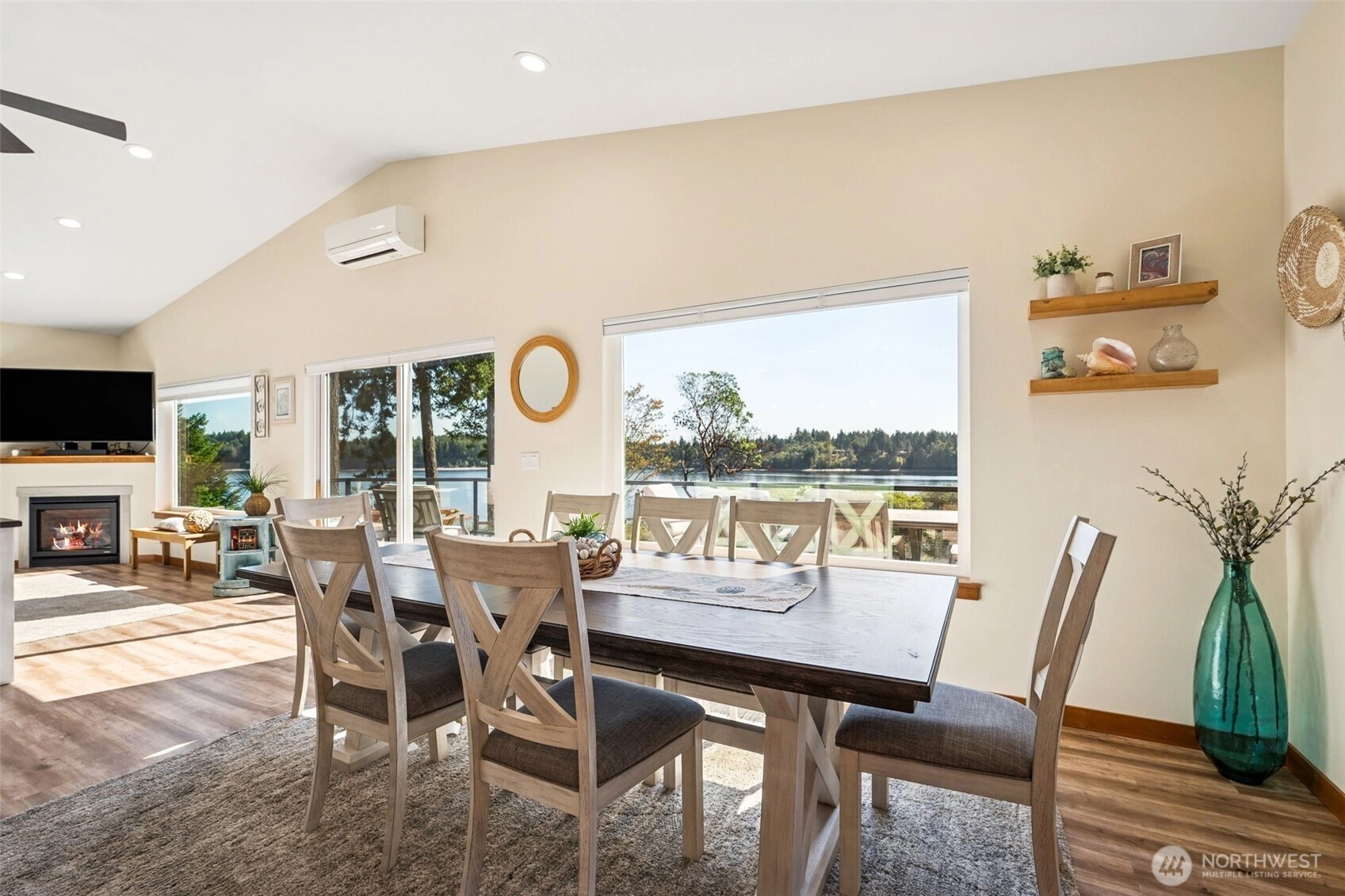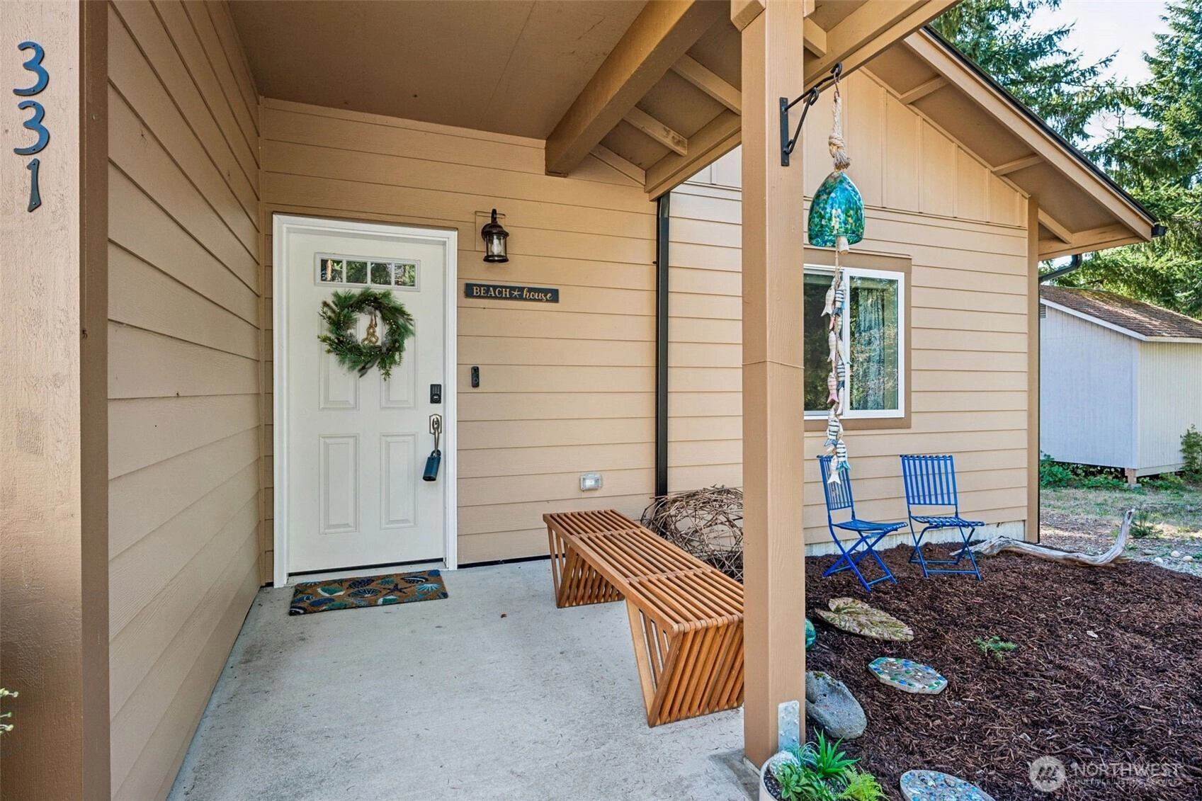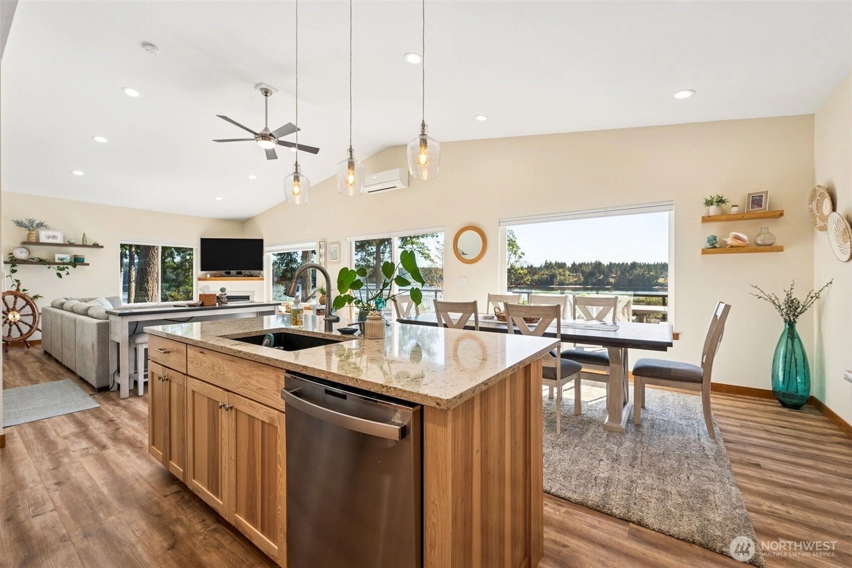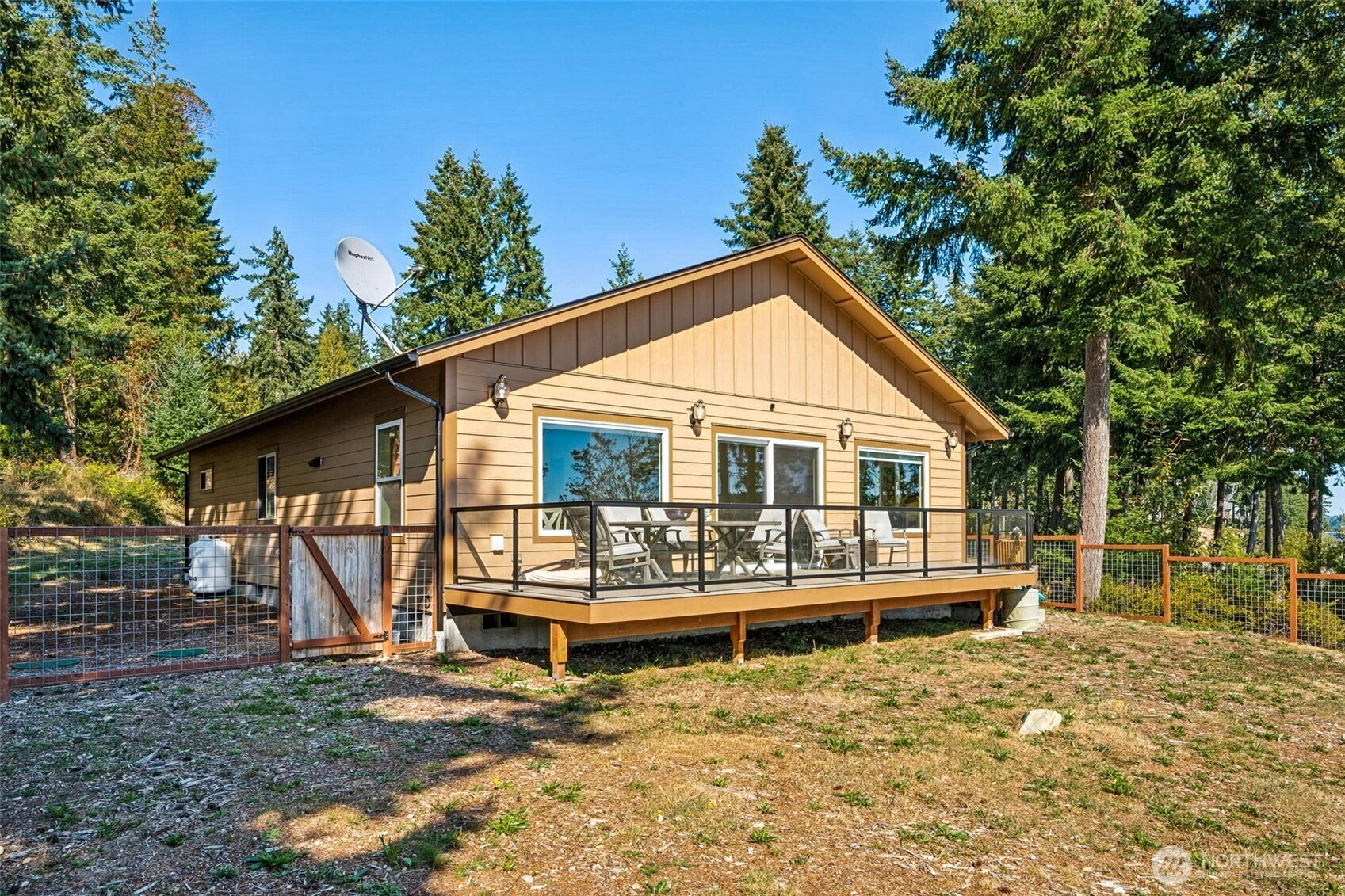 Puget Sound Waterfront Home, newly built in 2022. INCREDIBLE 180+ degree views & +/- 120 feet of waterfront accessed by easy stairs shared with neighbor. Great-room style living w/ vaulted ceilings, big windows, propane fireplace. Kitchen has SS appliances, solid surface counters, roomy island & sink, is plumbed for propane to range. Primary suite ~ view of the water & attached bath nicely finished w/tile, radiant floor heat. Second bedroom, office/den space, full bath with radiant floor heat. Plus sized insulated one car garage/utility area. On demand hot water system. Covered front entry. Large deck on water side. Mini split heat pump cools in summer too! Quiet, friendly community w/ neighboring high end homes & community shared beach.