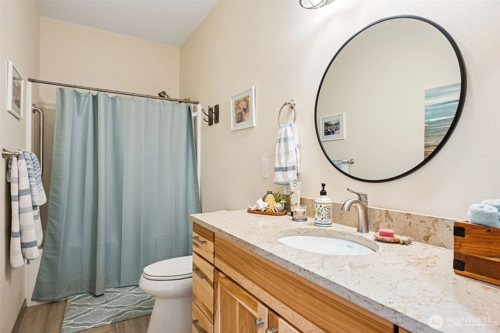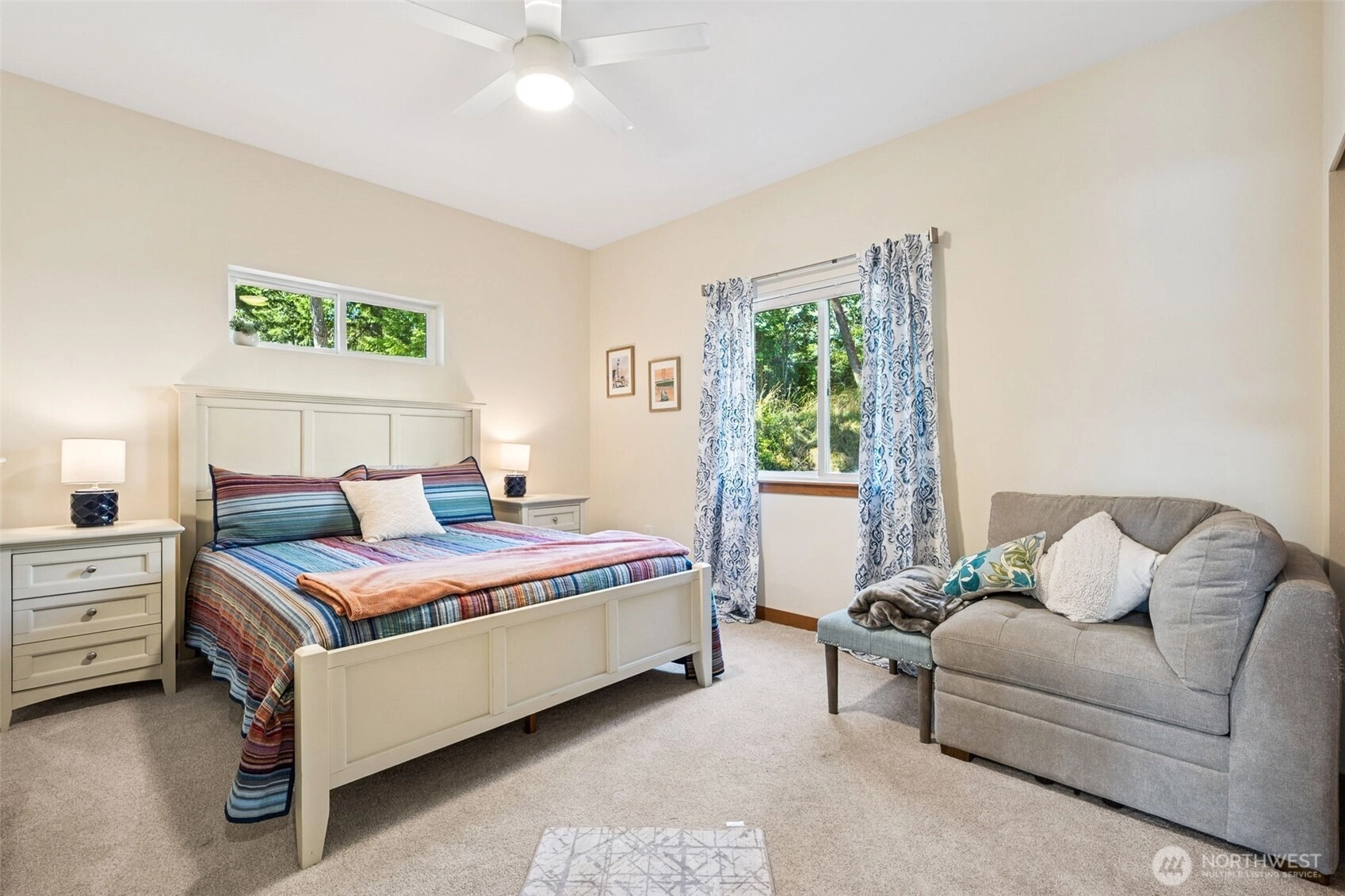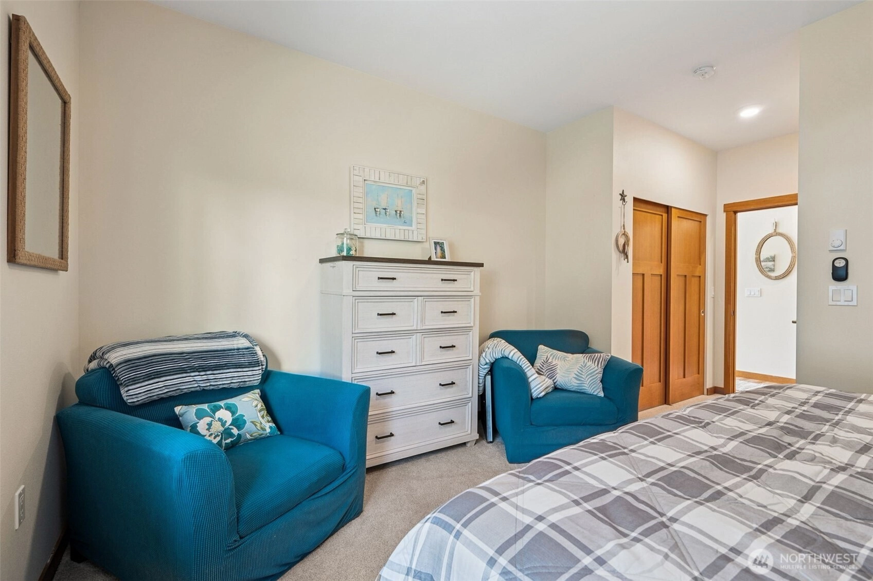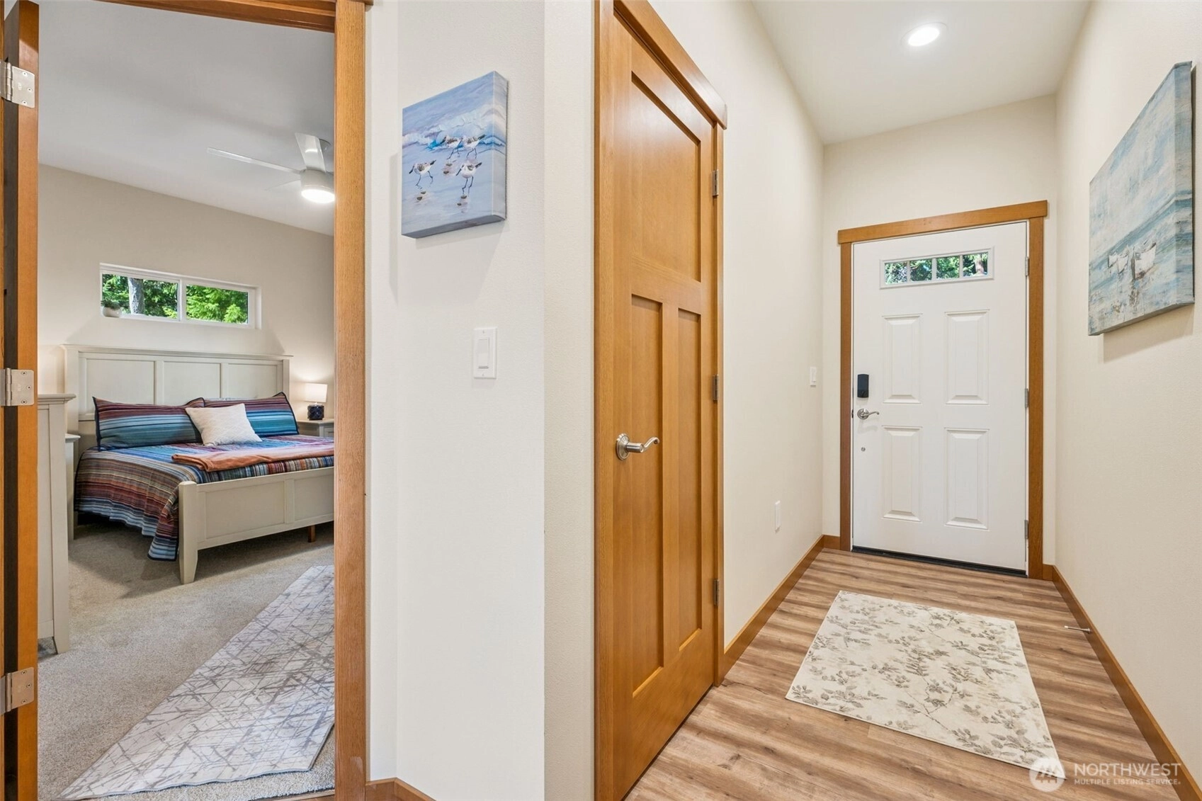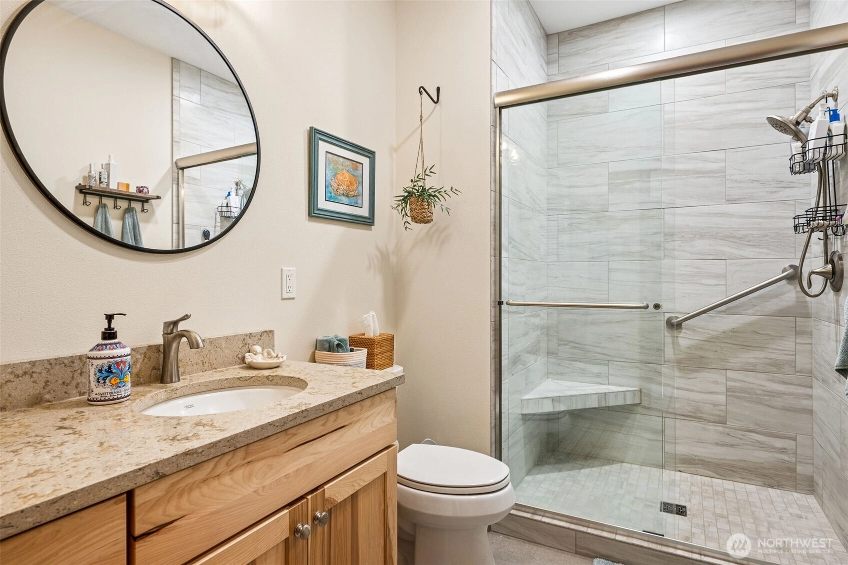 Puget Sound Waterfront Home, newly built in 2022. INCREDIBLE 180+ degree views & +/- 120 feet of waterfront accessed by easy stairs shared with neighbor. Great-room style living w/ vaulted ceilings, big windows, propane fireplace. Kitchen has SS appliances, solid surface counters, roomy island & sink, is plumbed for propane to range. Primary suite ~ view of the water & attached bath nicely finished w/tile, radiant floor heat. Second bedroom, office/den space, full bath with radiant floor heat. Plus sized insulated one car garage/utility area. On demand hot water system. Covered front entry. Large deck on water side. Mini split heat pump cools in summer too! Quiet, friendly community w/ neighboring high end homes & community shared beach.