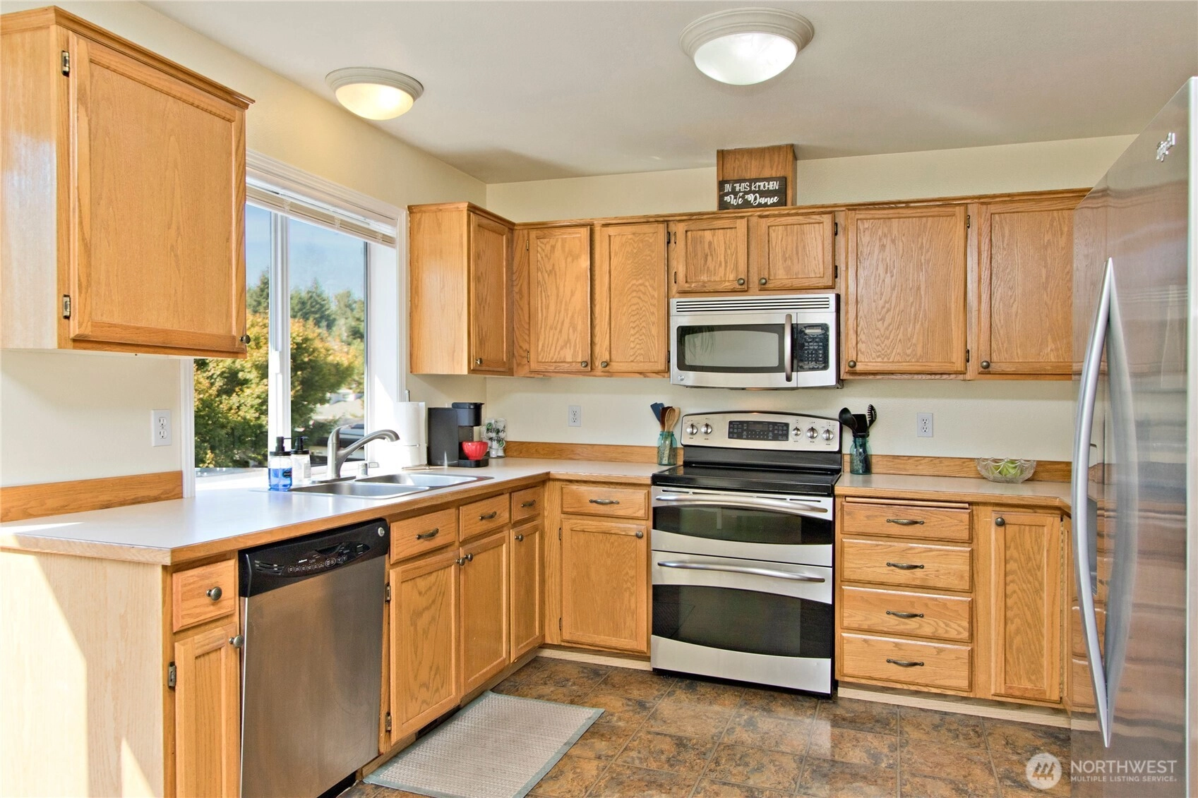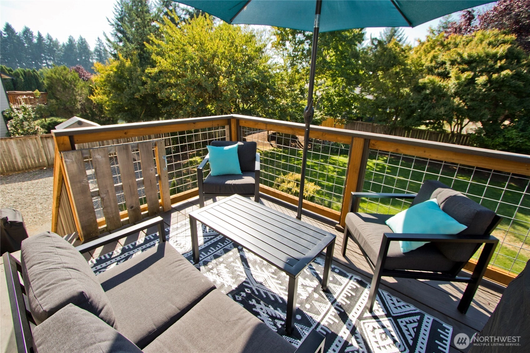 Beautiful home in the sought-after Cascade Trails neighborhood in Buckley/Bonney Lake, not your traditional Split level, 4 bedrooms 3 full baths! This home offers a huge entryway with wide angled steps up to the open concept living and dining room offers Vaulted ceilings and fireplace. From the kitchen & breakfast area walk out to a beautiful brand new deck that leads out to your private manicured fenced yard. Large primary bedroom with bathroom and walk in closet, 2 other bedrooms and full bath. Downstairs includes one bedroom a full bath, large family room and flex/office room with separate entrance, perfect for multi-generational living if needed. Plenty of extra parking for RV. New roof 2020 new hot water tank 2022.Home warranty offered