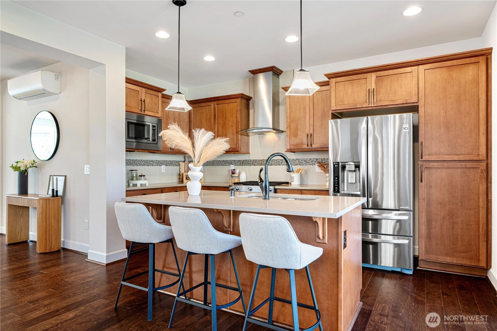 Welcome to a stunning end-unit Issaquah Highlands Brownstone offering space, flexibility & modern comfort. The open main floor features a chef’s kitchen w/large island, SS appliances, dining area, bay window & gas fireplace plus half bath. Upstairs: primary suite w/mountain views and walk-in custom closet, two more bedrooms with custom closets, fresh paint & full bath. The loft can be a 5th bedroom, rec room, or office. Lower level: two car garage, private guest/office suite w/2023 bath upgrade and LVP flooring. Carpet replaced 2023. Garage painted & epoxy finished 2024 w/overhead racks. Additional highlights include ductless heating/AC, low-maintenance exterior, top Issaquah schools, parks/trails, shopping, dining, & easy I-90 access.
