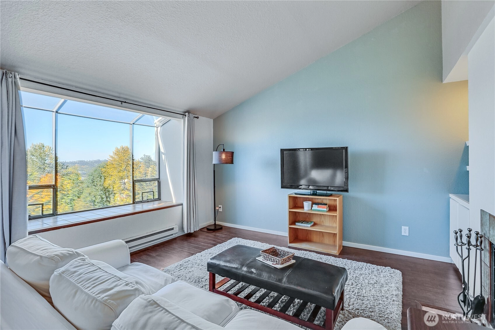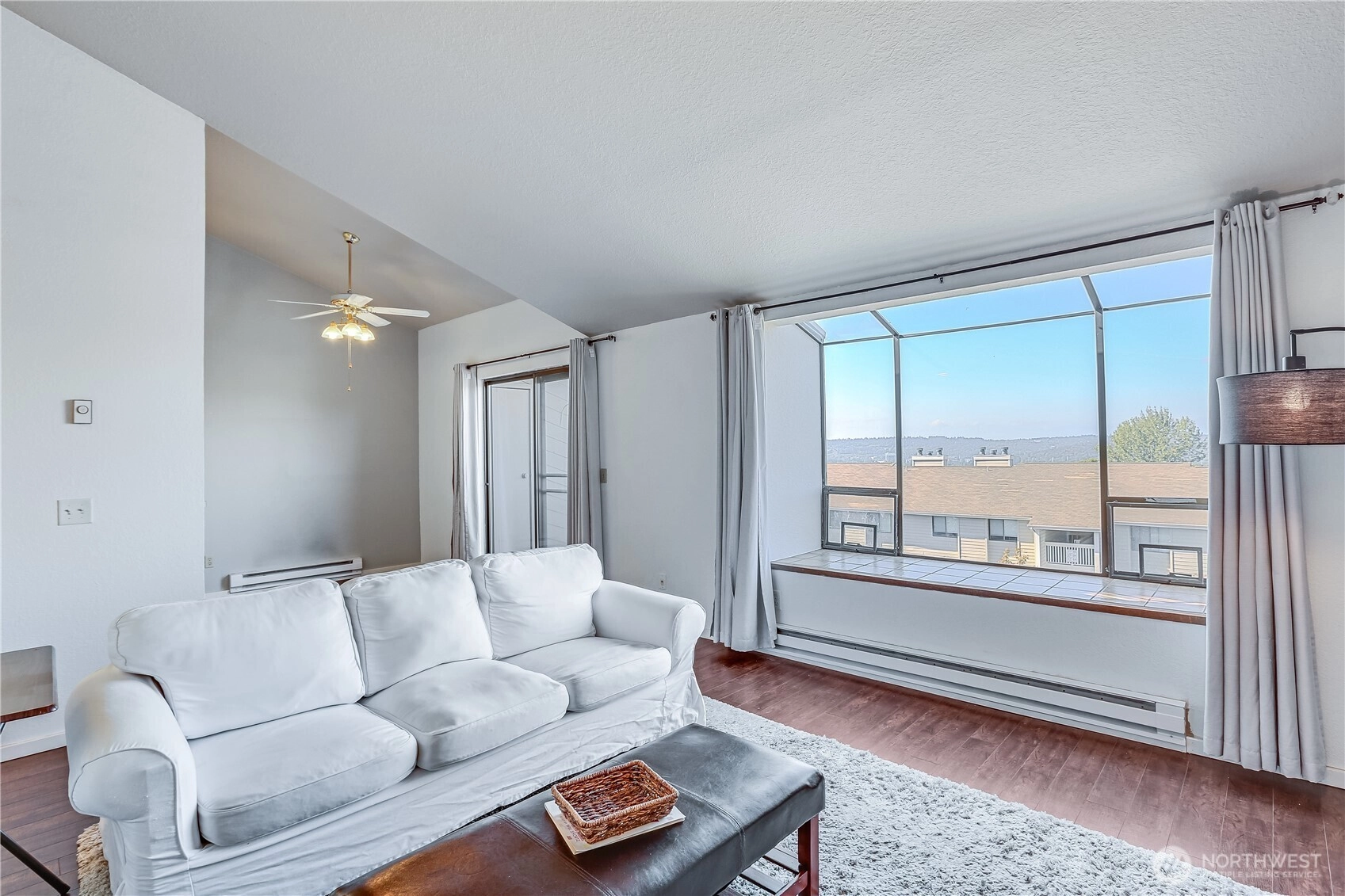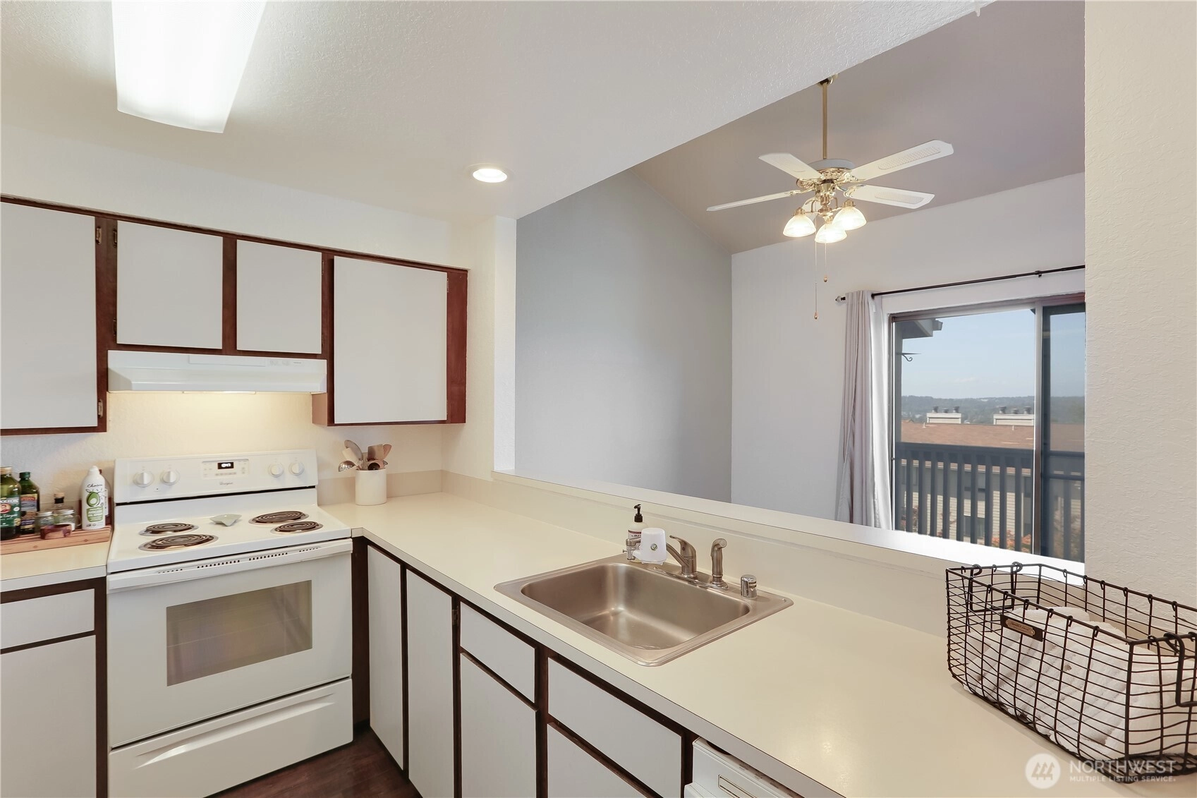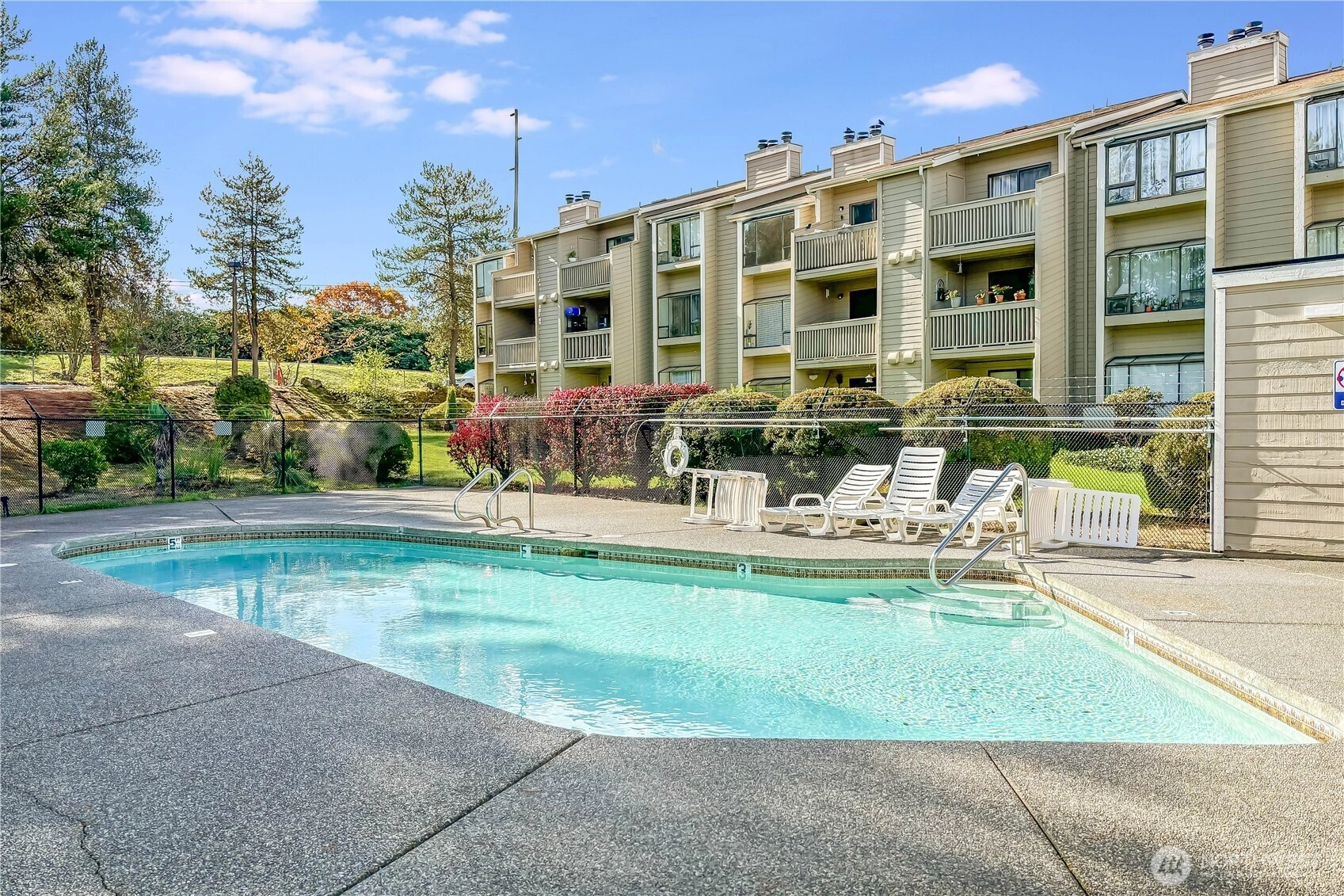 Looking to Own? Spacious top floor condo in well maintained Sunset Ridge community with open green space and outdoor community pool. The west facing living and dining areas have tall ceilings and a ton of natural light that flows all the way through to the kitchen. The primary suite offers two closets and a shared attached bath. Second bedroom provide an ideal space for guests, a home office, or hobbies. Utility closet with stacked washer and dryer for everyday convenience. Enjoy the fresh air off the balcony with sweeping valley, mountains, and sunset views while enjoying a quite morning coffee or unwinding after work. Covered carport + HOA RV parking and easy access to SeaTac airport, I-405/HW167/I-5 freeways, shopping, dining and trails.