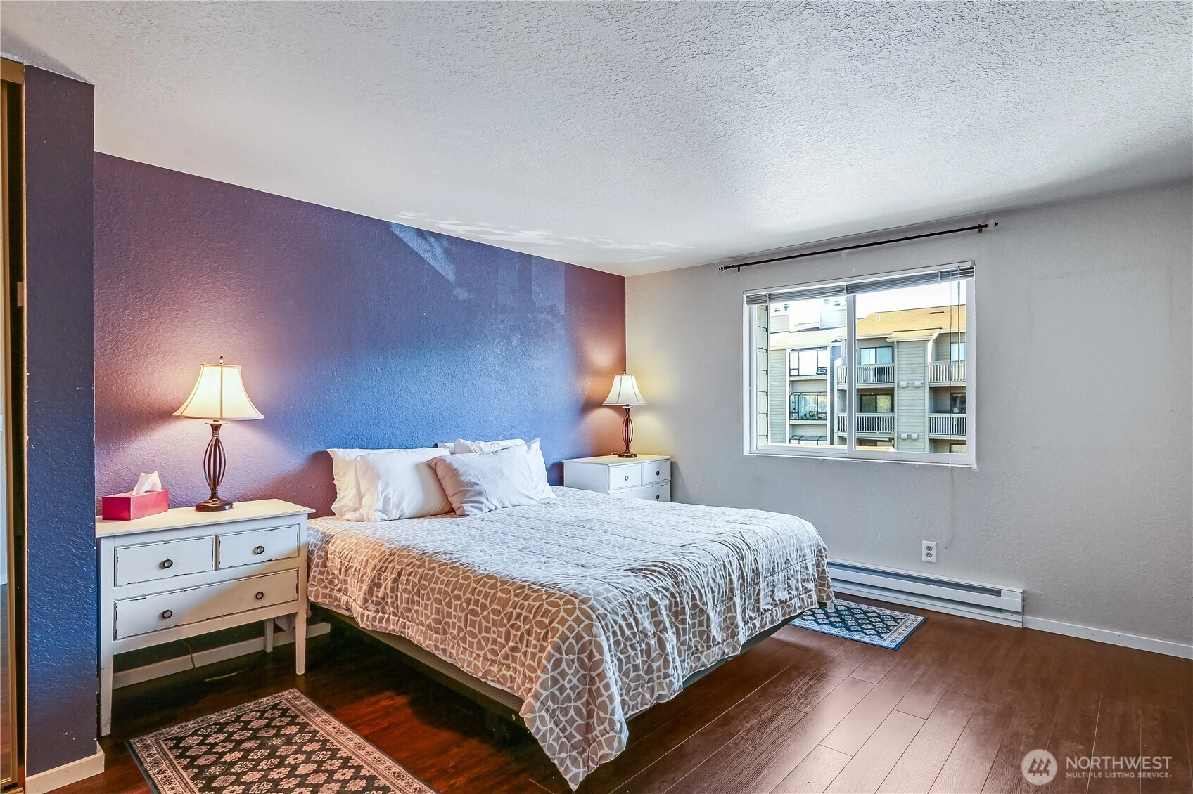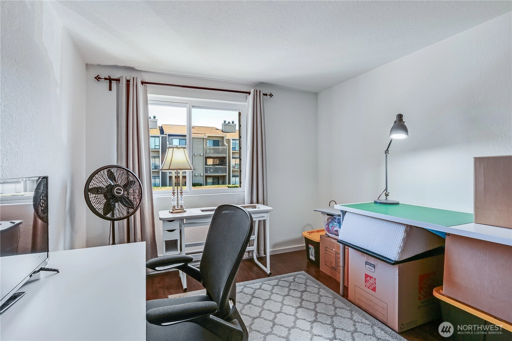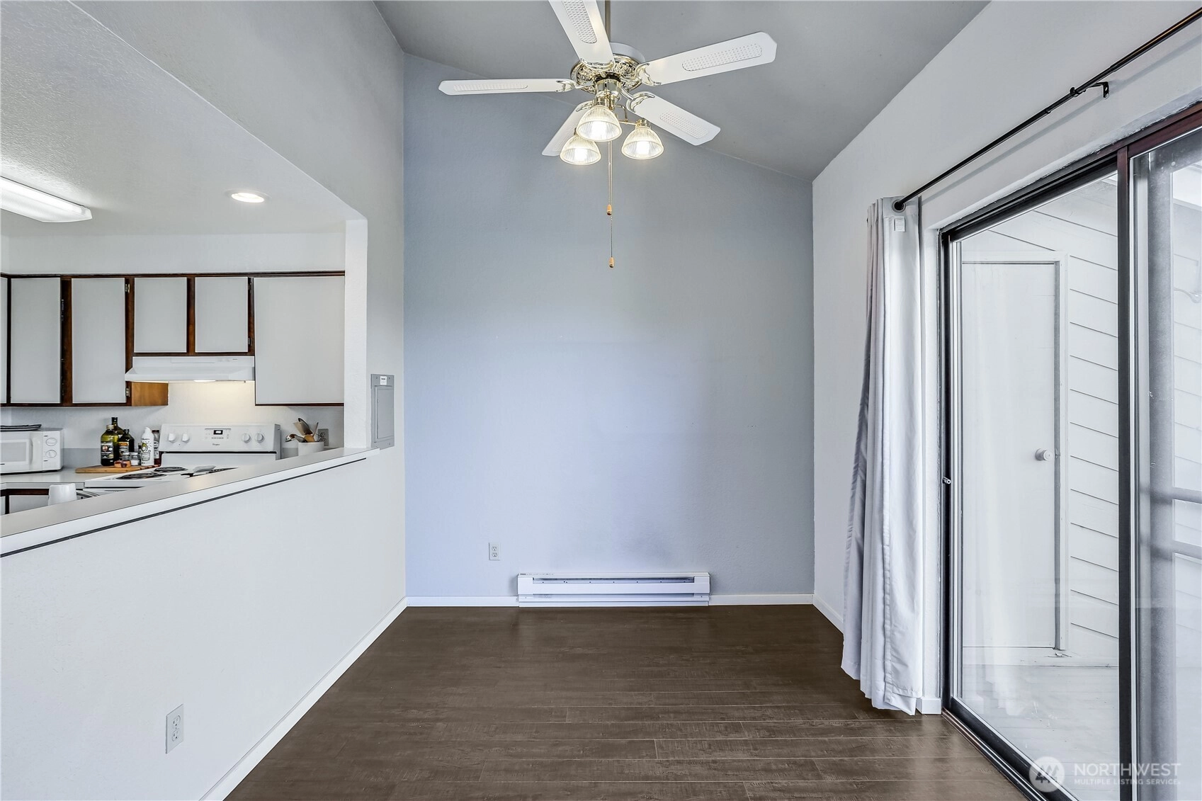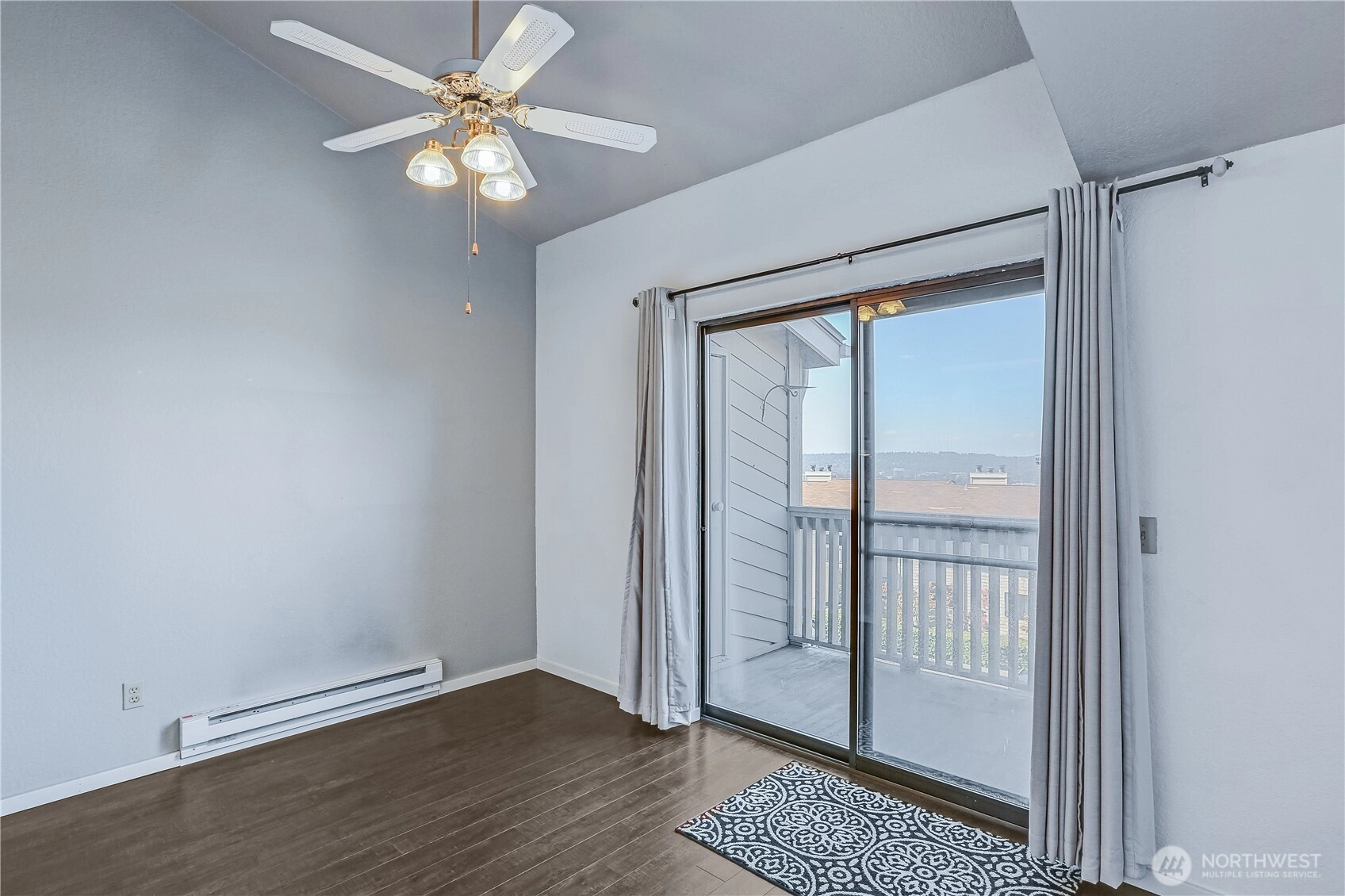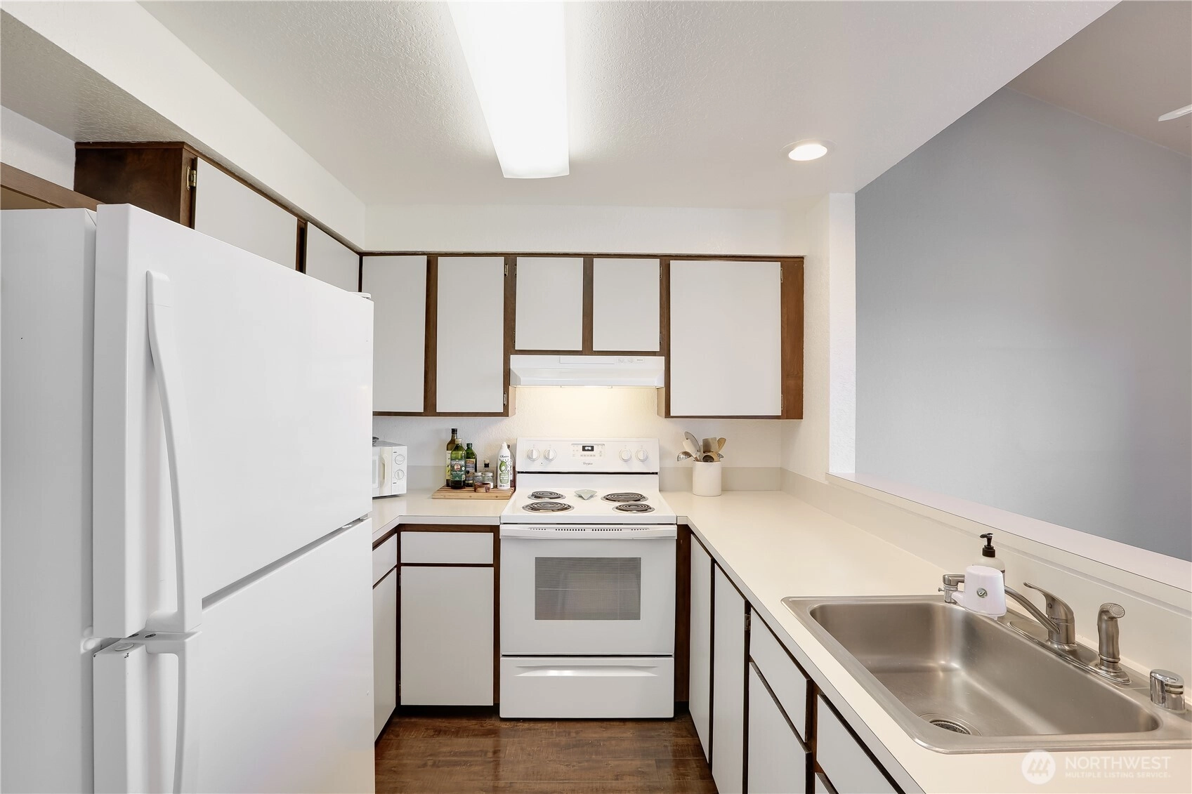 Looking to Own? Spacious top floor condo in well maintained Sunset Ridge community with open green space and outdoor community pool. The west facing living and dining areas have tall ceilings and a ton of natural light that flows all the way through to the kitchen. The primary suite offers two closets and a shared attached bath. Second bedroom provide an ideal space for guests, a home office, or hobbies. Utility closet with stacked washer and dryer for everyday convenience. Enjoy the fresh air off the balcony with sweeping valley, mountains, and sunset views while enjoying a quite morning coffee or unwinding after work. Covered carport + HOA RV parking and easy access to SeaTac airport, I-405/HW167/I-5 freeways, shopping, dining and trails.