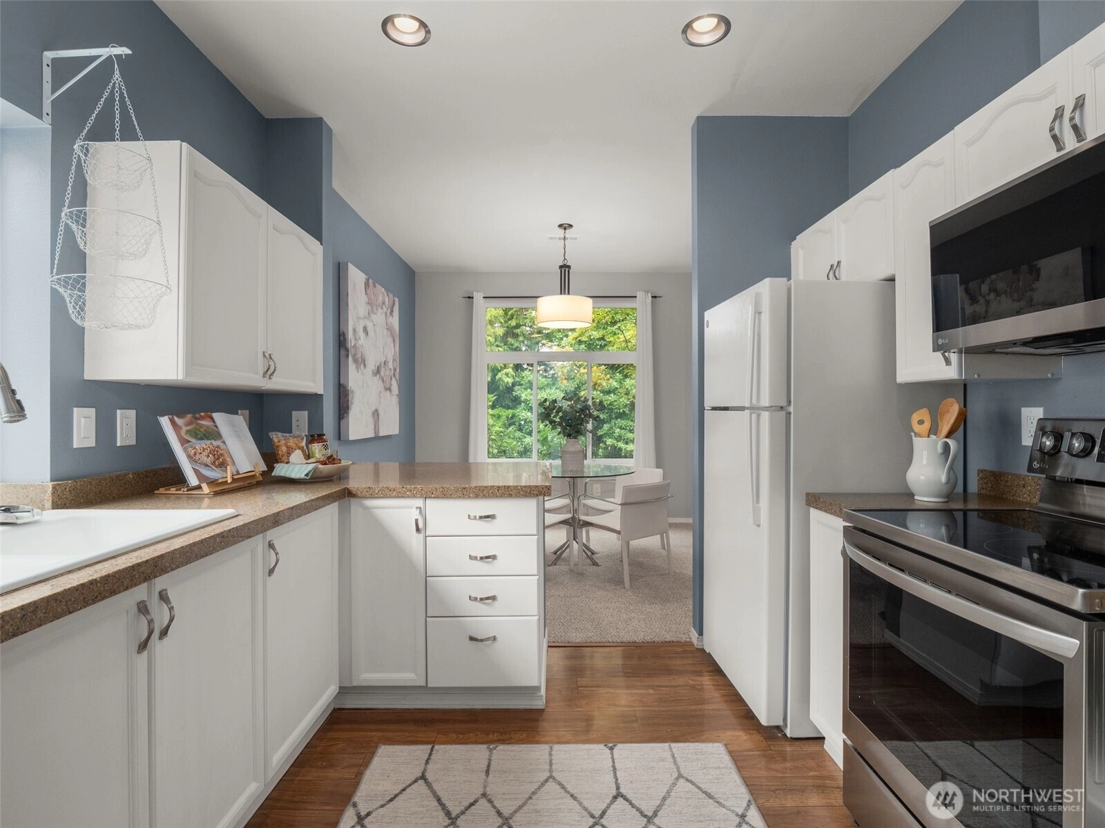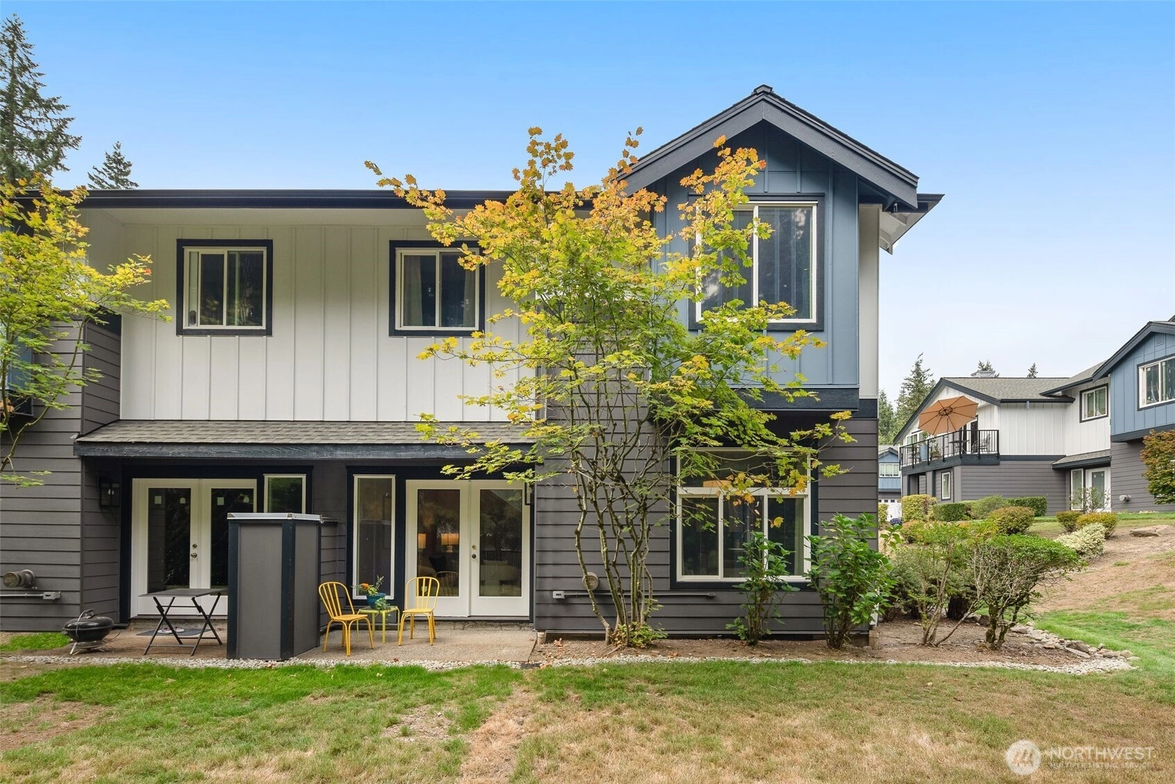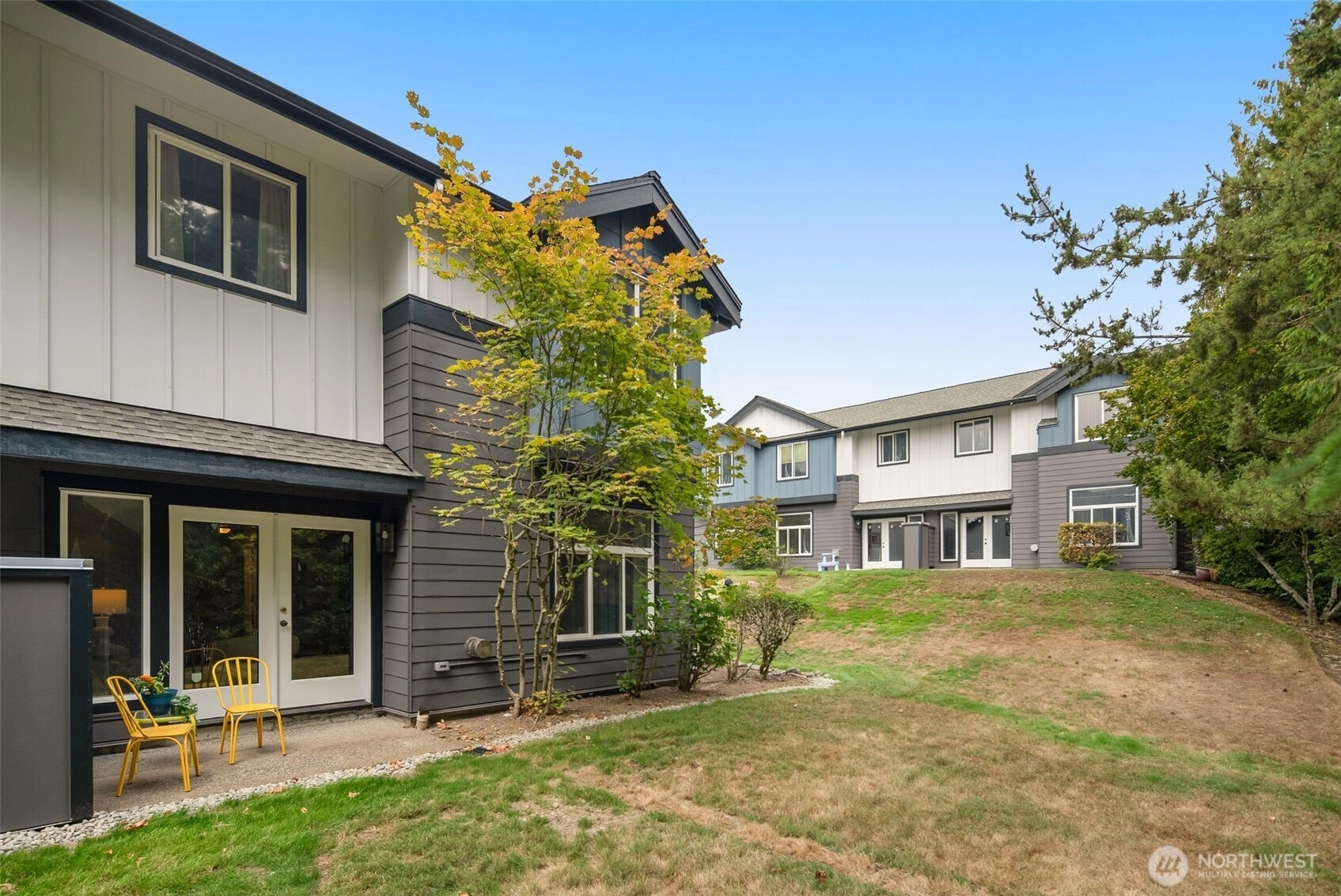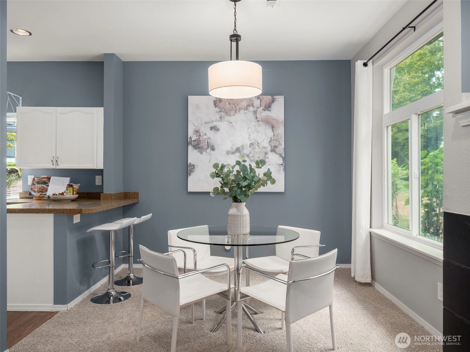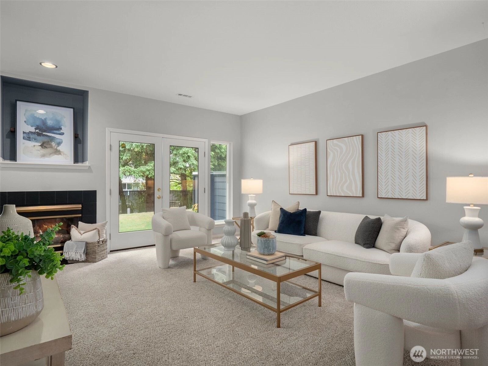 Rare find in west Bothell: stylish & sunny end unit w spacious floorplan. Townhome-style condo has generous living room w gas fireplace & french doors opening out to patio + greenspace. Open kitchen design w peninsula island lends itself to dining area w new light fixture. Upstairs offers two suites! Primary has double closets, and brand new primary bathroom just renovated. Second suite has its own full bath attached. Upgrades incl brand new carpet, designer paint colors, closet organizers, cat6 tech wiring, newer fridge & range. Full laundry room, guest powder bath, and amazingly clean 2-car attached garage. Super convenient location: mins to 405, Bothell-Everett Hwy, or backroute to Kenmore, Lk Forest Pk, or Alderwood. Move in ready!