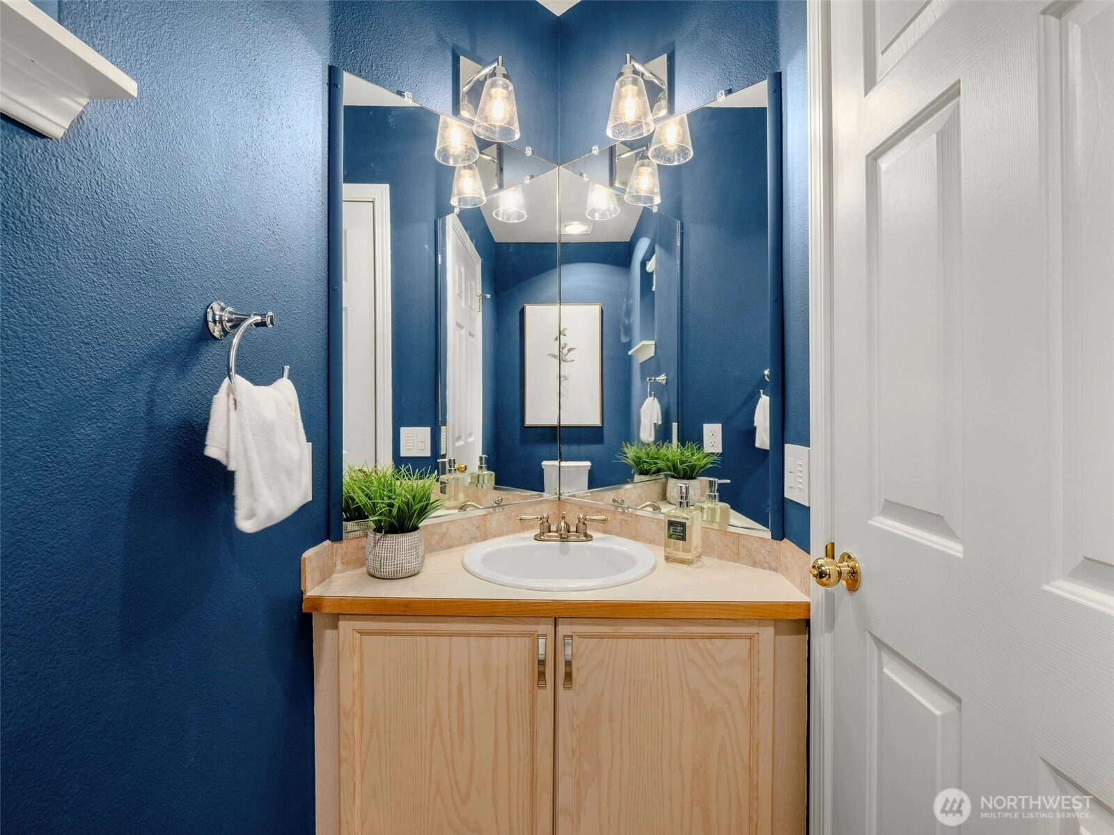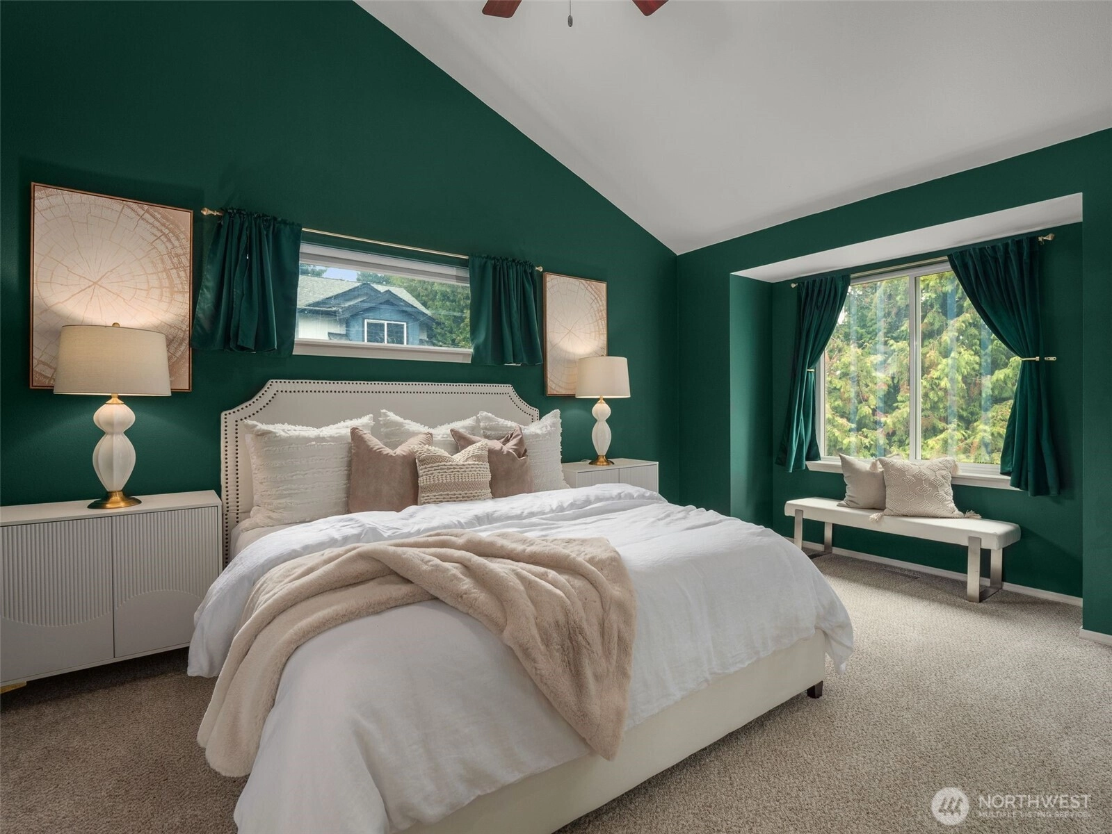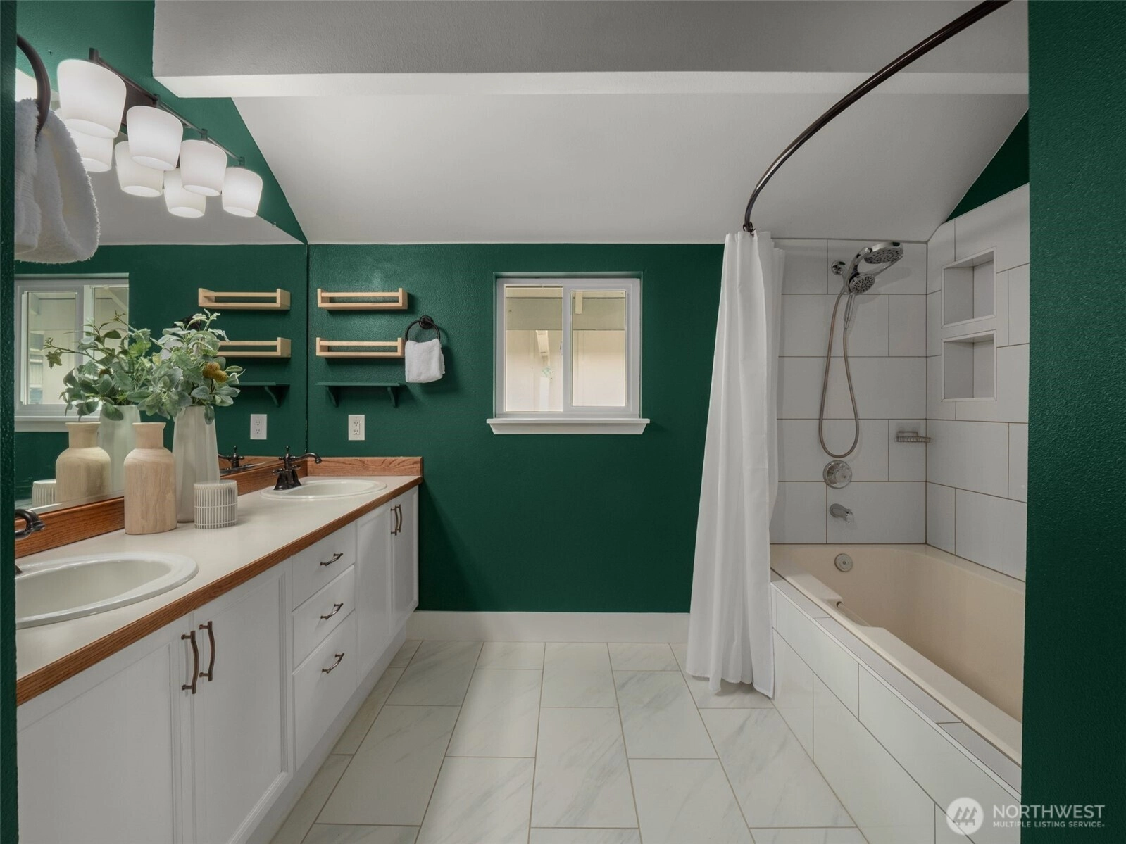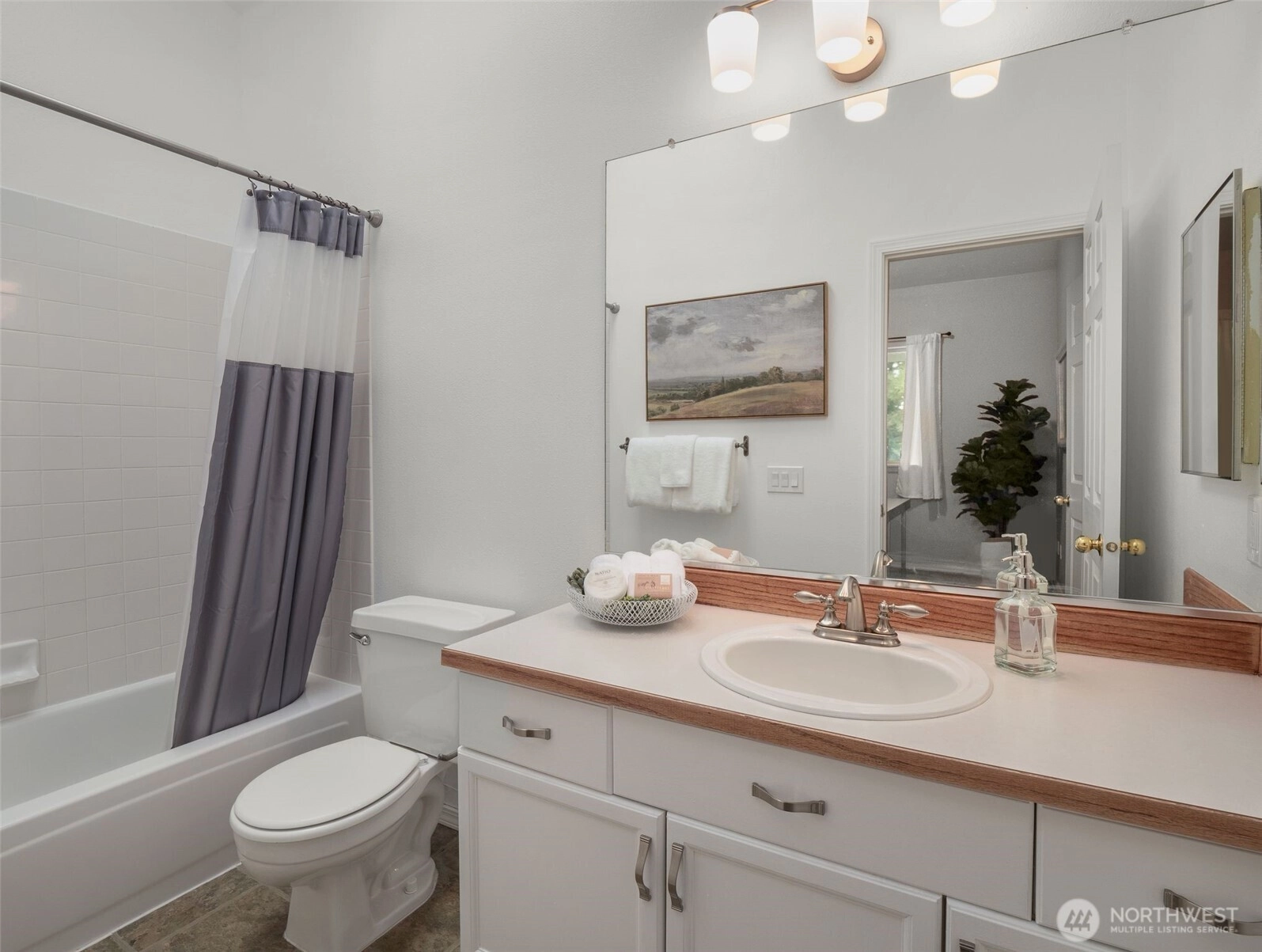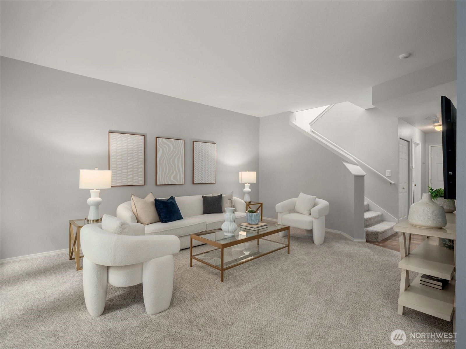 Rare find in west Bothell: stylish & sunny end unit w spacious floorplan. Townhome-style condo has generous living room w gas fireplace & french doors opening out to patio + greenspace. Open kitchen design w peninsula island lends itself to dining area w new light fixture. Upstairs offers two suites! Primary has double closets, and brand new primary bathroom just renovated. Second suite has its own full bath attached. Upgrades incl brand new carpet, designer paint colors, closet organizers, cat6 tech wiring, newer fridge & range. Full laundry room, guest powder bath, and amazingly clean 2-car attached garage. Super convenient location: mins to 405, Bothell-Everett Hwy, or backroute to Kenmore, Lk Forest Pk, or Alderwood. Move in ready!