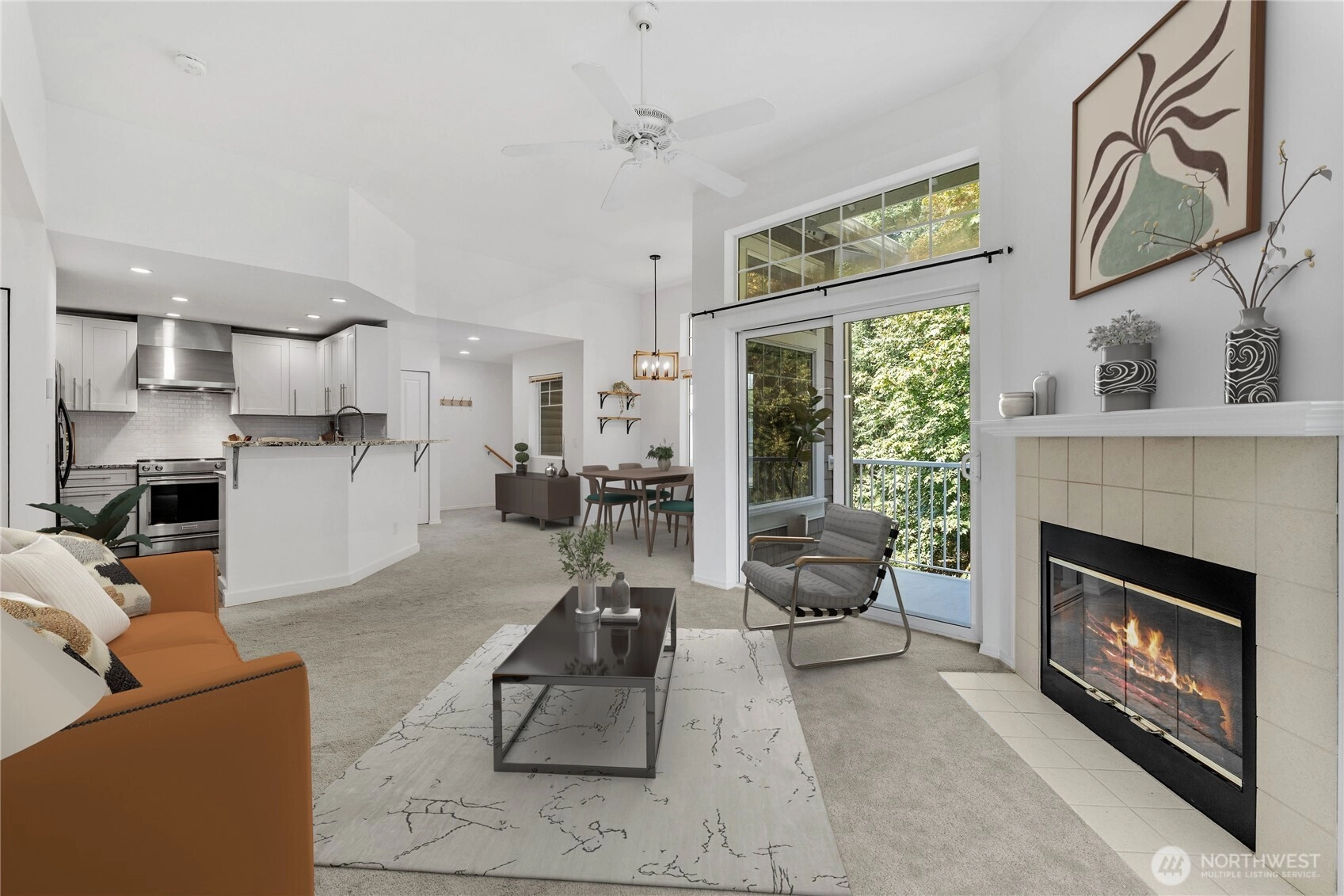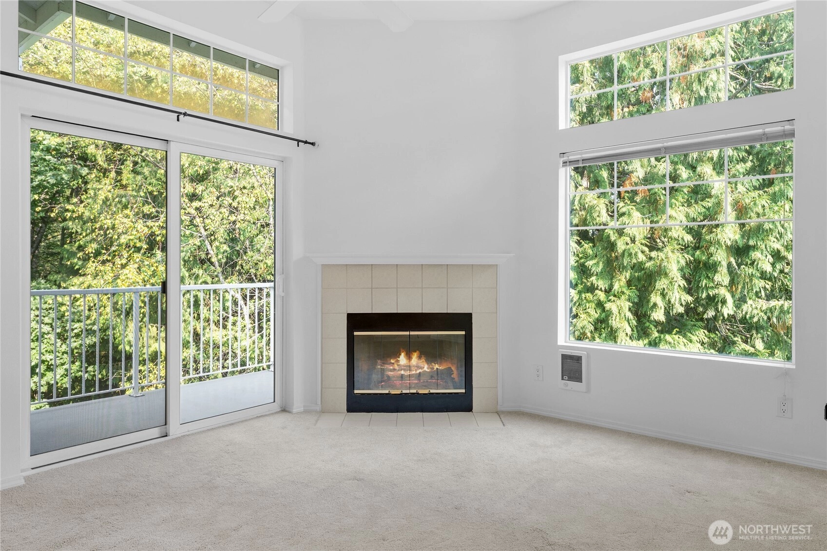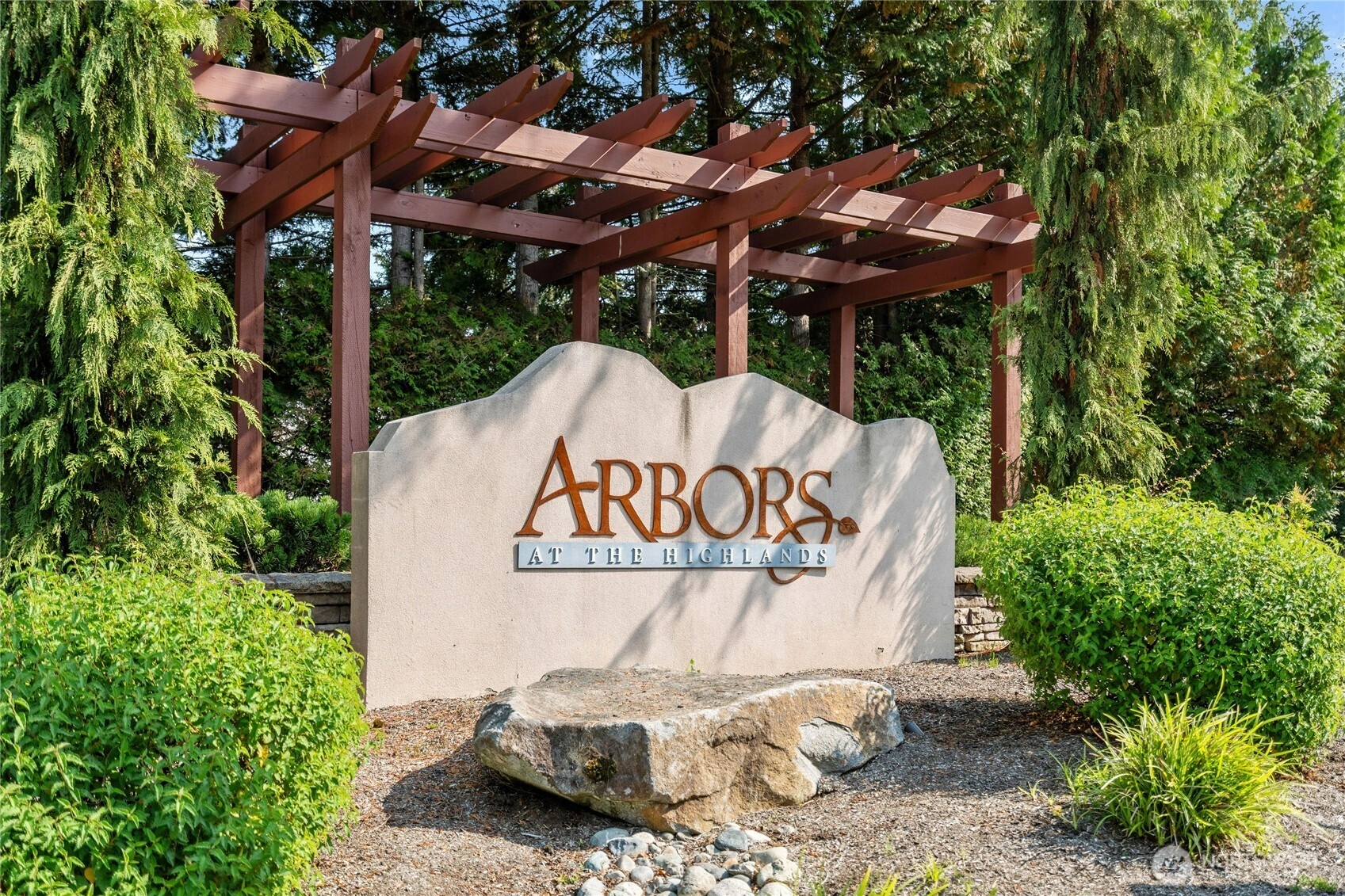 Welcome home to your tranquil top-floor, end-unit condo in the coveted Arbors at the Highlands. Vaulted ceilings and expansive windows showcase serene greenbelt views from every room. The open layout features spacious living and dining areas, cozy woodburning fireplace, and a beautifully updated kitchen with granite countertops, subway tile backsplash and stainless steel appliance suite. The primary suite includes a walk-in closet, double vanities, and en-suite bath. Additional perks include an attached garage with direct access to the unit, ample storage, and full-size in-unit washer and dryer. Freshly painted with new lighting fixtures throughout! Pet-friendly with no rental cap!