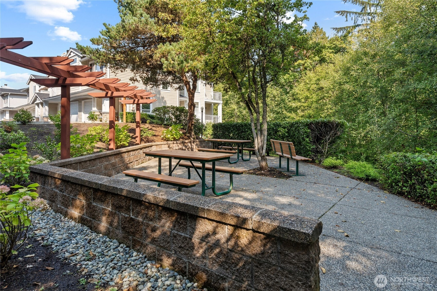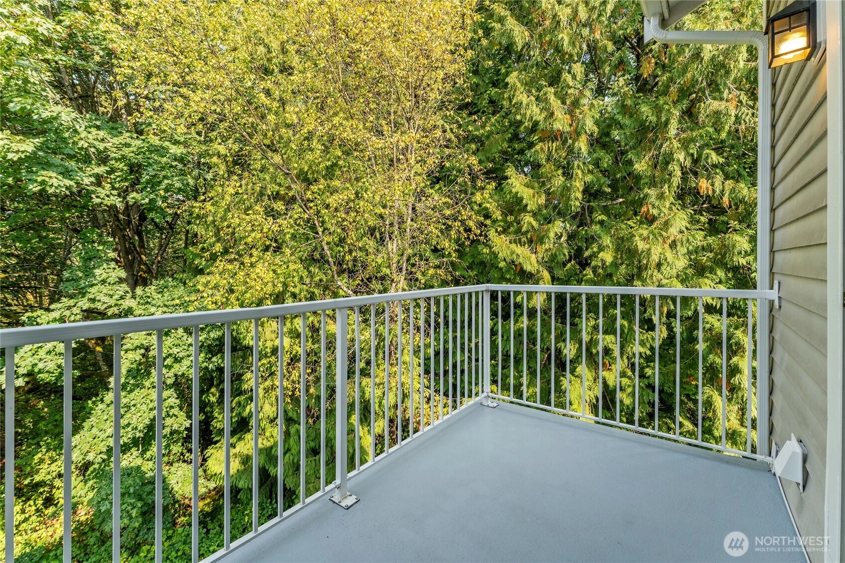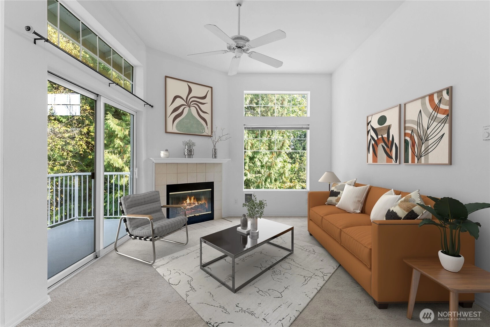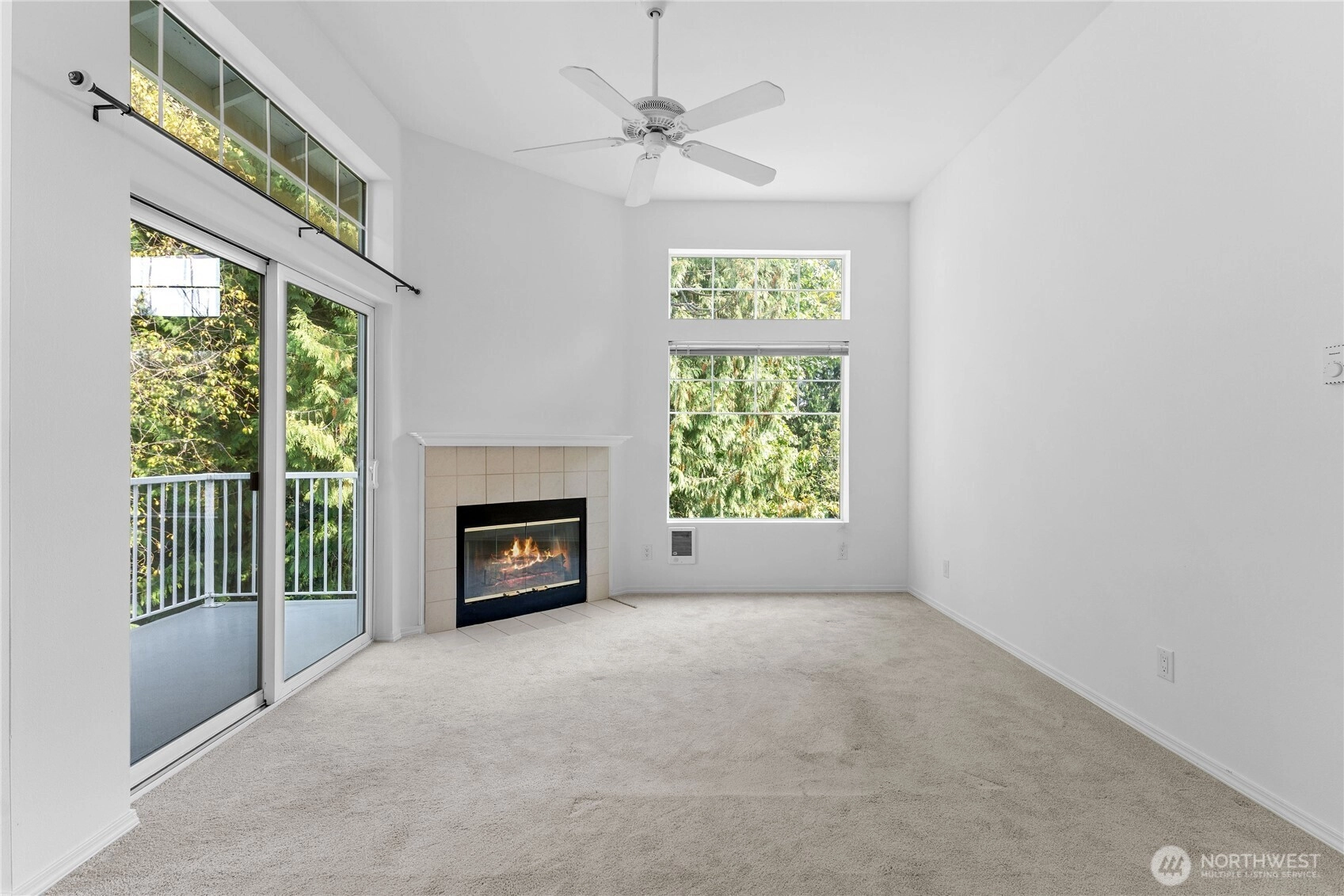 Welcome home to your tranquil top-floor, end-unit condo in the coveted Arbors at the Highlands. Vaulted ceilings and expansive windows showcase serene greenbelt views from every room. The open layout features spacious living and dining areas, cozy woodburning fireplace, and a beautifully updated kitchen with granite countertops, subway tile backsplash and stainless steel appliance suite. The primary suite includes a walk-in closet, double vanities, and en-suite bath. Additional perks include an attached garage with direct access to the unit, ample storage, and full-size in-unit washer and dryer. Freshly painted with new lighting fixtures throughout! Pet-friendly with no rental cap!