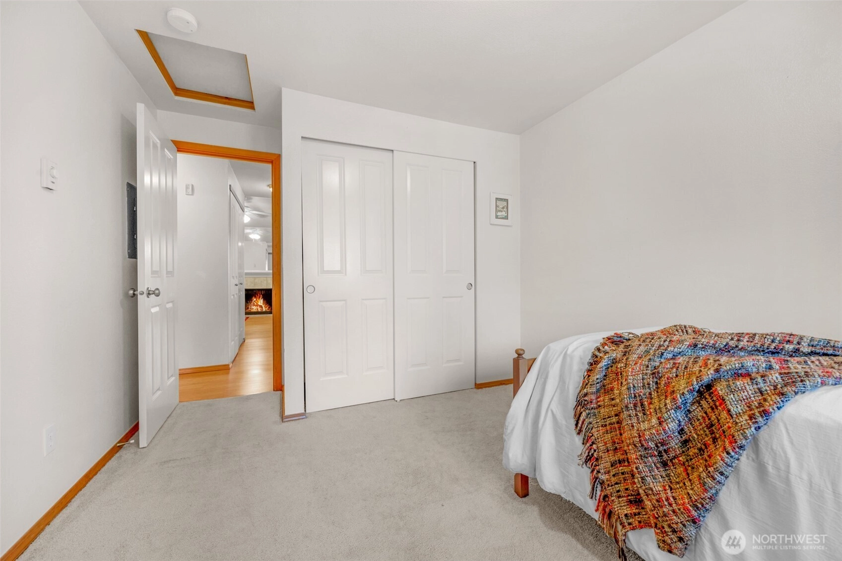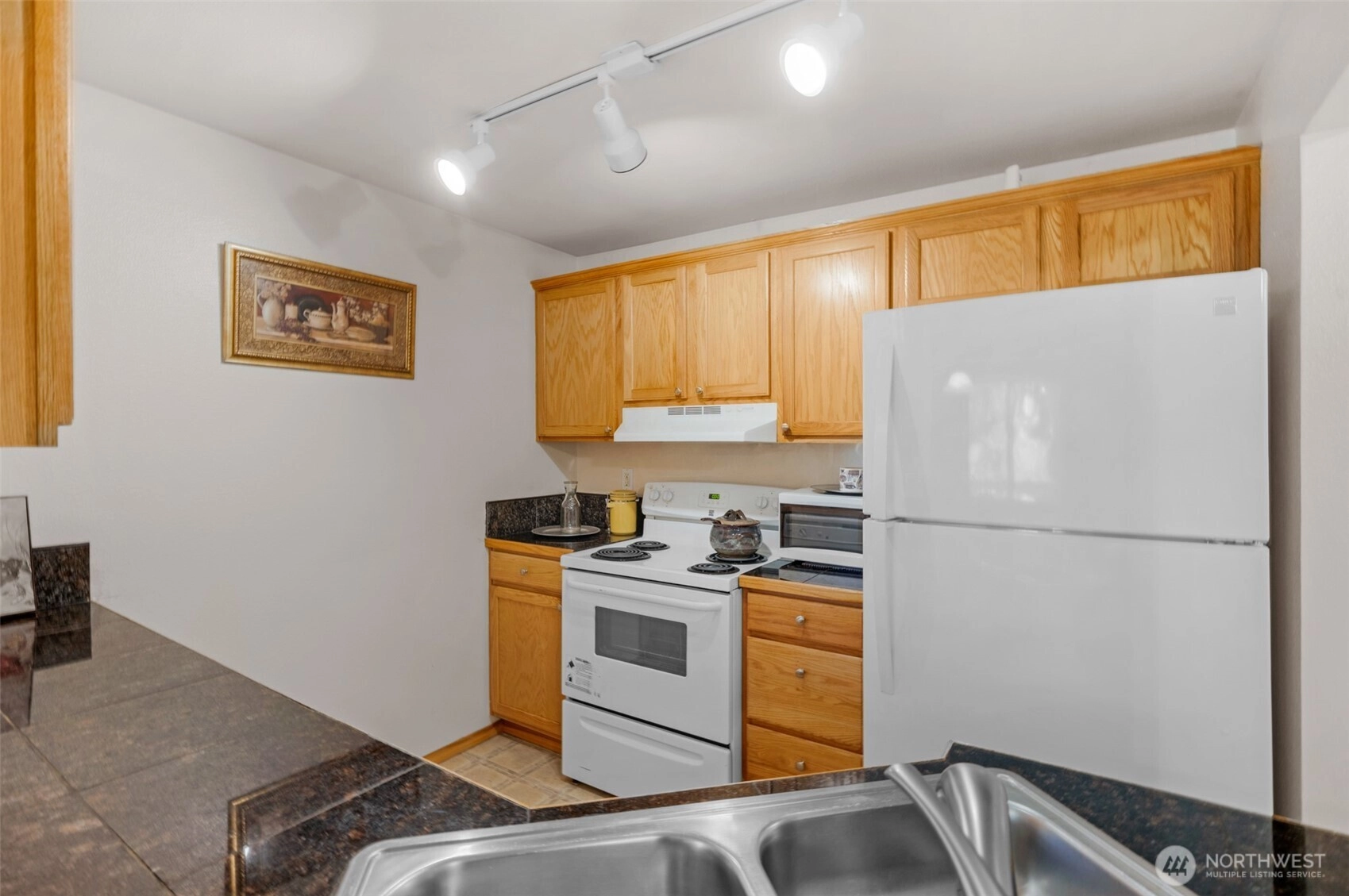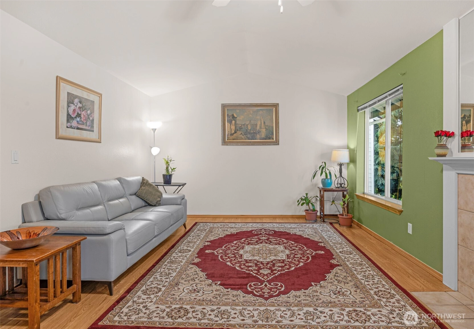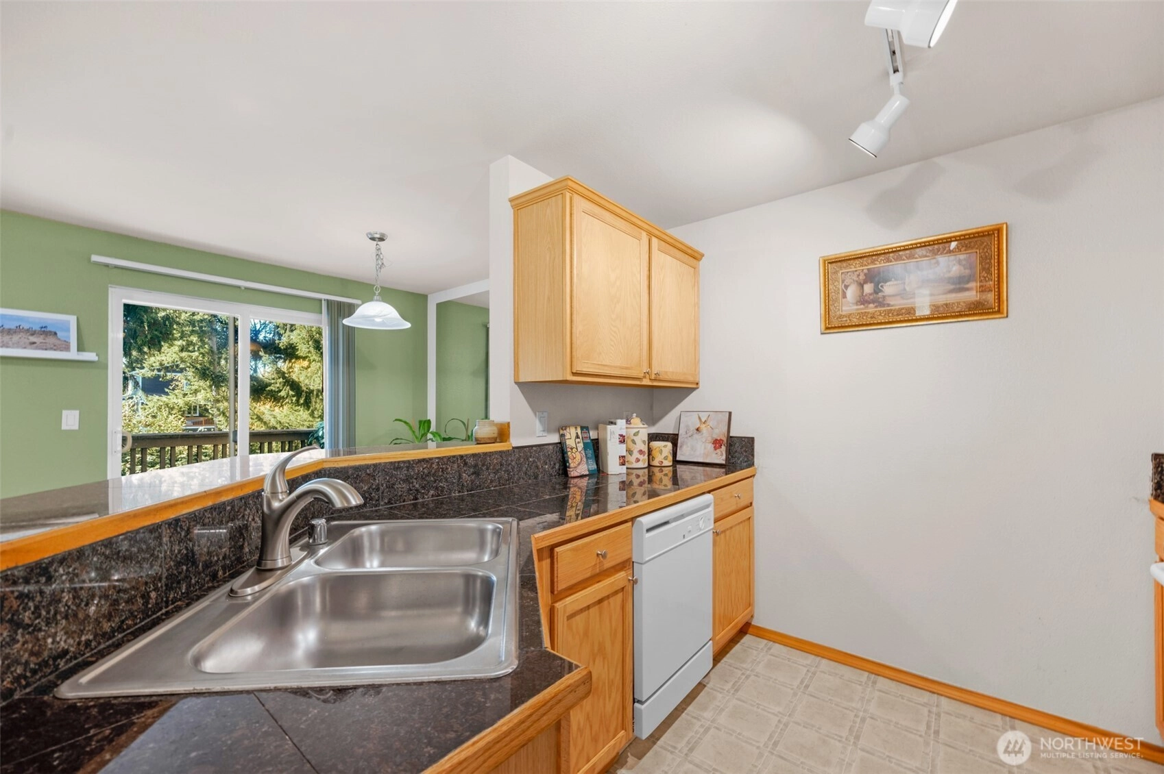 New price! Welcome to this top-floor, bright, western-facing home, situated in the quietest and private corner of this community. The open-concept design connects the kitchen, dining area, and living room for a spacious & inviting feel. The kitchen features granite tile counters and a seating counter. The living room boasts a vaulted ceiling, and a fireplace provides comfort and style. Two generously sized bedrooms include double closets. A classy full bath. Updated flooring, newer HWT, and W&D. Enjoy sunsets from your deck. A storage closet, too. Carport Parking in front. Awesome location minutes to Sound Transit Station, I-5, Silver Lake parks & beaches, Interurban Trail, Boeing/Paine Field. No Rental Cap. Dogs & Cats OK. Dues incl. W/S/G