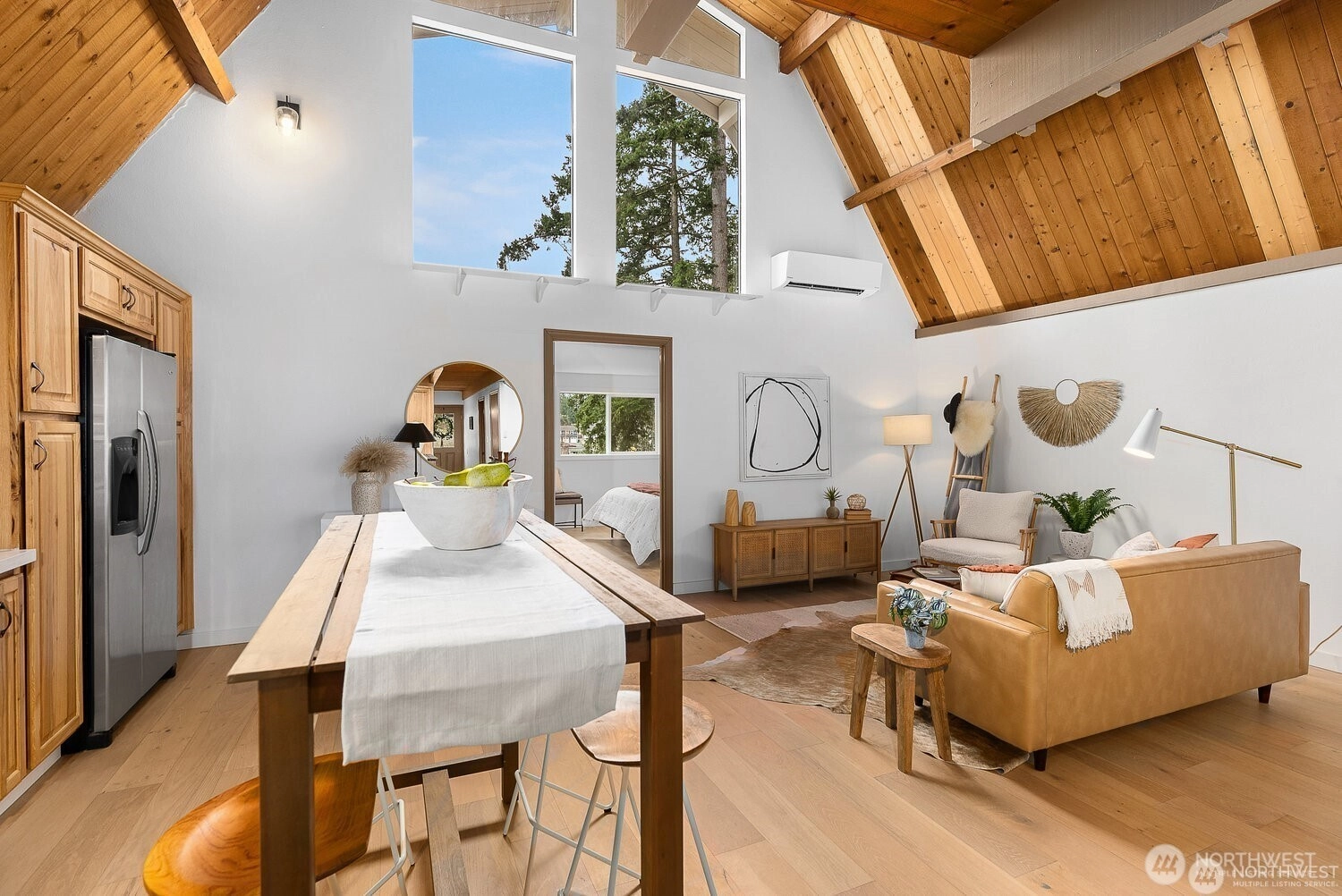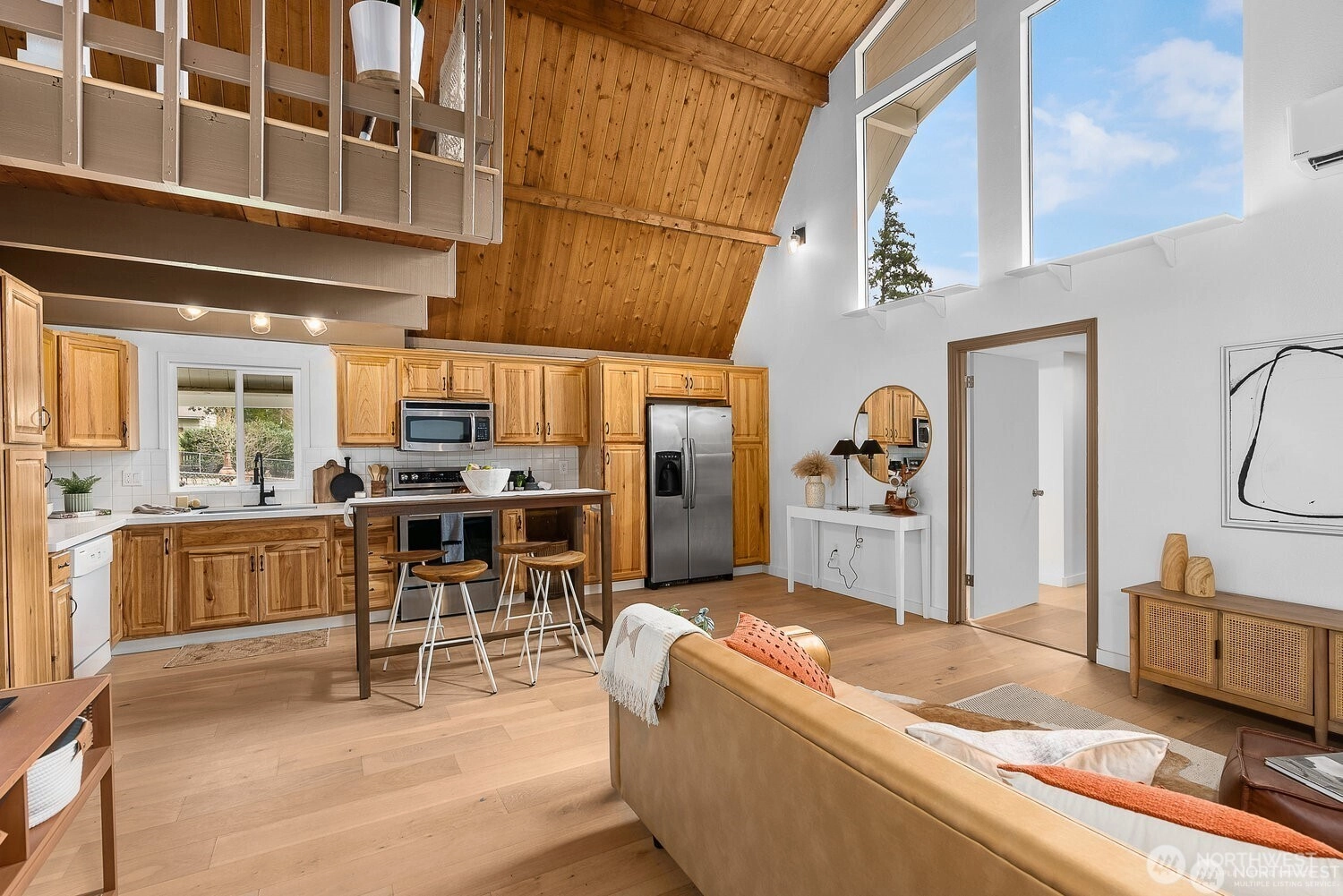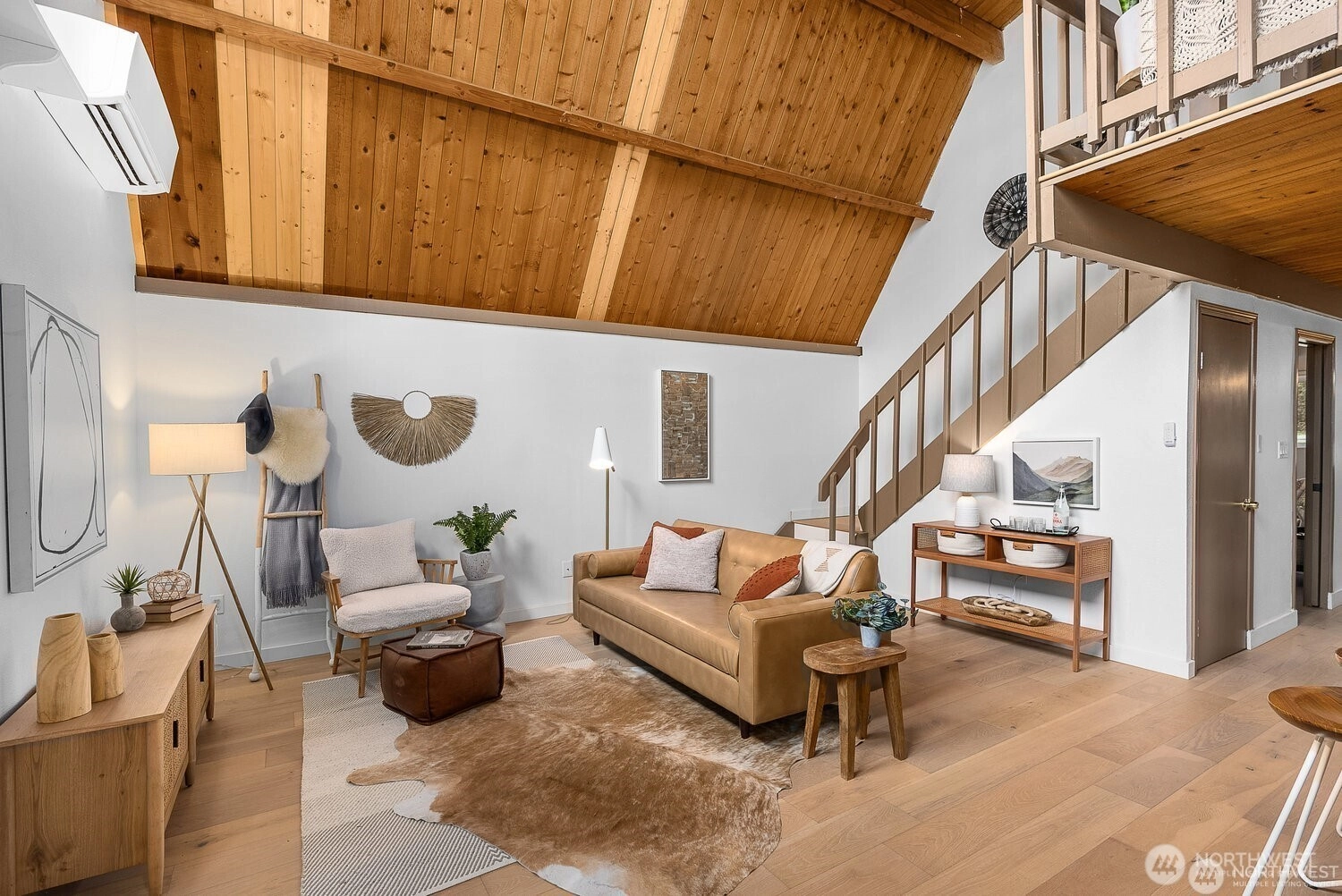 Priced to sell! Opportunity awaits in the gated Camaloch golf community. This unique 3BR, 2.25BA home blends rustic charm with modern updates. Soaring vaulted ceilings, abundant wood finishes, and a loft overlooking the living area create warmth and character. The primary suite includes a private 1/2 upstairs, and loft space for an office or reading nook. Major remodel in 2021 added new flooring, updated kitchen & baths, paint, new water heater, and a mini-ductless split for A/C & heat. Enjoy a huge fenced yard with Smith Lake views, plus community perks: unlimited golf, 2 seasonal pools, and a stocked fishing lake. Detached garage/shop adds flexibility.