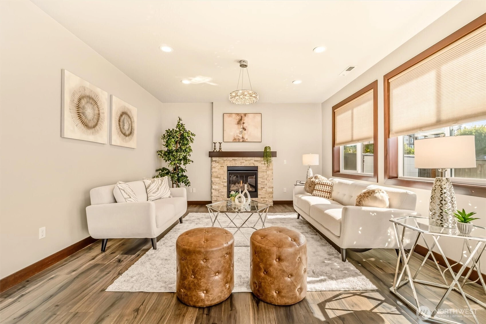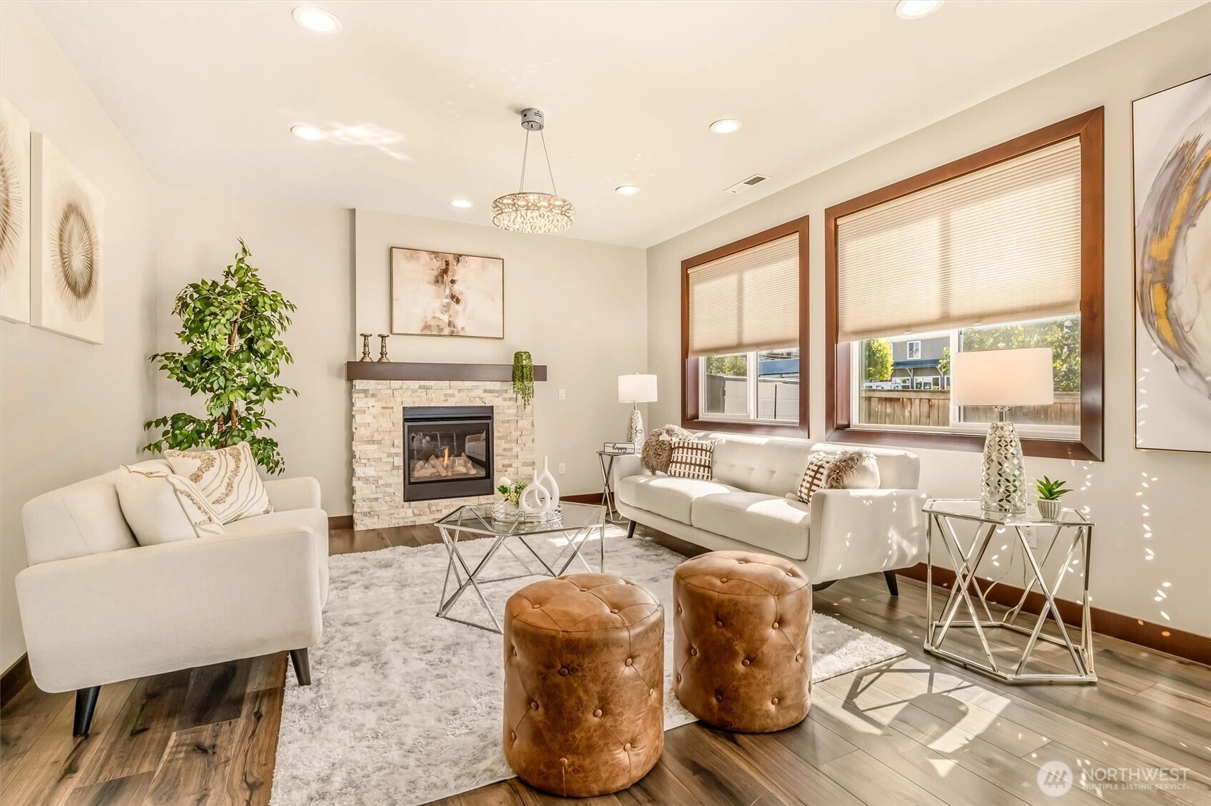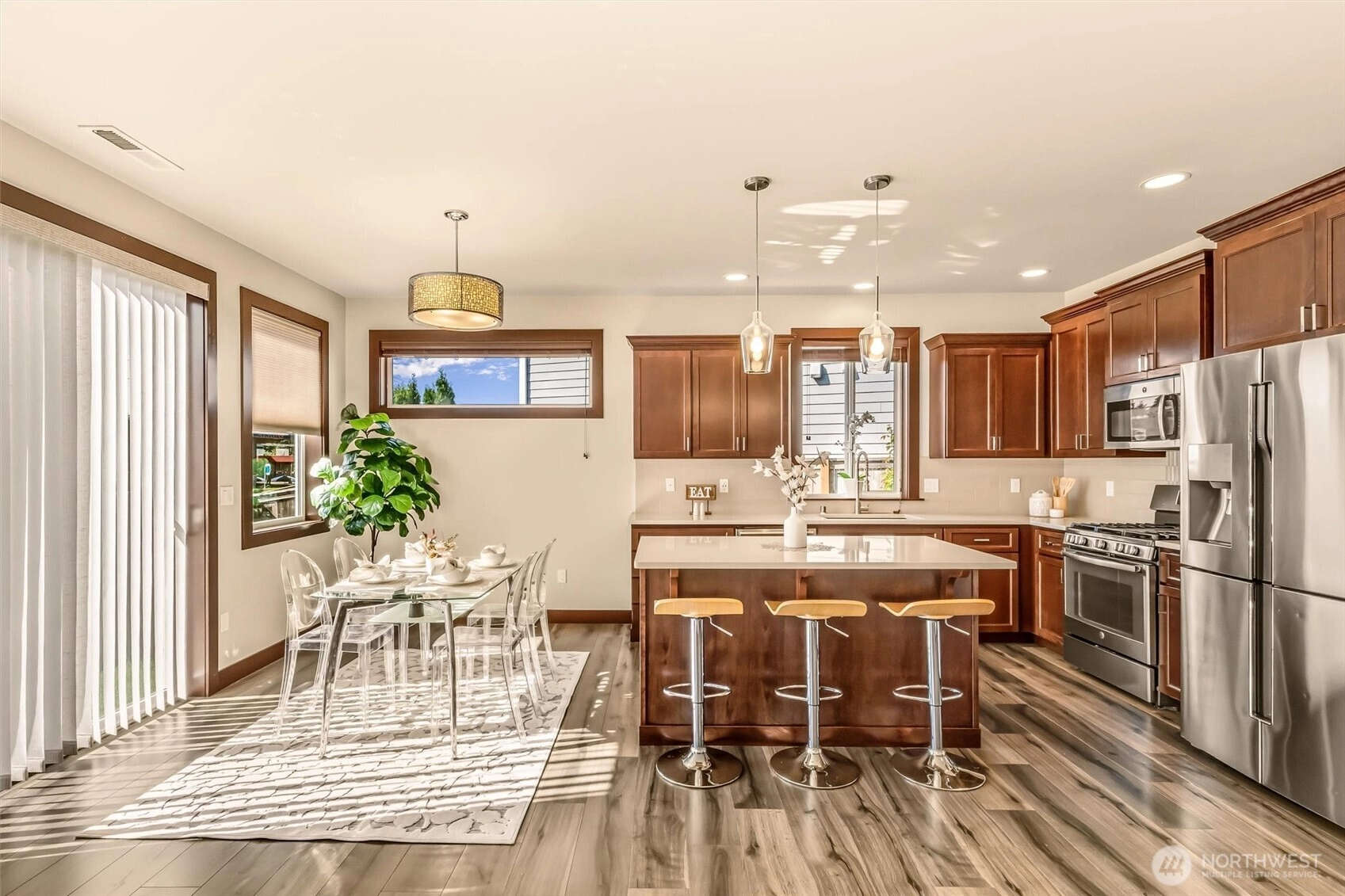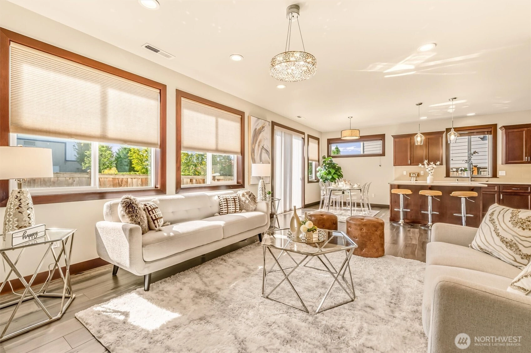 Exquisitely Sunlit Residence in a Desirable Locale with a Dynamic Community Atmosphere. Gracing a coveted north-facing orientation, this impeccably maintained masterpiece—crafted in 2017—radiates refined elegance and timeless sophistication. Contemporary quality finishes, modern stylish spacious kitchen +MAIN-FLOOR bedroom and full bathroom. Huge entertainment/bonus room upstairs other than the 4 bedrooms plus Central A/C, Blinds, Custom Closets, Built in wiring system for projector, Tesla Charger & Overhead Storage Shelving in Garage —this home truly has it ALL INCLUDED package. Quick access to major highways, Mill Creek TC, dining, shopping. Steps from Gold Creek Church & Amazon Shuttle Service!Truly move-in ready, PRE-INSPECTED!