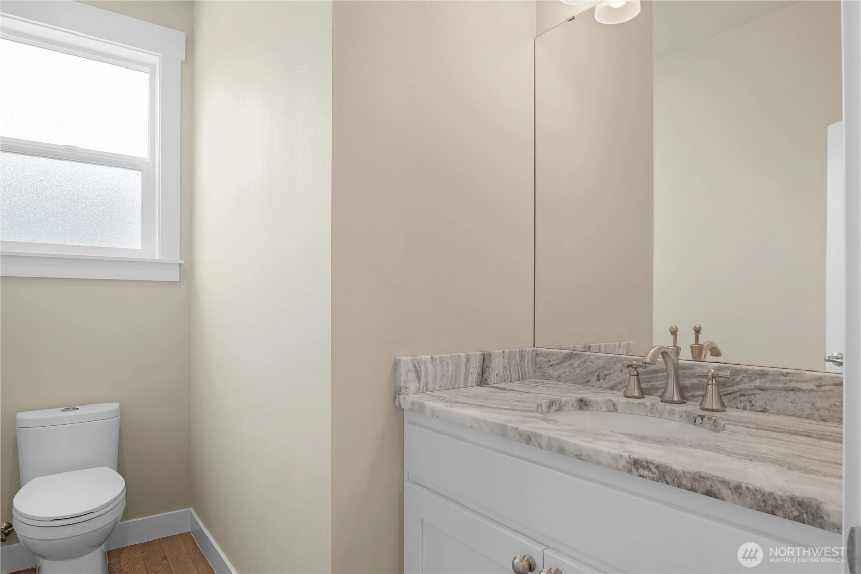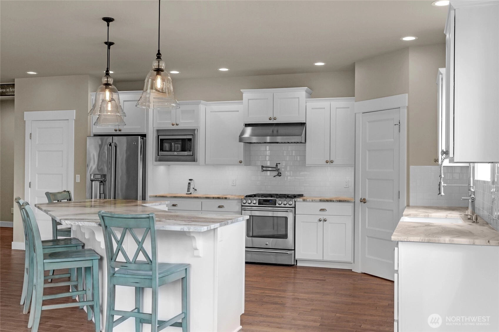 Wonderful Bay Meadows home w/ vaulted ceilings, hardwoods throughout main & excellent open floor plan. Tons of natural light w/ oversized windows. Designer kitchen w/ granite counters, SS apps, soft close cabinets, tile backsplash & gas cook top. Spacious living room w/ gas fireplace is perfect for gathering. Office on main floor plus half bath. Four additional bedrooms upstairs + laundry. Primary suite w/ walk in closet + 5 piece bath w/ jetted tub. Guest suite w/ private bathroom. Large covered back patio stubbed for gas bbq leads out to nice level and usable yard. Property backs up to trees & offers plenty of privacy. Separate 200 amp service for your future shop. 3 car garage. Great location w/ quick, easy access to I-5. Welcome home!