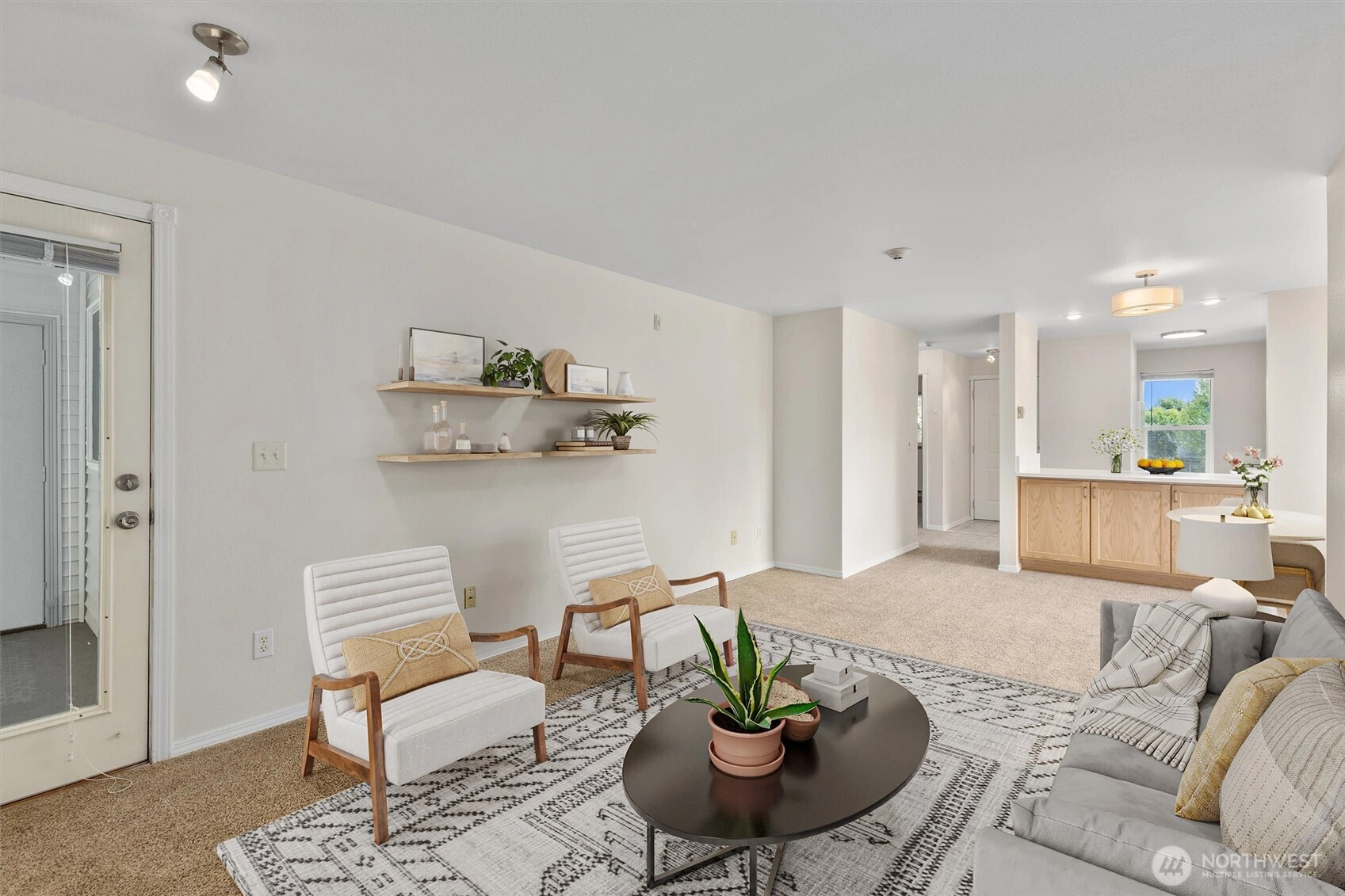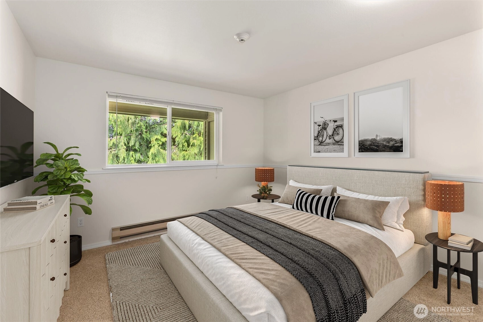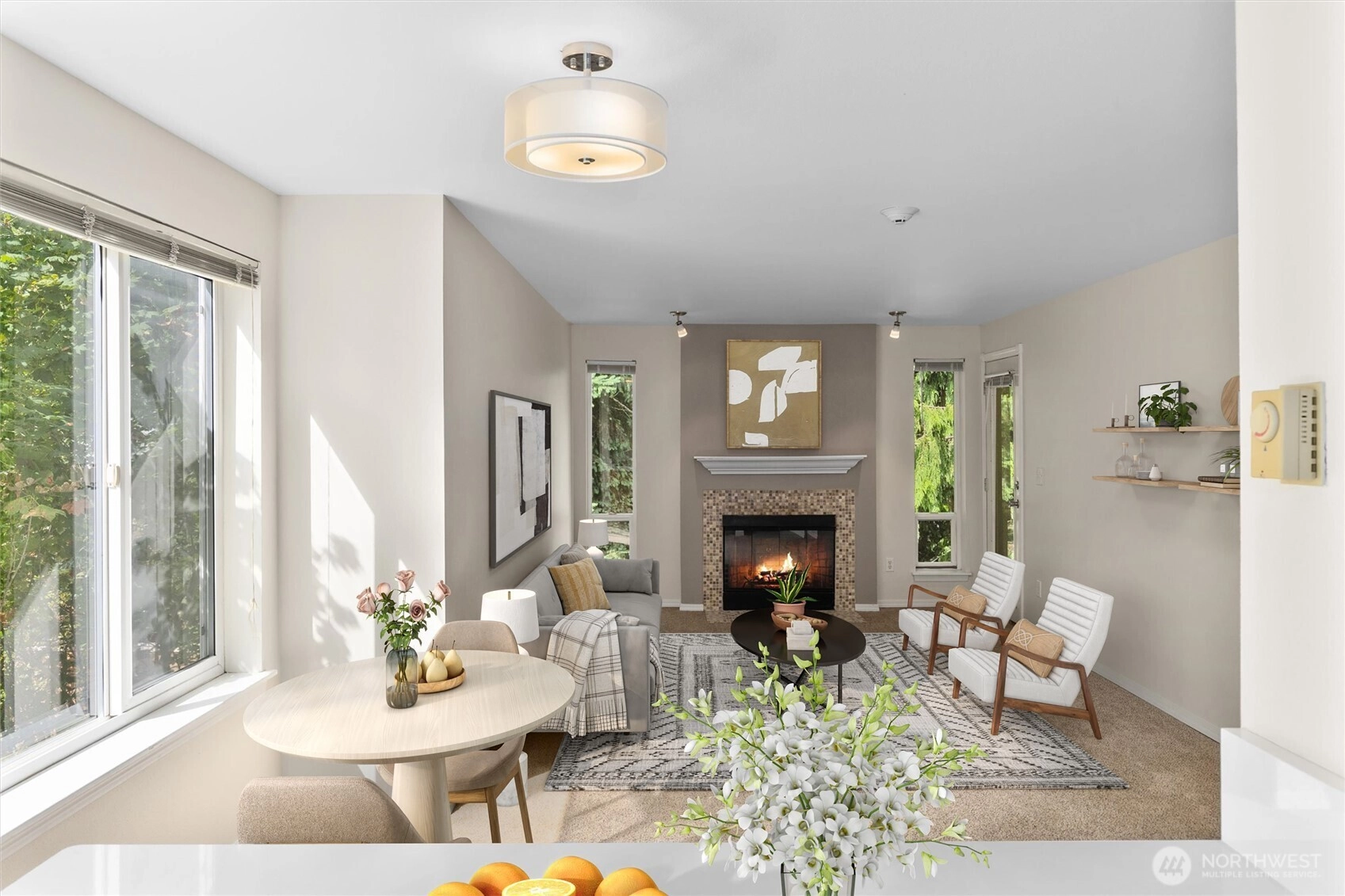 Beautifully refreshed top-floor end unit with bright, open spaces and modern updates. Ideally located near Edmonds College, shopping, and dining- this 2 bed/2 bath condo has a remodeled kitchen with extra island storage, a new refrigerator, and brand new carpet. Both bathrooms feature upgraded cabinets, counters and flooring and the laundry area includes a new washer/dryer with additional added storage. Relax in the living room with your fireplace or step onto the deck for a BBQ with treetop views and enjoy the breeze. This unit also has exterior patio storage, 2 parking spaces and includes a portable AC unit.